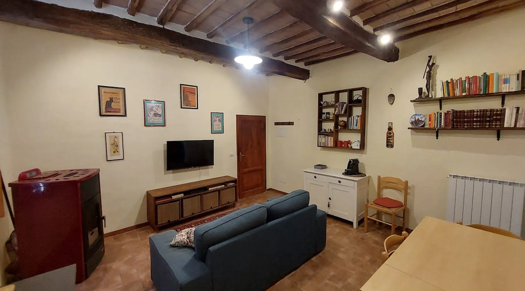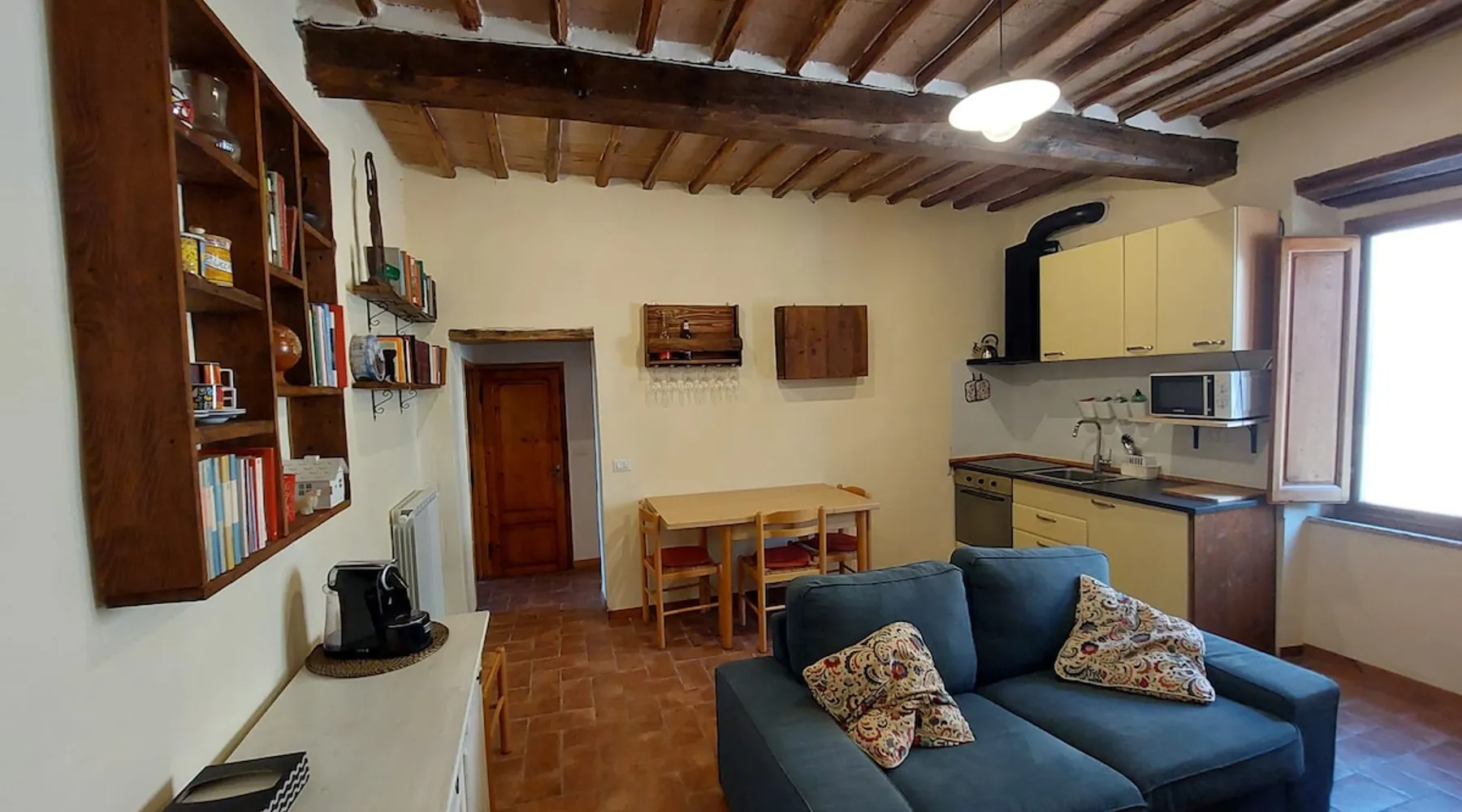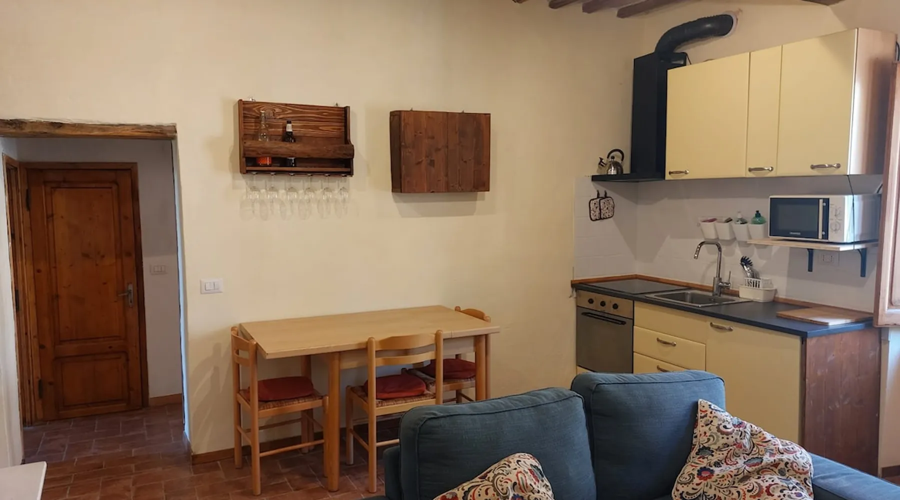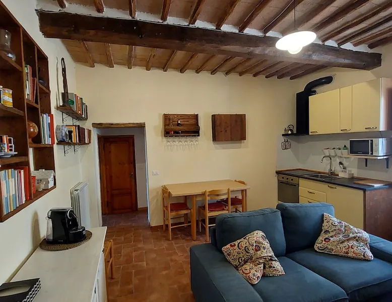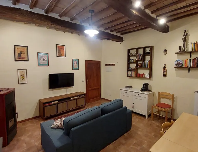 The apartment is located on the first floor of an early 20th century building, in the historic center of the municipality of Monticiano. The entrance opens onto a room with a small kitchen. In the apartment there are two small bedrooms. In the first bedroom, the queen-size bed (1.40x2.00 m) is hanging off the ground approximately 1.70 m high. The second bedroom has a single bed equipped with a pull-out extension that allows it to be transformed into a double bed. Other things to note The double bed is hung from the ceiling, which is accessed via a small staircase. For this reason, the double room is not suitable for elderly people or people with disabilities Registration details IT052018C2LWI26Q4J