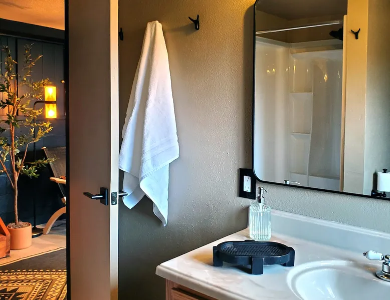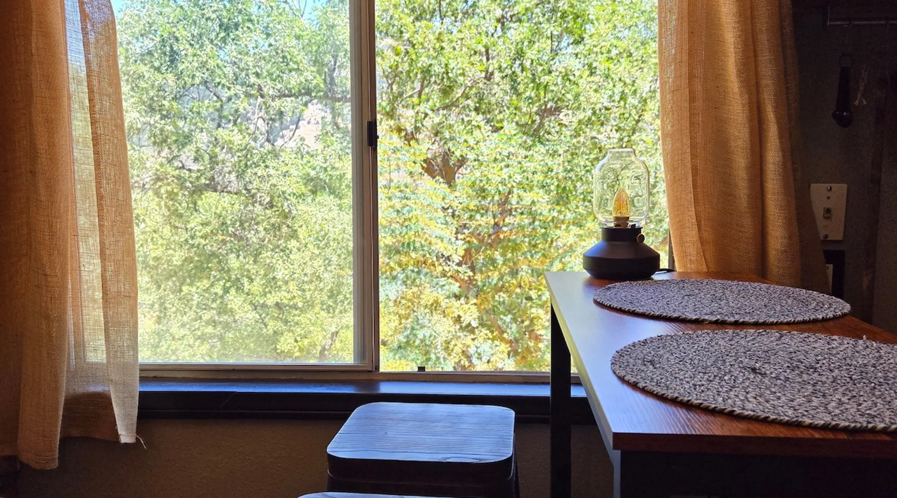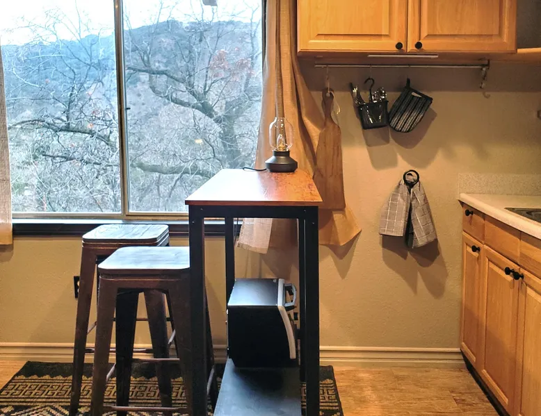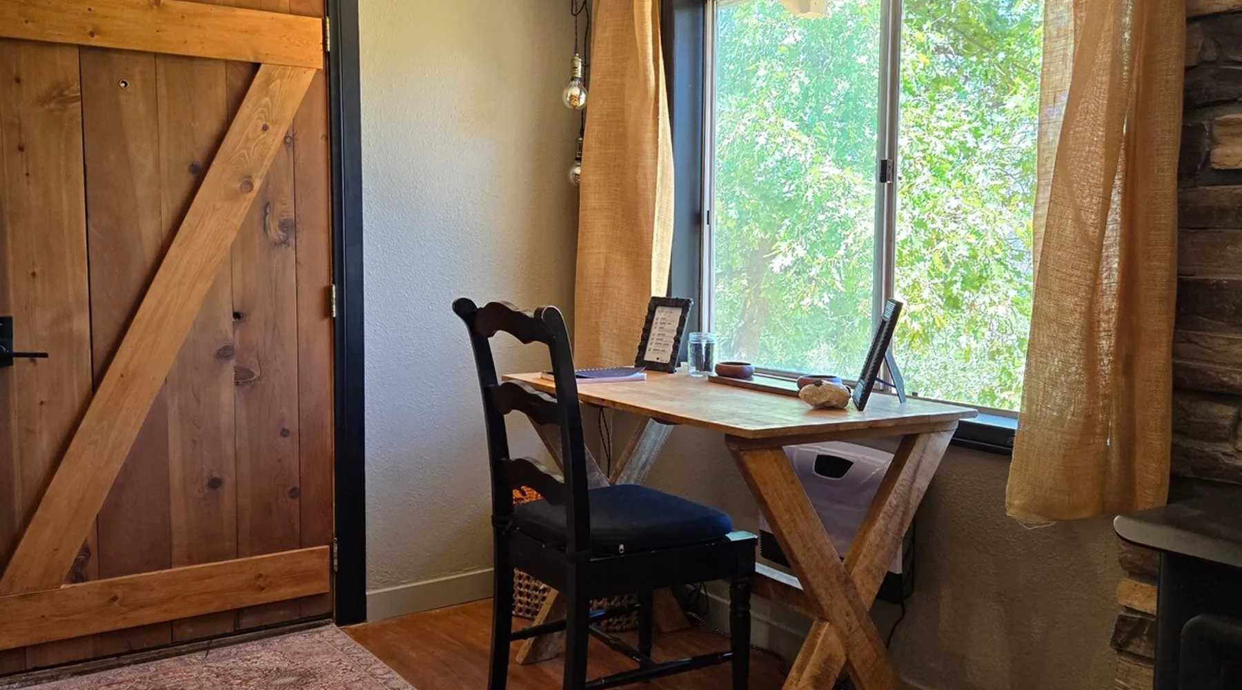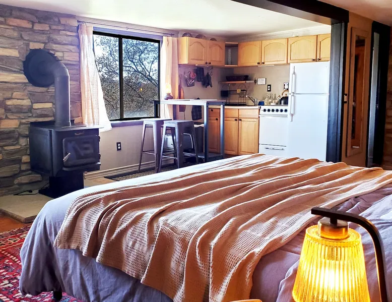 Nestled just under the Guest Favorite, the Dark Sky Den cabin. It's a vibe. Sitting among a forest of trees, is a cozy little studio, intimate and dimly lit for ultimate style & relaxation. * 5 Min. from Main St. on Paved Roads * Laid Back w/ Ultimate Ambiance Interior Design * King Bed * 500 Square Foot Studio * Forest Views + Volcan Mountain * Private Covered Deck * Fully Equipped Kitchen * Full Bath w/ Shower * Island / Dining Seating for 2 * Picture Windows Views of Trees The space Send me a message for customized recommendations that fit your travel style and local interests. : ) Located in the International Dark Sky Community of Julian, just 5 min. from Main St., yet feels miles away. Slow down, unwind & settle into the laid-back life. The Downstairs Den is the dark and moody alternative to its sister space just above, the 5-Star rated, Guest Favorite Dark Sky Den, and featured in LOCALE Magazine. Relax your senses in this contemporary, nomadic-style studio. The Interior Design is peppered with thoughtfully appointed details, custom and vintage accents, and natural materials and textures, along with dim, low-lit lighting that creates an ambience that feels exceptionally cozy. Nestled among the trees, the studio sits on a peaceful half-acre filled with black oaks and a full view of Volcan Mountain. With large, picture windows and a private deck, you'll have a ground's eye view of trees, wandering deer, wild turkey and other birds and wildlife. Experience the joys of Four Season Living! A Beautiful Blooming Spring, Warm Summer Months, Cozy and Colorful Fall and Snowy Winters. STUDIO SPACE: - 1962 Custom Cabin - 450 Square Feet - 1/2 Acre filled with Oak & Pine Trees, Woodpeckers, and occasionally Deer and Wild Turkey - Expansive View of Volcan Mountain from all Windows - King Bed - Sleeps 2 max - Fully Equipped Kitchen - Full Bath with Shower & Multi-Spray Showerhead - Large Picture Windows Facing the Hillside filled with Trees - Wifi - Interior Design Style is Laid-Back, Contemporary Nomad with Natural & Collected Elements. Comfortable, cozy, moody and romantic. - Healthy Home Philosophy with attention to detail in Lighting, Cleaning Products, Furnishings and Simple Living Lifestyle. - Dark Sky Lighting to support Circadian Rhythm and dimmable, warm bulbs to relax your senses (optional Overhead Lights, as needed) - Fireplace is for DECORATION ONLY. Thank you for respecting our fire sensitive community. - Wall Mounted Heater - Extra Linens and Blankets - Desk / Table for those creative working nomads - Private Deck with a Set of Rocking Chairs facing an incredible and peaceful view - On Site Parking (1 car only) on Gravel Driveway - Safe and Walkable Neighborhood - Paved Roads lead to Cabin - 5 Minutes to Historic Main St. - 5 Minutes to Wineries & Breweries, Hiking Trails - 15 Minutes to Wynola & Lake Cuyamaca (Guests must be 25 years or older to book) BEDROOM - King Bed with Nest Mattress - Wardrobe Rack + Hangers - Vintage Gold Heart Locks and Cabinetry Knob Accents - Cabinet Storage for Luggage - (2) Luggage Racks SEATING AREA - Custom Design Seating for 2 KITCHEN - Fully Stocked for Cooking with Pots, Pans & Utensils - Olive Oil, Salt & Pepper Provided - Glassware, Dinnerware & Utensils - Full Refrigerator + Freezer - Electric Stovetop - Oven - Toaster Oven - Blender -Tea Kettle - French Press - Single Serve Coffee Maker (Filter Free) - Coffee & Sugar Provided DINING - Island Seating for 2 - Rotate Table as Island or Facing Window for Expansive View of Hillside Trees and Volcan Mountain BATHROOM - Single Vanity - Shower Stall with Multi-Spray Showerhead - Organic Shampoo, Conditioner & Body Wash Included - Bath Linens - Hairdryer - Views of Hillside filled with Trees & Mountain View DESK - Desk / Table with Chair facing expansive Hillside View - USB Outlets THE DARK SKY Julian is one of two accredited Dark Sky Communities in California, and one in thirty overall. The intention of being a Dark Sky Community is to protect the natural night sky by reducing light pollution. This means that outdoor lighting is carefully designed and controlled to minimize glare and unnecessary brightness. By doing this, we can fully appreciate the awe-inspiring wonders of the night sky, including the stars, constellations, and even the Milky Way! Other than incredible stargazing, having a natural dark sky benefits astronomical research, wildlife preservation and our circadian rhythm. If you're interested, please check out Julian Dark Sky Network. LIGHTING The Den incorporates dark sky lighting inside the cabin too, which creates a cozy and inviting atmosphere while supporting your circadian rhythm. The soft illumination creates a sense of intimacy and relaxation, while also allowing your eyes to adjust to the natural darkness outside. It's the perfect setting for unwinding after a long day or spending quality time with loved ones. With the use of dimmers, warm light bulbs and minimal overhead lighting, you control how bright or dim you want the space to be. One of the best benefits of dark sky lighting at home is how it affects our circadian rhythm, which is our internal body clock that helps regulate our sleep-wake cycle. Now, here's the thing: exposure to bright or blue-rich light in the evening can mess with our circadian rhythm and make it harder to fall asleep. Bright lights, especially at night, triggers our brain into thinking we should be awake as if it's the middle of the day. Whereas dimly lit, downward facing amber or red lights (similar to a campfire), promote melatonin production which tells our body that it's time to relax and prepare for sleep. Wake up in the morning naturally with the morning sun and feel refreshed! I would encourage you to bring the idea of Dark Sky Lighting back with you into your own homes and see how you feel. THINGS TO NOTE: - FIREPLACE FOR DECORATION ONLY, and is non-operational. There are (2) wall mounted heaters that pump out heat on those chilly nights, and a