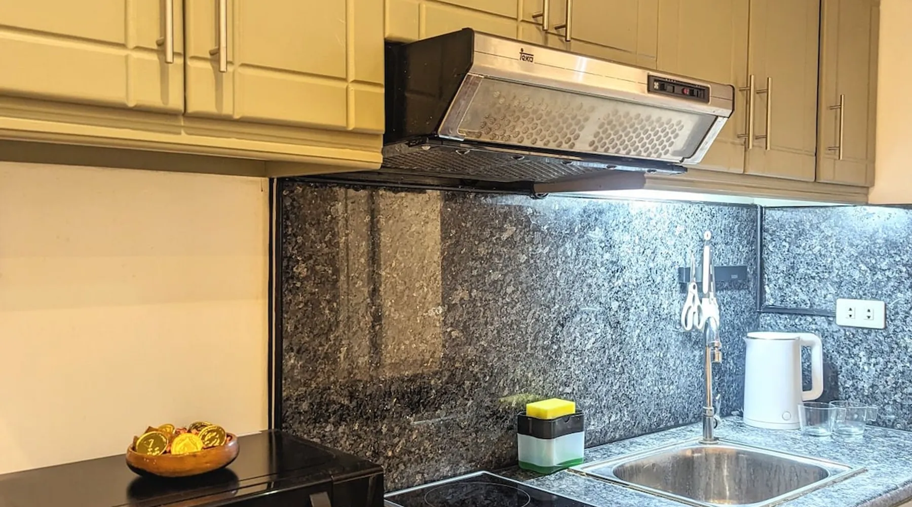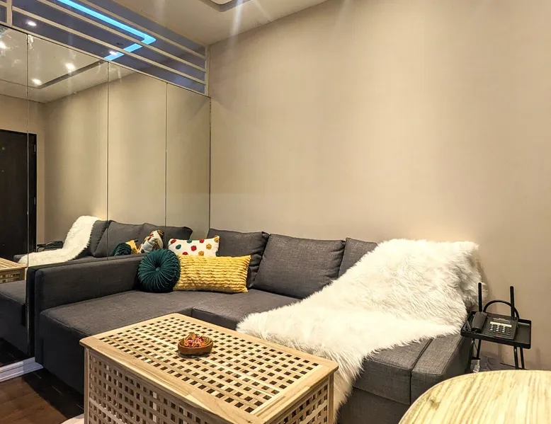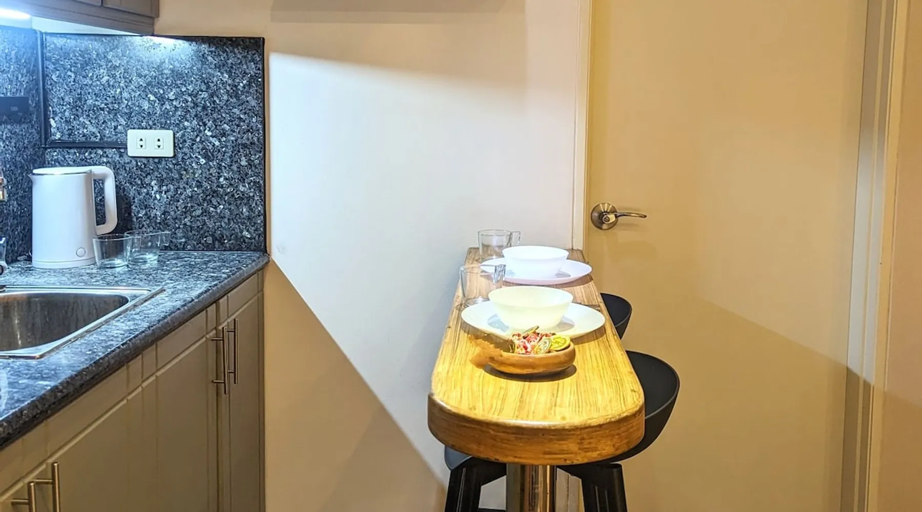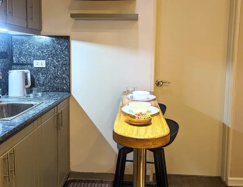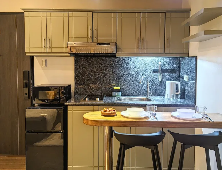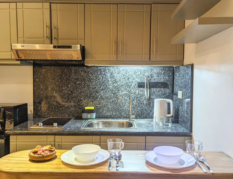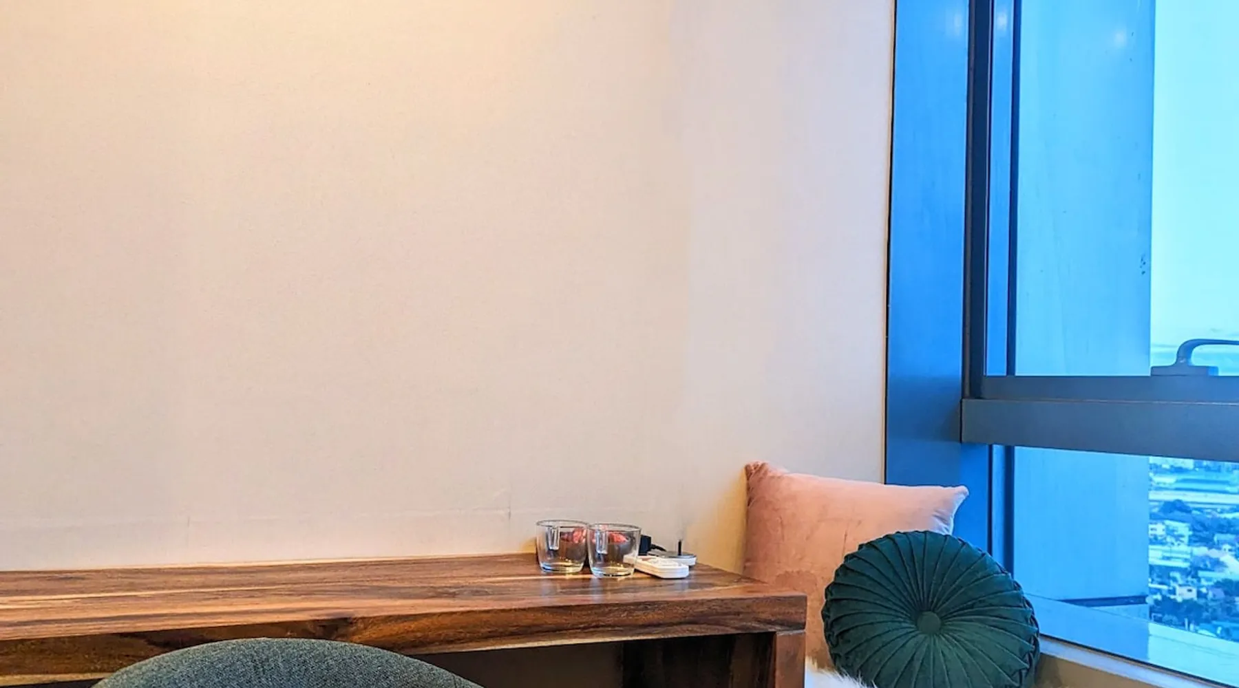 Kick back and relax in this calm, stylish space in Alabang, Muntinlupa. 22nd floor facing Laguna bay skyline. Just in front and 1min walk to Festival Mall. With Parking Space and Pool/Gym access for a fee. Wi-Fi & Netflix ready in a 55" TV. Work from home or a quick staycation at its finest. The space 22nd Floor Laguna Bay Skyline 1 Bedroom Unit 1 queen bed and 1 very comfy foldable sofa good for 4 guests. Fee applies after 2 guests. 1min walk to Festival Mall Just accross southstation Alabang GUESTS PERMIT & DECLARATION -GUESTS after 2 guests, 3yrs old and above have an extra fee of 500php per guest per night. Please declare the final number of guests before booking, the fee will automatically reflect in the total price. Please avoid sneaking unauthorized guests, the lobby is entitled to check the guest permit upon arrival verifying the number of guests and their identity who the unit owners allowed to stay in the unit in a specific duration. Thank you for your cooperation. Guest access 500php fee per head per day to access Crimson Hotel Amenities (Gym & Pool) located in the same building of the unit. Other things to note The unit is located in a multi-use high rise condominium. Some units are for residential (local/expats/pogos), offices, airbnbs & etc. Condos share the same water and drain line where our uninvited guests, the baby cockroaches, likes to crash and pass thru. No judgment at all, but we're not sure if our neighbors or the other units are well maintained. If not, uncontrollable infestation will occur and we dont want that. 🫣 With this, we assure, we as hosts initiated installing a door seal and spreading a gel trap inside the unit as part of our insect prevention. Lastly, we on the dot clean and prepare the unit every guests checks out. In worst case scenario you still got to encounter the uninvited guests, there's a Baygon Insect spray inside the overhead cabinet above the kitchen sink for you to use. And please always clean up after cooking and eating inside the unit. Thank you so much for understanding! 🌞