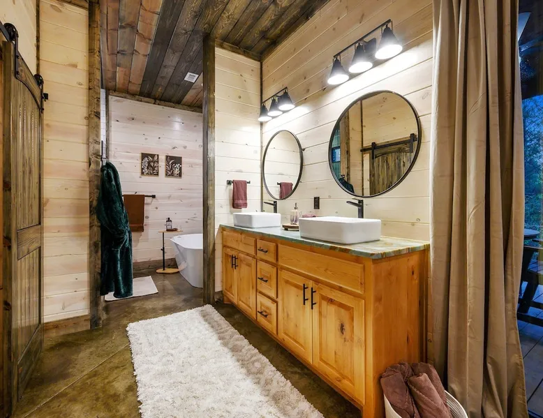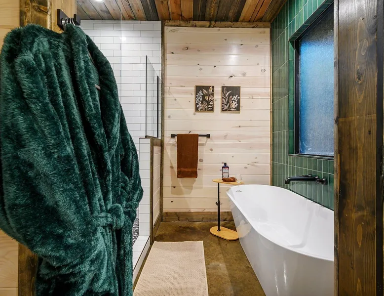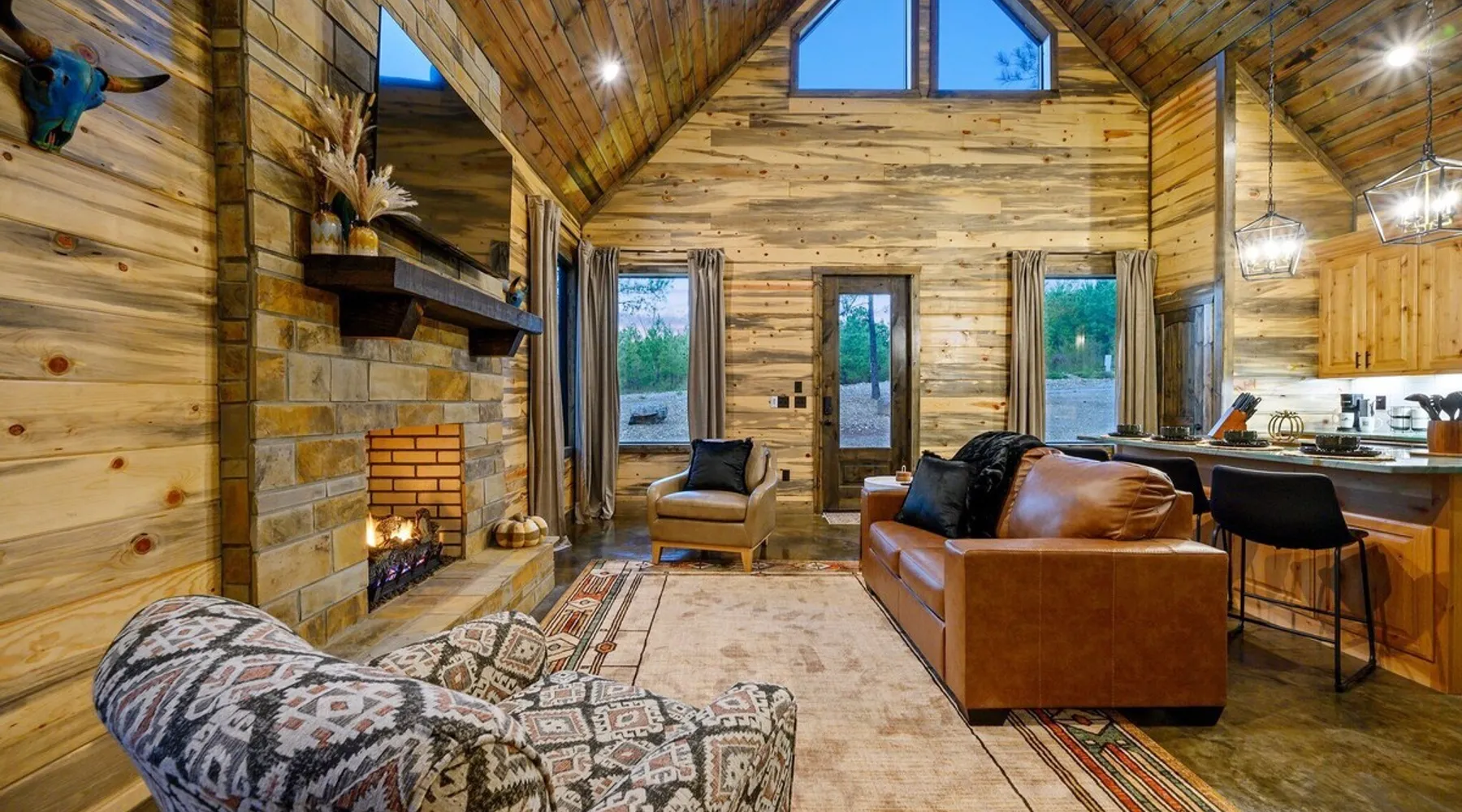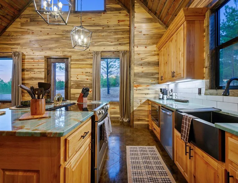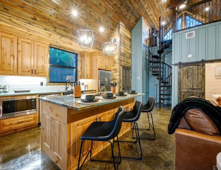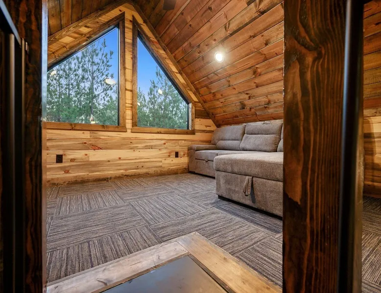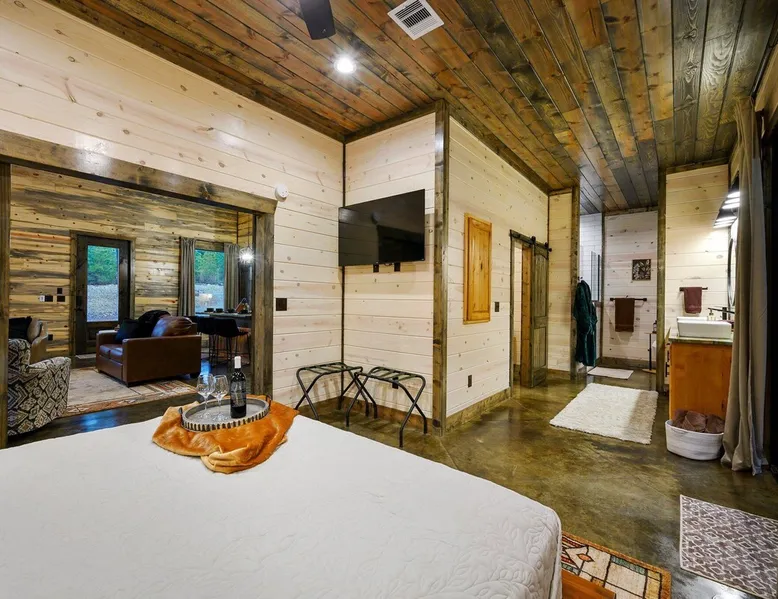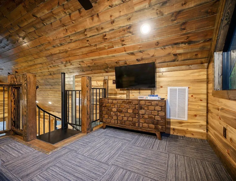 Tequila Sunset,Family,Loft,HotTub,Firepit,EV Plug Tequila Sunset - Hosted by Bravo Cabin Rentals, LLC Tequila Sunset is the epitome of a luxurious getaway with its cozy ambiance and inviting atmosphere. This one-bedroom rental in Broken Bow is perfect for up to three guests who are seeking a relaxing and rejuvenating stay. The highlight of this retreat is undoubtedly the hot tub, where you can soak your worries away while enjoying the serene surroundings. Additionally, the gas grill allows you to indulge in some outdoor cooking, while the fireplaces both inside and outside create a warm and cozy ambiance. The furnished back deck provides the perfect spot to unwind and take in breathtaking views of the surrounding nature. Inside, the living room boasts a comfortable leather couch, a lounge chair, and a gas fireplace, creating a cozy space to relax and unwind. For entertainment, a big-screen TV is also available. The kitchen and dining area are fully stocked with all the essentials you might need during your stay. From a toaster and blender to a Keurig coffee maker (with a starter pack of coffee provided) and a crockpot, you'll have everything you need to prepare delicious meals. The island features four bar stools, providing ample seating for dining or enjoying a quick snack. The bedroom offers a king-sized bed, ensuring a restful night's sleep. Side tables with storage on both sides of the bed provide convenience, while a big-screen TV allows you to unwind with your favorite shows. The bedroom also offers direct access to the patio, allowing you to step outside and enjoy the fresh air. The ensuite bathroom features a double vanity sink, a private toilet, a walk-in shower stocked with shampoo, conditioner, and shower gel, and a luxurious soaker tub for ultimate relaxation. Upstairs, the cozy loft features a game nook with a sofa sleeper, providing additional sleeping accommodations for guests. The outdoor amenities at Tequila Sunset are equally impressive. The patio is furnished with comfortable furniture, allowing you to relax and soak up the sun. The hot tub provides the perfect spot to unwind and enjoy the peaceful surroundings. The gas grill is ideal for outdoor cooking, while the gas fireplace adds warmth and ambiance to your outdoor gatherings. A big-screen TV ensures you don't miss out on your favorite shows even while enjoying the outdoors. The firepit with seating for four is perfect for cozy evenings spent roasting marshmallows and sharing stories. Lastly, a hockey game adds a touch of fun and entertainment to your outdoor experience. General Information - Full-size washer and dryer available in the laundry closet. The bedding for the sleeper sofa is located inside the sofa. Gas fireplaces are seasonally available (October-May 15th). Any cancellations processed in which a refund is due to the guest will incur a $50 processing fee. The maximum occupancy for this cabin is 3, with no exceptions. It is located near all the best restaurants, activities, and park amenities. It is just a short drive to Broken Bow Lake, Beavers Bend State Park, popular hiking trails, restaurants, breweries, wineries, and downtown Hochatown, and access to all the outdoors activities you want – boating, hiking, fly-fishing, kayaking, zip-lining, ATV trails, horseback riding, Cedar Creek Golf Course, Choctaw Landing Casino, mini-golf, helicopter rides, mining for gold, train rides, go-carts, and a great petting zoo. Don't forget these items when you come to visit: • Rain gear and light jackets (Our average rainfall is 55″-60″ each year). • We have beautiful scenic trails; good hiking boots are a must. • Water shoes for our vast shorelines and streams. • Insect repellent, sunblock, and other first-aid supplies. • Coffee and filters – enjoy this while sitting on the deck in the early morning. • Condiments --A starter supply of coffee/filters, salt/pepper, paper towels, toilet paper, bath soap, dish soap, dishwasher tablets, trash bags, and laundry soap is provided. Still, guests may need to bring additional supplies. If we are missing something or you have a question we haven't answered, please feel free to reach out to us directly at Bravo Cabin Rentals and we will personally respond as soon as possible. We look forward to making your next vacation in Broken Bow/Hochatown one you won't forget! Languages English