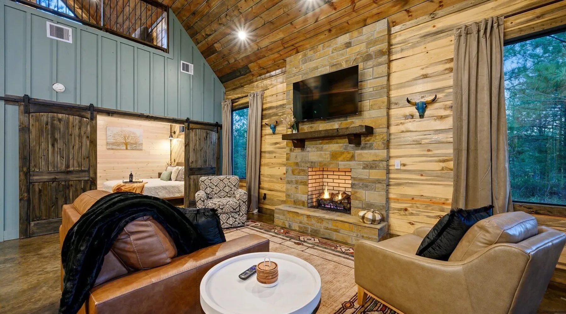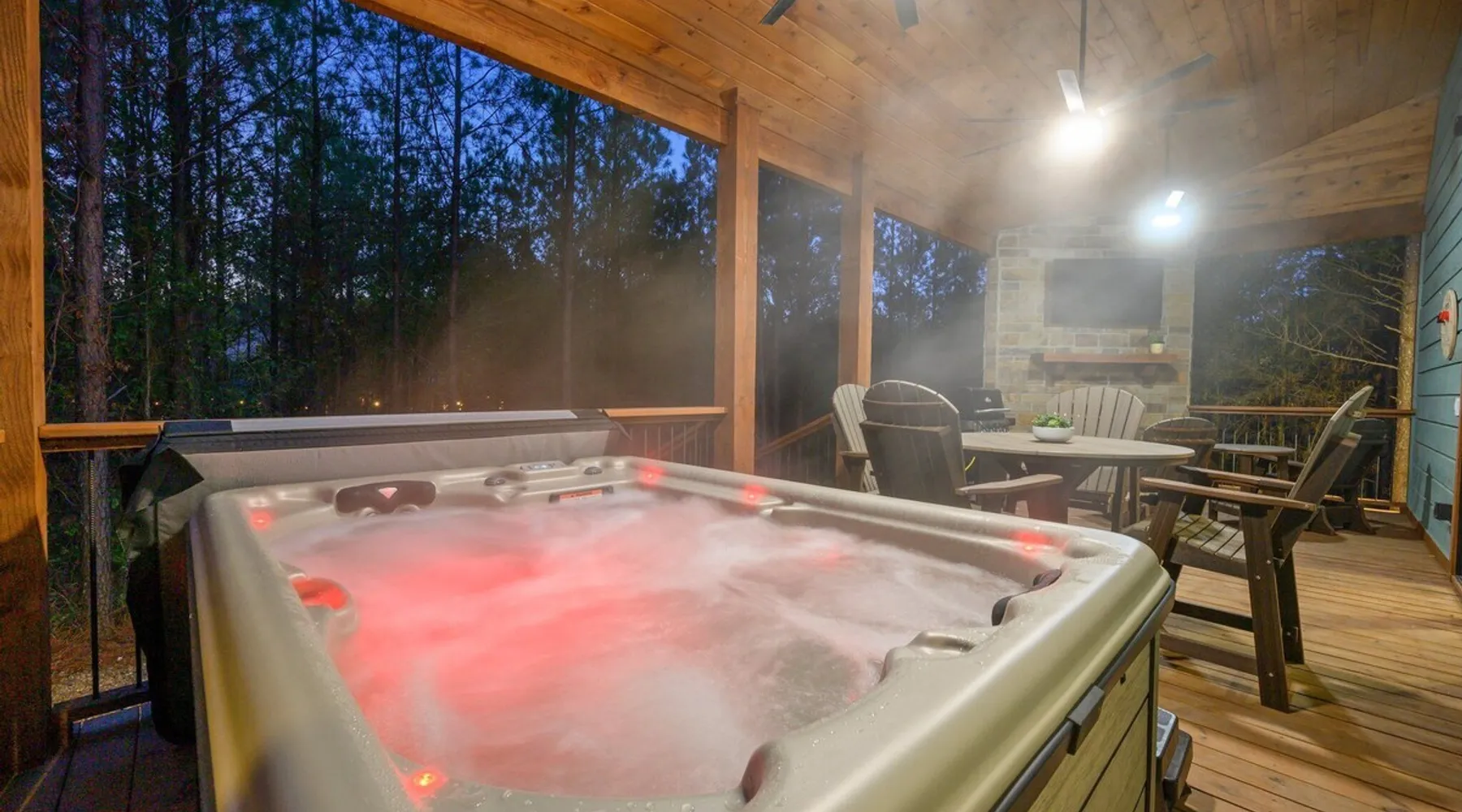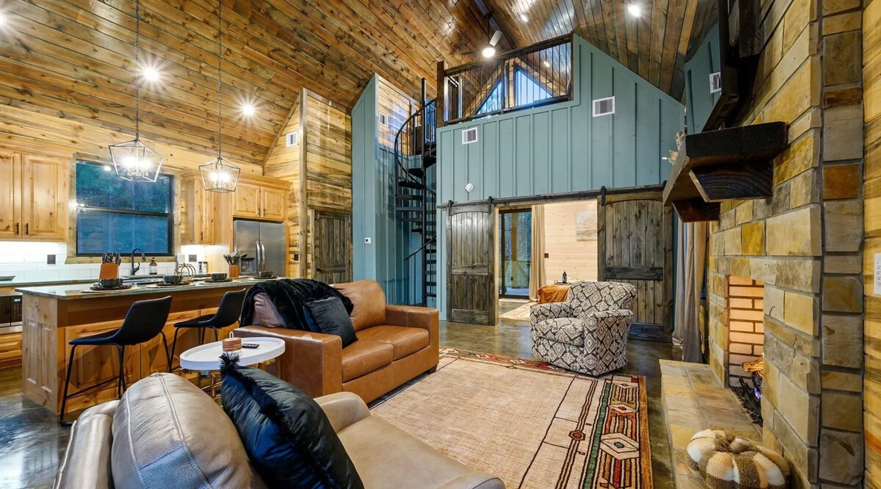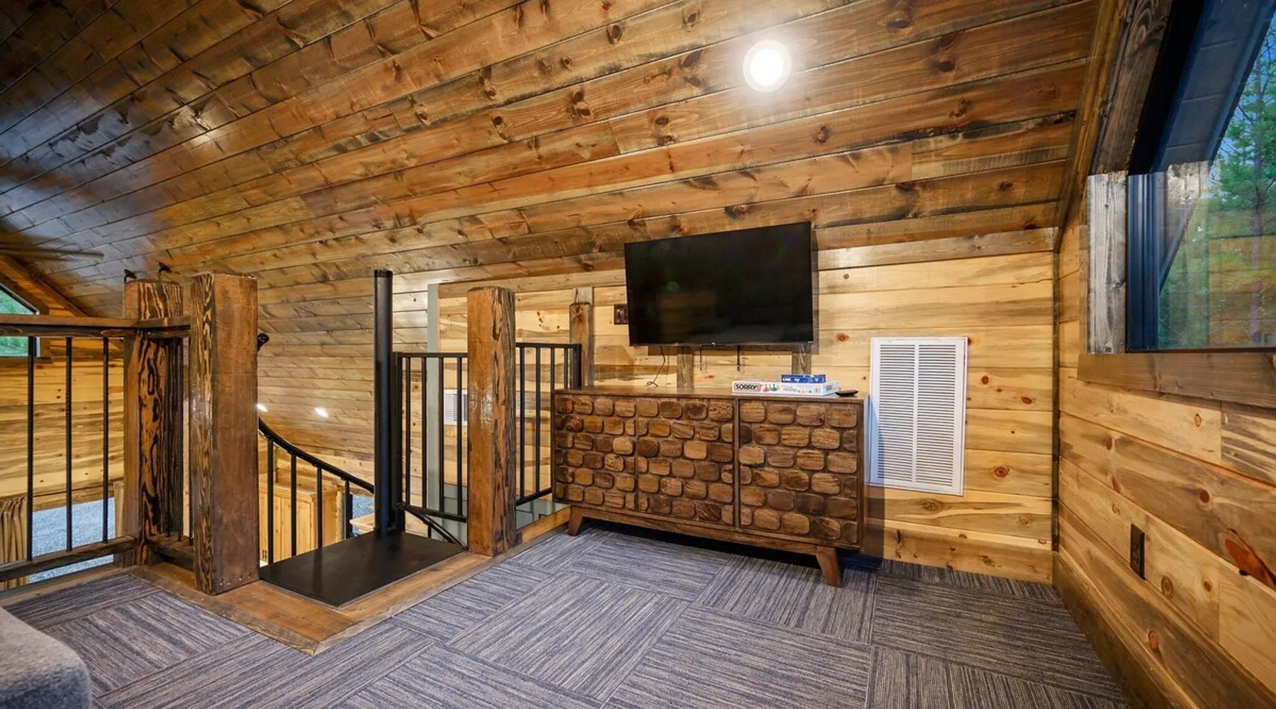 Tequila Sunset,Family,Loft,HotTub,Firepit,EV Plug Tequila Sunset - Hosted by Bravo Cabin Rentals, LLC Tequila Sunset is the epitome of a luxurious getaway with its cozy ambiance and inviting atmosphere. This one-bedroom rental in Broken Bow is perfect for up to three guests who are seeking a relaxing and rejuvenating stay. The highlight of this retreat is undoubtedly the hot tub, where you can soak your worries away while enjoying the serene surroundings. Additionally, the gas grill allows you to indulge in some outdoor cooking, while the fireplaces both inside and outside create a warm and cozy ambiance. The furnished back deck provides the perfect spot to unwind and take in breathtaking views of the surrounding nature. Inside, the living room boasts a comfortable leather couch, a lounge chair, and a gas fireplace, creating a cozy space to relax and unwind. For entertainment, a big-screen TV is also available. The kitchen and dining area are fully stocked with all the essentials you might need during your stay. From a toaster and blender to a Keurig coffee maker (with a starter pack of coffee provided) and a crockpot, you'll have everything you need to prepare delicious meals. The island features four bar stools, providing ample seating for dining or enjoying a quick snack. The bedroom offers a king-sized bed, ensuring a restful night's sleep. Side tables with storage on both sides of the bed provide convenience, while a big-screen TV allows you to unwind with your favorite shows. The bedroom also offers direct access to the patio, allowing you to step outside and enjoy the fresh air. The ensuite bathroom features a double vanity sink, a private toilet, a walk-in shower stocked with shampoo, conditioner, and shower gel, and a luxurious soaker tub for ultimate relaxation. Upstairs, the cozy loft features a game nook with a sofa sleeper, providing additional sleeping accommodations for guests. The outdoor amenities at Tequila Sunset are equally impressive. The patio is furnished with comfortable furniture, allowing you to relax and soak up the sun. The hot tub provides the perfect spot to unwind and enjoy the peaceful surroundings. The gas grill is ideal for outdoor cooking, while the gas fireplace adds warmth and ambiance to your outdoor gatherings. A big-screen TV ensures you don't miss out on your favorite shows even while enjoying the outdoors. The firepit with seating for four is perfect for cozy evenings spent roasting marshmallows and sharing stories. Lastly, a hockey game adds a touch of fun and entertainment to your outdoor experience. General Information - Full-size washer and dryer available in the laundry closet. The bedding for the sleeper sofa is located inside the sofa. Gas fireplaces are seasonally available (October-May 15th). Any cancellations processed in which a refund is due to the guest will incur a $50 processing fee. The maximum occupancy for this cabin is 3, with no exceptions. It is located near all the best restaurants, activities, and park amenities. It is just a short drive to Broken Bow Lake, Beavers Bend State Park, popular hiking trails, restaurants, breweries, wineries, and downtown Hochatown, and access to all the outdoors activities you want – boating, hiking, fly-fishing, kayaking, zip-lining, ATV trails, horseback riding, Cedar Creek Golf Course, Choctaw Landing Casino, mini-golf, helicopter rides, mining for gold, train rides, go-carts, and a great petting zoo. Don't forget these items when you come to visit: • Rain gear and light jackets (Our average rainfall is 55″-60″ each year). • We have beautiful scenic trails; good hiking boots are a must. • Water shoes for our vast shorelines and streams. • Insect repellent, sunblock, and other first-aid supplies. • Coffee and filters – enjoy this while sitting on the deck in the early morning. • Condiments --A starter supply of coffee/filters, salt/pepper, paper towels, toilet paper, bath soap, dish soap, dishwasher tablets, trash bags, and laundry soap is provided. Still, guests may need to bring additional supplies. If we are missing something or you have a question we haven't answered, please feel free to reach out to us directly at Bravo Cabin Rentals and we will personally respond as soon as possible. We look forward to making your next vacation in Broken Bow/Hochatown one you won't forget! Languages English