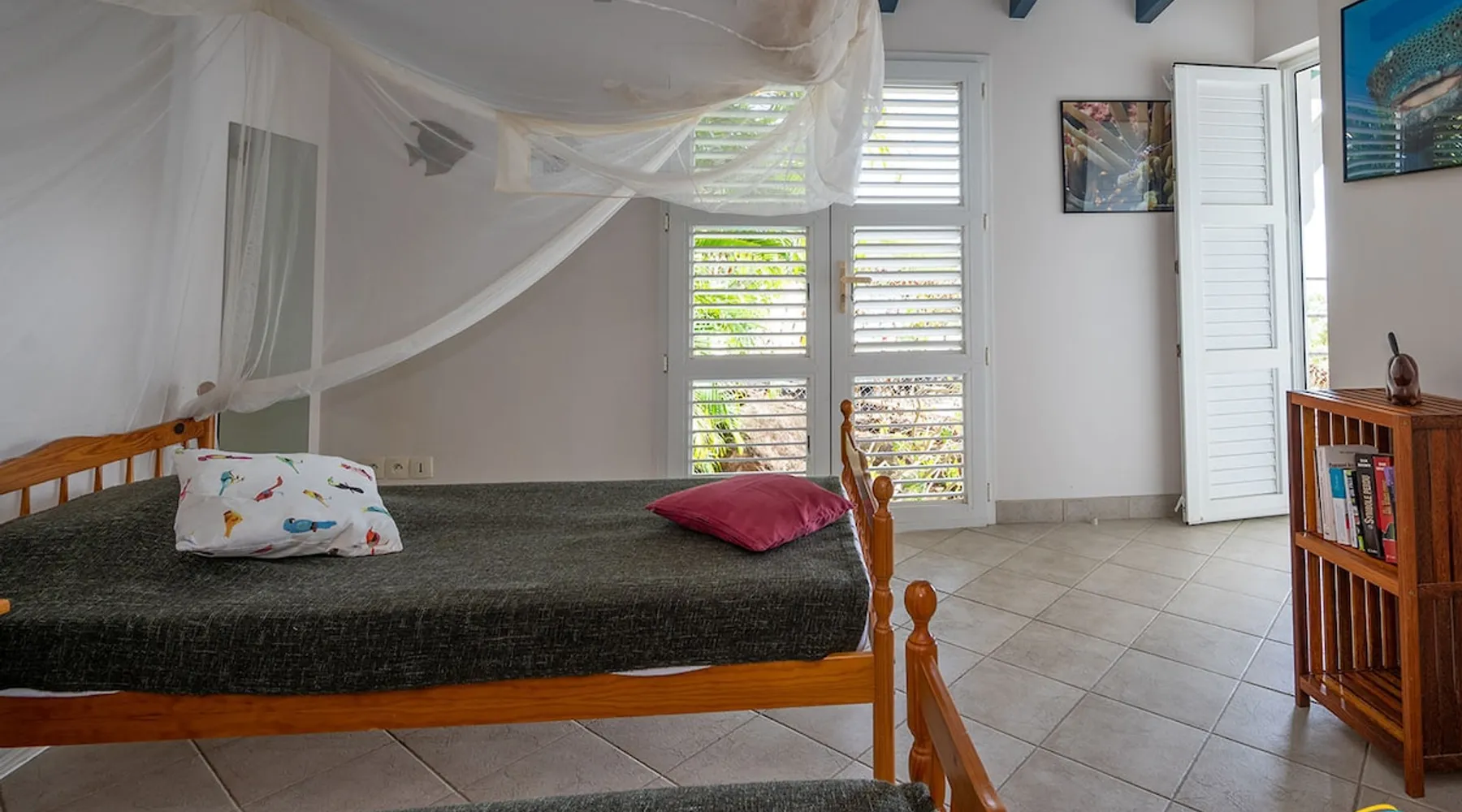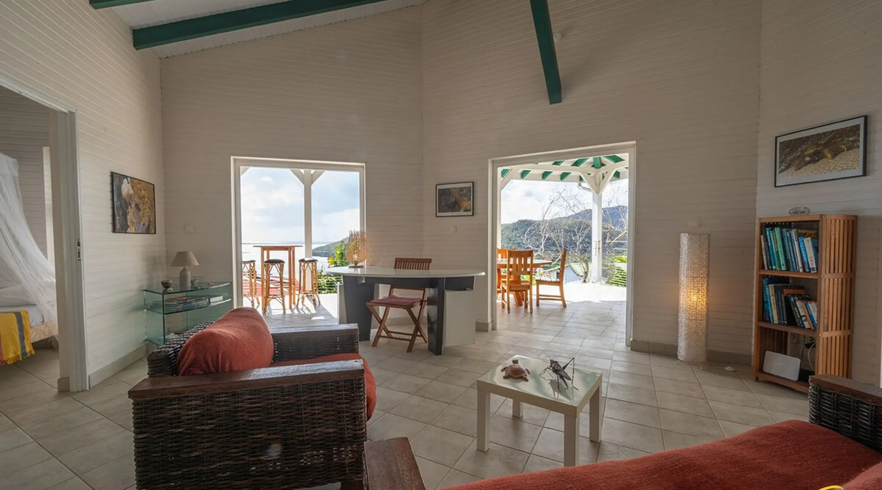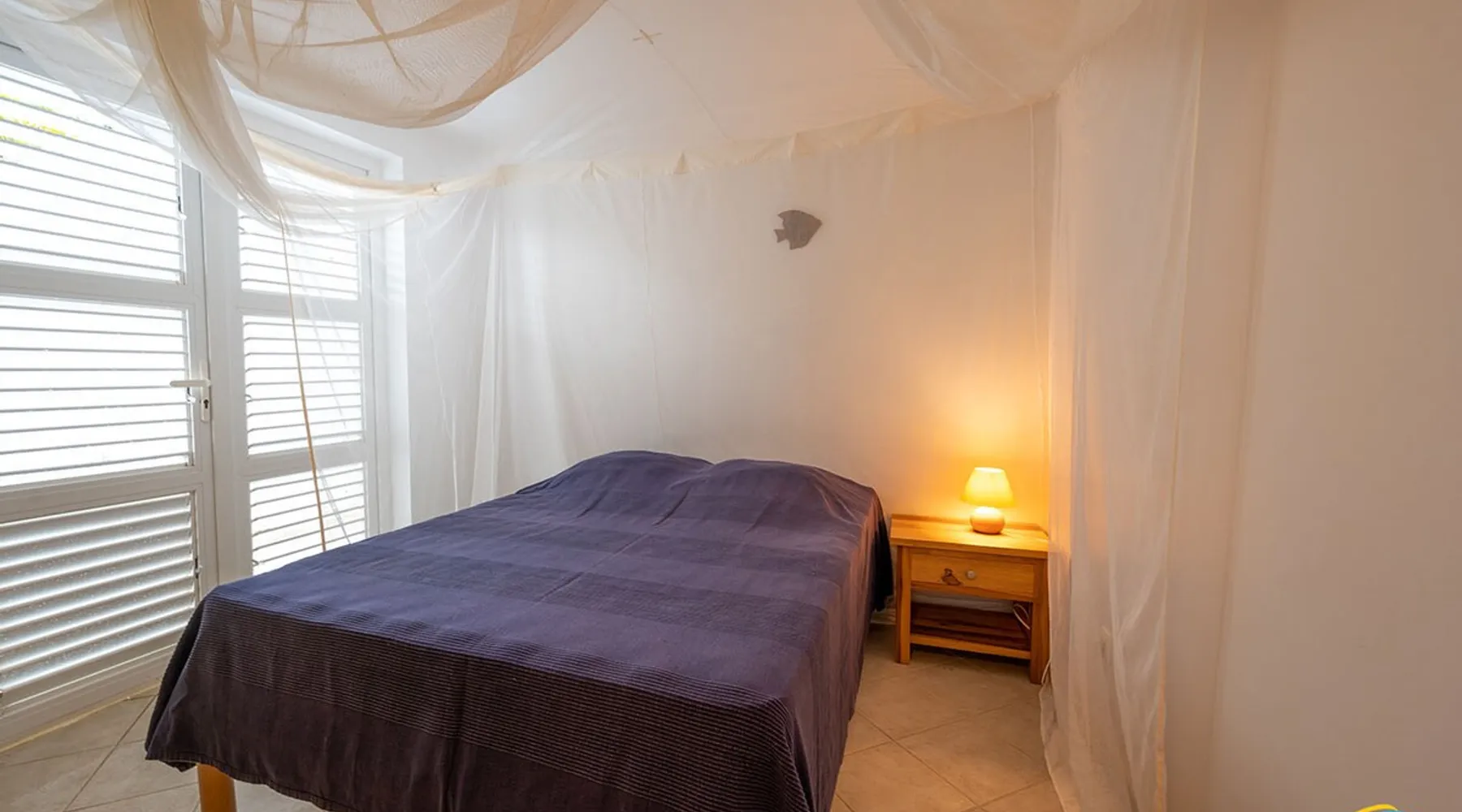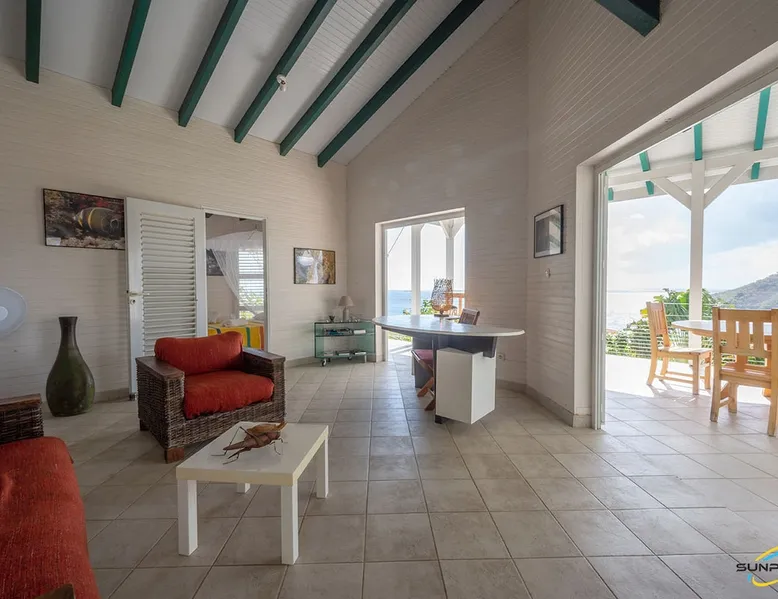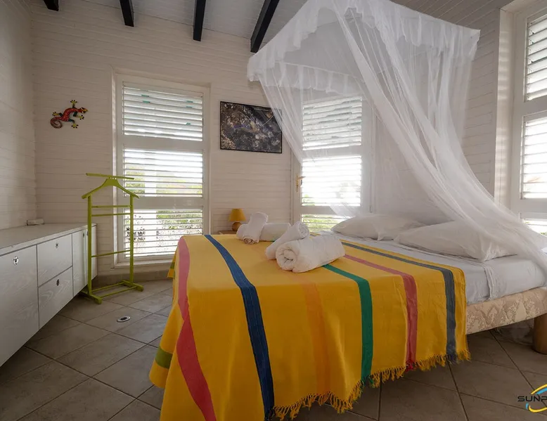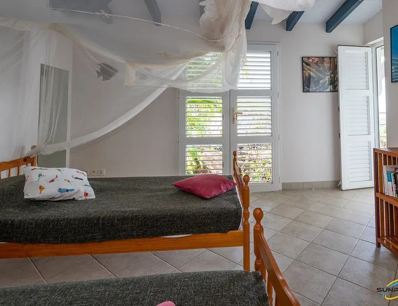 Located 300 m from the beach, this beautiful architect villa will seduce you with its Creole charm, large terrace and exceptional views. The design of the villa is inspired by the architecture of the old Creole houses and benefits from natural air conditioning thanks to the traditional layout of its openings equipped with louvers, for an eco-friendly experience. The space Upstairs, you will find the T3 "turquoise green" of 82 m² composed of a large equipped kitchen, laundry room, bathroom and separate toilet, two bedrooms with fans and mosquito nets and living room with beautiful cathedral ceiling. This living room opens onto a vast 62 m² terrace from where you can admire the legendary sunsets over the Caribbean sea. A last independent bedroom on the ground floor, 23 m² has bathroom and toilet. Guest access The entire property is reserved for you, except for a technical room, a garage in which I keep some personal belongings and equipment and a fourth bedroom located on the ground floor that is not included in your rental (this room will not be rented during your stay). Other things to note Presence of a high terrace and stairs, young children must be supervised.