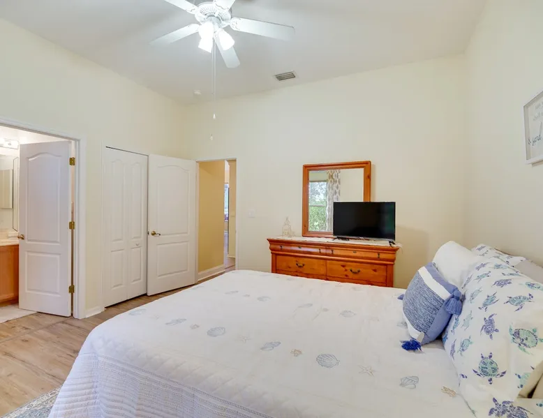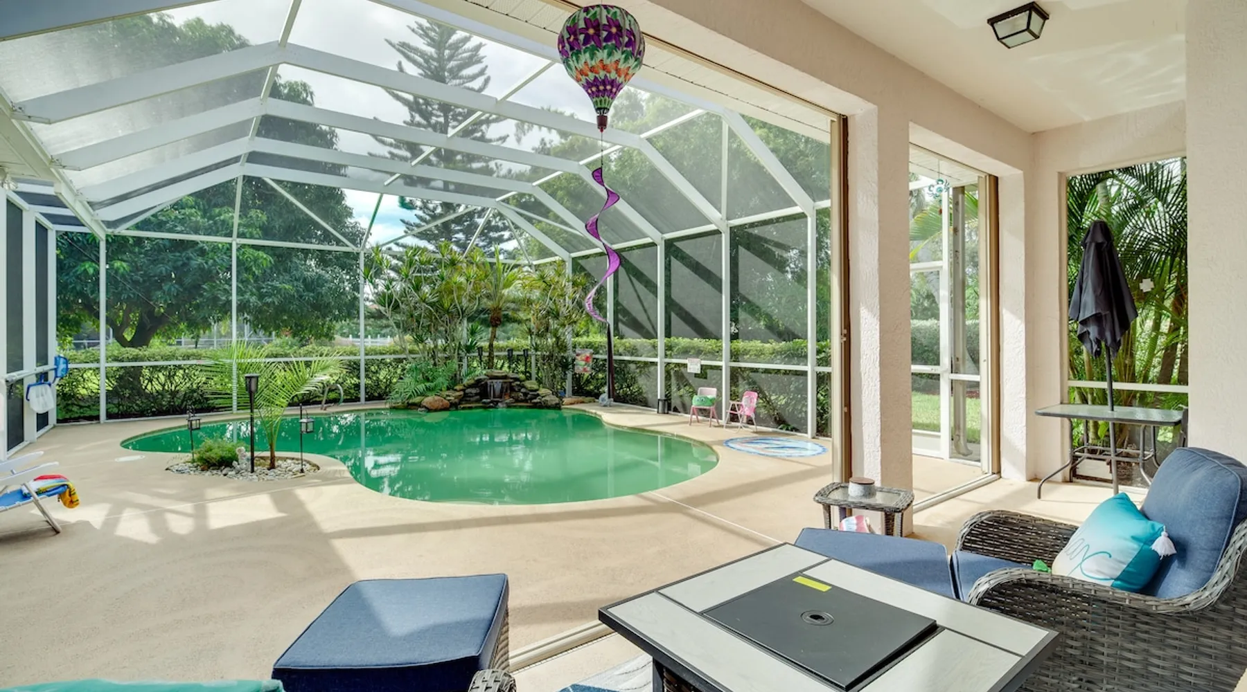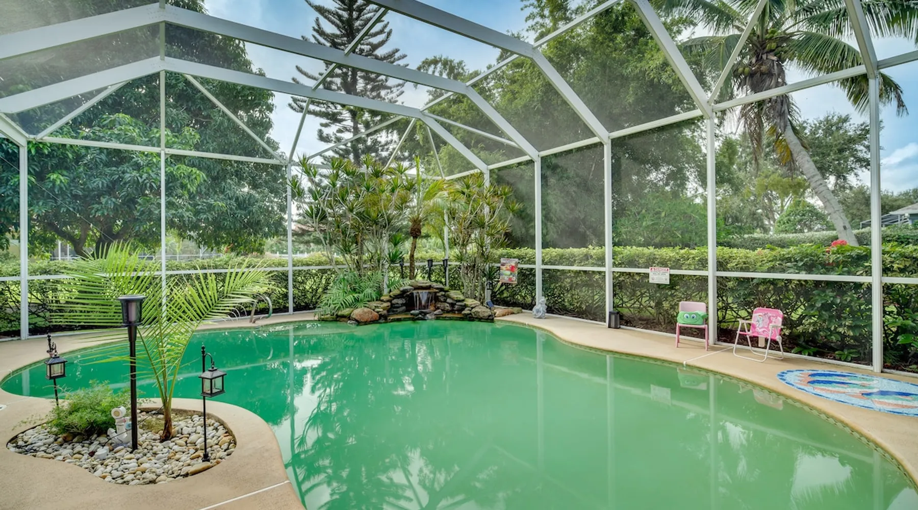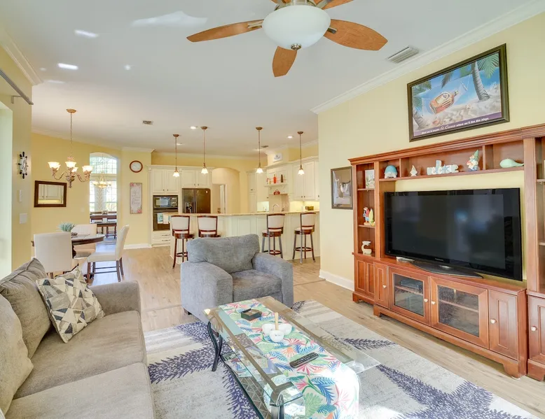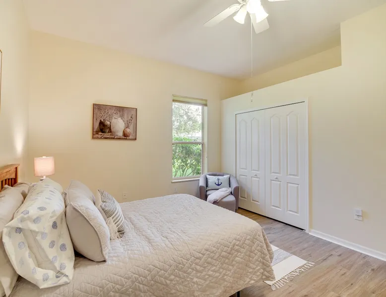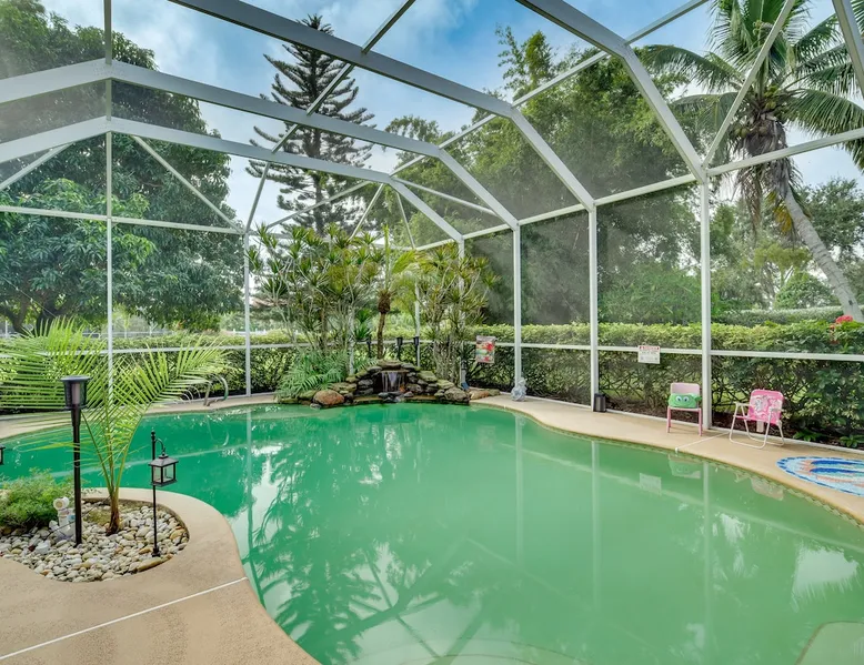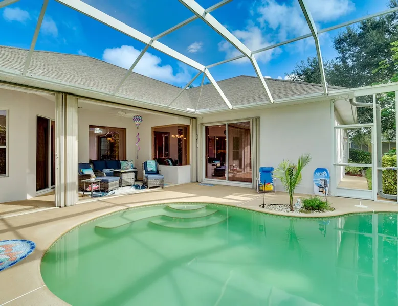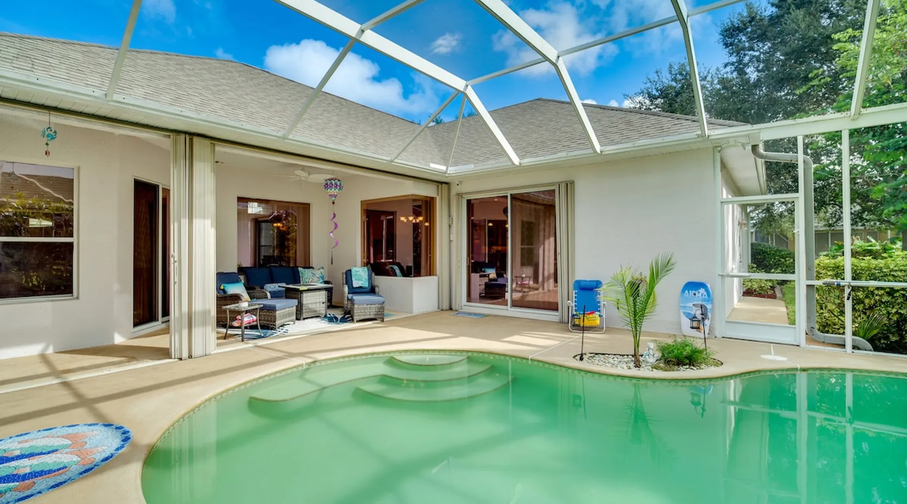 Escape to the shores of Merritt Island with this ranch-style, 4-bedroom, 3-bathroom vacation rental home as your base. Located near Cocoa Beach and surrounded by parks, this getaway offers in-unit laundry, a Smart TV, and a covered patio. After you settle in, take a dip in the private pool or relax on the patio furniture. Then, head out to visit the Kennedy Space Center, Westgate Cocoa Beach Pier, or a local golf course. When you return, enjoy a movie night with the Smart TV to end the day. The space Covered Patio | 13 Mi to Cocoa Beach | Central Location | Day Trip to Disney Bedroom 1: Queen Bed | Bedroom 2: Full Bed | Bedroom 3: Full Bed | Bedroom 4: Queen Bed | Additional Sleeping: 2 Queen Air Mattresses HOME LIVING: Smart TV, washer/dryer, board games, patio furniture KITCHEN: Dishwasher, fridge, stovetop, oven, microwave, coffee maker, dining table, breakfast bar, blender, cooking basics, Crockpot, dishware & flatware, ice, spices, toaster GENERAL: Free WiFi, ceiling fans, central air conditioning, central heating, linens, towels, complimentary toiletries, hair dryer, hangers, trash bags, paper towels FAQ: Step-free access, 3 exterior security cameras (facing out), quiet hours 10:00 PM-7:00 AM PARKING: Driveway (4 vehicles) Guest access Guests will have access to the entire property via keyless entry Other things to note - No smoking - No pets allowed - No events, parties, or large gatherings - Must be at least 25 years old to book - Additional fees and taxes may apply - Photo ID may be required upon check-in - NOTE: Please observe quiet hours from 10:00 PM-7:00 AM - NOTE: The maximum number of people allowed on the property at any time is 8 - NOTE: Your safety matters. This property features 3 exterior security cameras. Camera 1 is located at the front of the home facing the driveway, camera 2 is a Ring doorbell device with an exterior security camera facing the pool area, and camera 3 is located on the side of the home facing out. The cameras are outward facing and do not look into interior spaces. The cameras record video and audio continuously while activated by motion