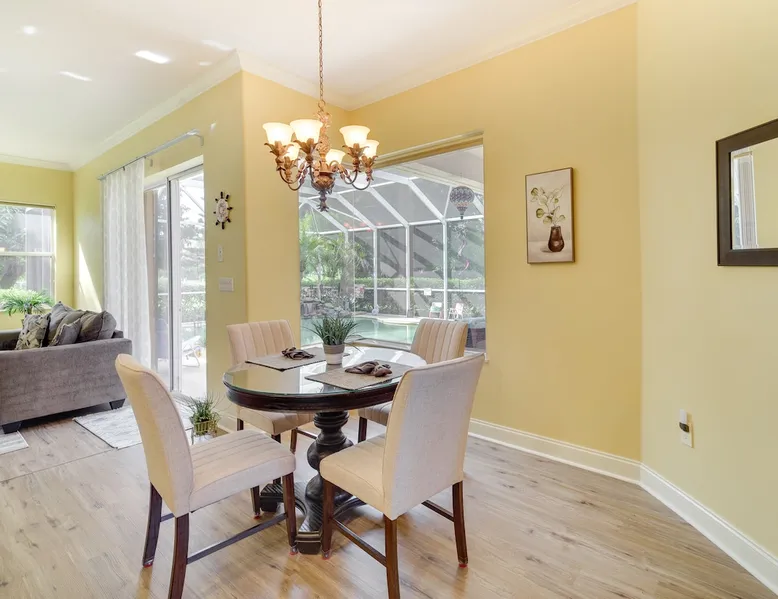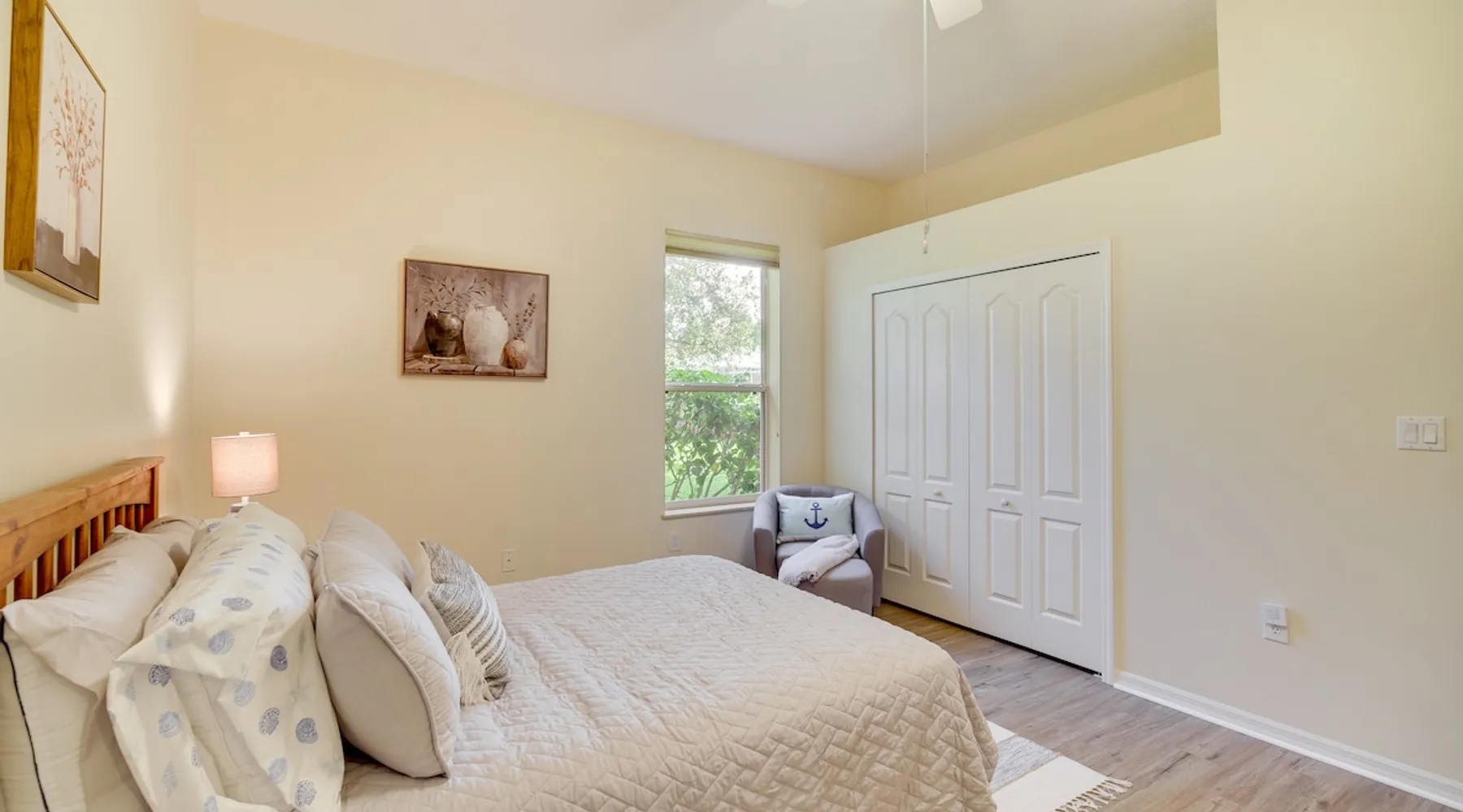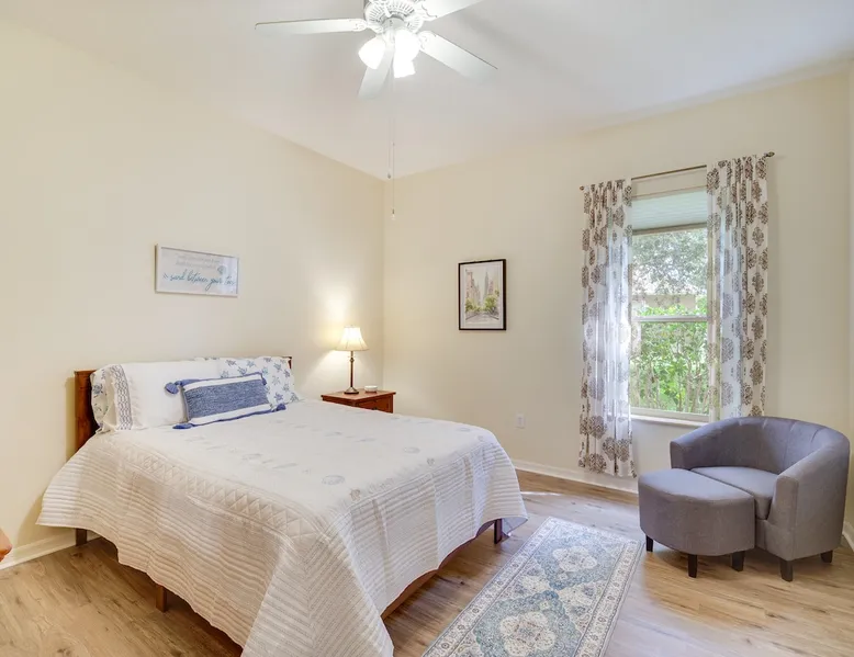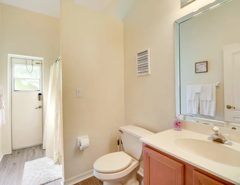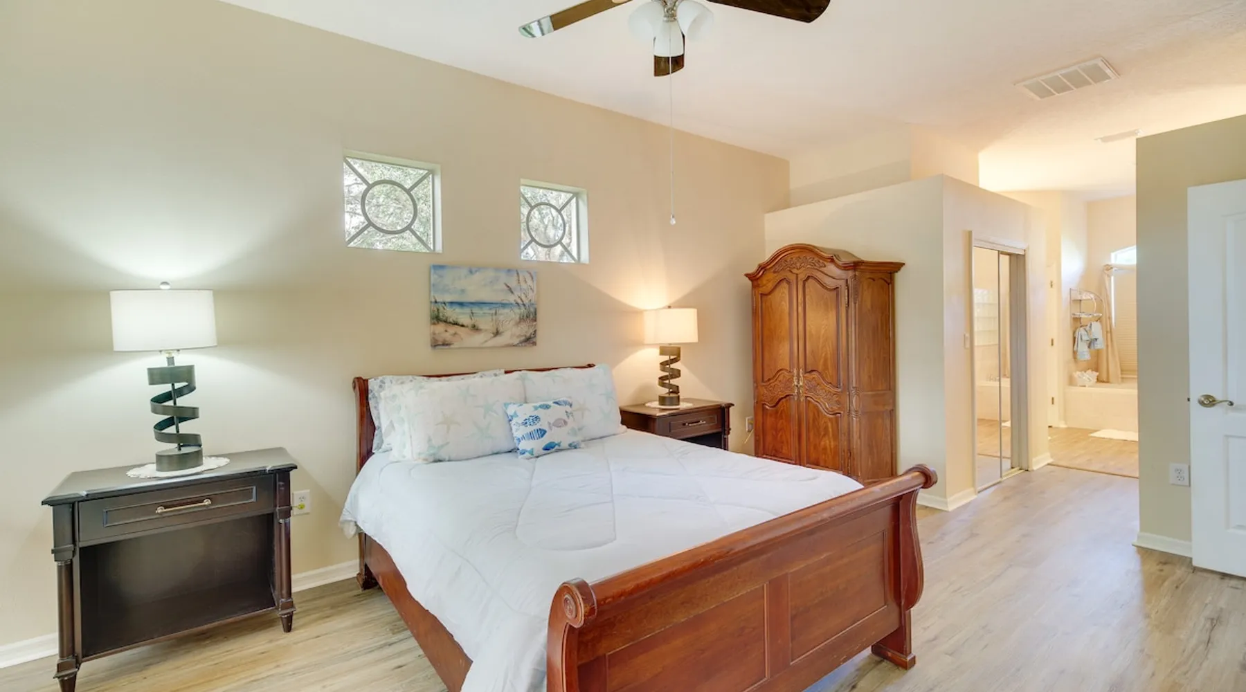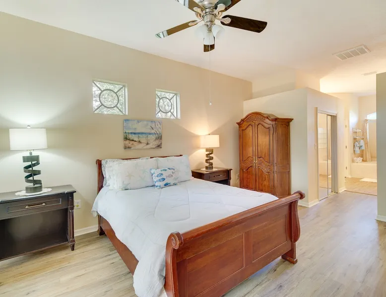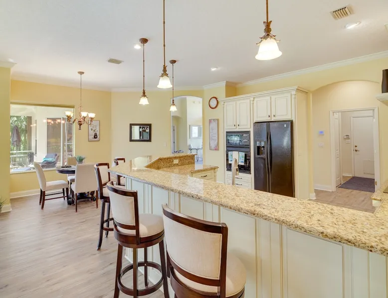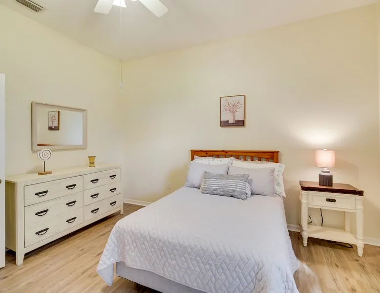 Escape to the shores of Merritt Island with this ranch-style, 4-bedroom, 3-bathroom vacation rental home as your base. Located near Cocoa Beach and surrounded by parks, this getaway offers in-unit laundry, a Smart TV, and a covered patio. After you settle in, take a dip in the private pool or relax on the patio furniture. Then, head out to visit the Kennedy Space Center, Westgate Cocoa Beach Pier, or a local golf course. When you return, enjoy a movie night with the Smart TV to end the day. The space Covered Patio | 13 Mi to Cocoa Beach | Central Location | Day Trip to Disney Bedroom 1: Queen Bed | Bedroom 2: Full Bed | Bedroom 3: Full Bed | Bedroom 4: Queen Bed | Additional Sleeping: 2 Queen Air Mattresses HOME LIVING: Smart TV, washer/dryer, board games, patio furniture KITCHEN: Dishwasher, fridge, stovetop, oven, microwave, coffee maker, dining table, breakfast bar, blender, cooking basics, Crockpot, dishware & flatware, ice, spices, toaster GENERAL: Free WiFi, ceiling fans, central air conditioning, central heating, linens, towels, complimentary toiletries, hair dryer, hangers, trash bags, paper towels FAQ: Step-free access, 3 exterior security cameras (facing out), quiet hours 10:00 PM-7:00 AM PARKING: Driveway (4 vehicles) Guest access Guests will have access to the entire property via keyless entry Other things to note - No smoking - No pets allowed - No events, parties, or large gatherings - Must be at least 25 years old to book - Additional fees and taxes may apply - Photo ID may be required upon check-in - NOTE: Please observe quiet hours from 10:00 PM-7:00 AM - NOTE: The maximum number of people allowed on the property at any time is 8 - NOTE: Your safety matters. This property features 3 exterior security cameras. Camera 1 is located at the front of the home facing the driveway, camera 2 is a Ring doorbell device with an exterior security camera facing the pool area, and camera 3 is located on the side of the home facing out. The cameras are outward facing and do not look into interior spaces. The cameras record video and audio continuously while activated by motion