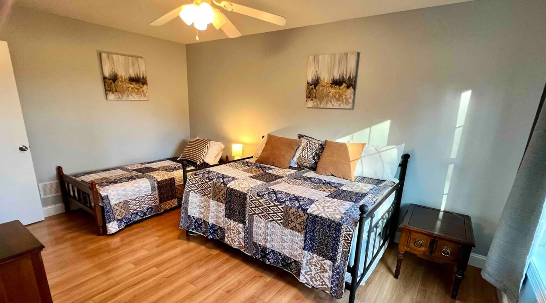 This charming 3-bedroom, 2-bath residence boasts mountain views and wildlife, making it an ideal city retreat. Nestled on a 47-acre working farm, it comes equipped with all the necessities. Unwind with family and friends at the seasonally shared heated pool, available from May 15th to September 15th. Savor snacks around the backyard fire pit or pay a visit to our farmer friend, Mr. Brian, and his cows. Discover tranquility and peace in this welcoming home. The space Our ranch house spans 2,000 square feet and features a modern, comfortable, and inviting design. It showcases stunning light-colored hardwood floors throughout. As you enter the house, you will be greeted by a spacious and bright living room. Adjacent to the front door is a coat closet where you can hang your coat and leave your shoes. Walking into the living room, the dining and kitchen areas share a large, open space. The kitchen table has seating for six people. Three additional chairs can be found in the hallway closet. LIVING ROOM - The living room offers a range of seating choices for relaxation, gaming, TV viewing, or just unwinding. Feel free to pick a board or card game from the shelves, enjoy a book, or take some time to relax. You'll have access to Netflix, Hulu, Disney+, and other apps on the 55-inch smart TV in the living room. With internet speeds of 500-550 Mbps, the home is perfect for simultaneously streaming from multiple devices. KITCHEN - The cook-friendly kitchen includes a full-sized refrigerator, stove/oven, toaster, microwave, dishwasher, Keurig, and regular coffee makers, pots, pans, dishes, and utensils. All faucets provide clean, filtered well water. There is salt/pepper, sugar, basic seasonings, and olive oil spray. BATHROOM - The hallway leads to a full bathroom with a walk-in shower, washer and dryer and a hair dryer. There are towels and hand towels. BEDROOM 1 - The first bedroom includes a full-size bed featuring an 8-inch mattress topper for a softer sleeping experience, a small dresser, a small smart TV, and two closets. BEDROOM 2 - The second bedroom is very kid-friendly. It features a full-size daybed with a twin trundle bed underneath, as well as another twin bed. The room also includes a closet. MASTER BEDROOM - The master bedroom features a queen bed, a dresser, a 43-inch smart TV, two closets, and a full ensuite bathroom. There is an iron in the closet. MASTER BATHROOM - It also includes a walk-in shower and a heat lamp to keep guests warm in winter. One inflatable mattress is available for guest use upon request only. FRONT DECK - The front deck offers a great spot to enjoy stunning mountain views both day and night. It includes a dining table with chairs for outdoor meals, a propane grill, and a cozy propane fire pit, ideal for cool evenings. BACKYARD - **Starting from mid-October to April, the yard will be inaccessible due to manure being spread to grow grass. The fire pit will be on the side of the house. The private backyard features outdoor dining seating and a wood fire pit. You'll find s’more sticks in the kitchen for making delicious marshmallow treats. Feel free to bring your own firewood, though options are available. My daughter has bundled firewood into large portions for sale at $10 each. Alternatively, you can pre-request firewood when booking your reservation. LOCATION - The 47-acre property is set up on a small mountain amongst the trees, almost 1/2 mile off of the main road. Park anywhere in the driveway, just not in the grass. Your stay includes the use of the garage bay nearest to the living space. (Right one when looking at the house.) There is plenty of space to park an RV or boat on a trailer. POOL / SWING SET - Your rental grants access to the heated in-ground pool, which is open seasonally from May 15th to September 15th. This fun area features a slide, a children's swing set, multiple lounge chairs with umbrellas, sofas, tables, a ping pong table, cornhole and a pool house equipped with a shower, toilet, and changing room. Guests can also enjoy scenic mountain views. Both the pool and swing set are conveniently located next to the host's house, just a short stroll up the road. Additionally, your rental includes the use of a golf cart for easier access to the pool area, but only licensed drivers are permitted to operate the cart. **Please note that the pool is SHARED with another rental house on the property. It has a depth of 6 feet. An adult MUST supervise children at ALL times. Do not swim alone. WE PROVIDE - We supply two rolls of toilet paper for each bathroom, along with linens, pillows, towels, and blankets. In the master bathroom, you'll find shampoo and conditioner, and Keurig cups are provided in the kitchen. Please remember to bring your own paper towels, napkins, and other similar items. PET FRIENDLY - The house welcomes dogs, allowing up to 2; exceptions may apply. Please ensure dogs do not go on any furniture or bedding. Your dogs must be part of the reservation count. Unfortunately, we cannot accommodate cats because of significant allergies. FRIENDLY FURRY VISITORS - Our two little dogs, Chico & Scarlett, have a doggy door leading outside and might come by to say hello if you're outside. They are both quite friendly. Additionally, there are friendly barn cats on the property that may also stop by. Smudge the cat really enjoys visiting this house. If you do not want them to be around, please just let me know. EV CHARGING - If you drive an EV vehicle, you'll have access to a 240v outlet that is separate from the house. Remember to bring your own charging cable to plug in. An additional fee of $20 per night applies for this service. LARGE GROUPS - Are you looking to accommodate a bigger group across two houses and seasonally an RV? If so, you're in luck! We also have a 2 bedroom, 2 bath house on the property that can sleep up to 6 guests. : airbnb.com/h/country-house-farm-pool AND seasonally rent our 38' foot RV: airbnb.com/h/boondock-glamping BAB