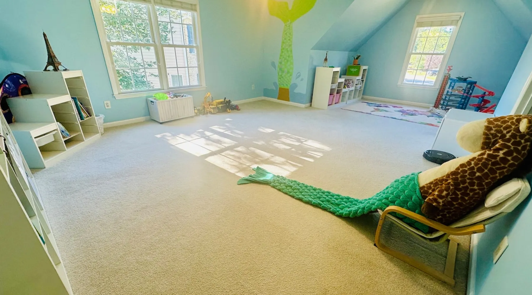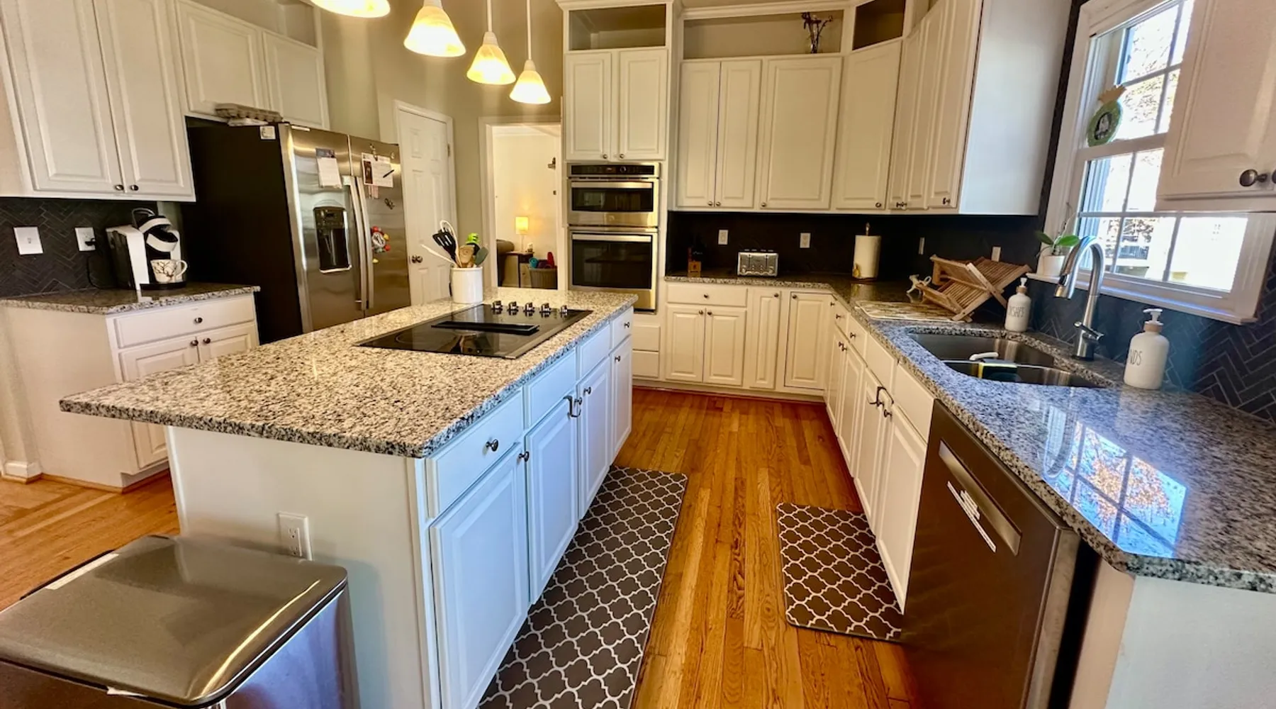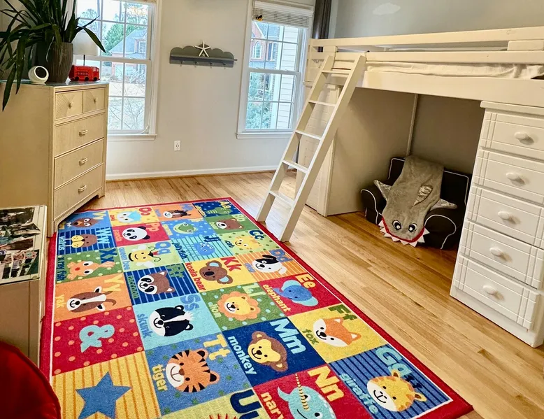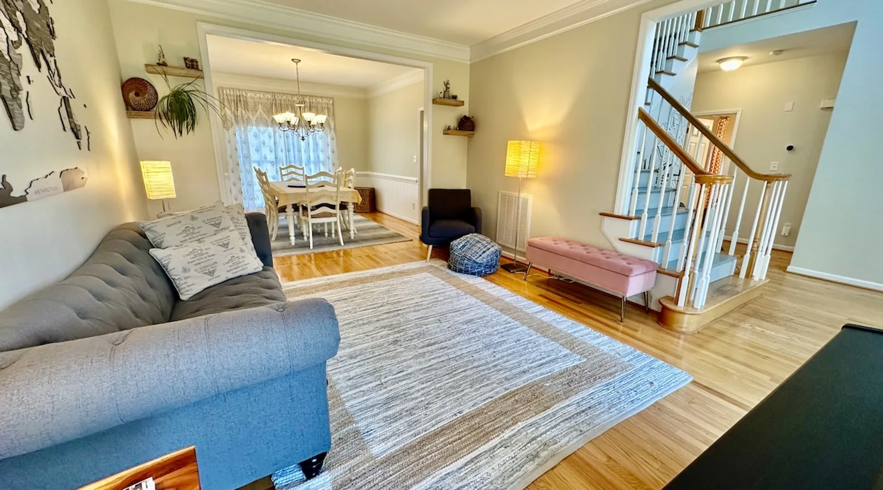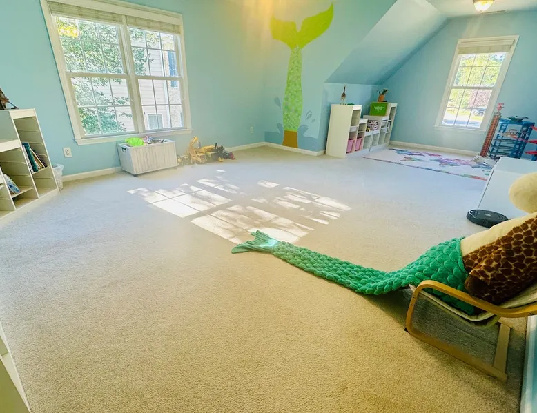 Our house is your house. Welcome to Durham! The house is near Southpoint mall, grocery stores, I40, 8 mins to RTP, ~13 mins to the airport, 17 mins to UNC hospitals, and 18 mins to Duke University. There are 4 bedrooms, 3 bathrooms, a playroom, a living room, front room, dining room, kitchen, sun room and a fenced yard. There are two small dog doors that lead into the fenced in back yard. Plus you have access to a neighborhood pool & playground. Beds for 7 + queen air mattress for 2= sleeps 9 Guest access You will have access to the entire house except for the garage, office, and a few closets - not pictured. Other things to note The house is well stocked as we live there a big chunk of the year. The house can sleep 9. That’s 7 in beds (king, queen, queen, twin) plus a queen blow-up. Pack and play also available upon request.