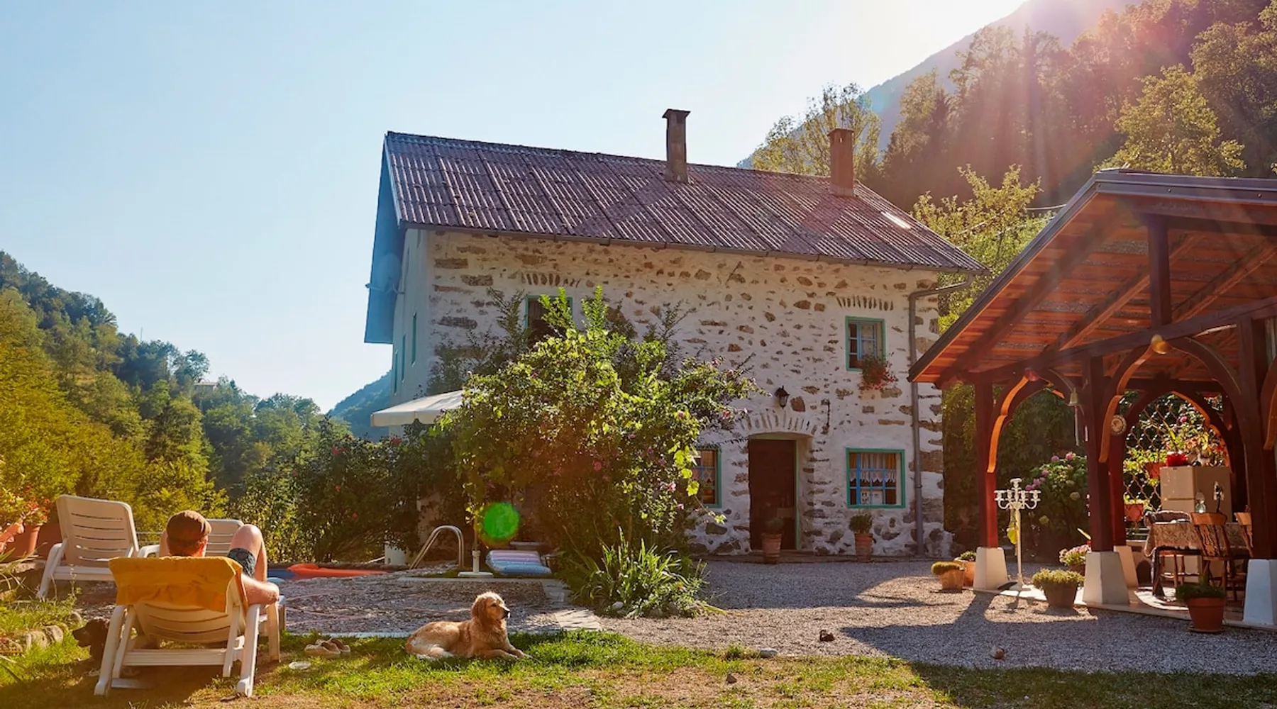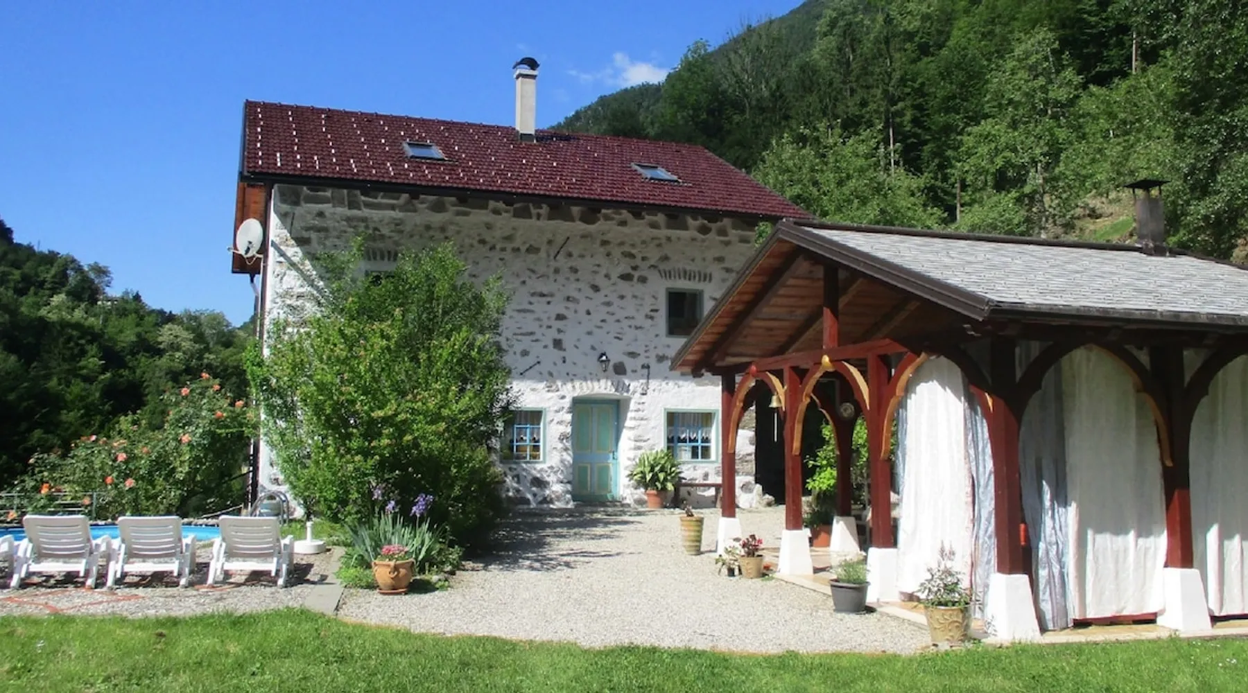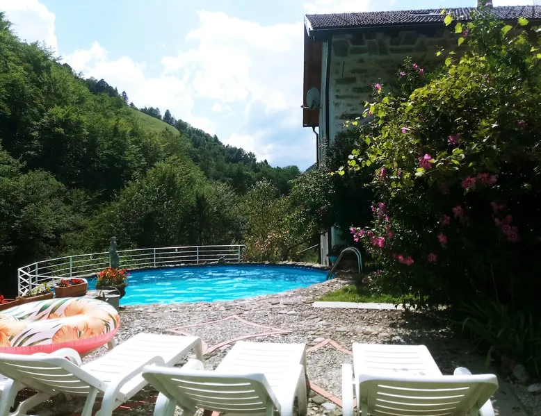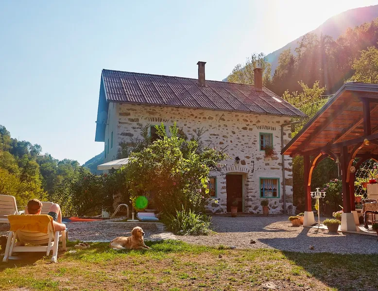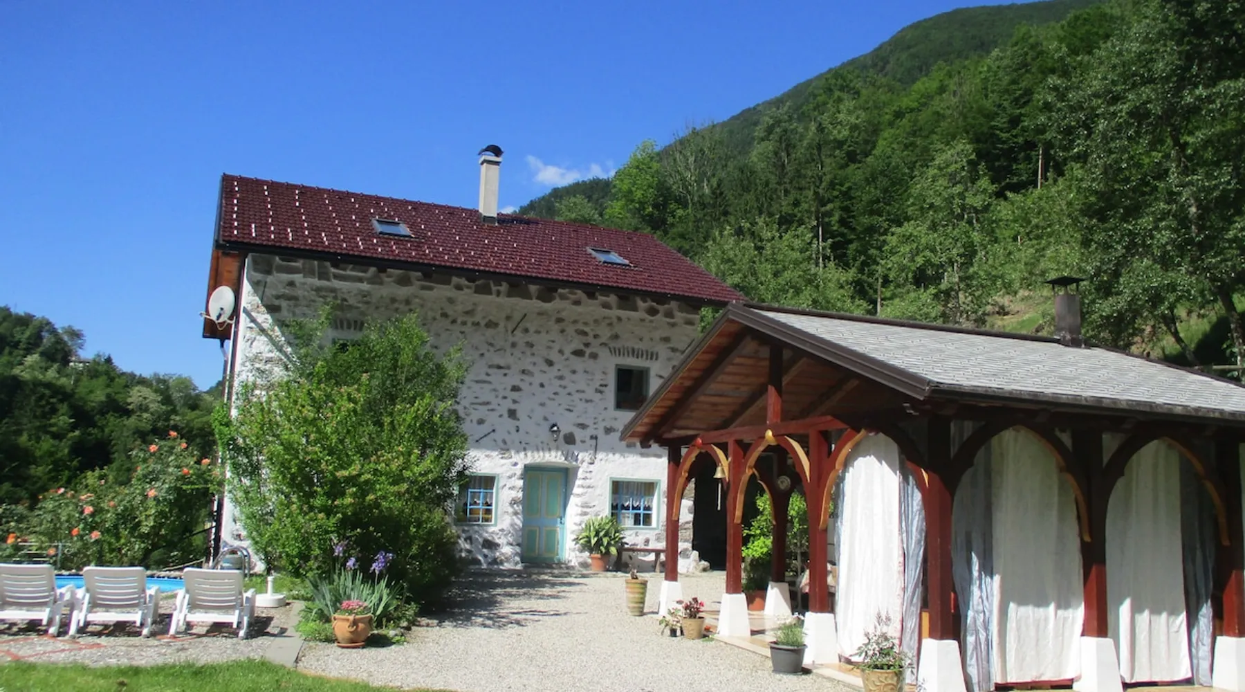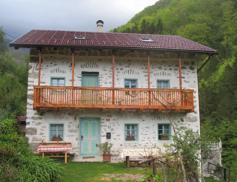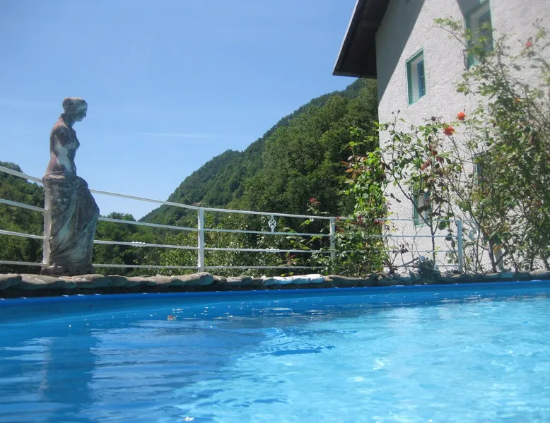 "Pri Mačku" is old home house, from 1919, with swimming pool, music pavillion with chimney, hot tube, wine cellar and etno museum. Property stay near Zadlascica, christal clear river of Julian Alps in Soca Valley, 6 km from Tolmin. House has capacity for 15 persons, "old style" kitchen, 6 sensitive bedrooms, 2 bathroomds, large living room. A private pool and a hot tub, both open from 15th of May till 15th September. Surrounded with pasture grounds for sheep. No owner, no neighbour. Special! The space The house is masonry with carved quartz stone. All areas of the house are furnished in a rustic style, with solid wood furniture. It gives the six bedrooms a very special touch...! The restored beds and closets are finely styled and in 100 years old! In the two bedrooms, the walls of the windows are painted with decorations of vitic flora, flowers and surrounding birds. Impressive relaxation allows for swimming in the pool. In case of bad weather there is the possibility of soaking in the spa. Anyway, it's memorable to listen to the Vivaldi concert while floating a fire on a stylized sofa in a music pavilion and sipping a local Sauvignon from a home winery... The pavilion has room for 10 people. For 5 additional people, there is a table with benches or a dining room in the living room near it. Caution is required with the pool and hot tub, especially children, so the use of both is at your own risk, which is confirmed with the acceptance of the reservation. Guest access Upon rental, guests receive a 6-bedroom house, a music pavilion, a winery, and a pool and a hot tub that operate from May 15 to September 15. The house is surrounded by several pastures and a three sheep barn whose guests can feed one time a day with a bread loaf available. Also, firewood and a bag of charcoal are also available to make a barbecue in the fireplace in the gazebo. There are two paths leading from the house to the Zadlakica River. At low water level, it is possible to climb up the navy for about 1.5 km and make its way through two smaller canyons, hollowed into the rocks, which are a natural landmark. Other things to note Please know that heating costs can be charged separately in the winter months.