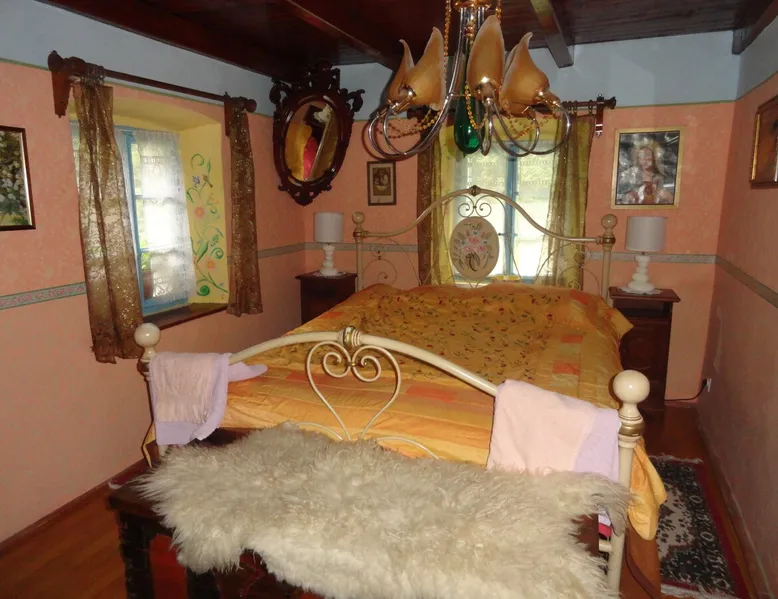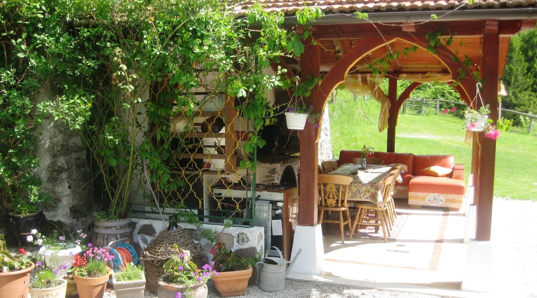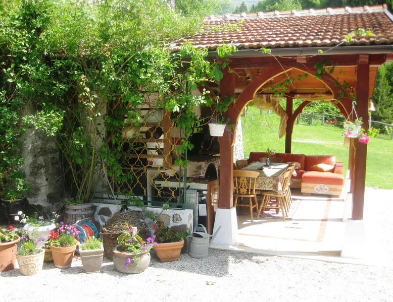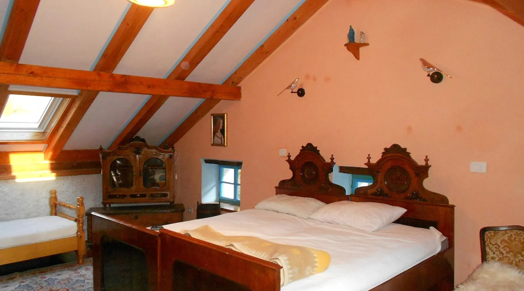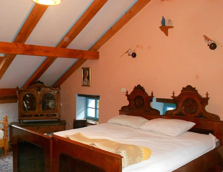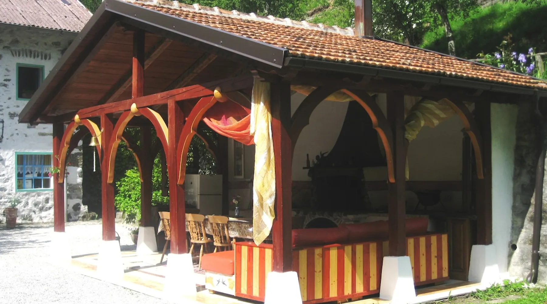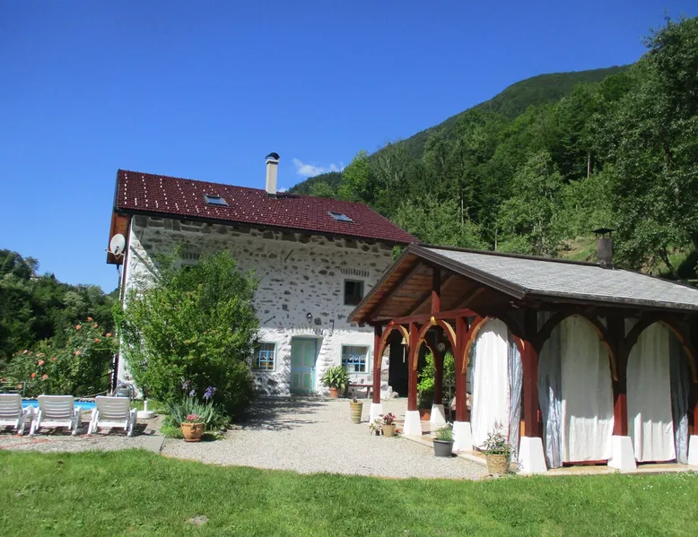 "Pri Mačku" is old home house, from 1919, with swimming pool, music pavillion with chimney, hot tube, wine cellar and etno museum. Property stay near Zadlascica, christal clear river of Julian Alps in Soca Valley, 6 km from Tolmin. House has capacity for 15 persons, "old style" kitchen, 6 sensitive bedrooms, 2 bathroomds, large living room. A private pool and a hot tub, both open from 15th of May till 15th September. Surrounded with pasture grounds for sheep. No owner, no neighbour. Special! The space The house is masonry with carved quartz stone. All areas of the house are furnished in a rustic style, with solid wood furniture. It gives the six bedrooms a very special touch...! The restored beds and closets are finely styled and in 100 years old! In the two bedrooms, the walls of the windows are painted with decorations of vitic flora, flowers and surrounding birds. Impressive relaxation allows for swimming in the pool. In case of bad weather there is the possibility of soaking in the spa. Anyway, it's memorable to listen to the Vivaldi concert while floating a fire on a stylized sofa in a music pavilion and sipping a local Sauvignon from a home winery... The pavilion has room for 10 people. For 5 additional people, there is a table with benches or a dining room in the living room near it. Caution is required with the pool and hot tub, especially children, so the use of both is at your own risk, which is confirmed with the acceptance of the reservation. Guest access Upon rental, guests receive a 6-bedroom house, a music pavilion, a winery, and a pool and a hot tub that operate from May 15 to September 15. The house is surrounded by several pastures and a three sheep barn whose guests can feed one time a day with a bread loaf available. Also, firewood and a bag of charcoal are also available to make a barbecue in the fireplace in the gazebo. There are two paths leading from the house to the Zadlakica River. At low water level, it is possible to climb up the navy for about 1.5 km and make its way through two smaller canyons, hollowed into the rocks, which are a natural landmark. Other things to note Please know that heating costs can be charged separately in the winter months.