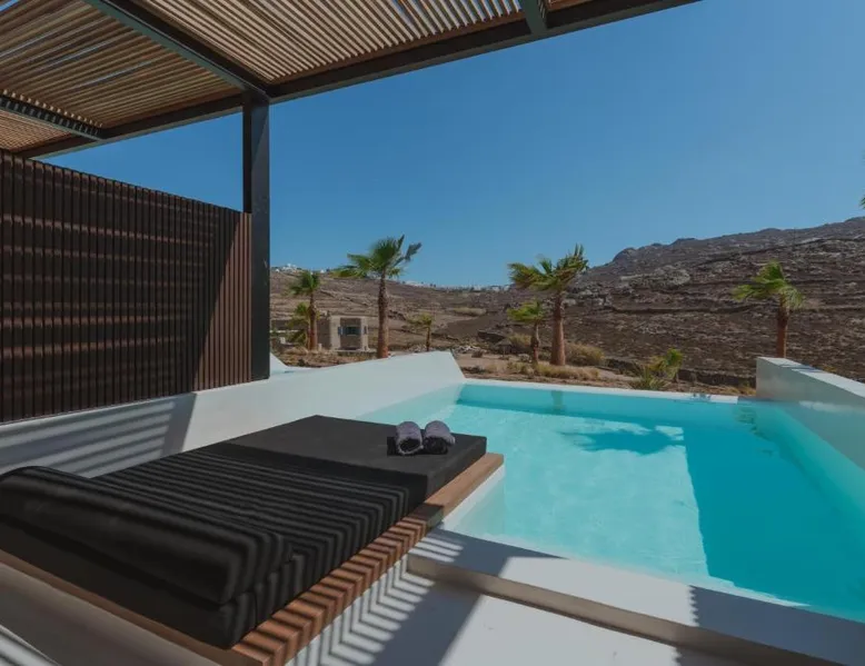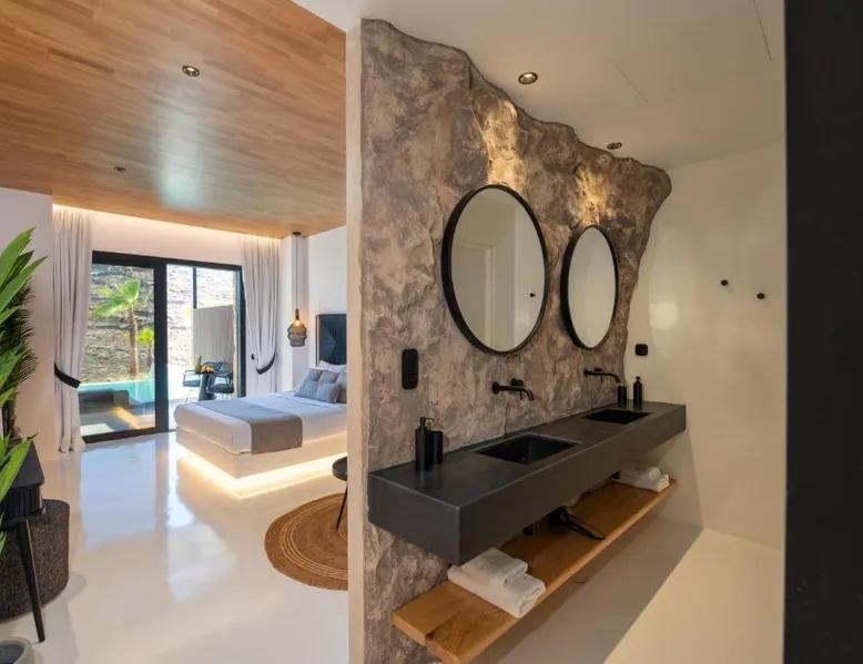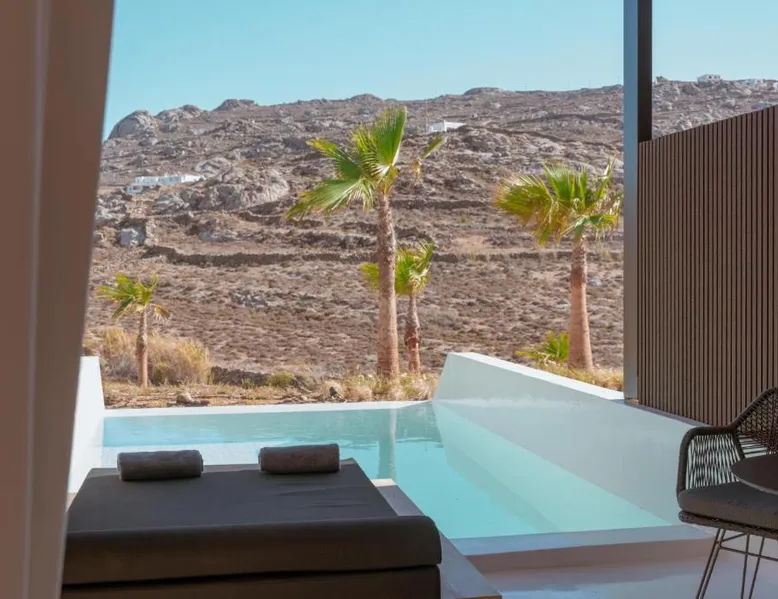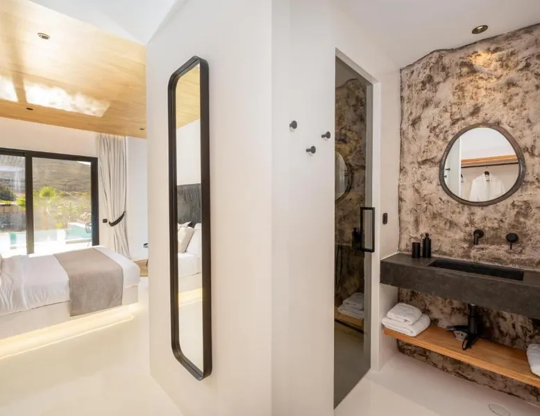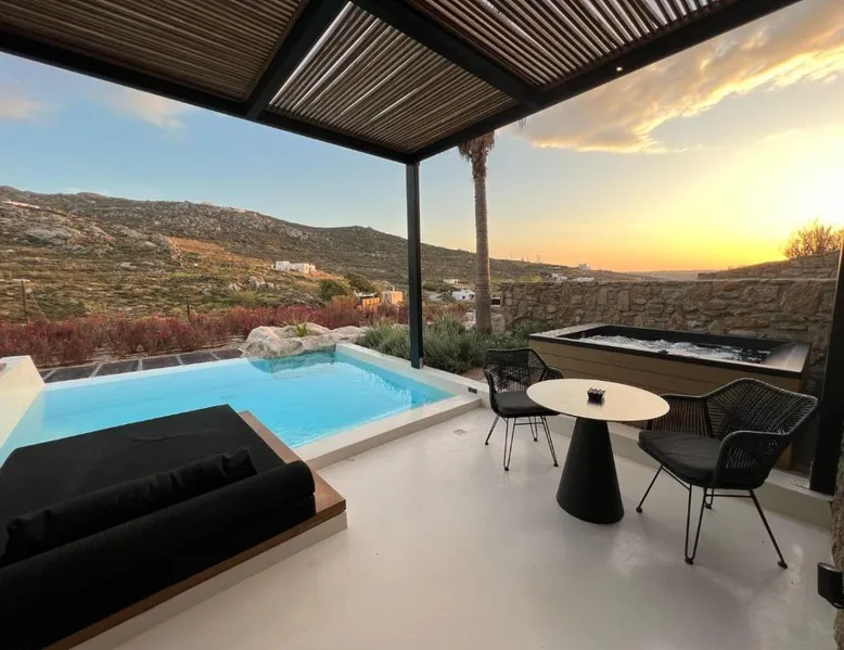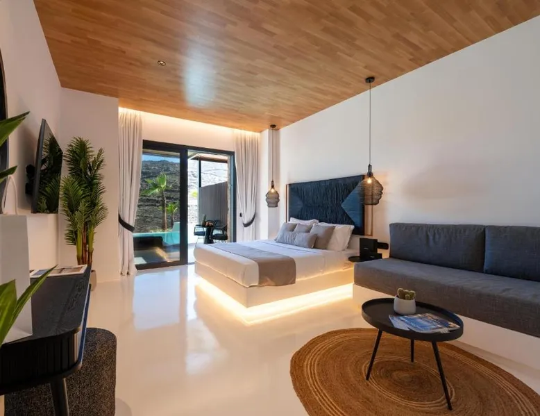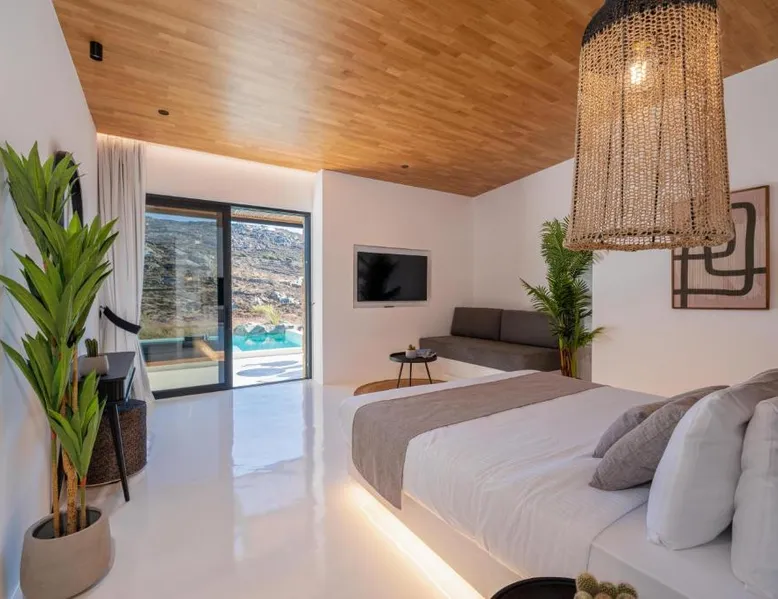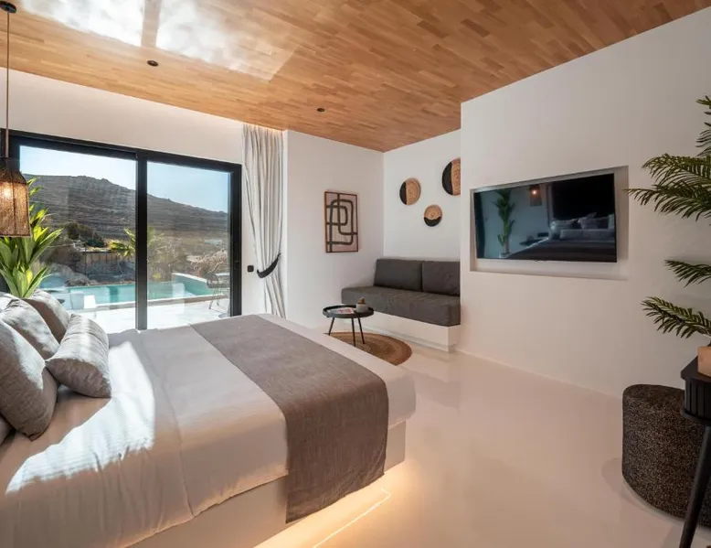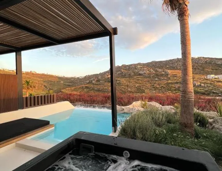 Located in Ftelia, just a few steps from Ftelia Beach, Ftelia Black Villas offers luxurious accommodations with an outdoor infinity pool, a scenic-view plunge pool, private parking, a lush garden, and a sun terrace. Guests can unwind at our bar restaurant with panoramic views, indulge in our cave spa, or stay active in the 24/7 gym. Wellness services, including a massage room, are available for ultimate relaxation. Each elegantly designed room features an open-type wardrobe, a desk, a flat-screen TV, a private bathroom, and air conditioning. Upgrade to our King Suite for an exclusive outdoor jacuzzi. A daily breakfast buffet is served, and guests can enjoy airport transfers and room service. Free WiFi is available throughout the property. Panormos Beach is 1.1 mi from Ftelia Black Villas, while Agios Sostis Beach is 1.7 mi away. The nearest airport is Mykonos Airport, 5 mi from the hotel. Guests will have a special experience as the suite features a pool with a view. Featuring a private entrance, this air-conditioned suite consists of 1 bedroom and 1 bathroom with a walk-in shower and a bath. Boasting a terrace with garden views, this suite also provides soundproof walls and a flat-screen TV with satellite channels. The unit offers 2 beds.