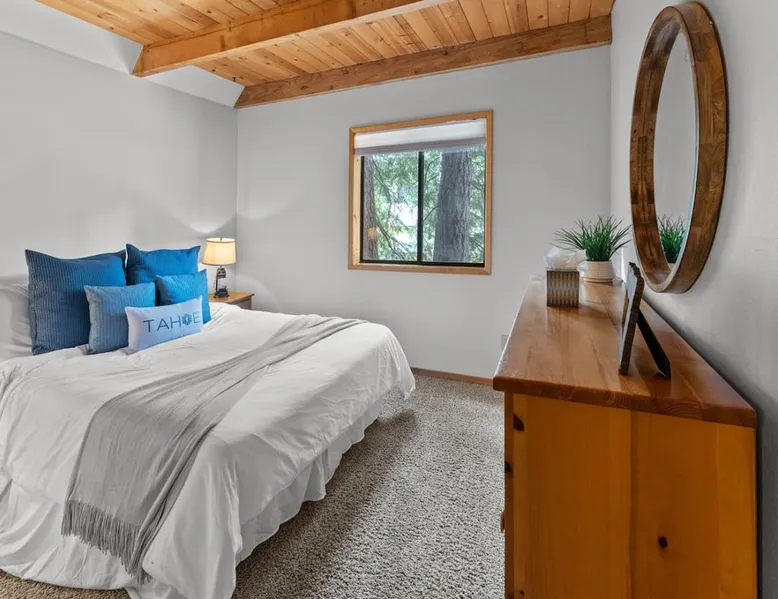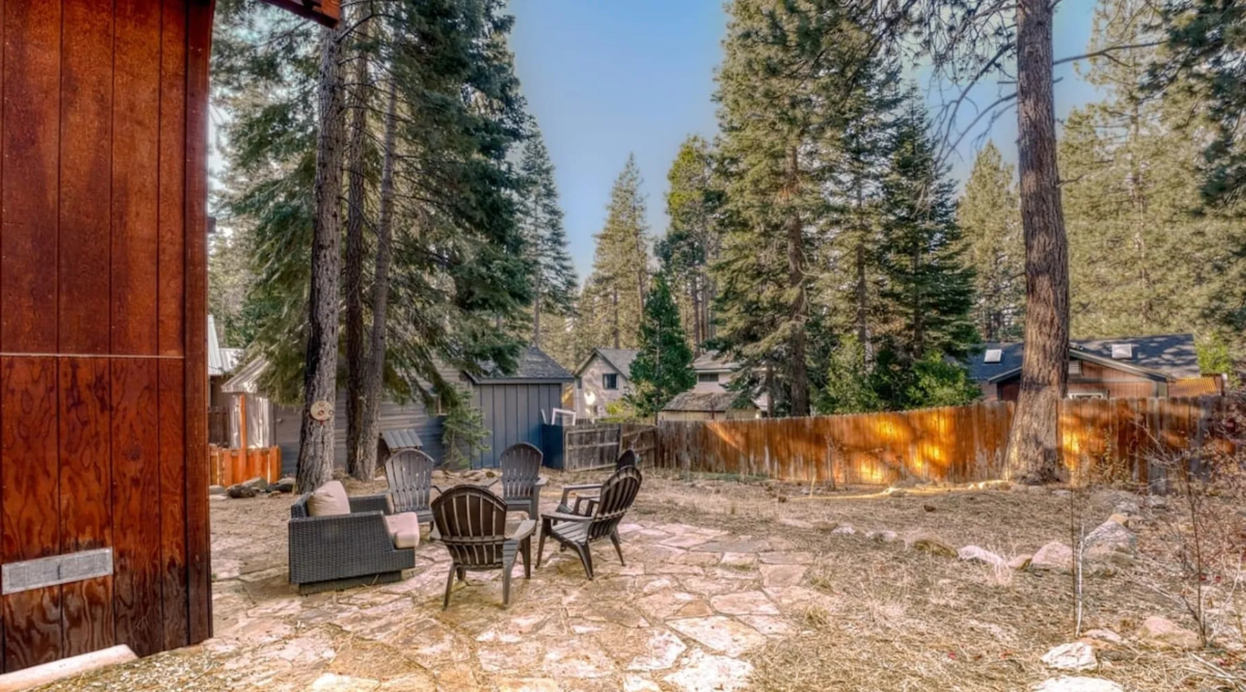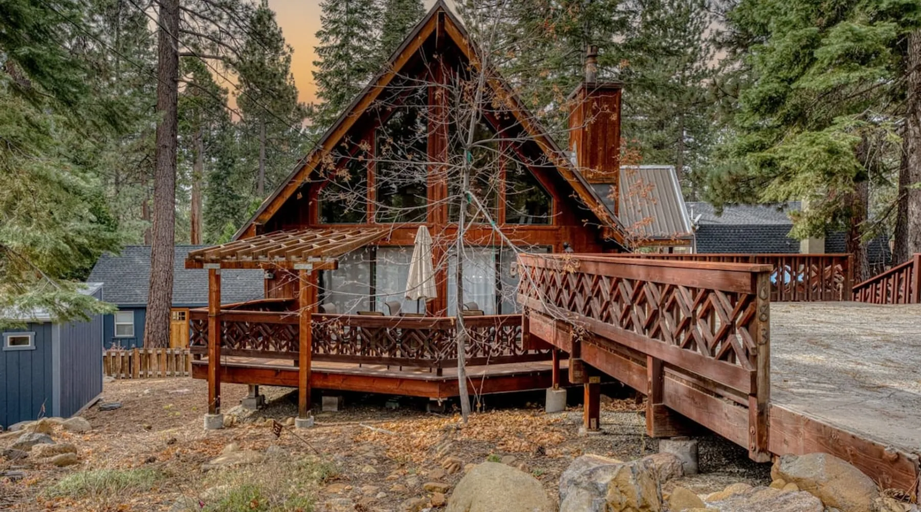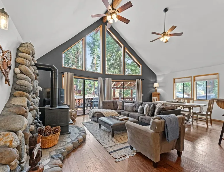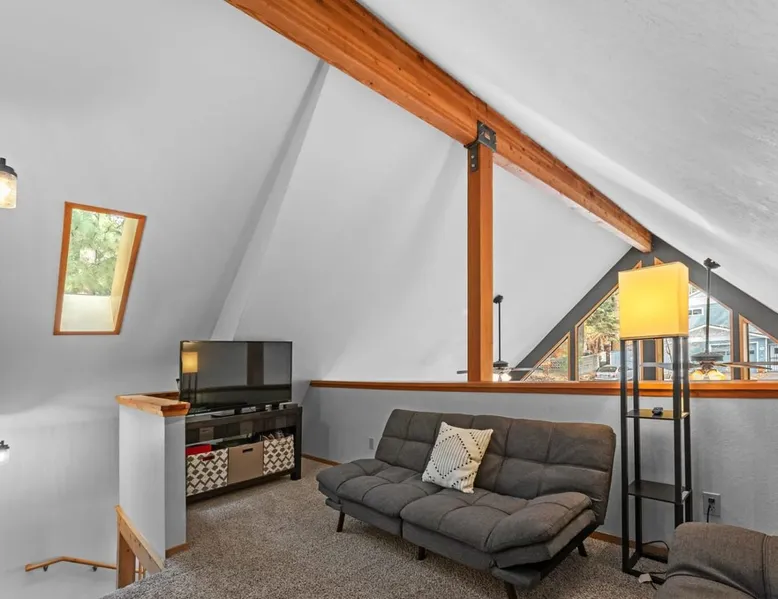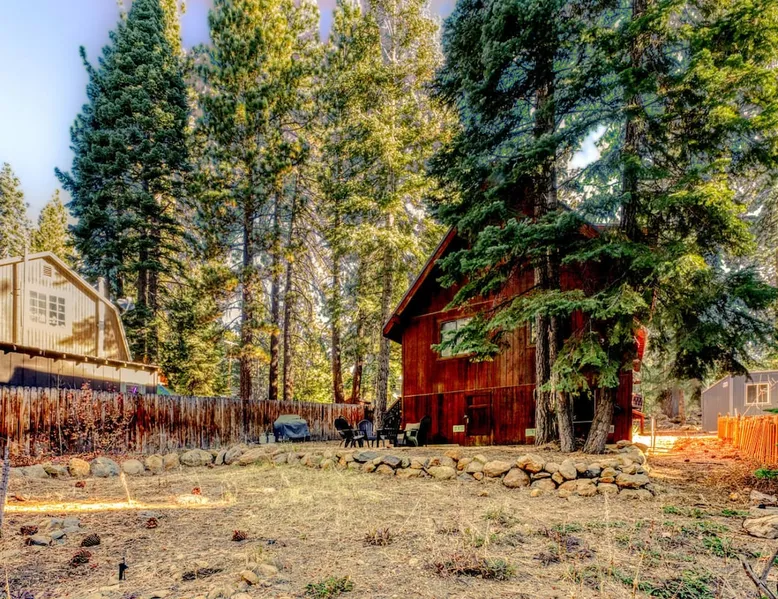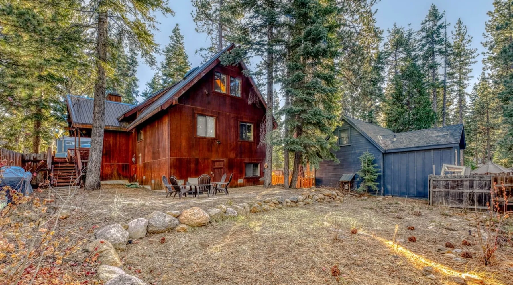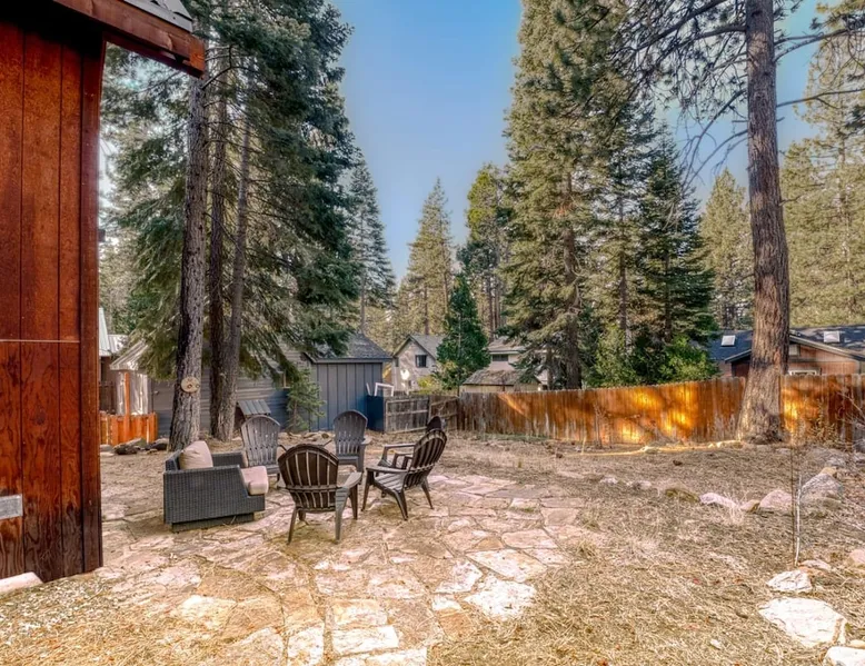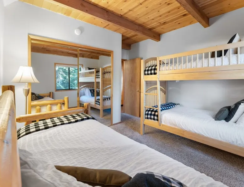 Escape to this inviting 3-bedroom A-frame cottage, where soaring windows flood the open layout with light, and a partially fenced backyard offers ample room for relaxation and entertainment. Nestled in a tranquil forest, this family-friendly haven is your gateway to all Lake Tahoe has to offer. In the summer enjoy a stroll to the beach, and in winter enjoy being within close proximity to top ski resorts. Discover the perfect blend of comfort and adventure in this charming retreat. The space Surrounded by trees in a tranquil setting, this charming three-bedroom, two-bathroom A-frame home offers a quintessential mountain retreat in Tahoe. The home boasts soaring windows, filling the rooms with natural light and views overlooking the surrounding trees. Your group will enjoy returning to the home after a busy day of adventures where you will find a spacious main living area for socializing, cozy bedrooms, and a private outdoor space. Enter the home off of the spacious front porch and arrive at a charming front hallway/mudroom. This space includes a bench, coat hooks, and a storage closet, providing a comfortable spot to unload your outdoor gear before settling into the home. Step into the bright and inviting home where the living room/dining/kitchen seamlessly blends in an open layout. This room is filled with natural light from the soaring windows and high ceilings, with 2 ceiling fans keeping it nice and cool in the warm summer months. The living room is set up for relaxing and socializing, with a plush L-shaped sectional and an oversized chair situated around an electric fireplace. The fireplace sits in a lovely cobblestone hearth, adding extra charm to the room! Relax in the living room while watching the falling snow out the large windows, or enjoy a movie night on the 55” TV that includes a sound bar and a Roku. Behind the living room sofa is the dining area, where you will find a large dining table with seating for 6. Adjacent to this space is the fully equipped kitchen, where you will have everything you need to cook a great meal with your friends and family. The kitchen features a full range of appliances, roomy countertops, and a kitchen bar with 4 bar stools providing additional seating space. When you are ready to settle in for the night, you will find three thoughtfully designed bedrooms offering a unique blend of functionality and style. The first two bedrooms are located downstairs in the hallway off of the kitchen. The first bedroom packs an efficient punch into the space with 4 twin beds that include a twin-over-twin bunk bed, and a twin bed with a trundle twin. The second bedroom is a well-decorated space with a queen-size bed, matching nightstands with lamps, a spacious closet, and a dresser. Near the two bedrooms, you will find the main level full bathroom, an updated space with a single-sink vanity and a spacious shower with a sliding glass door. Rounding out the main level is a laundry room with a full-size washer and dryer comfortably located near the bedrooms and bathroom. Head up the stairs where you will first come to a cozy loft area, a versatile space perfect for movie nights, game sessions, or additional sleeping arrangements. The loft features two futons that effortlessly transform into full-size beds, a TV, and an array of movies and games for your entertainment. From the loft, you are steps away from the master suite, a beautiful room with cathedral ceilings, exposed wood beams, skylights, and large windows with views over the surrounding trees. Equipped with a queen-size bed, a dedicated workspace featuring an L-shaped desk and monitor, ample storage including built-in drawers, and a closet, the master suite ensures a restful stay. The master bathroom is similar to the main level bathroom, with an updated single-sink vanity and a shower with a sliding glass door. In the summer months, you will love utilizing the front deck and the private backyard. Sit outside at the outdoor table and prepare a meal on the BBQ to dine al fresco. Or sit in the backyard under the starry night sky. The partially fenced backyard is perfect for those traveling with children, giving them an additional space to run and play while you relax under the trees. Experience a harmonious blend of comfort and nature in this delightful Tahoe getaway. STR Permit Number: STR22-7498 Max Occupancy: 8 Parking Info: There are 2 spaces available on the driveway. Guest access Guests will have access to the entire home, outdoor deck, and private partially fenced backyard. Guests will also have access to two parking places in the driveway in front of the home. Other things to note Please note that, like most homes in the area, this home does not have A/C. Charcoal grills are strictly forbidden in this county and will result in a $1,500 citation if used. 4-wheel drive or 2-wheel drive tires with snow chains may be necessary for safe travel to this property, even if it hasn’t snowed in a few days. If you are renting this home from November through March, please remember that there may be winter driving conditions, and a 4-wheel drive with all-terrain tires or snow chains for your 2-wheel drive tires might be necessary for safe travel. Even if it hasn’t snowed in a few days, side roads can still be icy and have snow on them. Please also be aware of long travel times and pass closures due to winter weather conditions. If you are renting this home from April until the first snowfall, there are NO fires allowed in Lake Tahoe. Please note that grills and outdoor furniture are not available during the months of November to April due to snow. Please keep in mind that if you plan to ski, you are responsible for verifying the ski resorts' opening and closing dates.