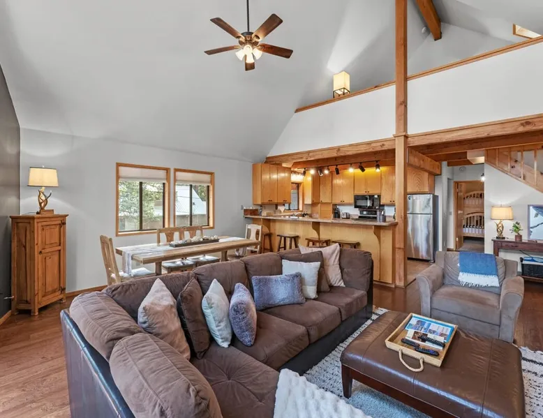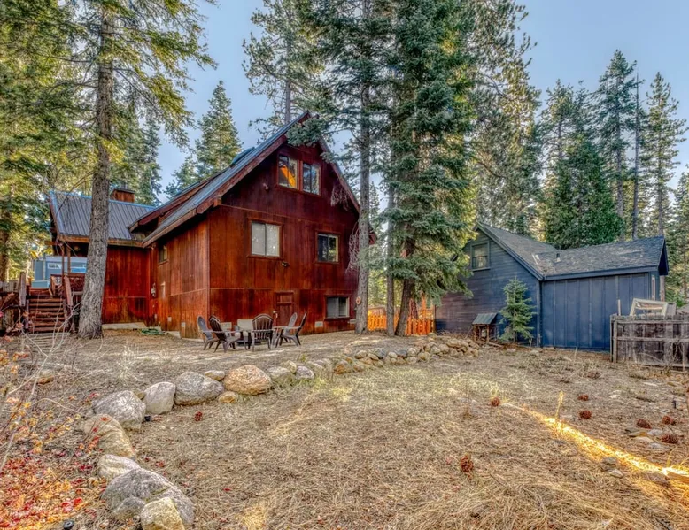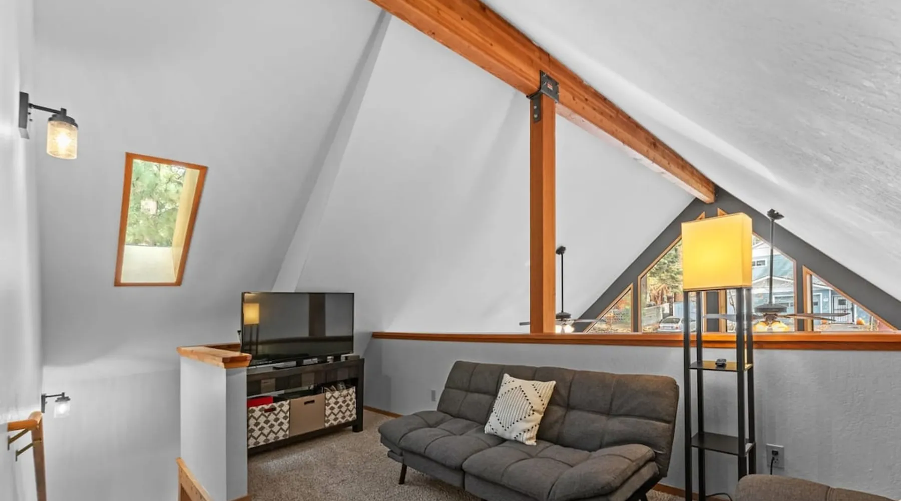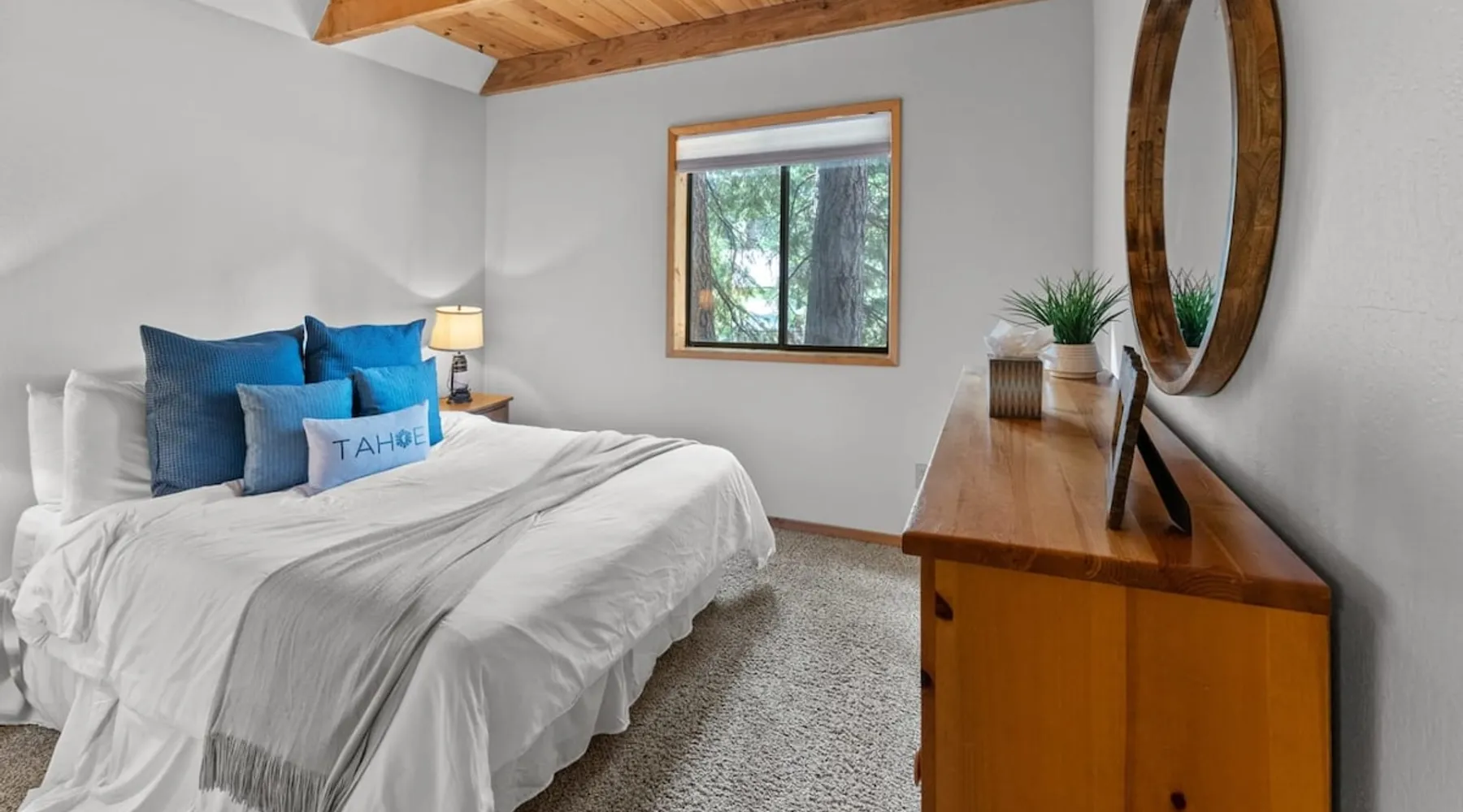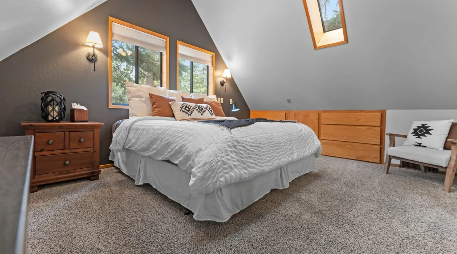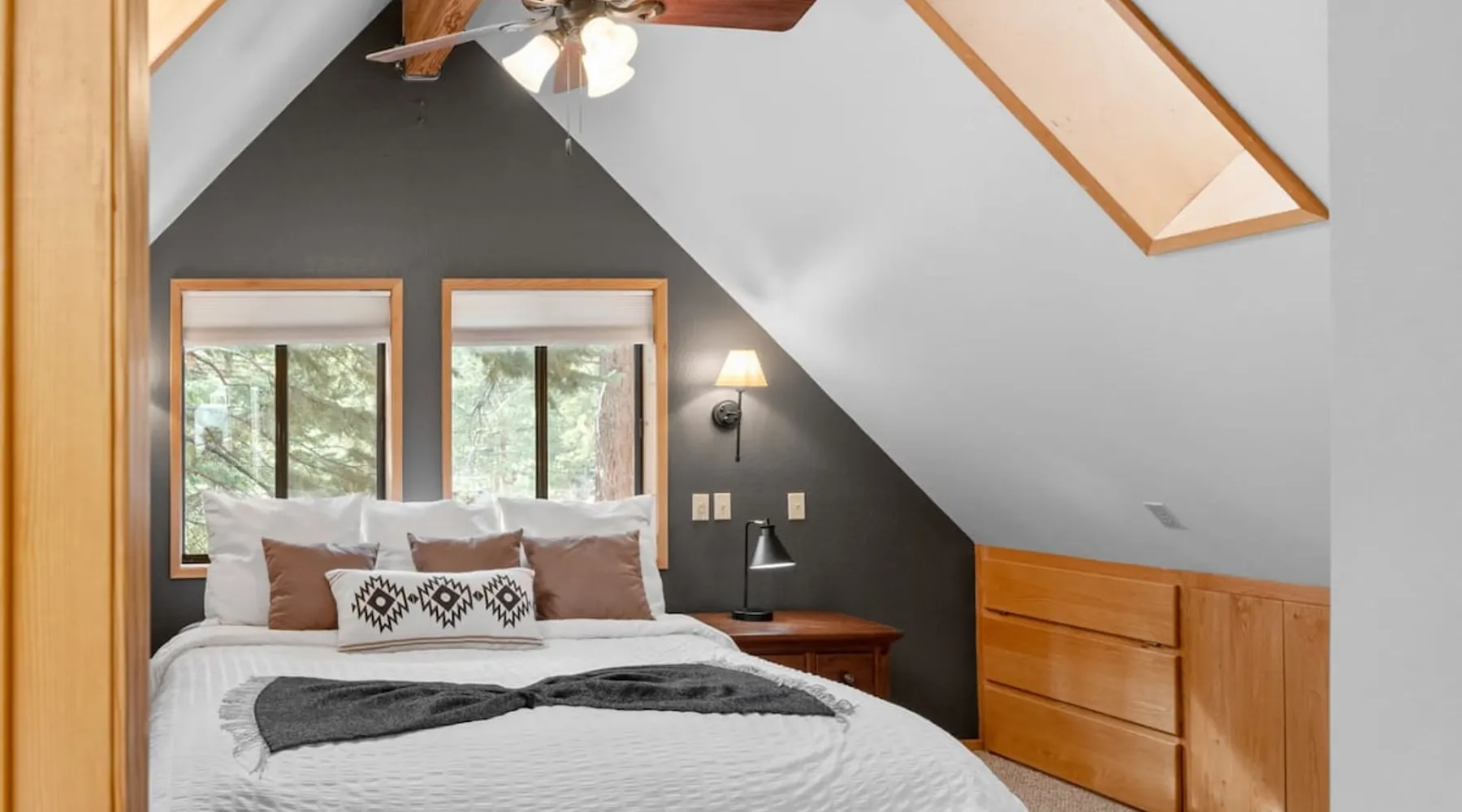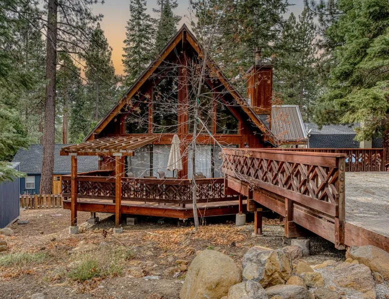 Escape to this inviting 3-bedroom A-frame cottage, where soaring windows flood the open layout with light, and a partially fenced backyard offers ample room for relaxation and entertainment. Nestled in a tranquil forest, this family-friendly haven is your gateway to all Lake Tahoe has to offer. In the summer enjoy a stroll to the beach, and in winter enjoy being within close proximity to top ski resorts. Discover the perfect blend of comfort and adventure in this charming retreat. The space Surrounded by trees in a tranquil setting, this charming three-bedroom, two-bathroom A-frame home offers a quintessential mountain retreat in Tahoe. The home boasts soaring windows, filling the rooms with natural light and views overlooking the surrounding trees. Your group will enjoy returning to the home after a busy day of adventures where you will find a spacious main living area for socializing, cozy bedrooms, and a private outdoor space. Enter the home off of the spacious front porch and arrive at a charming front hallway/mudroom. This space includes a bench, coat hooks, and a storage closet, providing a comfortable spot to unload your outdoor gear before settling into the home. Step into the bright and inviting home where the living room/dining/kitchen seamlessly blends in an open layout. This room is filled with natural light from the soaring windows and high ceilings, with 2 ceiling fans keeping it nice and cool in the warm summer months. The living room is set up for relaxing and socializing, with a plush L-shaped sectional and an oversized chair situated around an electric fireplace. The fireplace sits in a lovely cobblestone hearth, adding extra charm to the room! Relax in the living room while watching the falling snow out the large windows, or enjoy a movie night on the 55” TV that includes a sound bar and a Roku. Behind the living room sofa is the dining area, where you will find a large dining table with seating for 6. Adjacent to this space is the fully equipped kitchen, where you will have everything you need to cook a great meal with your friends and family. The kitchen features a full range of appliances, roomy countertops, and a kitchen bar with 4 bar stools providing additional seating space. When you are ready to settle in for the night, you will find three thoughtfully designed bedrooms offering a unique blend of functionality and style. The first two bedrooms are located downstairs in the hallway off of the kitchen. The first bedroom packs an efficient punch into the space with 4 twin beds that include a twin-over-twin bunk bed, and a twin bed with a trundle twin. The second bedroom is a well-decorated space with a queen-size bed, matching nightstands with lamps, a spacious closet, and a dresser. Near the two bedrooms, you will find the main level full bathroom, an updated space with a single-sink vanity and a spacious shower with a sliding glass door. Rounding out the main level is a laundry room with a full-size washer and dryer comfortably located near the bedrooms and bathroom. Head up the stairs where you will first come to a cozy loft area, a versatile space perfect for movie nights, game sessions, or additional sleeping arrangements. The loft features two futons that effortlessly transform into full-size beds, a TV, and an array of movies and games for your entertainment. From the loft, you are steps away from the master suite, a beautiful room with cathedral ceilings, exposed wood beams, skylights, and large windows with views over the surrounding trees. Equipped with a queen-size bed, a dedicated workspace featuring an L-shaped desk and monitor, ample storage including built-in drawers, and a closet, the master suite ensures a restful stay. The master bathroom is similar to the main level bathroom, with an updated single-sink vanity and a shower with a sliding glass door. In the summer months, you will love utilizing the front deck and the private backyard. Sit outside at the outdoor table and prepare a meal on the BBQ to dine al fresco. Or sit in the backyard under the starry night sky. The partially fenced backyard is perfect for those traveling with children, giving them an additional space to run and play while you relax under the trees. Experience a harmonious blend of comfort and nature in this delightful Tahoe getaway. STR Permit Number: STR22-7498 Max Occupancy: 8 Parking Info: There are 2 spaces available on the driveway. Guest access Guests will have access to the entire home, outdoor deck, and private partially fenced backyard. Guests will also have access to two parking places in the driveway in front of the home. Other things to note Please note that, like most homes in the area, this home does not have A/C. Charcoal grills are strictly forbidden in this county and will result in a $1,500 citation if used. 4-wheel drive or 2-wheel drive tires with snow chains may be necessary for safe travel to this property, even if it hasn’t snowed in a few days. If you are renting this home from November through March, please remember that there may be winter driving conditions, and a 4-wheel drive with all-terrain tires or snow chains for your 2-wheel drive tires might be necessary for safe travel. Even if it hasn’t snowed in a few days, side roads can still be icy and have snow on them. Please also be aware of long travel times and pass closures due to winter weather conditions. If you are renting this home from April until the first snowfall, there are NO fires allowed in Lake Tahoe. Please note that grills and outdoor furniture are not available during the months of November to April due to snow. Please keep in mind that if you plan to ski, you are responsible for verifying the ski resorts' opening and closing dates.
