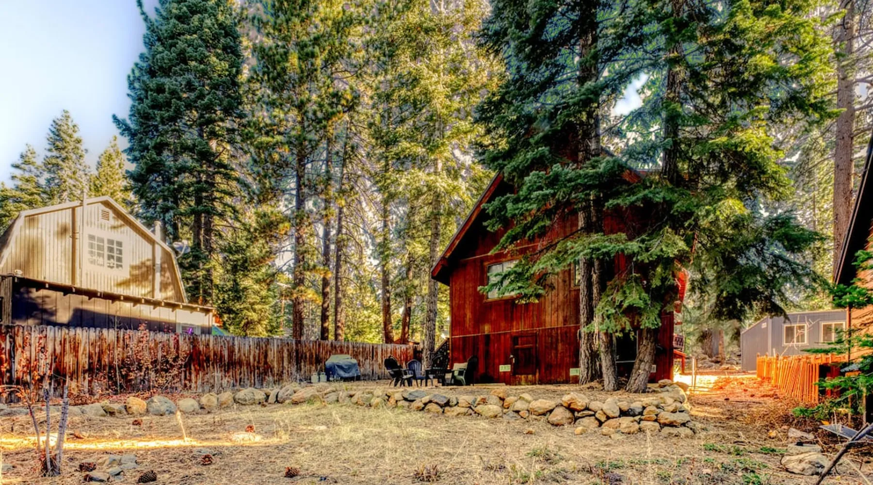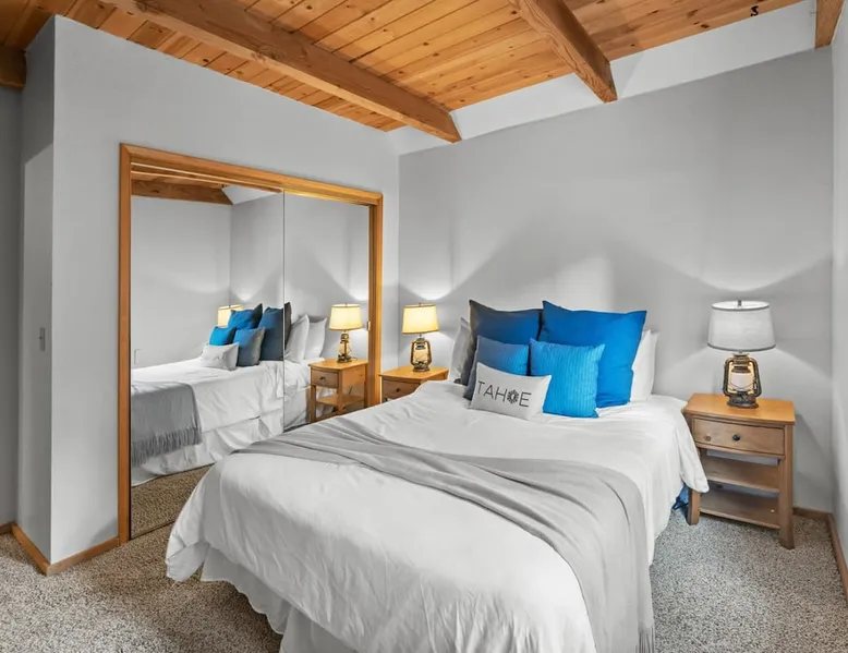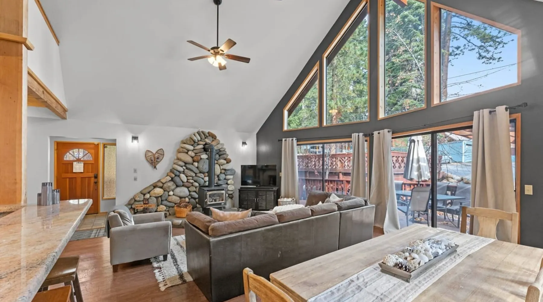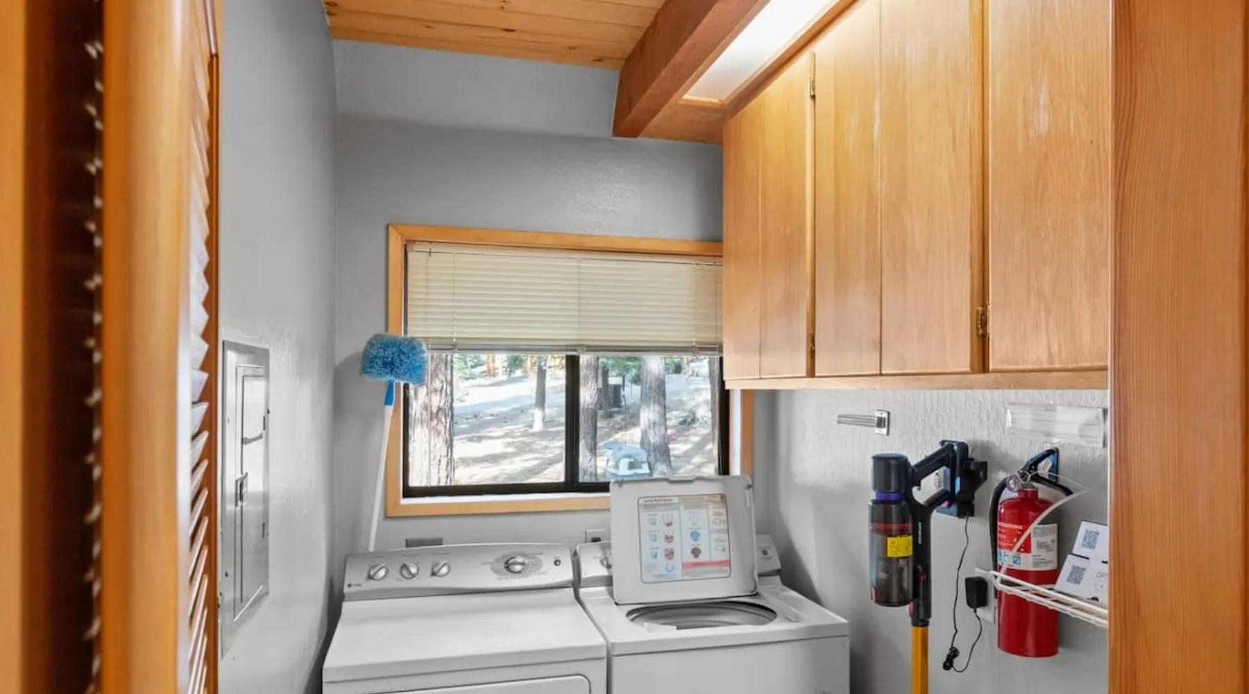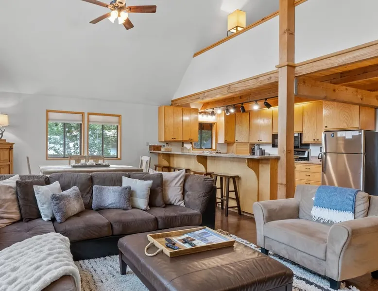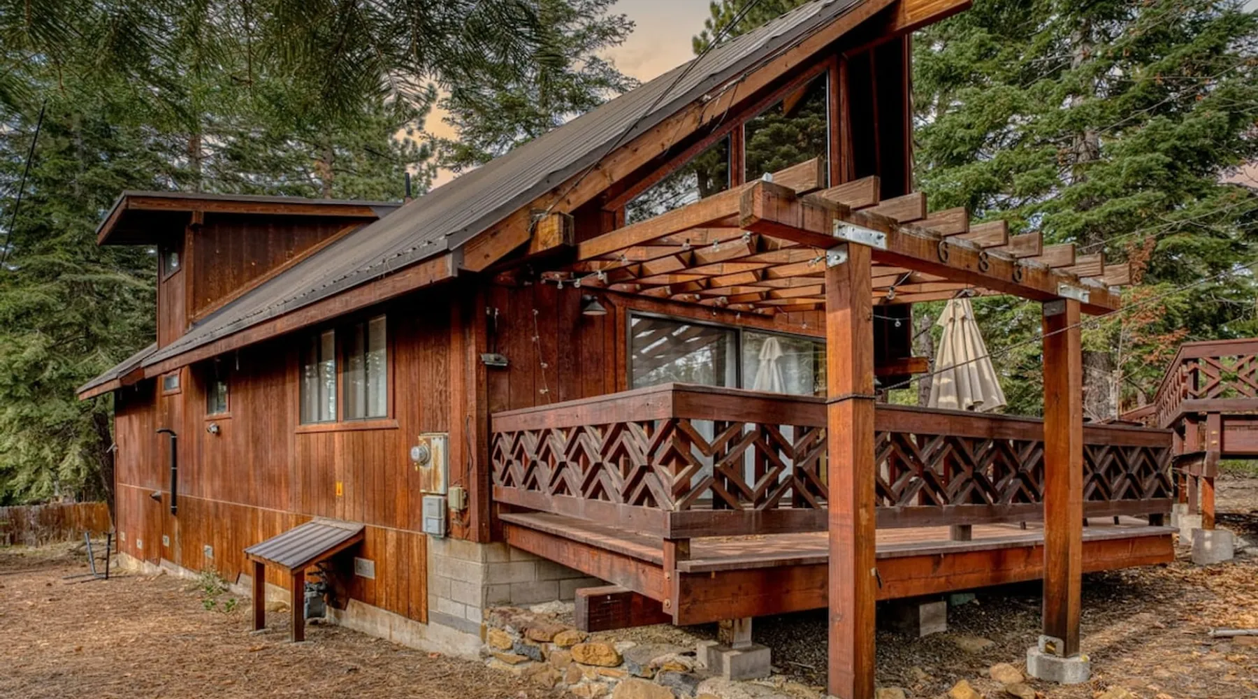 Escape to this inviting 3-bedroom A-frame cottage, where soaring windows flood the open layout with light, and a partially fenced backyard offers ample room for relaxation and entertainment. Nestled in a tranquil forest, this family-friendly haven is your gateway to all Lake Tahoe has to offer. In the summer enjoy a stroll to the beach, and in winter enjoy being within close proximity to top ski resorts. Discover the perfect blend of comfort and adventure in this charming retreat. The space Surrounded by trees in a tranquil setting, this charming three-bedroom, two-bathroom A-frame home offers a quintessential mountain retreat in Tahoe. The home boasts soaring windows, filling the rooms with natural light and views overlooking the surrounding trees. Your group will enjoy returning to the home after a busy day of adventures where you will find a spacious main living area for socializing, cozy bedrooms, and a private outdoor space. Enter the home off of the spacious front porch and arrive at a charming front hallway/mudroom. This space includes a bench, coat hooks, and a storage closet, providing a comfortable spot to unload your outdoor gear before settling into the home. Step into the bright and inviting home where the living room/dining/kitchen seamlessly blends in an open layout. This room is filled with natural light from the soaring windows and high ceilings, with 2 ceiling fans keeping it nice and cool in the warm summer months. The living room is set up for relaxing and socializing, with a plush L-shaped sectional and an oversized chair situated around an electric fireplace. The fireplace sits in a lovely cobblestone hearth, adding extra charm to the room! Relax in the living room while watching the falling snow out the large windows, or enjoy a movie night on the 55” TV that includes a sound bar and a Roku. Behind the living room sofa is the dining area, where you will find a large dining table with seating for 6. Adjacent to this space is the fully equipped kitchen, where you will have everything you need to cook a great meal with your friends and family. The kitchen features a full range of appliances, roomy countertops, and a kitchen bar with 4 bar stools providing additional seating space. When you are ready to settle in for the night, you will find three thoughtfully designed bedrooms offering a unique blend of functionality and style. The first two bedrooms are located downstairs in the hallway off of the kitchen. The first bedroom packs an efficient punch into the space with 4 twin beds that include a twin-over-twin bunk bed, and a twin bed with a trundle twin. The second bedroom is a well-decorated space with a queen-size bed, matching nightstands with lamps, a spacious closet, and a dresser. Near the two bedrooms, you will find the main level full bathroom, an updated space with a single-sink vanity and a spacious shower with a sliding glass door. Rounding out the main level is a laundry room with a full-size washer and dryer comfortably located near the bedrooms and bathroom. Head up the stairs where you will first come to a cozy loft area, a versatile space perfect for movie nights, game sessions, or additional sleeping arrangements. The loft features two futons that effortlessly transform into full-size beds, a TV, and an array of movies and games for your entertainment. From the loft, you are steps away from the master suite, a beautiful room with cathedral ceilings, exposed wood beams, skylights, and large windows with views over the surrounding trees. Equipped with a queen-size bed, a dedicated workspace featuring an L-shaped desk and monitor, ample storage including built-in drawers, and a closet, the master suite ensures a restful stay. The master bathroom is similar to the main level bathroom, with an updated single-sink vanity and a shower with a sliding glass door. In the summer months, you will love utilizing the front deck and the private backyard. Sit outside at the outdoor table and prepare a meal on the BBQ to dine al fresco. Or sit in the backyard under the starry night sky. The partially fenced backyard is perfect for those traveling with children, giving them an additional space to run and play while you relax under the trees. Experience a harmonious blend of comfort and nature in this delightful Tahoe getaway. STR Permit Number: STR22-7498 Max Occupancy: 8 Parking Info: There are 2 spaces available on the driveway. Guest access Guests will have access to the entire home, outdoor deck, and private partially fenced backyard. Guests will also have access to two parking places in the driveway in front of the home. Other things to note Please note that, like most homes in the area, this home does not have A/C. Charcoal grills are strictly forbidden in this county and will result in a $1,500 citation if used. 4-wheel drive or 2-wheel drive tires with snow chains may be necessary for safe travel to this property, even if it hasn’t snowed in a few days. If you are renting this home from November through March, please remember that there may be winter driving conditions, and a 4-wheel drive with all-terrain tires or snow chains for your 2-wheel drive tires might be necessary for safe travel. Even if it hasn’t snowed in a few days, side roads can still be icy and have snow on them. Please also be aware of long travel times and pass closures due to winter weather conditions. If you are renting this home from April until the first snowfall, there are NO fires allowed in Lake Tahoe. Please note that grills and outdoor furniture are not available during the months of November to April due to snow. Please keep in mind that if you plan to ski, you are responsible for verifying the ski resorts' opening and closing dates.