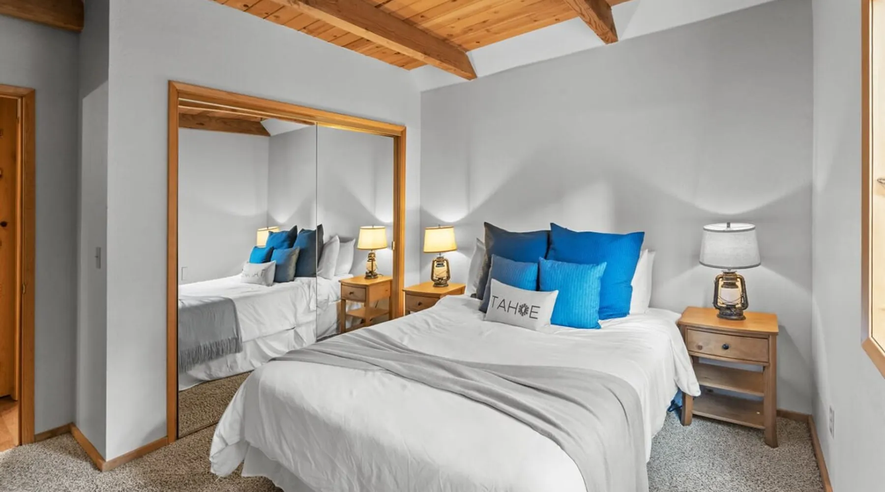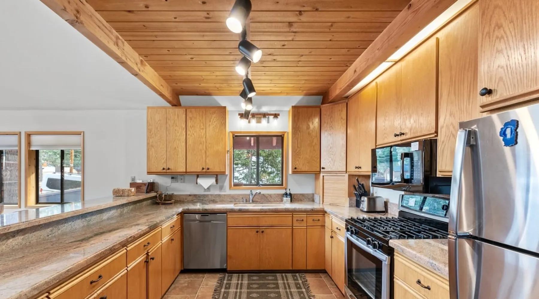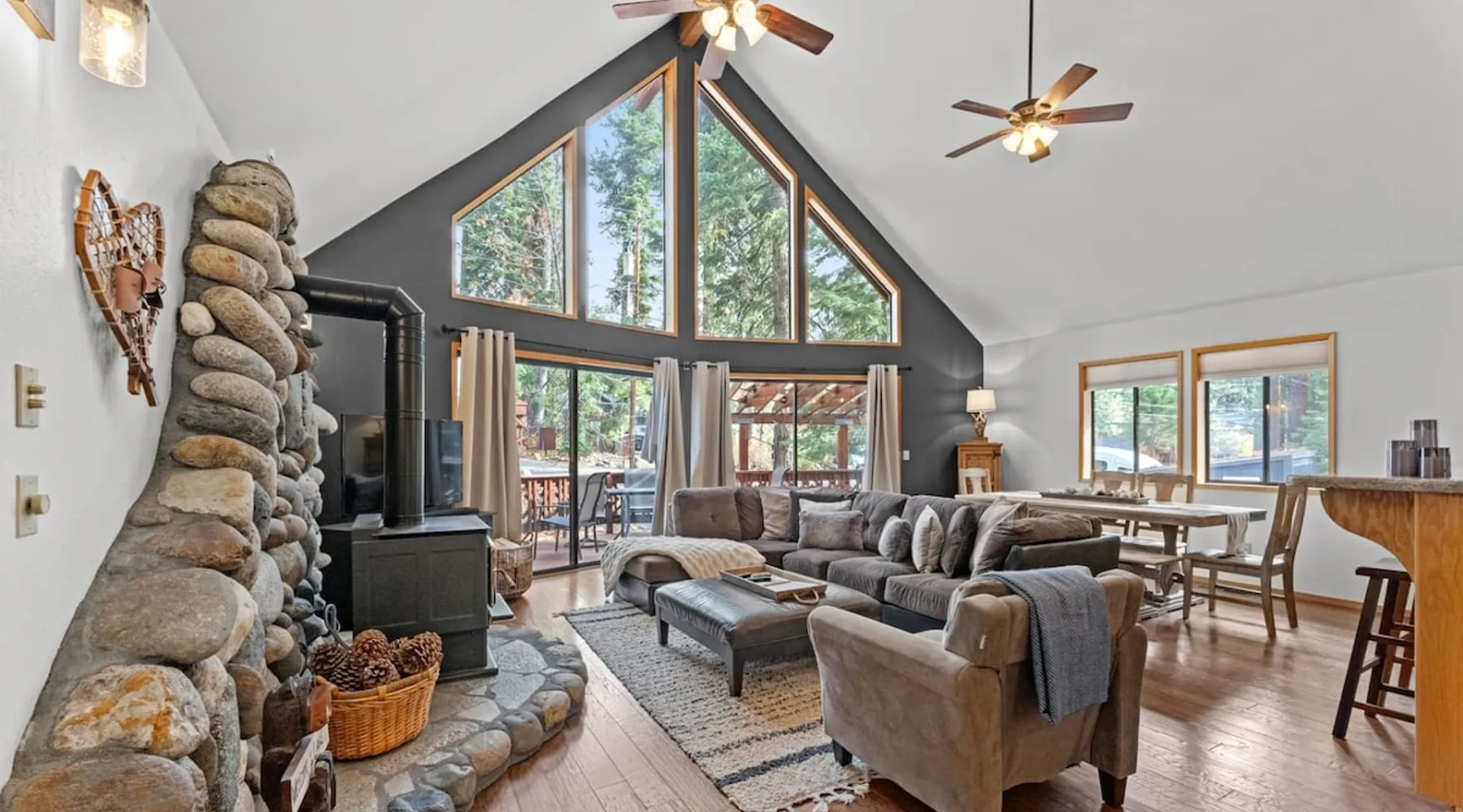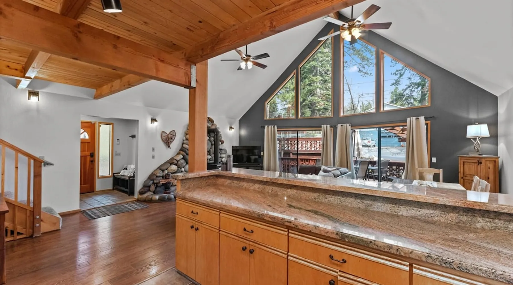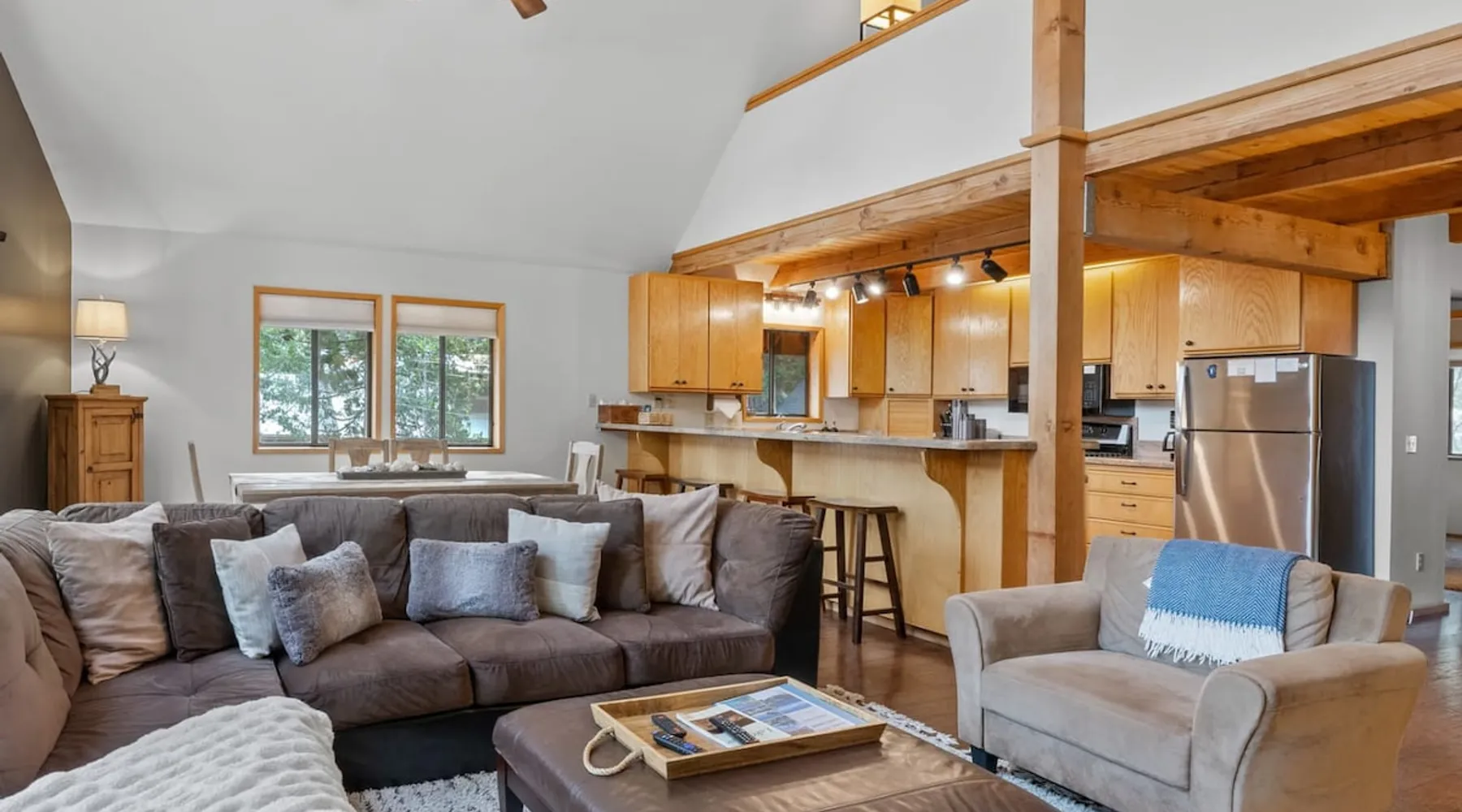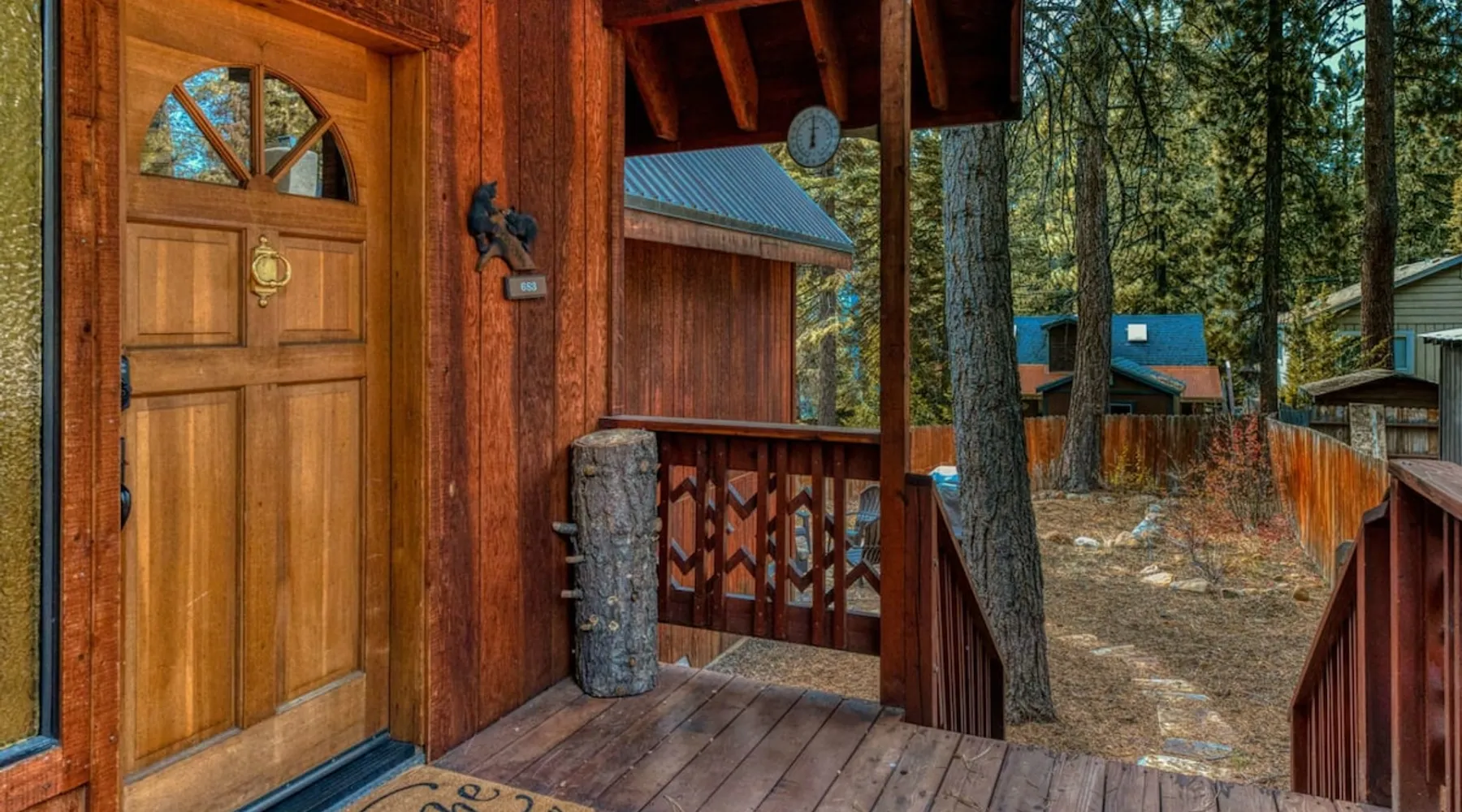 Escape to this inviting 3-bedroom A-frame cottage, where soaring windows flood the open layout with light, and a partially fenced backyard offers ample room for relaxation and entertainment. Nestled in a tranquil forest, this family-friendly haven is your gateway to all Lake Tahoe has to offer. In the summer enjoy a stroll to the beach, and in winter enjoy being within close proximity to top ski resorts. Discover the perfect blend of comfort and adventure in this charming retreat. The space Surrounded by trees in a tranquil setting, this charming three-bedroom, two-bathroom A-frame home offers a quintessential mountain retreat in Tahoe. The home boasts soaring windows, filling the rooms with natural light and views overlooking the surrounding trees. Your group will enjoy returning to the home after a busy day of adventures where you will find a spacious main living area for socializing, cozy bedrooms, and a private outdoor space. Enter the home off of the spacious front porch and arrive at a charming front hallway/mudroom. This space includes a bench, coat hooks, and a storage closet, providing a comfortable spot to unload your outdoor gear before settling into the home. Step into the bright and inviting home where the living room/dining/kitchen seamlessly blends in an open layout. This room is filled with natural light from the soaring windows and high ceilings, with 2 ceiling fans keeping it nice and cool in the warm summer months. The living room is set up for relaxing and socializing, with a plush L-shaped sectional and an oversized chair situated around an electric fireplace. The fireplace sits in a lovely cobblestone hearth, adding extra charm to the room! Relax in the living room while watching the falling snow out the large windows, or enjoy a movie night on the 55” TV that includes a sound bar and a Roku. Behind the living room sofa is the dining area, where you will find a large dining table with seating for 6. Adjacent to this space is the fully equipped kitchen, where you will have everything you need to cook a great meal with your friends and family. The kitchen features a full range of appliances, roomy countertops, and a kitchen bar with 4 bar stools providing additional seating space. When you are ready to settle in for the night, you will find three thoughtfully designed bedrooms offering a unique blend of functionality and style. The first two bedrooms are located downstairs in the hallway off of the kitchen. The first bedroom packs an efficient punch into the space with 4 twin beds that include a twin-over-twin bunk bed, and a twin bed with a trundle twin. The second bedroom is a well-decorated space with a queen-size bed, matching nightstands with lamps, a spacious closet, and a dresser. Near the two bedrooms, you will find the main level full bathroom, an updated space with a single-sink vanity and a spacious shower with a sliding glass door. Rounding out the main level is a laundry room with a full-size washer and dryer comfortably located near the bedrooms and bathroom. Head up the stairs where you will first come to a cozy loft area, a versatile space perfect for movie nights, game sessions, or additional sleeping arrangements. The loft features two futons that effortlessly transform into full-size beds, a TV, and an array of movies and games for your entertainment. From the loft, you are steps away from the master suite, a beautiful room with cathedral ceilings, exposed wood beams, skylights, and large windows with views over the surrounding trees. Equipped with a queen-size bed, a dedicated workspace featuring an L-shaped desk and monitor, ample storage including built-in drawers, and a closet, the master suite ensures a restful stay. The master bathroom is similar to the main level bathroom, with an updated single-sink vanity and a shower with a sliding glass door. In the summer months, you will love utilizing the front deck and the private backyard. Sit outside at the outdoor table and prepare a meal on the BBQ to dine al fresco. Or sit in the backyard under the starry night sky. The partially fenced backyard is perfect for those traveling with children, giving them an additional space to run and play while you relax under the trees. Experience a harmonious blend of comfort and nature in this delightful Tahoe getaway. STR Permit Number: STR22-7498 Max Occupancy: 8 Parking Info: There are 2 spaces available on the driveway. Guest access Guests will have access to the entire home, outdoor deck, and private partially fenced backyard. Guests will also have access to two parking places in the driveway in front of the home. Other things to note Please note that, like most homes in the area, this home does not have A/C. Charcoal grills are strictly forbidden in this county and will result in a $1,500 citation if used. 4-wheel drive or 2-wheel drive tires with snow chains may be necessary for safe travel to this property, even if it hasn’t snowed in a few days. If you are renting this home from November through March, please remember that there may be winter driving conditions, and a 4-wheel drive with all-terrain tires or snow chains for your 2-wheel drive tires might be necessary for safe travel. Even if it hasn’t snowed in a few days, side roads can still be icy and have snow on them. Please also be aware of long travel times and pass closures due to winter weather conditions. If you are renting this home from April until the first snowfall, there are NO fires allowed in Lake Tahoe. Please note that grills and outdoor furniture are not available during the months of November to April due to snow. Please keep in mind that if you plan to ski, you are responsible for verifying the ski resorts' opening and closing dates.