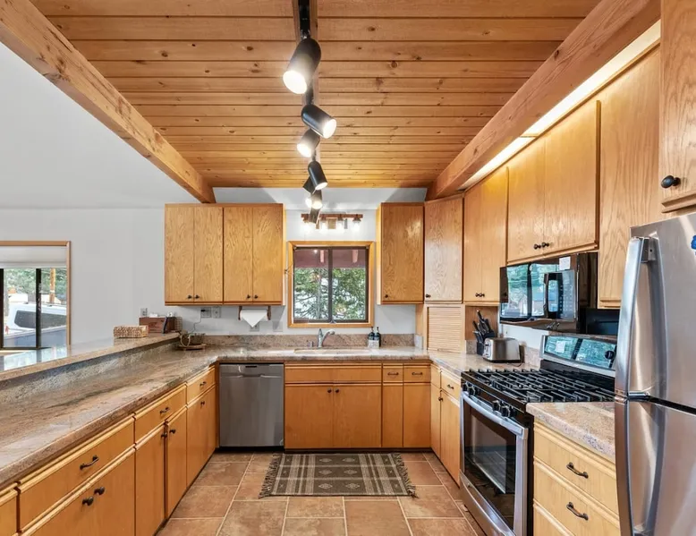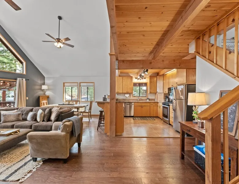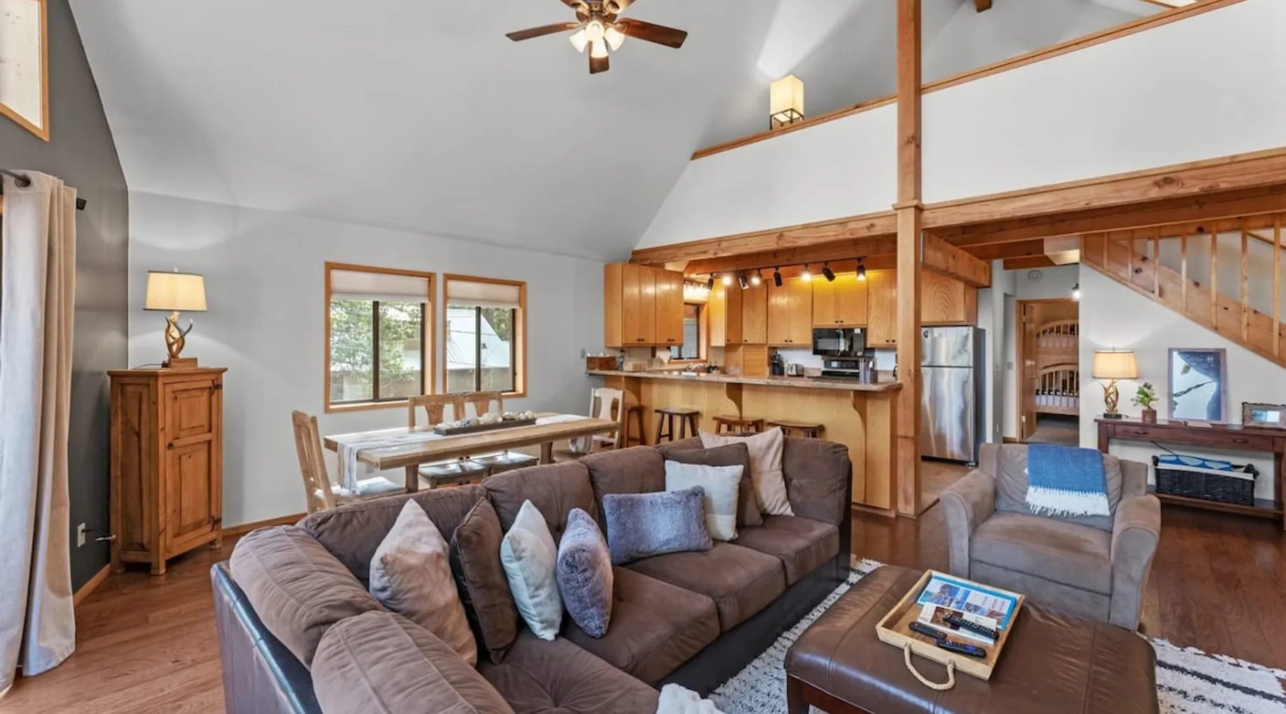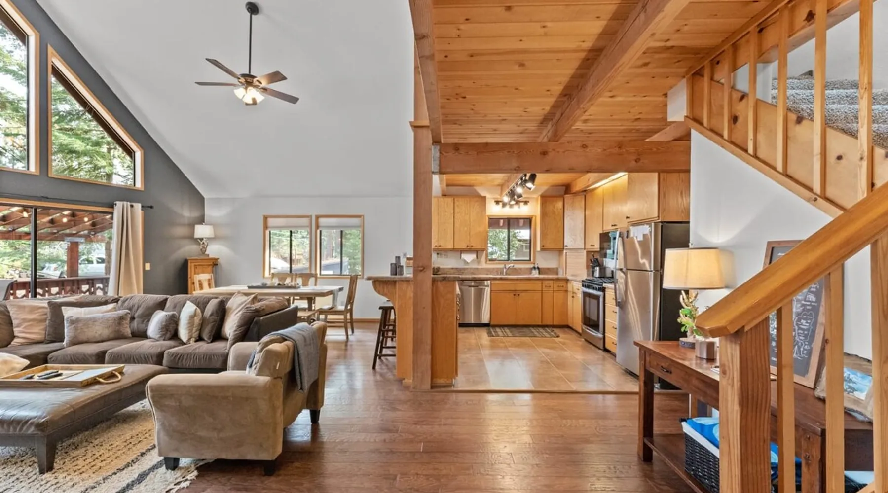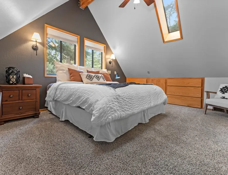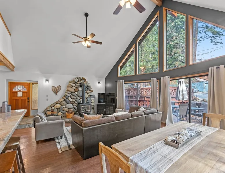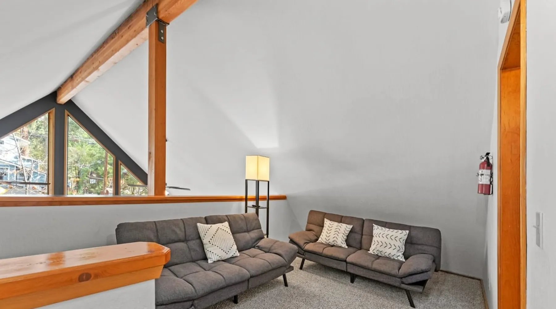 Escape to this inviting 3-bedroom A-frame cottage, where soaring windows flood the open layout with light, and a partially fenced backyard offers ample room for relaxation and entertainment. Nestled in a tranquil forest, this family-friendly haven is your gateway to all Lake Tahoe has to offer. In the summer enjoy a stroll to the beach, and in winter enjoy being within close proximity to top ski resorts. Discover the perfect blend of comfort and adventure in this charming retreat. The space Surrounded by trees in a tranquil setting, this charming three-bedroom, two-bathroom A-frame home offers a quintessential mountain retreat in Tahoe. The home boasts soaring windows, filling the rooms with natural light and views overlooking the surrounding trees. Your group will enjoy returning to the home after a busy day of adventures where you will find a spacious main living area for socializing, cozy bedrooms, and a private outdoor space. Enter the home off of the spacious front porch and arrive at a charming front hallway/mudroom. This space includes a bench, coat hooks, and a storage closet, providing a comfortable spot to unload your outdoor gear before settling into the home. Step into the bright and inviting home where the living room/dining/kitchen seamlessly blends in an open layout. This room is filled with natural light from the soaring windows and high ceilings, with 2 ceiling fans keeping it nice and cool in the warm summer months. The living room is set up for relaxing and socializing, with a plush L-shaped sectional and an oversized chair situated around an electric fireplace. The fireplace sits in a lovely cobblestone hearth, adding extra charm to the room! Relax in the living room while watching the falling snow out the large windows, or enjoy a movie night on the 55” TV that includes a sound bar and a Roku. Behind the living room sofa is the dining area, where you will find a large dining table with seating for 6. Adjacent to this space is the fully equipped kitchen, where you will have everything you need to cook a great meal with your friends and family. The kitchen features a full range of appliances, roomy countertops, and a kitchen bar with 4 bar stools providing additional seating space. When you are ready to settle in for the night, you will find three thoughtfully designed bedrooms offering a unique blend of functionality and style. The first two bedrooms are located downstairs in the hallway off of the kitchen. The first bedroom packs an efficient punch into the space with 4 twin beds that include a twin-over-twin bunk bed, and a twin bed with a trundle twin. The second bedroom is a well-decorated space with a queen-size bed, matching nightstands with lamps, a spacious closet, and a dresser. Near the two bedrooms, you will find the main level full bathroom, an updated space with a single-sink vanity and a spacious shower with a sliding glass door. Rounding out the main level is a laundry room with a full-size washer and dryer comfortably located near the bedrooms and bathroom. Head up the stairs where you will first come to a cozy loft area, a versatile space perfect for movie nights, game sessions, or additional sleeping arrangements. The loft features two futons that effortlessly transform into full-size beds, a TV, and an array of movies and games for your entertainment. From the loft, you are steps away from the master suite, a beautiful room with cathedral ceilings, exposed wood beams, skylights, and large windows with views over the surrounding trees. Equipped with a queen-size bed, a dedicated workspace featuring an L-shaped desk and monitor, ample storage including built-in drawers, and a closet, the master suite ensures a restful stay. The master bathroom is similar to the main level bathroom, with an updated single-sink vanity and a shower with a sliding glass door. In the summer months, you will love utilizing the front deck and the private backyard. Sit outside at the outdoor table and prepare a meal on the BBQ to dine al fresco. Or sit in the backyard under the starry night sky. The partially fenced backyard is perfect for those traveling with children, giving them an additional space to run and play while you relax under the trees. Experience a harmonious blend of comfort and nature in this delightful Tahoe getaway. STR Permit Number: STR22-7498 Max Occupancy: 8 Parking Info: There are 2 spaces available on the driveway. Guest access Guests will have access to the entire home, outdoor deck, and private partially fenced backyard. Guests will also have access to two parking places in the driveway in front of the home. Other things to note Please note that, like most homes in the area, this home does not have A/C. Charcoal grills are strictly forbidden in this county and will result in a $1,500 citation if used. 4-wheel drive or 2-wheel drive tires with snow chains may be necessary for safe travel to this property, even if it hasn’t snowed in a few days. If you are renting this home from November through March, please remember that there may be winter driving conditions, and a 4-wheel drive with all-terrain tires or snow chains for your 2-wheel drive tires might be necessary for safe travel. Even if it hasn’t snowed in a few days, side roads can still be icy and have snow on them. Please also be aware of long travel times and pass closures due to winter weather conditions. If you are renting this home from April until the first snowfall, there are NO fires allowed in Lake Tahoe. Please note that grills and outdoor furniture are not available during the months of November to April due to snow. Please keep in mind that if you plan to ski, you are responsible for verifying the ski resorts' opening and closing dates.