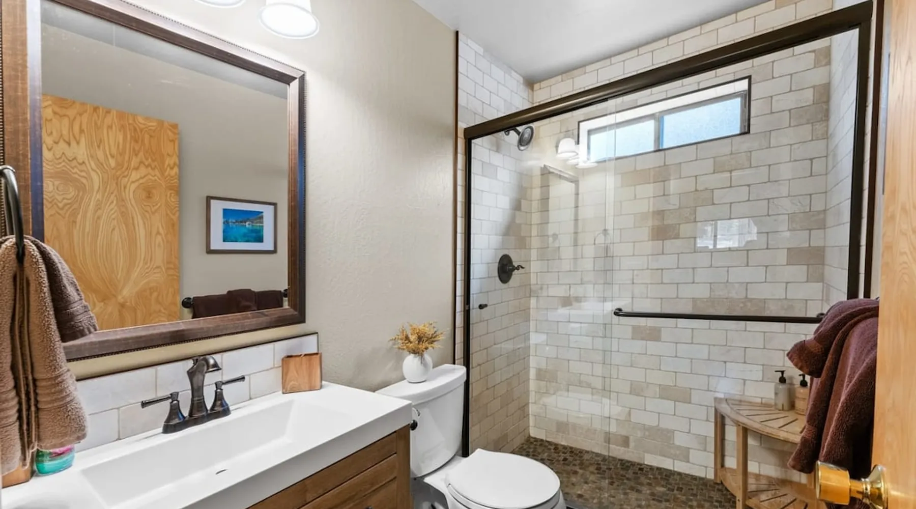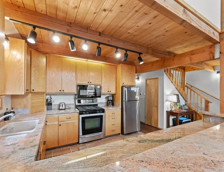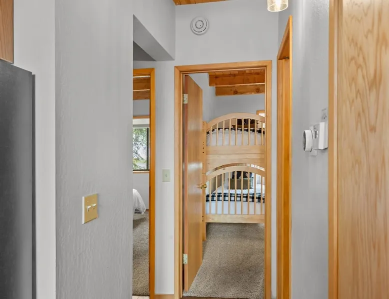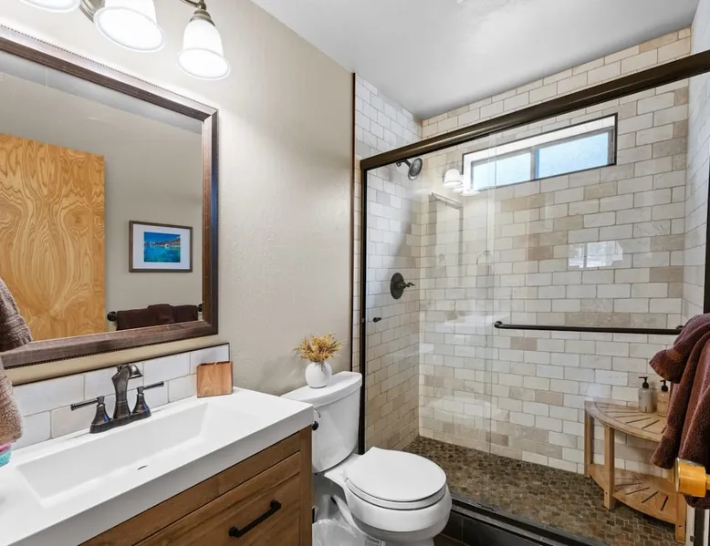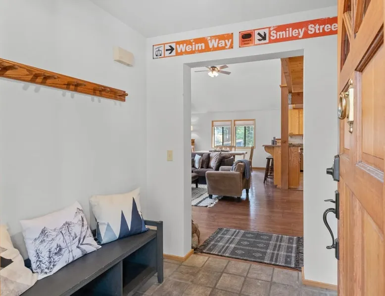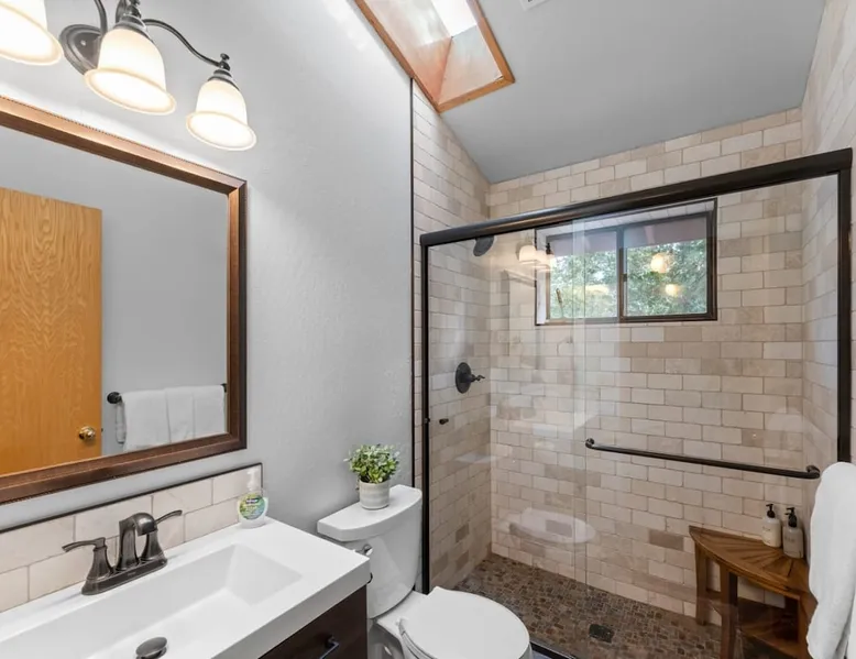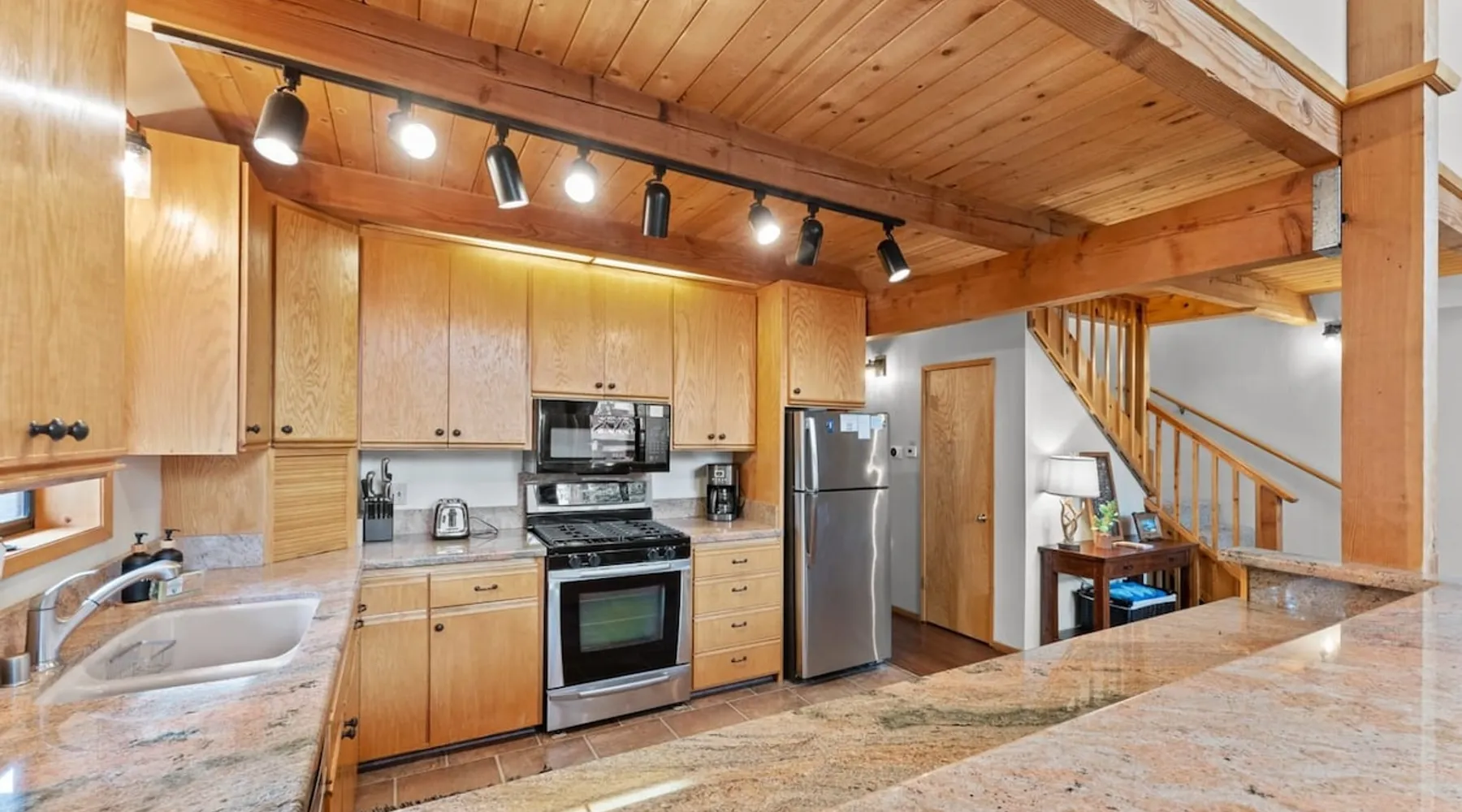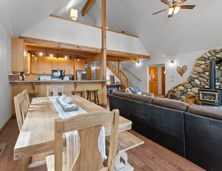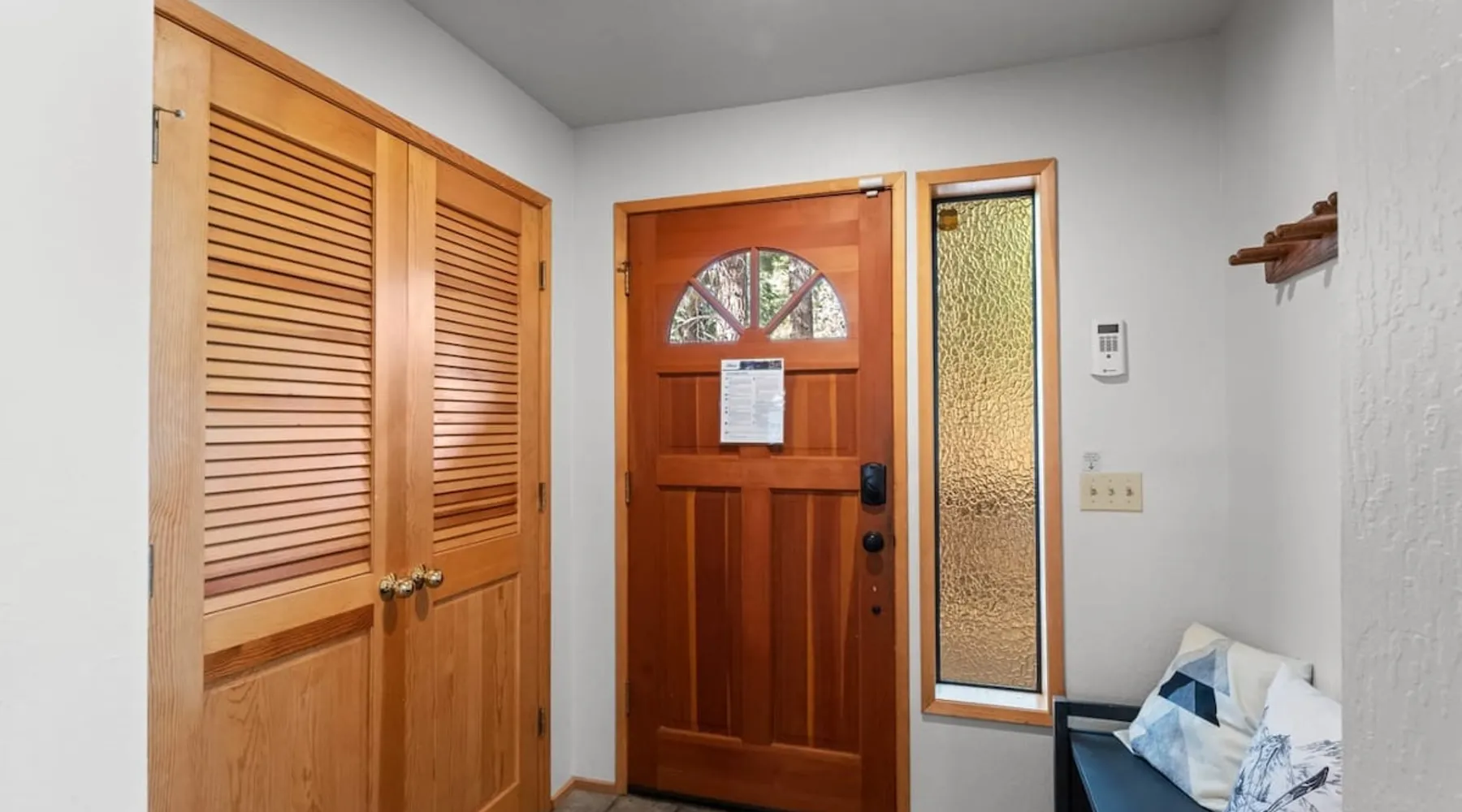 Escape to this inviting 3-bedroom A-frame cottage, where soaring windows flood the open layout with light, and a partially fenced backyard offers ample room for relaxation and entertainment. Nestled in a tranquil forest, this family-friendly haven is your gateway to all Lake Tahoe has to offer. In the summer enjoy a stroll to the beach, and in winter enjoy being within close proximity to top ski resorts. Discover the perfect blend of comfort and adventure in this charming retreat. The space Surrounded by trees in a tranquil setting, this charming three-bedroom, two-bathroom A-frame home offers a quintessential mountain retreat in Tahoe. The home boasts soaring windows, filling the rooms with natural light and views overlooking the surrounding trees. Your group will enjoy returning to the home after a busy day of adventures where you will find a spacious main living area for socializing, cozy bedrooms, and a private outdoor space. Enter the home off of the spacious front porch and arrive at a charming front hallway/mudroom. This space includes a bench, coat hooks, and a storage closet, providing a comfortable spot to unload your outdoor gear before settling into the home. Step into the bright and inviting home where the living room/dining/kitchen seamlessly blends in an open layout. This room is filled with natural light from the soaring windows and high ceilings, with 2 ceiling fans keeping it nice and cool in the warm summer months. The living room is set up for relaxing and socializing, with a plush L-shaped sectional and an oversized chair situated around an electric fireplace. The fireplace sits in a lovely cobblestone hearth, adding extra charm to the room! Relax in the living room while watching the falling snow out the large windows, or enjoy a movie night on the 55” TV that includes a sound bar and a Roku. Behind the living room sofa is the dining area, where you will find a large dining table with seating for 6. Adjacent to this space is the fully equipped kitchen, where you will have everything you need to cook a great meal with your friends and family. The kitchen features a full range of appliances, roomy countertops, and a kitchen bar with 4 bar stools providing additional seating space. When you are ready to settle in for the night, you will find three thoughtfully designed bedrooms offering a unique blend of functionality and style. The first two bedrooms are located downstairs in the hallway off of the kitchen. The first bedroom packs an efficient punch into the space with 4 twin beds that include a twin-over-twin bunk bed, and a twin bed with a trundle twin. The second bedroom is a well-decorated space with a queen-size bed, matching nightstands with lamps, a spacious closet, and a dresser. Near the two bedrooms, you will find the main level full bathroom, an updated space with a single-sink vanity and a spacious shower with a sliding glass door. Rounding out the main level is a laundry room with a full-size washer and dryer comfortably located near the bedrooms and bathroom. Head up the stairs where you will first come to a cozy loft area, a versatile space perfect for movie nights, game sessions, or additional sleeping arrangements. The loft features two futons that effortlessly transform into full-size beds, a TV, and an array of movies and games for your entertainment. From the loft, you are steps away from the master suite, a beautiful room with cathedral ceilings, exposed wood beams, skylights, and large windows with views over the surrounding trees. Equipped with a queen-size bed, a dedicated workspace featuring an L-shaped desk and monitor, ample storage including built-in drawers, and a closet, the master suite ensures a restful stay. The master bathroom is similar to the main level bathroom, with an updated single-sink vanity and a shower with a sliding glass door. In the summer months, you will love utilizing the front deck and the private backyard. Sit outside at the outdoor table and prepare a meal on the BBQ to dine al fresco. Or sit in the backyard under the starry night sky. The partially fenced backyard is perfect for those traveling with children, giving them an additional space to run and play while you relax under the trees. Experience a harmonious blend of comfort and nature in this delightful Tahoe getaway. STR Permit Number: STR22-7498 Max Occupancy: 8 Parking Info: There are 2 spaces available on the driveway. Guest access Guests will have access to the entire home, outdoor deck, and private partially fenced backyard. Guests will also have access to two parking places in the driveway in front of the home. Other things to note Please note that, like most homes in the area, this home does not have A/C. Charcoal grills are strictly forbidden in this county and will result in a $1,500 citation if used. 4-wheel drive or 2-wheel drive tires with snow chains may be necessary for safe travel to this property, even if it hasn’t snowed in a few days. If you are renting this home from November through March, please remember that there may be winter driving conditions, and a 4-wheel drive with all-terrain tires or snow chains for your 2-wheel drive tires might be necessary for safe travel. Even if it hasn’t snowed in a few days, side roads can still be icy and have snow on them. Please also be aware of long travel times and pass closures due to winter weather conditions. If you are renting this home from April until the first snowfall, there are NO fires allowed in Lake Tahoe. Please note that grills and outdoor furniture are not available during the months of November to April due to snow. Please keep in mind that if you plan to ski, you are responsible for verifying the ski resorts' opening and closing dates.
