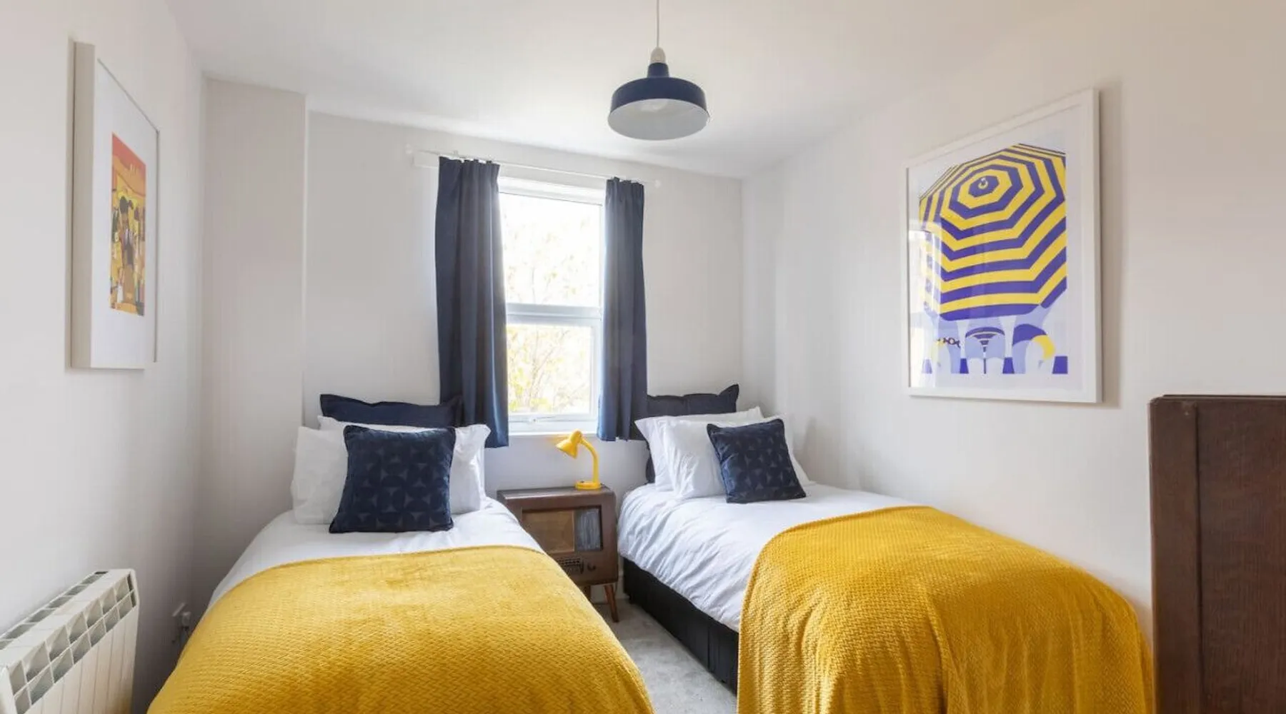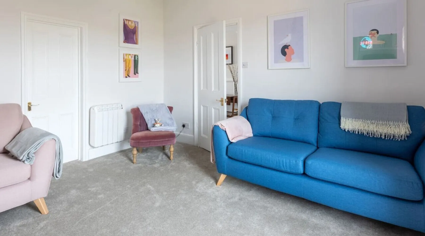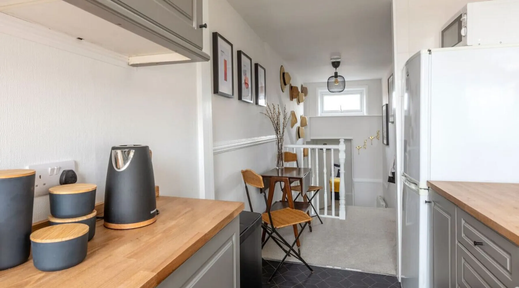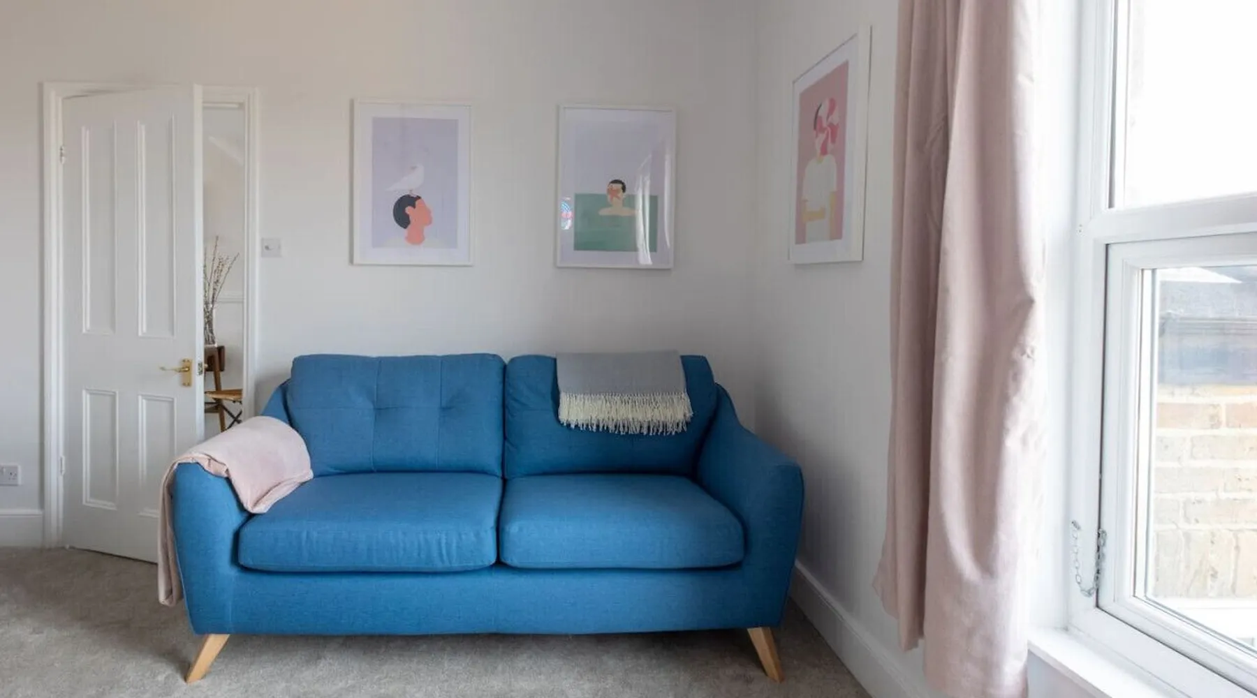 Bright and airy apartment, set over two floors at the top floor of a handsome Victorian townhouse. Light streams into the kitchen in the morning, whilst you prepare breakfast and an early evening drink in the lounge brings beautiful views of Margate's famous pink and purple skies. Tucked just off Northdown Road, were you will find an eclectic mix of bars, restaurants & cafes, with the beach & tidal pool only moments away. Your seaside adventure awaits. The 2 bedrooms both have large double beds, which can be split into singles too. The flat has a fully functioning kitchen, including a washing machine. There is space to eat either in the kitchen landing area or on the folding table in the living room looking out over the church steeple and the roof tops. There is a smart TV with Netflix and Amazon Prime included, and wireless speakers to connect your phone to for background tunes. There is a bathroom with an electric shower and toilet, and a separate additional toilet. Turn left out the front door for a two-minute stroll to the golden sand beach and stunning tidal pool via our convenient underpass. Turn right for vintage furniture and record shops, great coffee shops and cool restaurants. The old town, Turner Gallery, Shell Museum, and Dreamland are all a 10–15-minute walk. Margate station is a short taxi ride or a 20-minute walk. The flat is at the top of a beautiful period property. There are 3 flights of stairs up to the apartment & a few stairs within the apartment itself. Guests have full and private access to the whole apartment other than a few locked cupboards. We will be on hand to answer any questions you have before, during or after your stay. We live locally so can help you plan your stay to make it as enjoyable as possible. Please note as there is no gas supply to the flat, the hot water heater is electric, which means it can be slow to fill the bath - showers are no problem though. All guests receive access to our exclusive digital guest guide, which includes recommendations for local restaurants & activities.