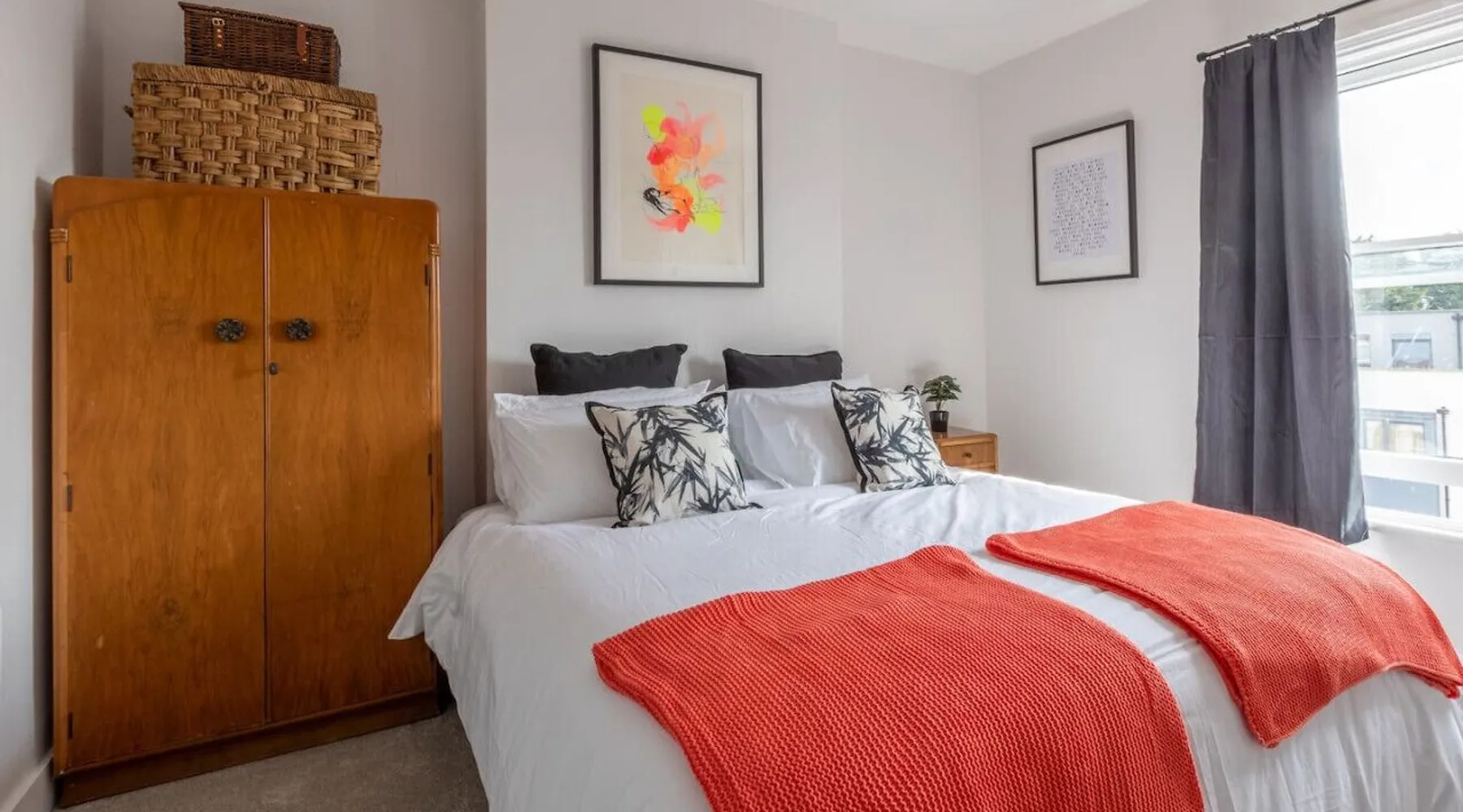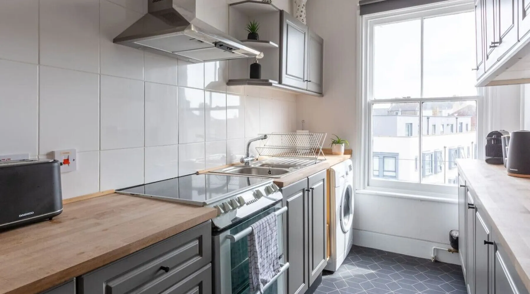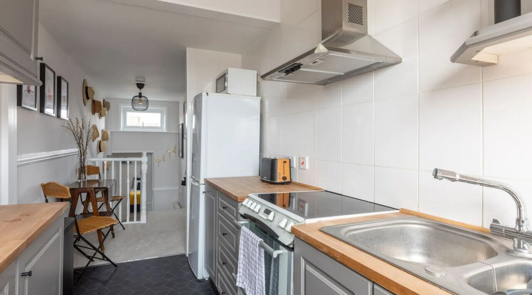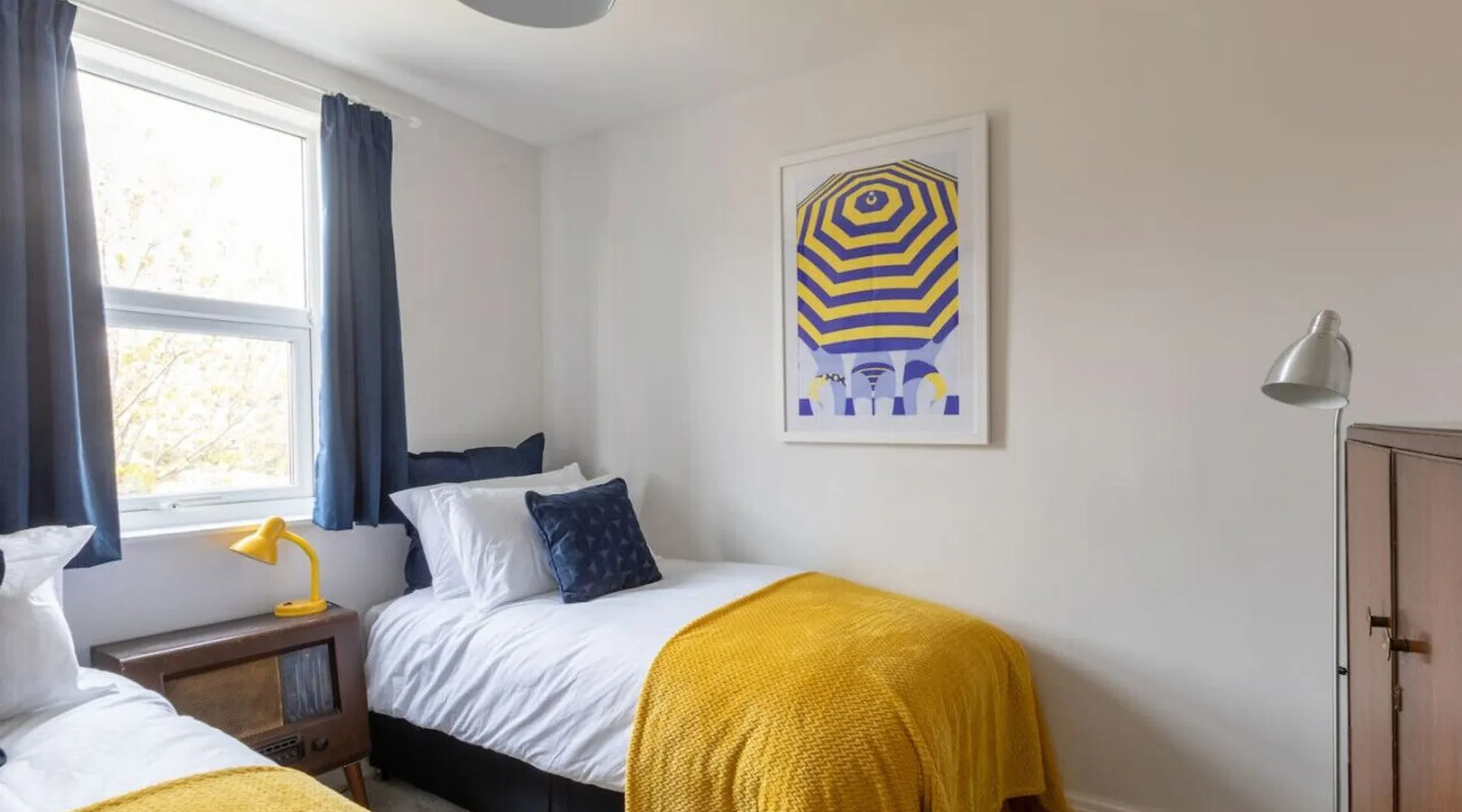 Bright and airy apartment, set over two floors at the top floor of a handsome Victorian townhouse. Light streams into the kitchen in the morning, whilst you prepare breakfast and an early evening drink in the lounge brings beautiful views of Margate's famous pink and purple skies. Tucked just off Northdown Road, were you will find an eclectic mix of bars, restaurants & cafes, with the beach & tidal pool only moments away. Your seaside adventure awaits. The 2 bedrooms both have large double beds, which can be split into singles too. The flat has a fully functioning kitchen, including a washing machine. There is space to eat either in the kitchen landing area or on the folding table in the living room looking out over the church steeple and the roof tops. There is a smart TV with Netflix and Amazon Prime included, and wireless speakers to connect your phone to for background tunes. There is a bathroom with an electric shower and toilet, and a separate additional toilet. Turn left out the front door for a two-minute stroll to the golden sand beach and stunning tidal pool via our convenient underpass. Turn right for vintage furniture and record shops, great coffee shops and cool restaurants. The old town, Turner Gallery, Shell Museum, and Dreamland are all a 10–15-minute walk. Margate station is a short taxi ride or a 20-minute walk. The flat is at the top of a beautiful period property. There are 3 flights of stairs up to the apartment & a few stairs within the apartment itself. Guests have full and private access to the whole apartment other than a few locked cupboards. We will be on hand to answer any questions you have before, during or after your stay. We live locally so can help you plan your stay to make it as enjoyable as possible. Please note as there is no gas supply to the flat, the hot water heater is electric, which means it can be slow to fill the bath - showers are no problem though. All guests receive access to our exclusive digital guest guide, which includes recommendations for local restaurants & activities.