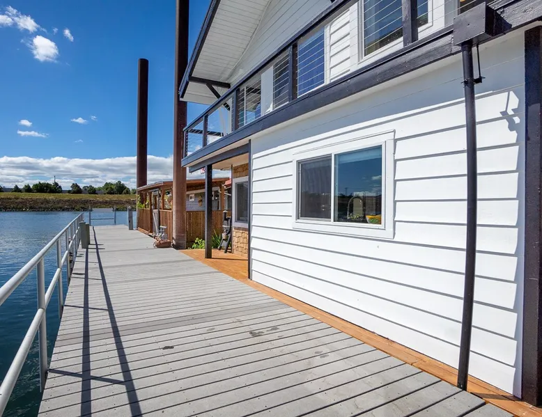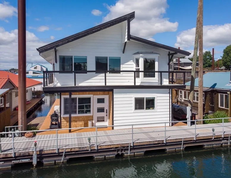 90 day minimum. Cleaning service provided every 2 weeks, included in price of stay. Newly remodeled inside and out with luxury in mind. With the river beneath you, staying in this 2-story 2215 square foot floating home feels like a relaxing vacation. Watch the boats go by from the comfort of the couch, or take a peaceful walk along the docks of the moorage. The space The kitchen has top of the line stainless steel appliances, 6 burner gas stove, copper sink. Downstairs also has a dining area, bedroom, two bathrooms, washer/dryer, and a boat garage turned hangout room with a garage door that opens up to the river. Upstairs is one big open space combining a bedroom and living area. Windows all around provide a beautiful view and natural light. The bathroom has heated floors and a generously sized shower with 7 shower heads. Walk-in closet. A sliding door leads to the large upper deck area and a catwalk all around the home. Convenient automatic blinds on all windows of the house. We will provide all the basics of what you need (cooking supplies, linens, shower products, laundry detergent, etc). Guest access Entire home