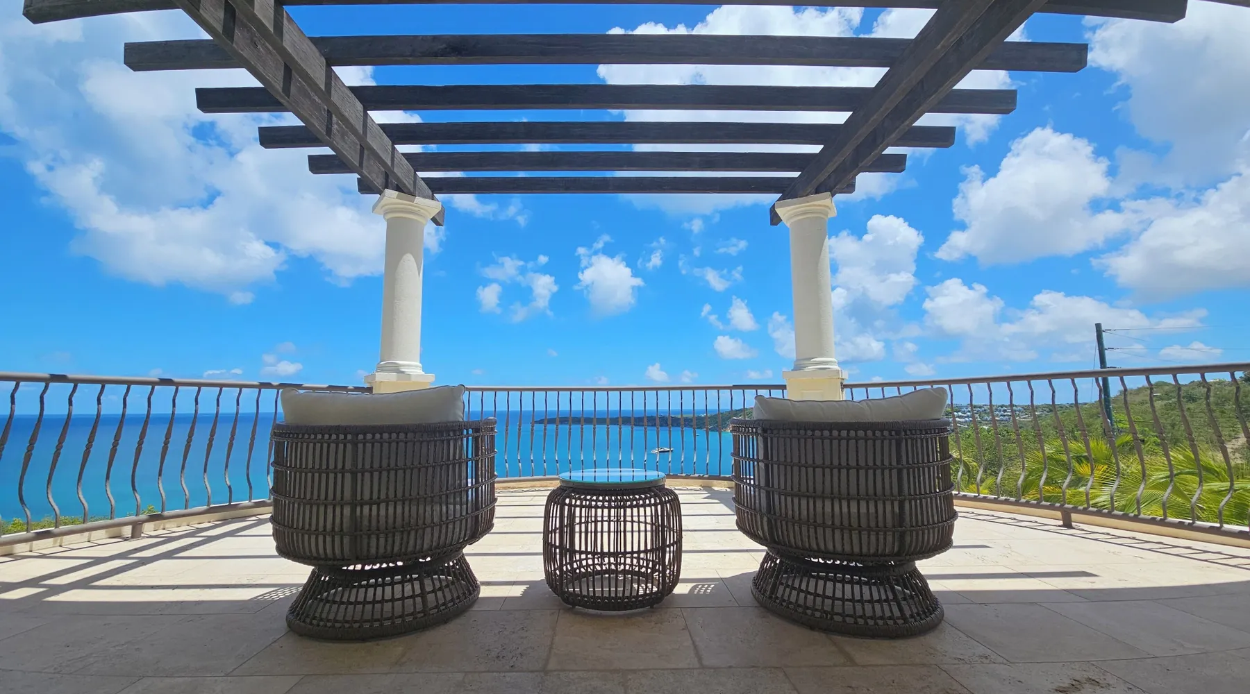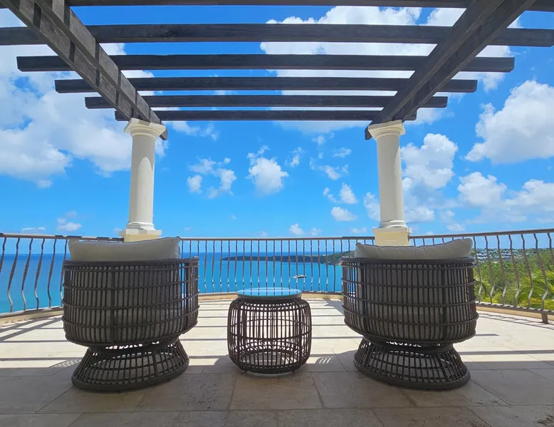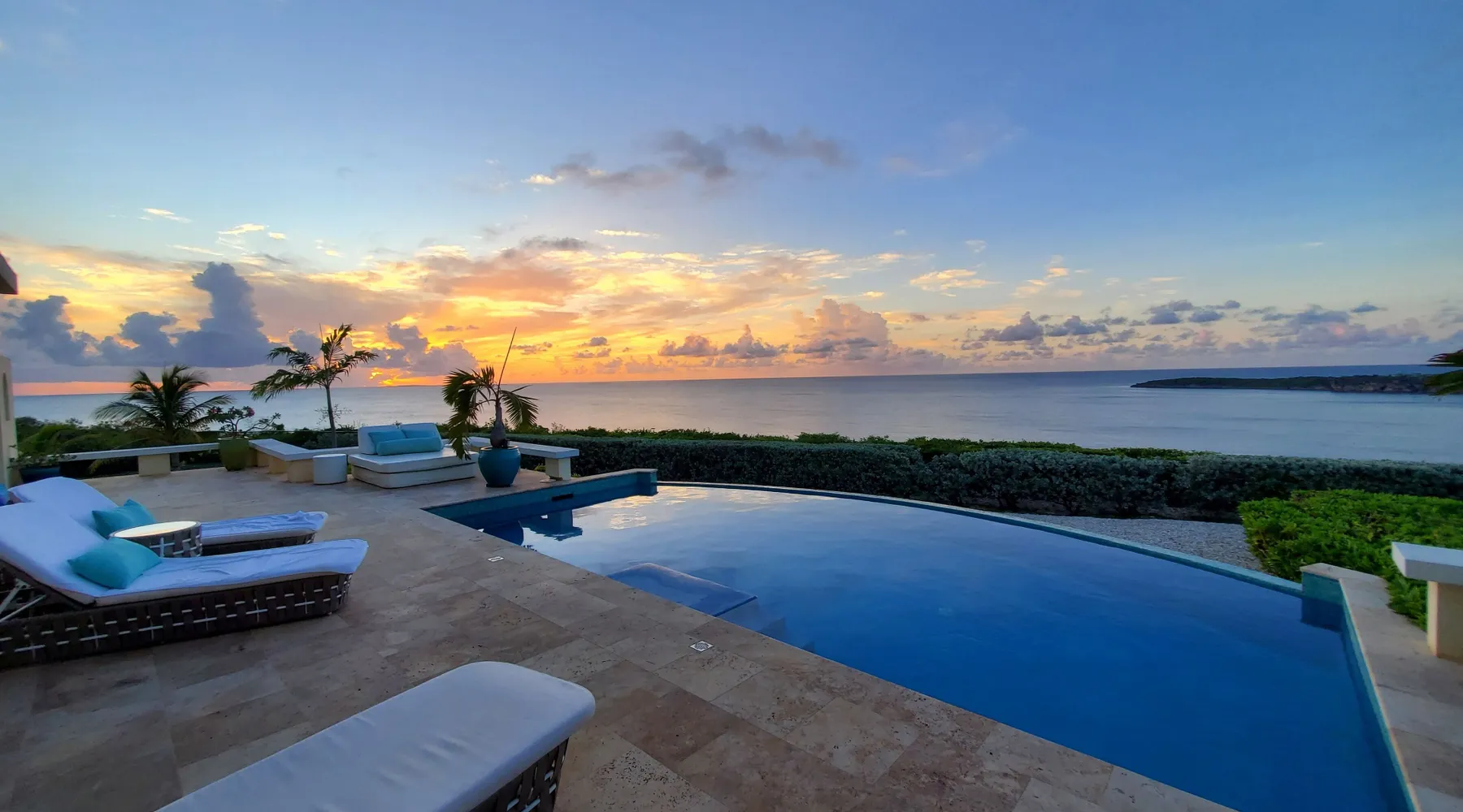 Oceana, Anguilla offers tranquility, romance, and casually elegant tropical living. The villa's open design maximizes sea views and ocean breezes, inviting you to experience a private vacation retreat. Set on a breezy hillside overlooking picturesque Crocus Bay, this bright and airy villa provides sweeping ocean vistas from one of the highest points on Anguilla. Villa Oceana offers one of the most unique views on the island - world famous Little Bay, Sandy Island, and Flat Cap peninsula, which shelters Crocus harbor. The villa's central location is ideally situated between the high-end resorts and restaurants of the West End and Shoal Bay East, one of the Caribbean's best white-sand beaches. Built as two levels on almost one acre of land, the design allows for views of the ocean from almost every room, as well as the lush green valley of Anguilla and distant hills of St. Martin. The interior and exterior living spaces total over 5,000 square feet. Oceana's great room leads out to an expansive, arched, tiled patio and deck. The outdoor terrace features covered dining al fresco and a dramatic 12' x 30' curved infinity-edge heated pool. Unique natural travertine floors seamlessly unite the indoor and outdoor living spaces. The main level features a spacious living area with tropical contemporary furnishings and entertainment center, fully-equipped kitchen featuring granite countertops and Viking appliances, a separate dining area, and an air-conditioned king master suite with en suite bathroom, including both a walk-in stone shower and open-air outdoor shower. The upper level includes the second air-conditioned master king bedroom/bathroom suite, furnished with an inviting four-poster bed and both indoor and al fresco showers. The bedroom opens out to a scenic private balcony and pergola, overlooking Crocus beach. The bi-level floorplan also includes a mezzanine with queen sofa sleeper that leads out to a large verandah and lounging area perfect for relaxing and viewing spectacular sunsets. Beautifully furnished with tropical style and comfort, and fully equipped with everything you might need, Oceana provides a serene and inviting ambience, heightened by breathtaking views. A perfect setting for barefoot elegance! Keywords: private, secluded, tranquil, open-air, luxurious, pool, infinity, view, hillside, modern, new, picturesque, chic, tropical, elegant, large, oceanview, sunset, sophisticated, affordable, romantic, honeymoon, balcony