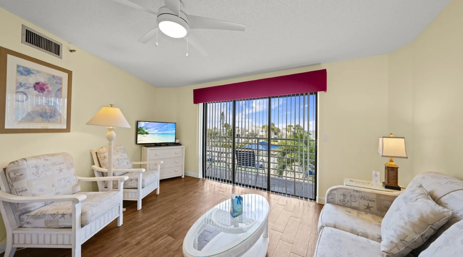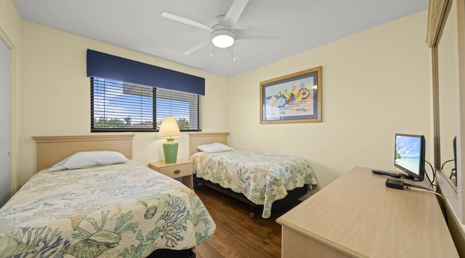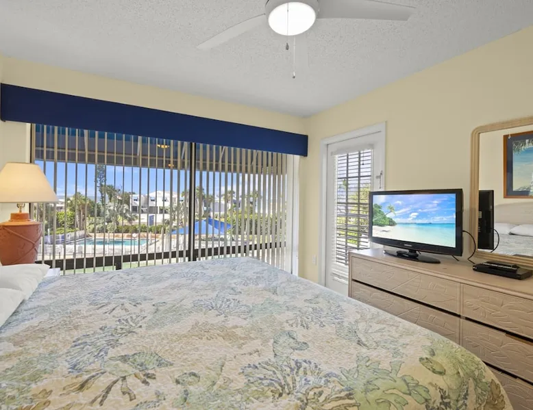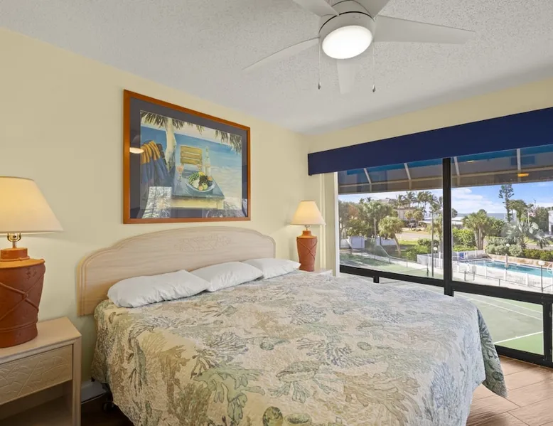 Step into a vintage-inspired retreat where coastal charm meets laid-back island living. This thoughtfully styled condo channels the relaxed elegance of a Greek island escape—breezy, bright, and full of character. The space Start your mornings with a cup of coffee on the private balcony, spend lazy afternoons by the beach or pool, and end the day with a salty breeze and sunset glow. Inside, the layout is designed for comfort and connection: King bedroom for a restful night’s sleep Guest room with two twin beds Queen sleeper sofa in the living area The fully equipped kitchen makes mealtime easy, whether you’re whipping up breakfast or late-night snacks. Stay cool and connected with central AC, Cable TV, and complimentary WiFi. We’ve got you covered with fresh linens, towels, and free on-site laundry—because vacation shouldn’t come with chores. Sip, sun, and slow down—your vintage island escape awaits. Guest access You can enjoy a number of recreational activities including a lighted tennis court, heated outdoor pool, bicycles, shuffleboard, BBQ grills and 200 feet of beach. This unit is located across the street from the beach. Other things to note You are limited to one parking space per unit. No Pets. No Smoking Must be 21 or over to rent. There are no parking facilities for boats, jet skis, trailers, campers, or motor homes. While we aim to keep all resort amenities available, occasional closures may happen due to maintenance or unforeseen events.
