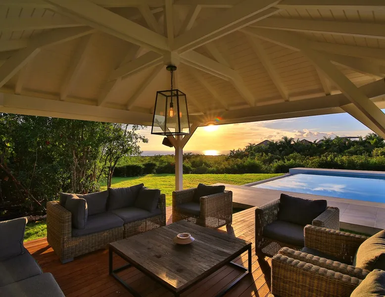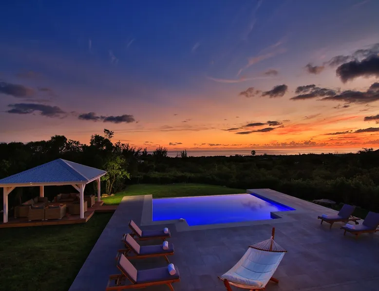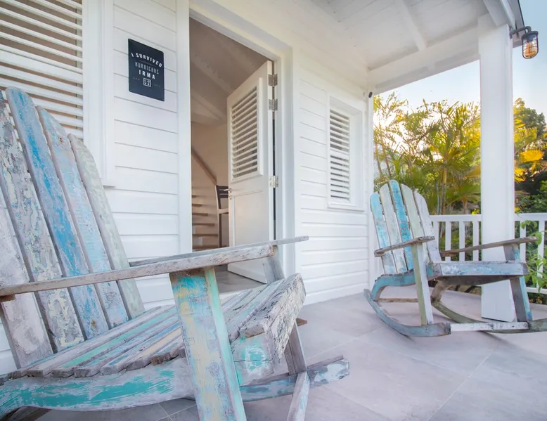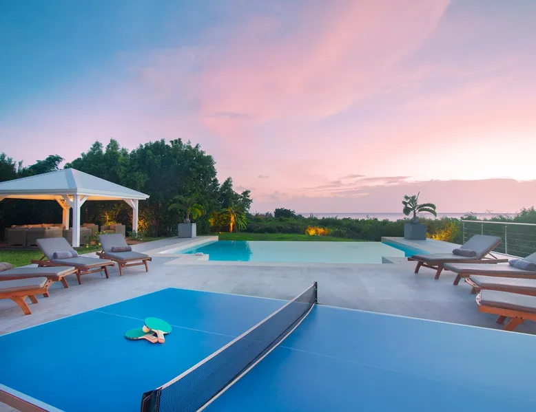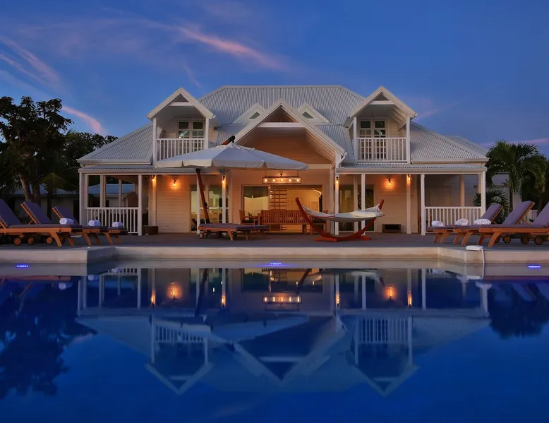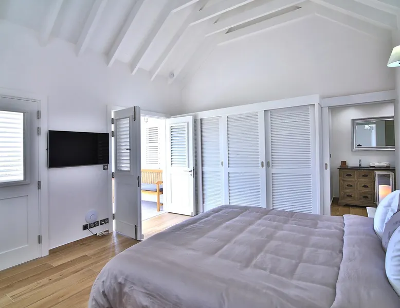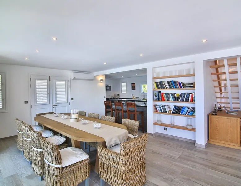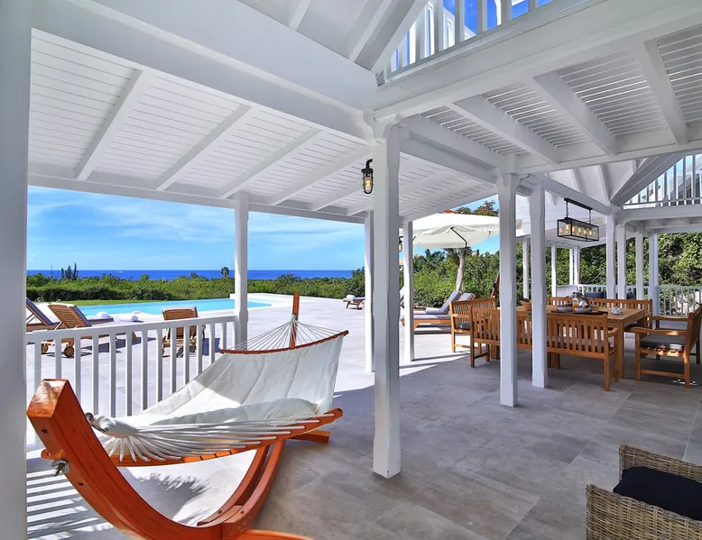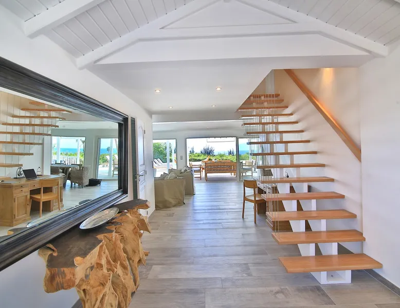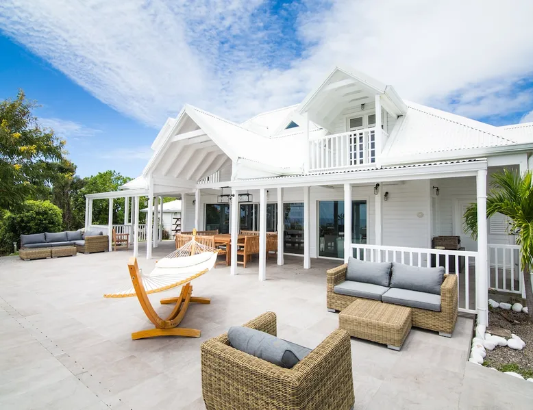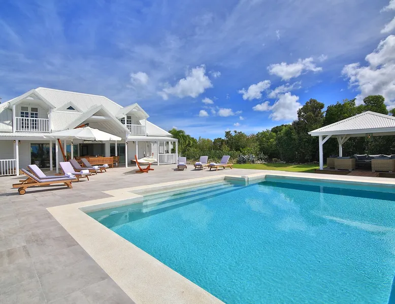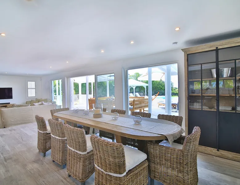 The Hamptons property, classified as one of the best residences in Sint Marteen, is located in Basses Terres. It has been recently renovated and decorated with refinement. It is composed of one villa and one cottage, which can be rented together or separately. Villa Hamptons has 4 bedrooms (sleeps 8) and 4 bathrooms The ad has just been redone, don't hesitate to ask us to send you the review! The space Concerning the Hamptons villa, each of its 4 bedrooms has a king size bed. Two of them give you direct access to the terrace and the garden, the two other rooms located upstairs offer a superb view of the Caribbean Sea. All rooms also have air conditioning, and satellite TV. The Hamptons Villa is arranged around a bar and a beautiful fully equipped kitchen. The large sliding doors will take you directly to the terrace with its overflowing swimming pool, relax on one of the lounge chairs to enjoy the sun. A spacious living room equipped with a television will allow you to be comfortably installed. As for the terrace, it is equipped with a large convivial table from where you can admire a magnificent sunset every evening. Guest access Each villa is independent, they have separate entrance doors and their own swimming pool. This ensures optimum privacy.