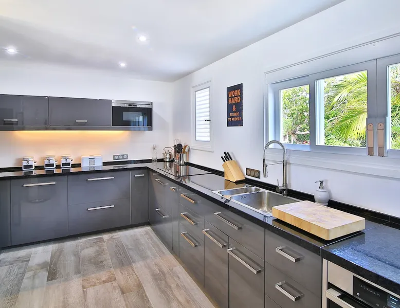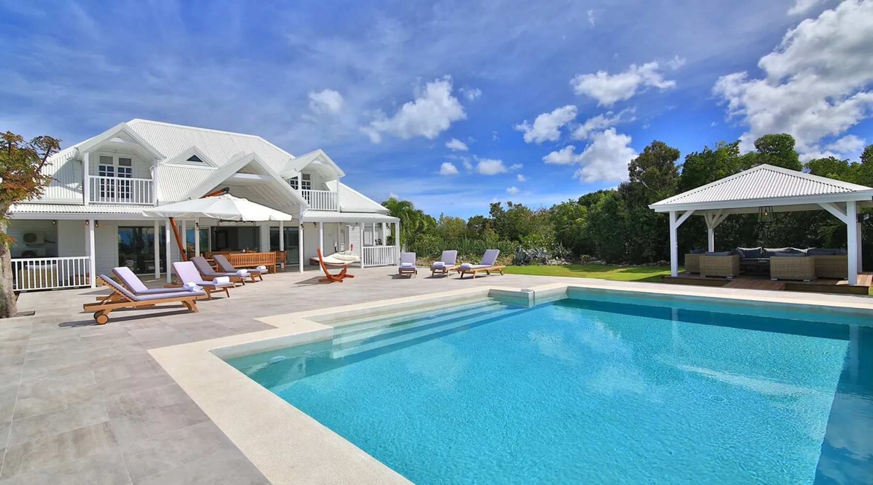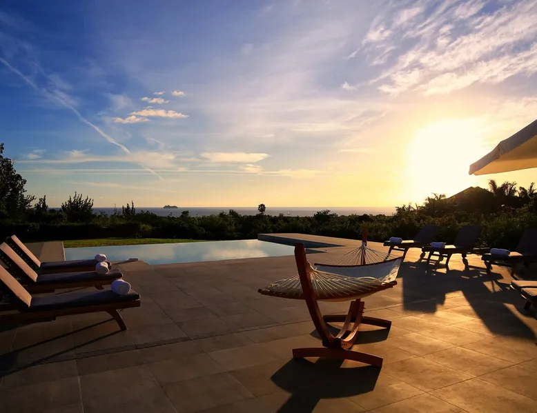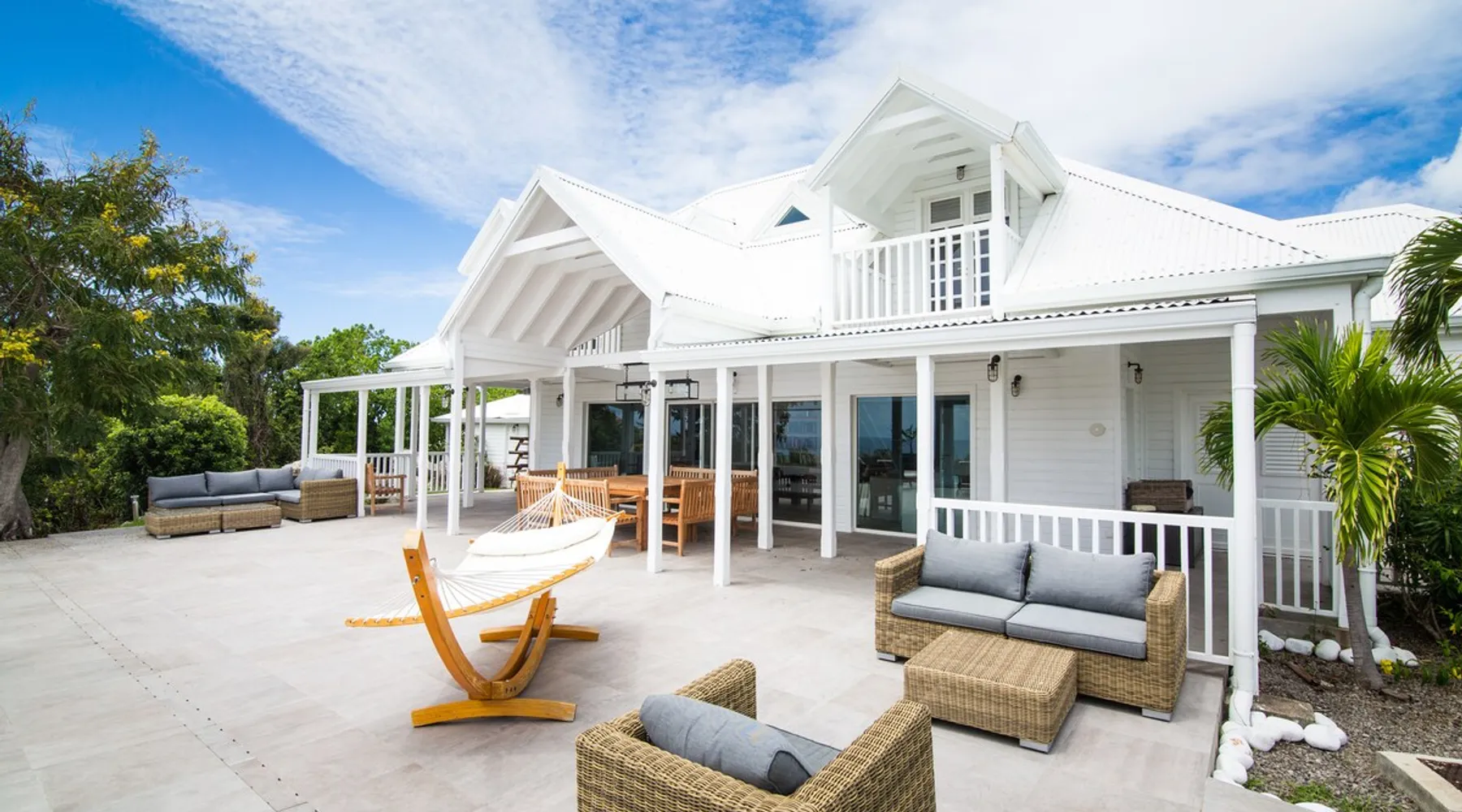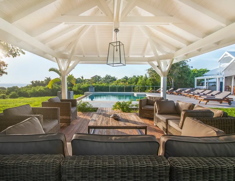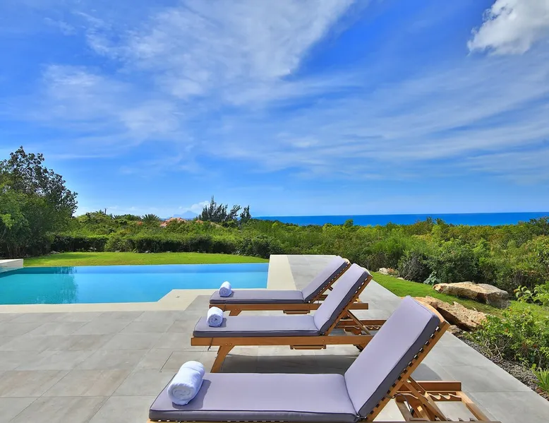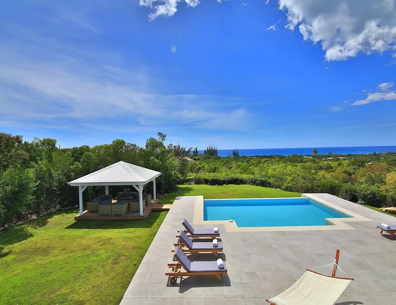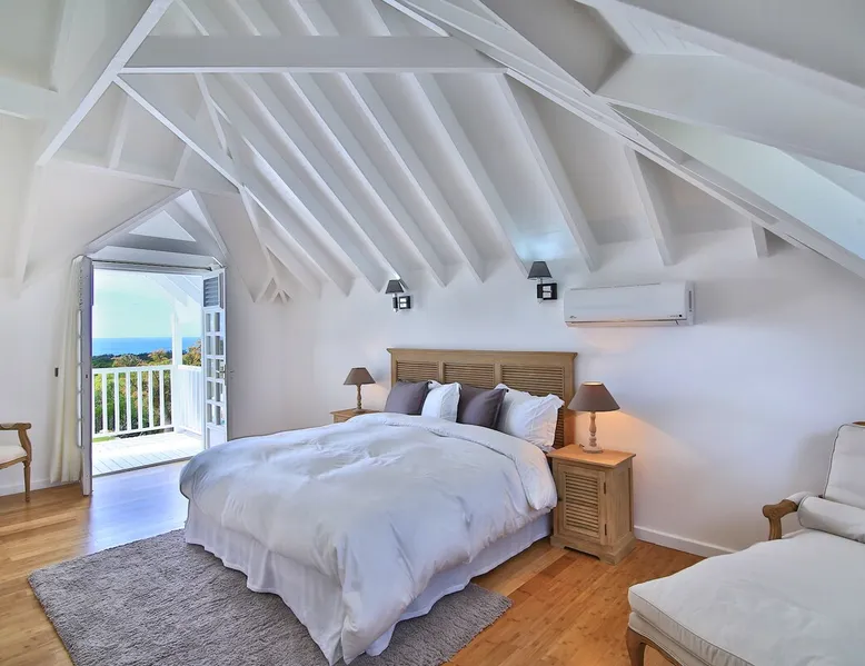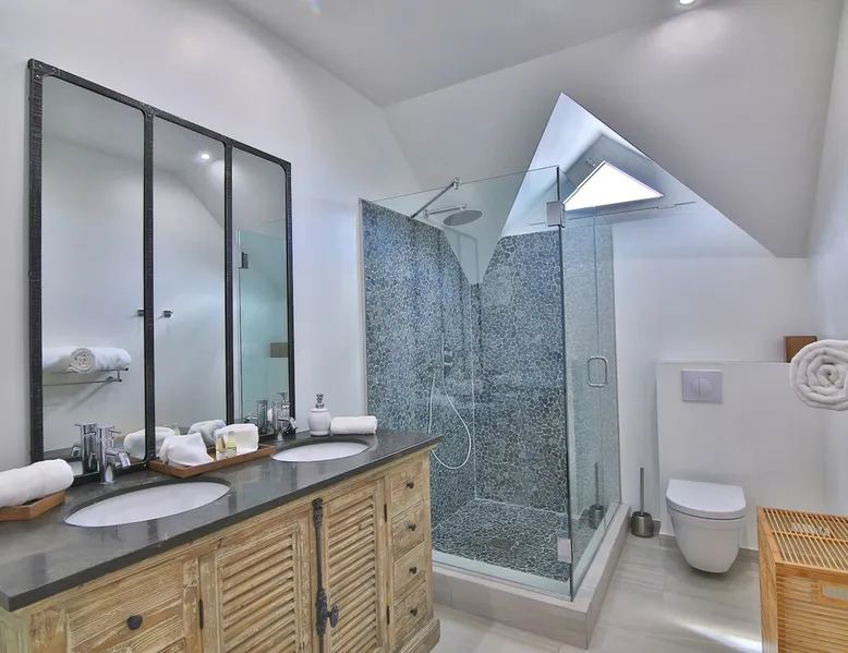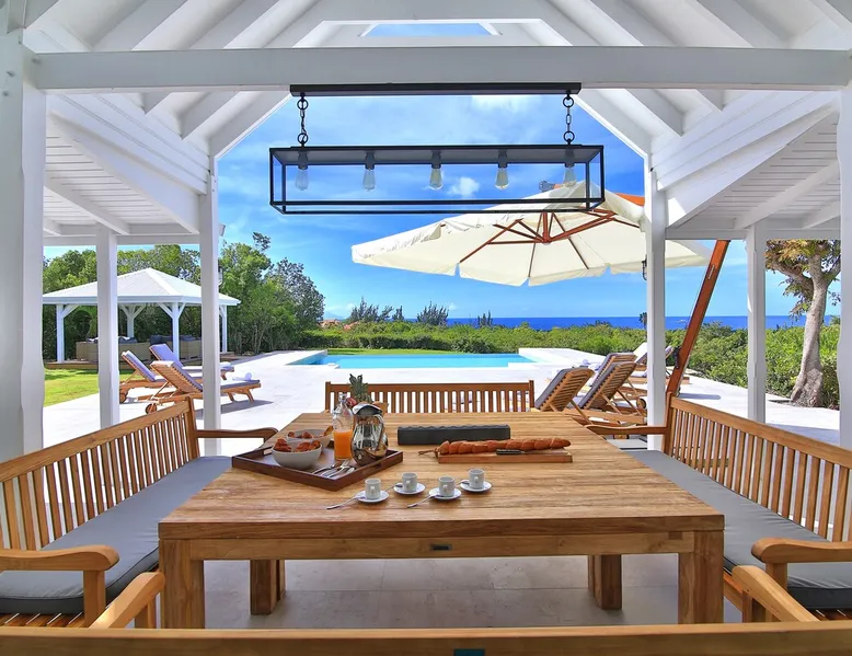 The Hamptons property, classified as one of the best residences in Sint Marteen, is located in Basses Terres. It has been recently renovated and decorated with refinement. It is composed of one villa and one cottage, which can be rented together or separately. Villa Hamptons has 4 bedrooms (sleeps 8) and 4 bathrooms The ad has just been redone, don't hesitate to ask us to send you the review! The space Concerning the Hamptons villa, each of its 4 bedrooms has a king size bed. Two of them give you direct access to the terrace and the garden, the two other rooms located upstairs offer a superb view of the Caribbean Sea. All rooms also have air conditioning, and satellite TV. The Hamptons Villa is arranged around a bar and a beautiful fully equipped kitchen. The large sliding doors will take you directly to the terrace with its overflowing swimming pool, relax on one of the lounge chairs to enjoy the sun. A spacious living room equipped with a television will allow you to be comfortably installed. As for the terrace, it is equipped with a large convivial table from where you can admire a magnificent sunset every evening. Guest access Each villa is independent, they have separate entrance doors and their own swimming pool. This ensures optimum privacy.