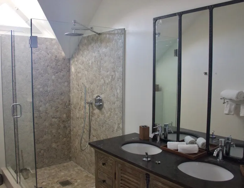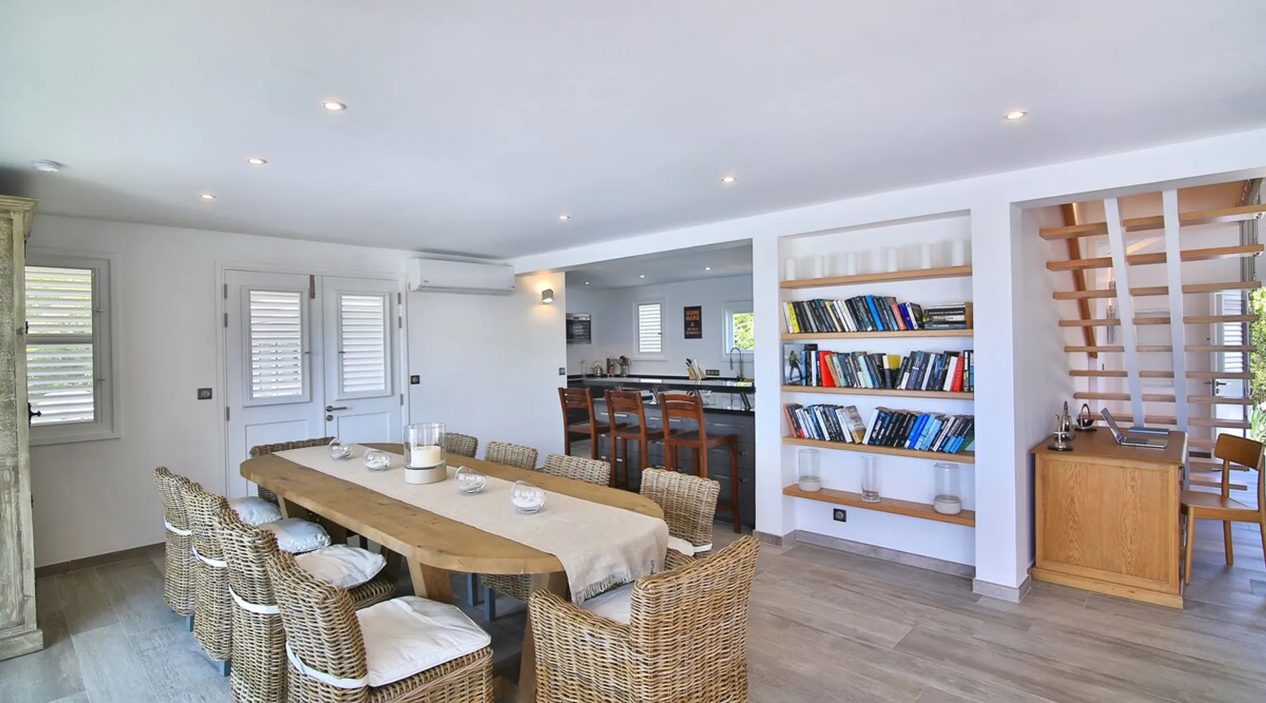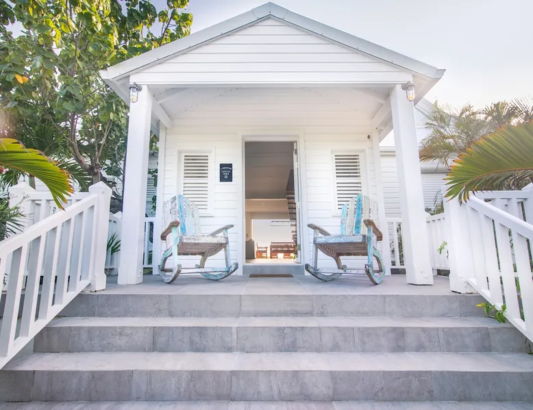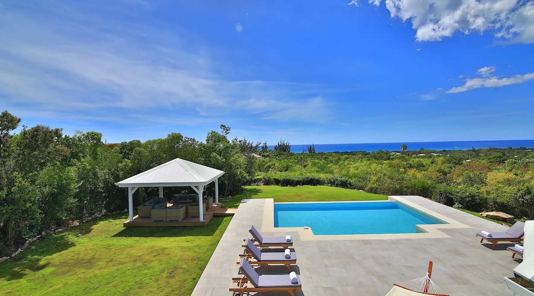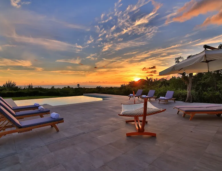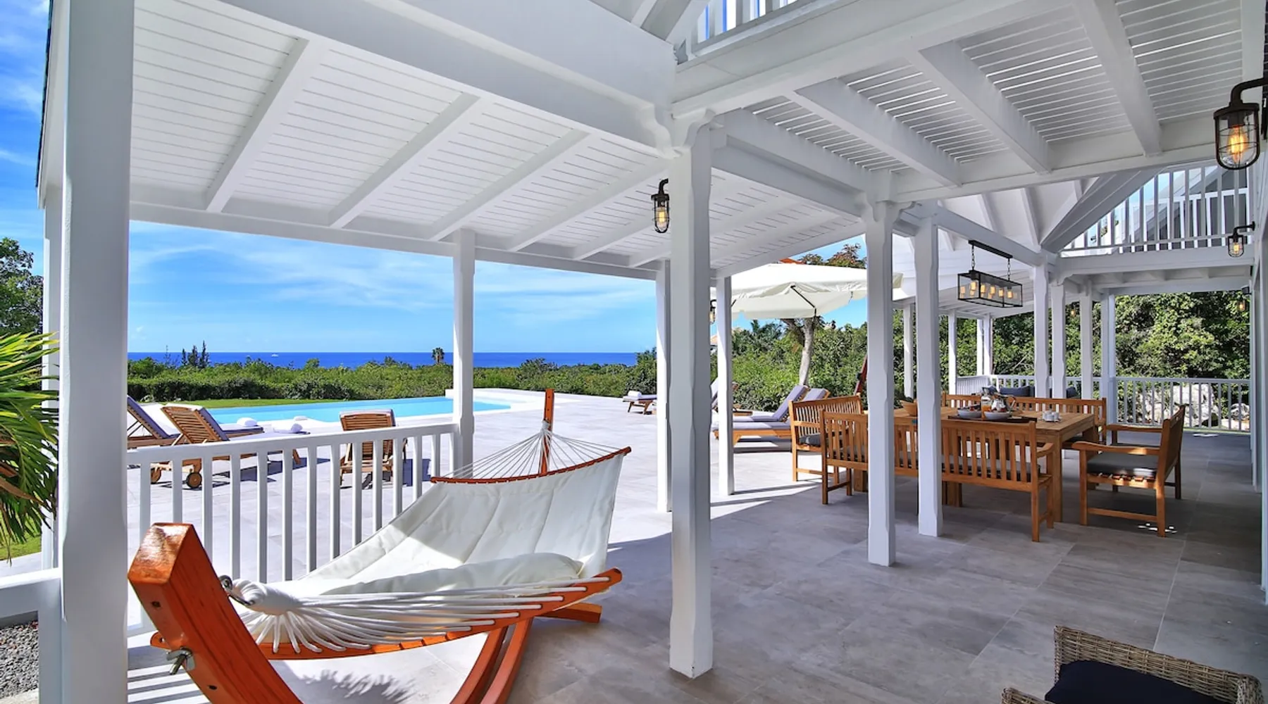 The Hamptons property, classified as one of the best residences in Sint Marteen, is located in Basses Terres. It has been recently renovated and decorated with refinement. It is composed of one villa and one cottage, which can be rented together or separately. Villa Hamptons has 4 bedrooms (sleeps 8) and 4 bathrooms The ad has just been redone, don't hesitate to ask us to send you the review! The space Concerning the Hamptons villa, each of its 4 bedrooms has a king size bed. Two of them give you direct access to the terrace and the garden, the two other rooms located upstairs offer a superb view of the Caribbean Sea. All rooms also have air conditioning, and satellite TV. The Hamptons Villa is arranged around a bar and a beautiful fully equipped kitchen. The large sliding doors will take you directly to the terrace with its overflowing swimming pool, relax on one of the lounge chairs to enjoy the sun. A spacious living room equipped with a television will allow you to be comfortably installed. As for the terrace, it is equipped with a large convivial table from where you can admire a magnificent sunset every evening. Guest access Each villa is independent, they have separate entrance doors and their own swimming pool. This ensures optimum privacy.