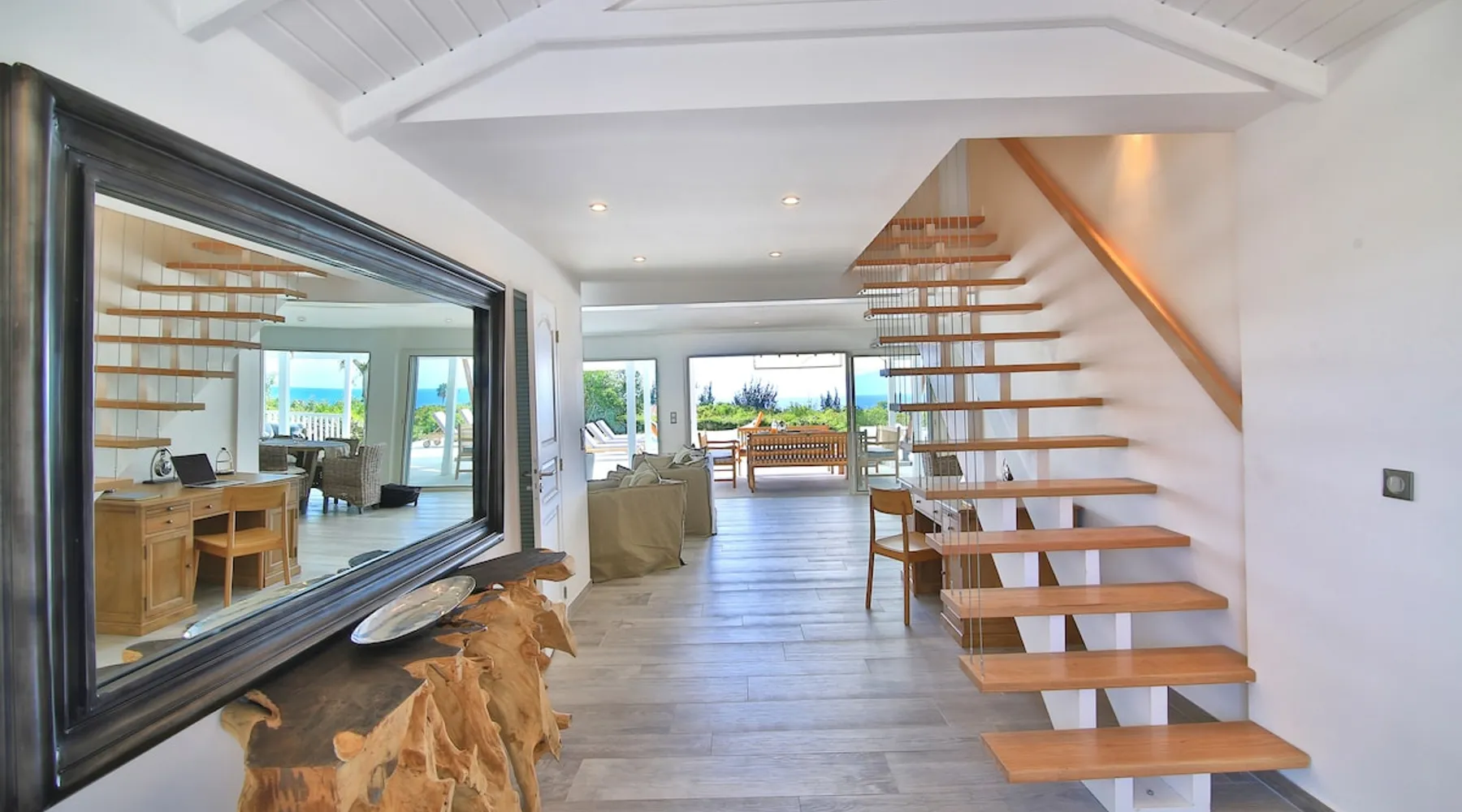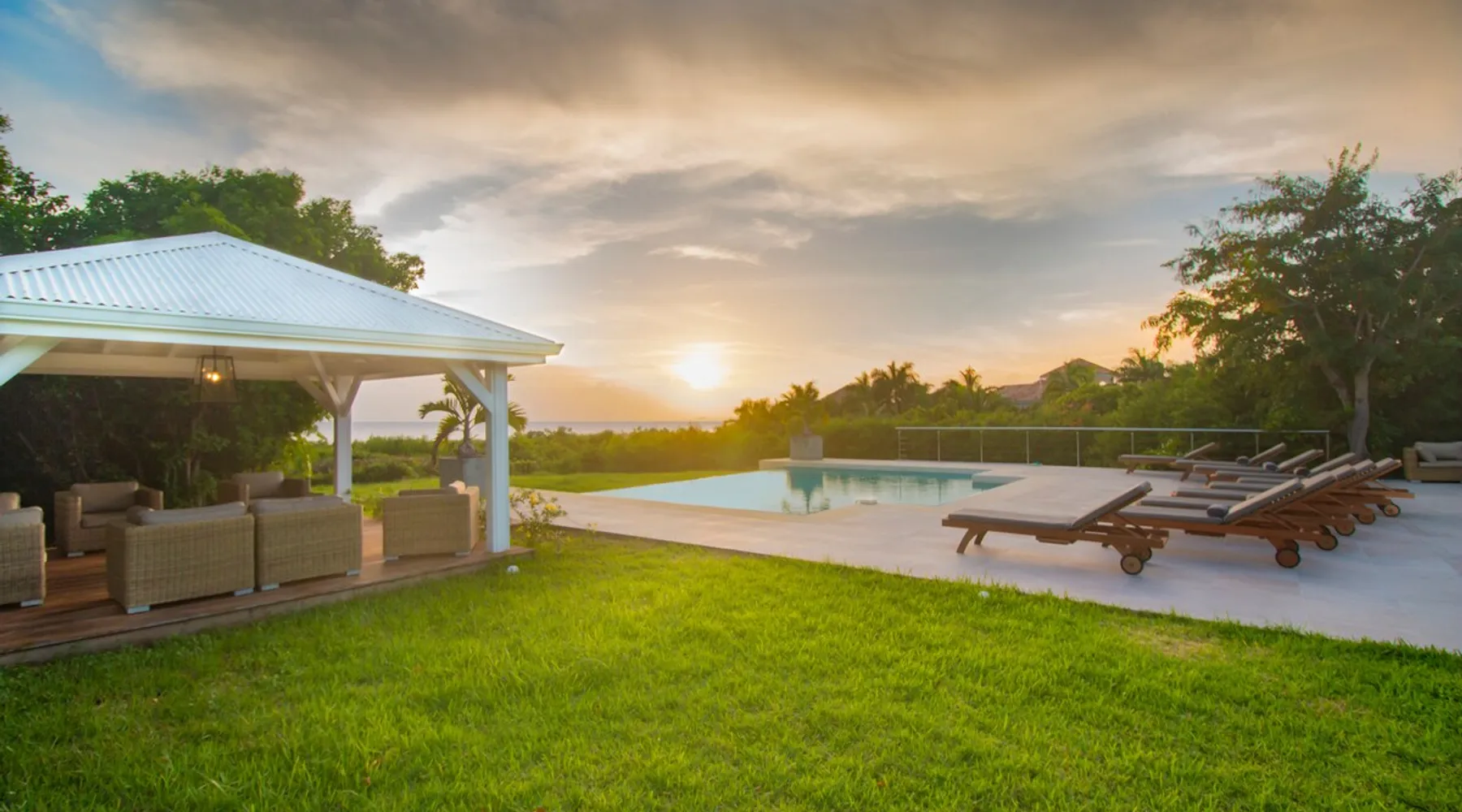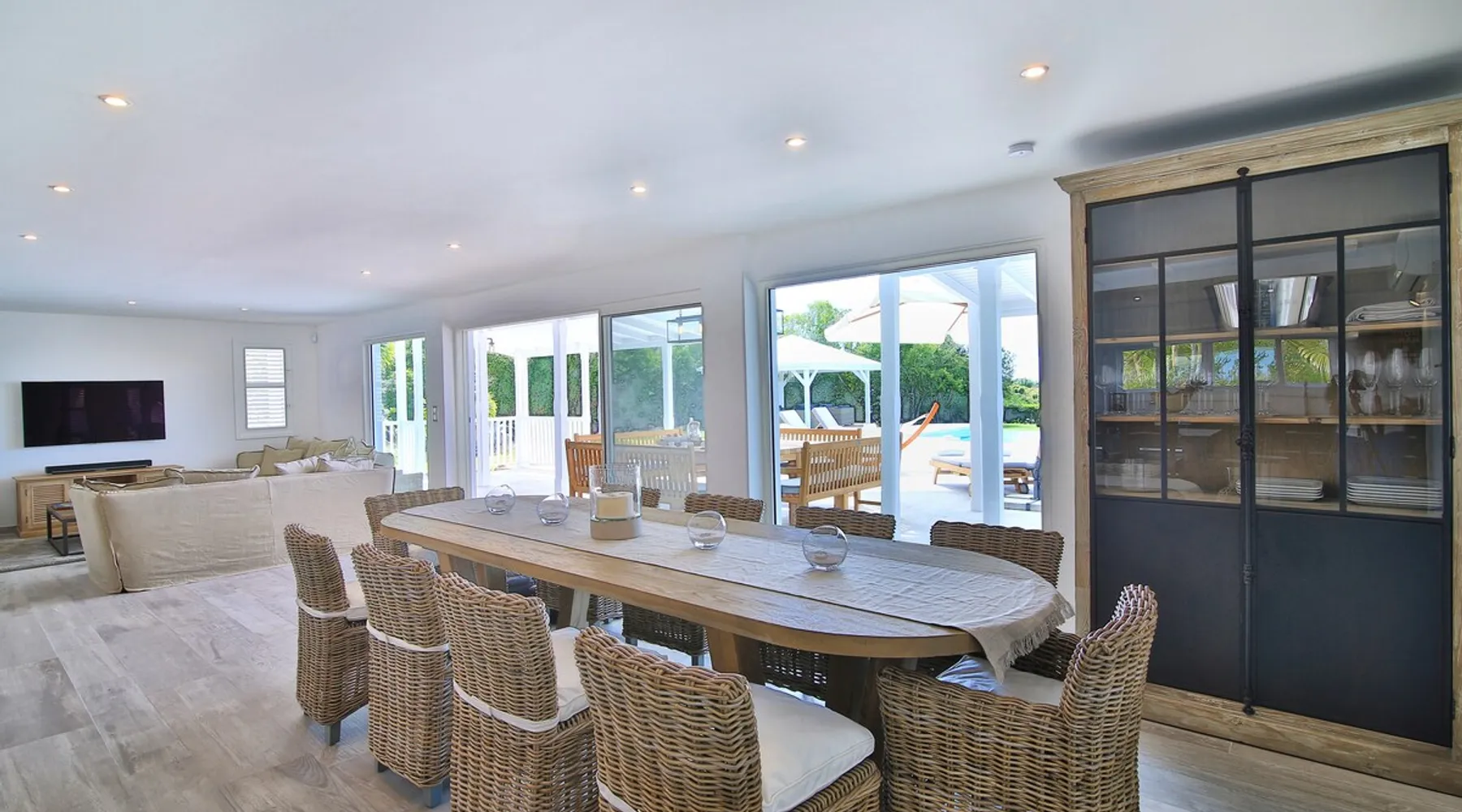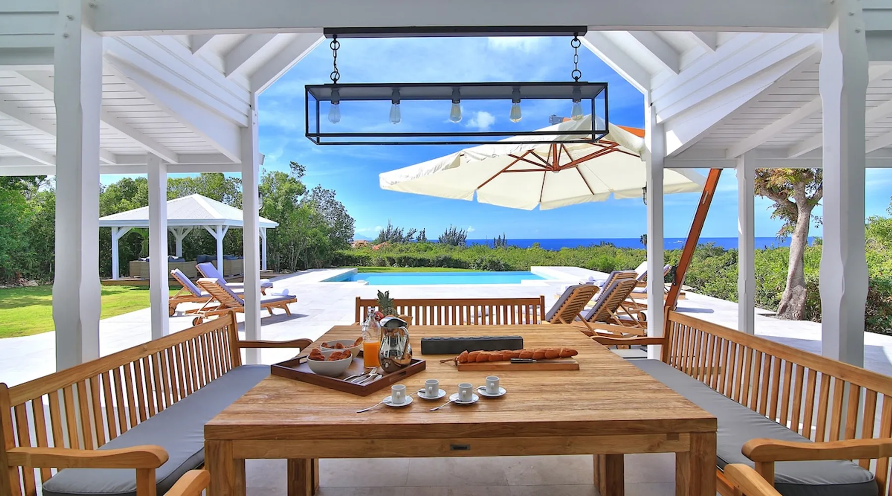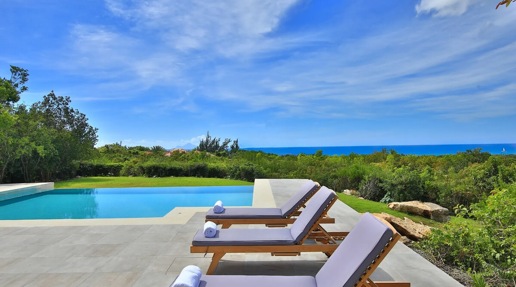 The Hamptons property, classified as one of the best residences in Sint Marteen, is located in Basses Terres. It has been recently renovated and decorated with refinement. It is composed of one villa and one cottage, which can be rented together or separately. Villa Hamptons has 4 bedrooms (sleeps 8) and 4 bathrooms The ad has just been redone, don't hesitate to ask us to send you the review! The space Concerning the Hamptons villa, each of its 4 bedrooms has a king size bed. Two of them give you direct access to the terrace and the garden, the two other rooms located upstairs offer a superb view of the Caribbean Sea. All rooms also have air conditioning, and satellite TV. The Hamptons Villa is arranged around a bar and a beautiful fully equipped kitchen. The large sliding doors will take you directly to the terrace with its overflowing swimming pool, relax on one of the lounge chairs to enjoy the sun. A spacious living room equipped with a television will allow you to be comfortably installed. As for the terrace, it is equipped with a large convivial table from where you can admire a magnificent sunset every evening. Guest access Each villa is independent, they have separate entrance doors and their own swimming pool. This ensures optimum privacy.