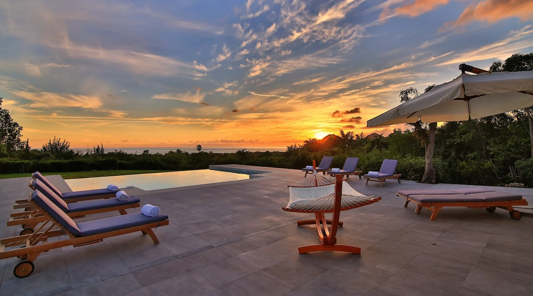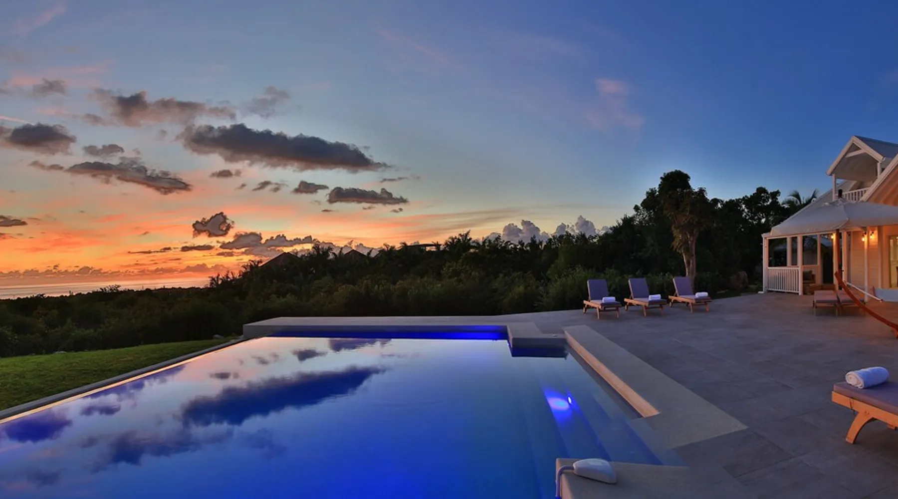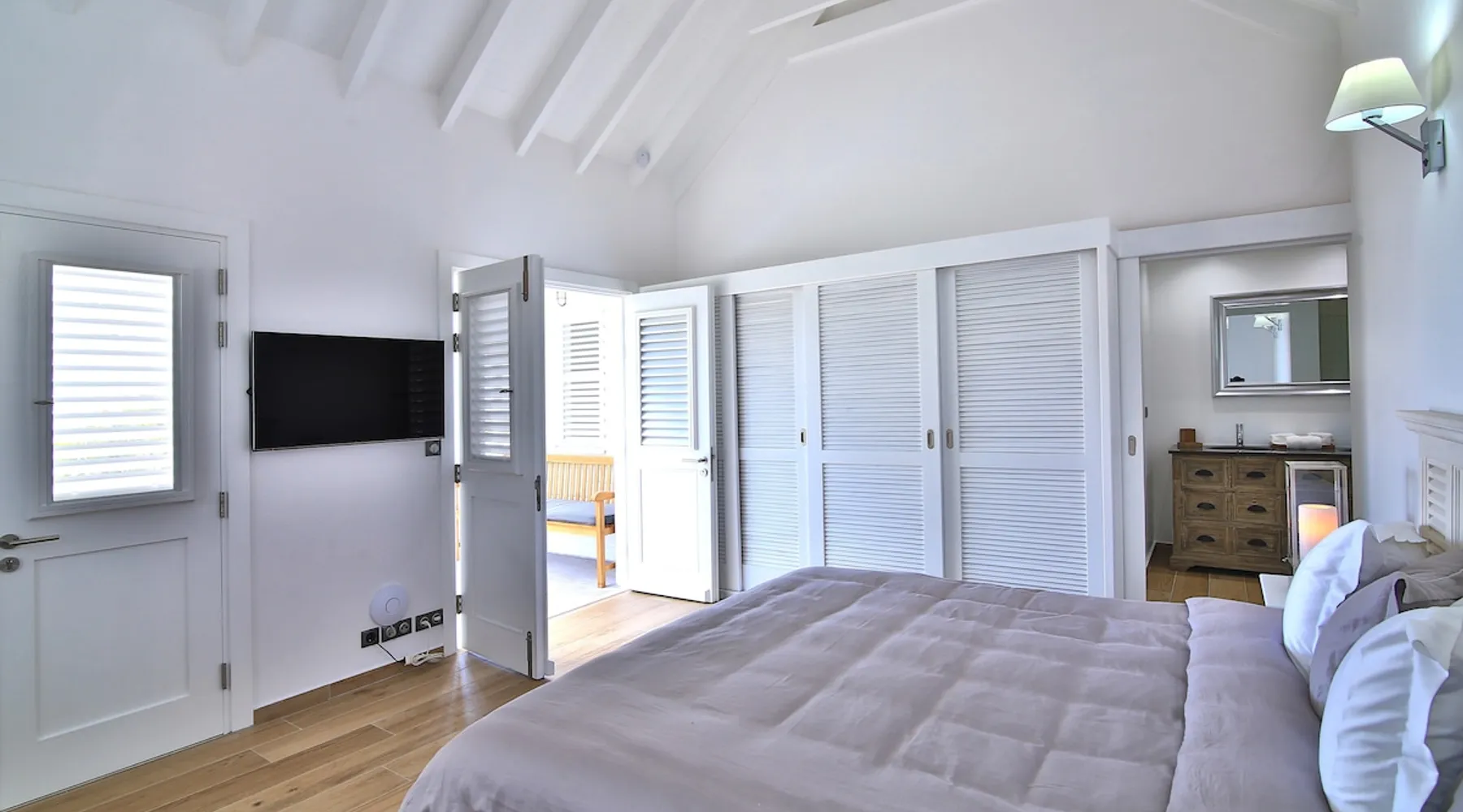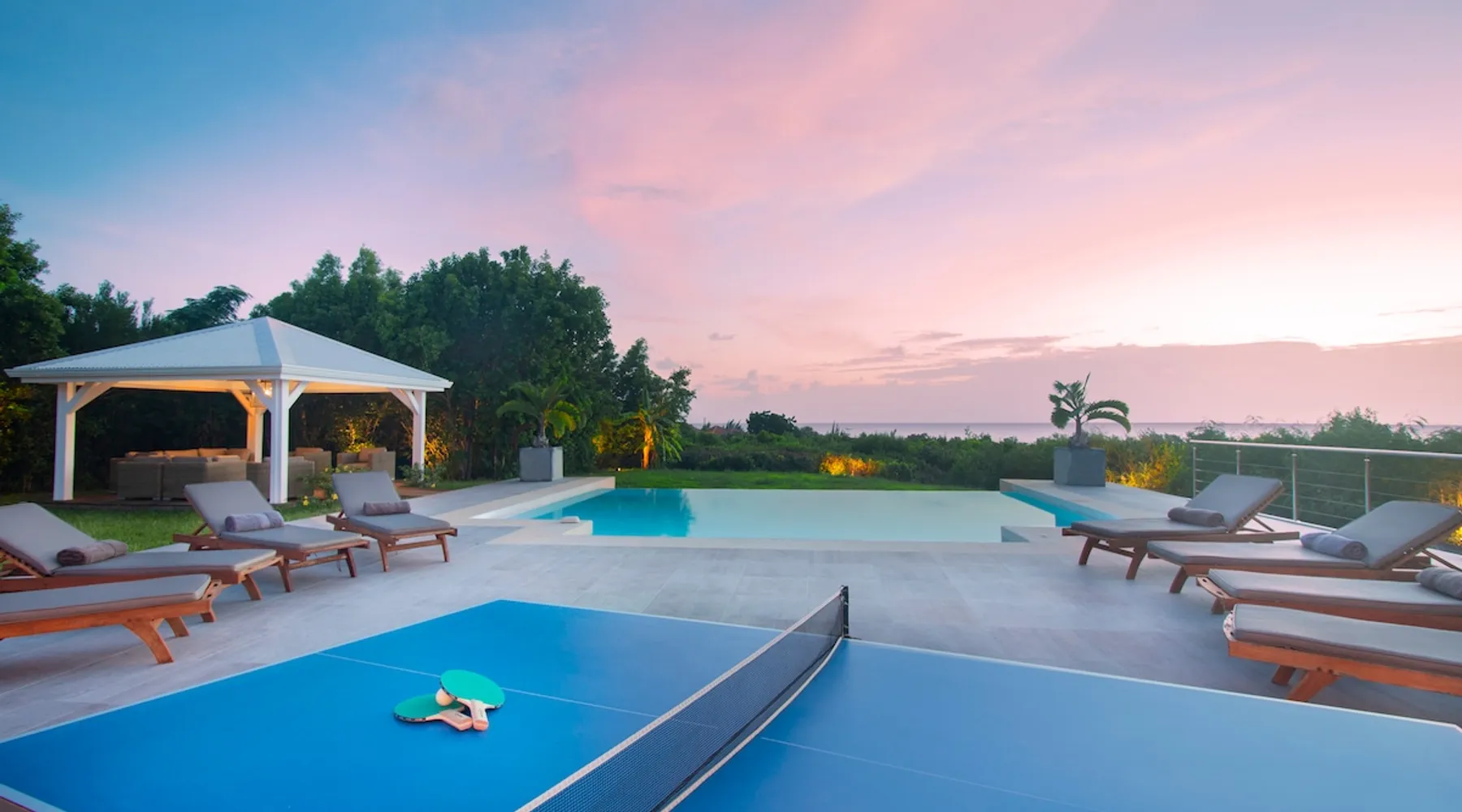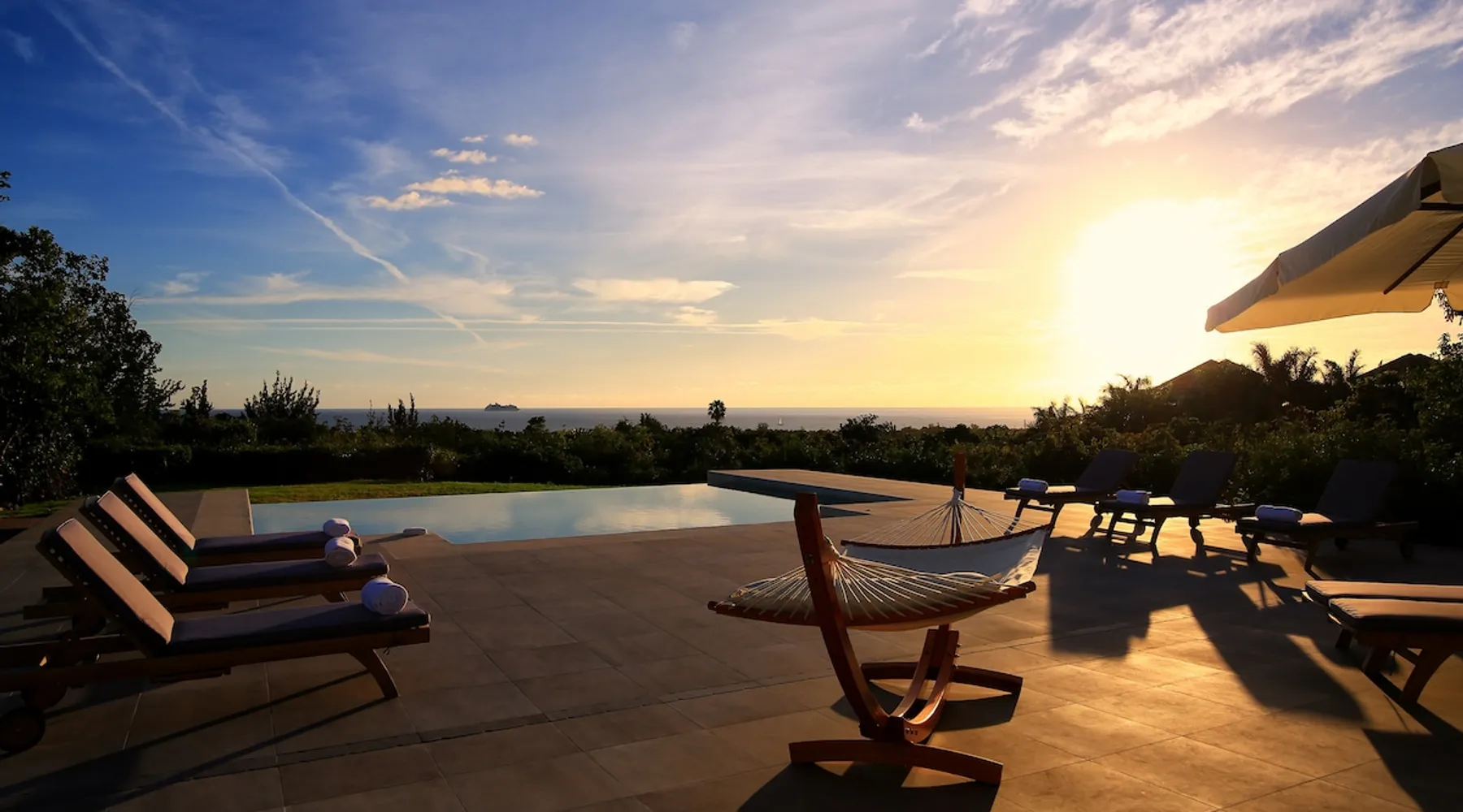 The Hamptons property, classified as one of the best residences in Sint Marteen, is located in Basses Terres. It has been recently renovated and decorated with refinement. It is composed of one villa and one cottage, which can be rented together or separately. Villa Hamptons has 4 bedrooms (sleeps 8) and 4 bathrooms The ad has just been redone, don't hesitate to ask us to send you the review! The space Concerning the Hamptons villa, each of its 4 bedrooms has a king size bed. Two of them give you direct access to the terrace and the garden, the two other rooms located upstairs offer a superb view of the Caribbean Sea. All rooms also have air conditioning, and satellite TV. The Hamptons Villa is arranged around a bar and a beautiful fully equipped kitchen. The large sliding doors will take you directly to the terrace with its overflowing swimming pool, relax on one of the lounge chairs to enjoy the sun. A spacious living room equipped with a television will allow you to be comfortably installed. As for the terrace, it is equipped with a large convivial table from where you can admire a magnificent sunset every evening. Guest access Each villa is independent, they have separate entrance doors and their own swimming pool. This ensures optimum privacy.