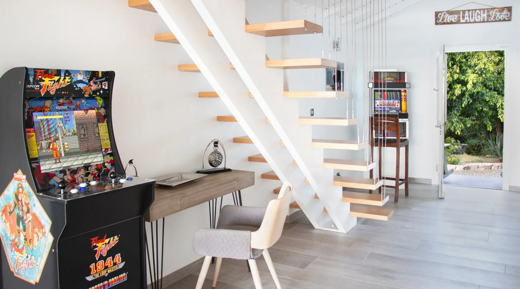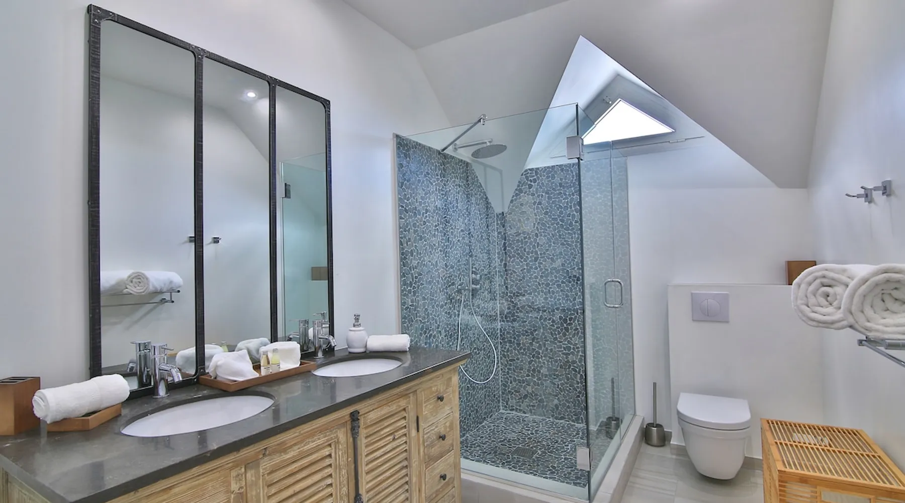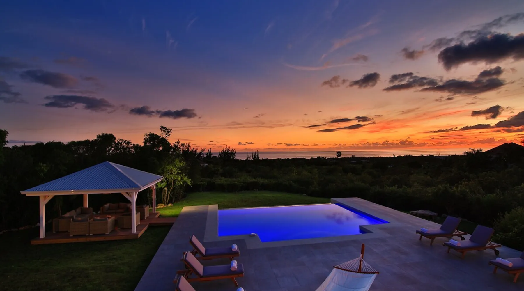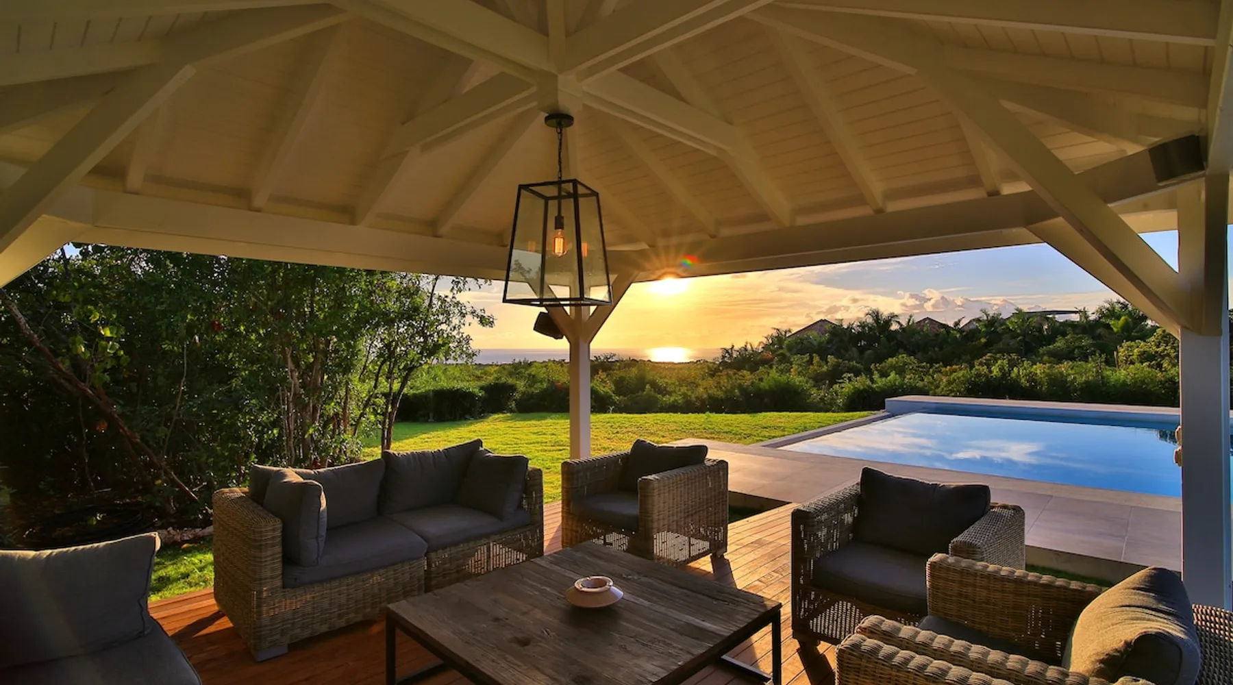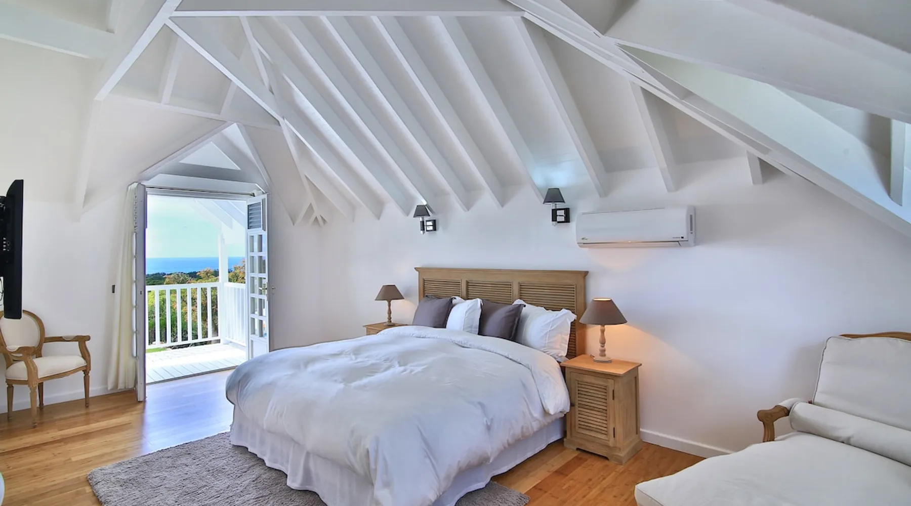 The Hamptons property, classified as one of the best residences in Sint Marteen, is located in Basses Terres. It has been recently renovated and decorated with refinement. It is composed of one villa and one cottage, which can be rented together or separately. Villa Hamptons has 4 bedrooms (sleeps 8) and 4 bathrooms The ad has just been redone, don't hesitate to ask us to send you the review! The space Concerning the Hamptons villa, each of its 4 bedrooms has a king size bed. Two of them give you direct access to the terrace and the garden, the two other rooms located upstairs offer a superb view of the Caribbean Sea. All rooms also have air conditioning, and satellite TV. The Hamptons Villa is arranged around a bar and a beautiful fully equipped kitchen. The large sliding doors will take you directly to the terrace with its overflowing swimming pool, relax on one of the lounge chairs to enjoy the sun. A spacious living room equipped with a television will allow you to be comfortably installed. As for the terrace, it is equipped with a large convivial table from where you can admire a magnificent sunset every evening. Guest access Each villa is independent, they have separate entrance doors and their own swimming pool. This ensures optimum privacy.