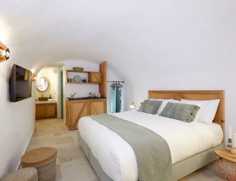The space The Cave Studio is located on the lower floor of a two-level semi-detached traditional Cycladic House, has its own entrance, a king sized bed with reading lights, A/C, Flat Screen TV with Satellite Channels, WiFi access, Kitchenette and Private bathroom with shower. Attached to its entrance you will find a private small outdoors with coffee table and chairs to enjoy your morning coffee. Other things to note The property is located inside the traditional village of Pyrgos, which is a Pedestrians area. We are located 50 meters away from the main road of Pyrgos. There are free open parking spaces nearby should you decide to come with your own vehicle. Registration number 1202747