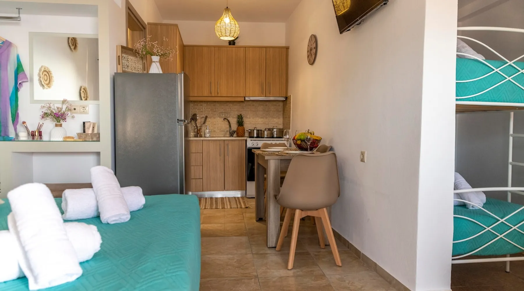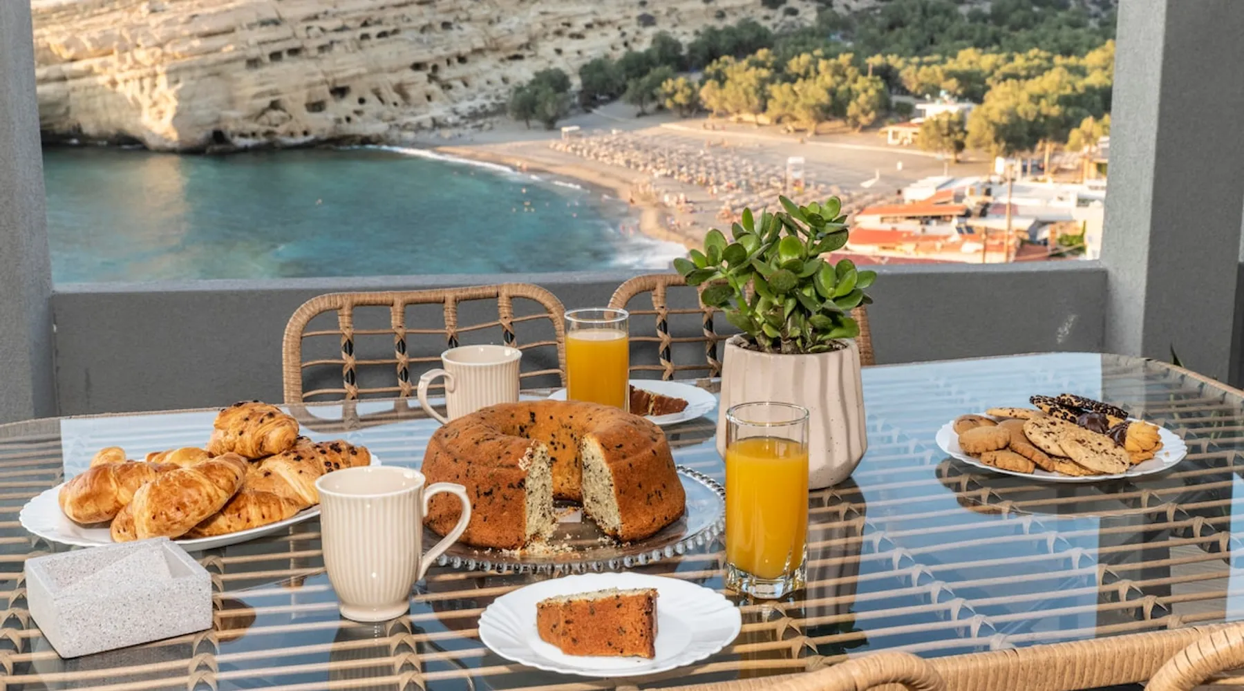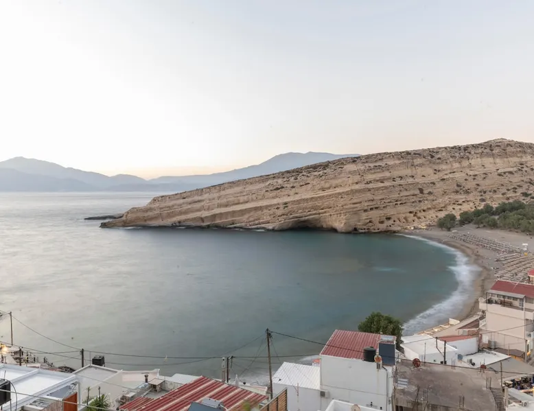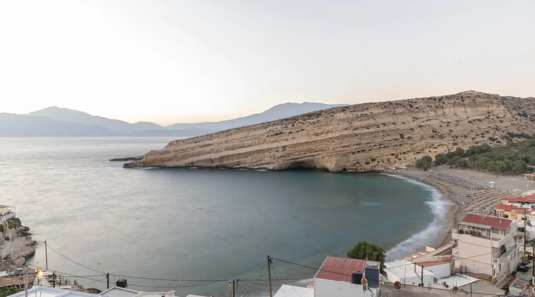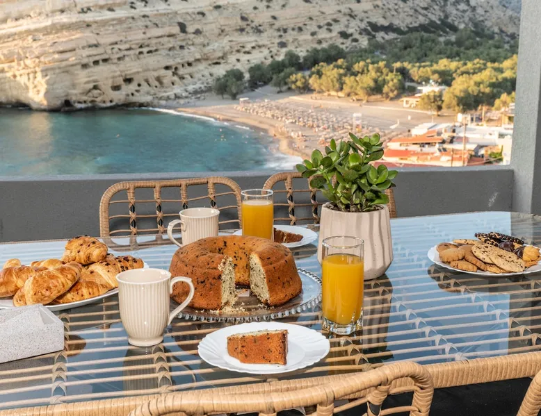 Charming apartment with amazing sea view on the hill of Matala. It is newly renovated and it has a breath taking open view to the Matala beach and the caves. It has a joined bedroom and kitchen area, a second smaller bedroom and it offers space for 4 guests. The big balcony with the open sea view directly in front of the Matala beach, invites you for breakfast, relaxing afternoons, family dinners and wonderful evenings with sunsets and a light breeze... The space Perfect for families, couples and friends who want to enjoy the Matala spirit and its unique atmosphere. Georgia Apartment can accommodate 4 people in a warm and welcoming atmosphere. The bedroom and kitchen area have an open formation and a lot of light and the breathtaking view of the Matala beach and the caves. The modern furniture, the open space and the amazing view make you feel comfortable from the first moment. The balcony invites you to eat, but also offers enough space for a game night or just an impressive sunset. There is one bedroom with 1 double bed and a second bedroom with a bunk bed. The kitchen is fully equipped. Every room has AC. The bathroom has a cabin with shower and is very modern. Georgia Apartment is the ideal place for an unforgettable stay in Matala. It is the perfect place with breathtaking view. It offers you serenity and yet it is very close to the taverns, cafes and the night life. Registration Details 00002124877
