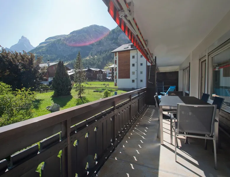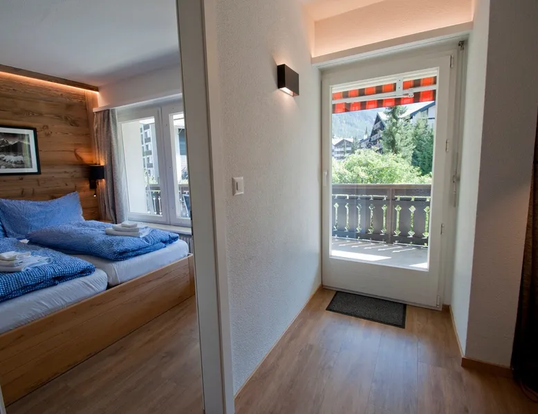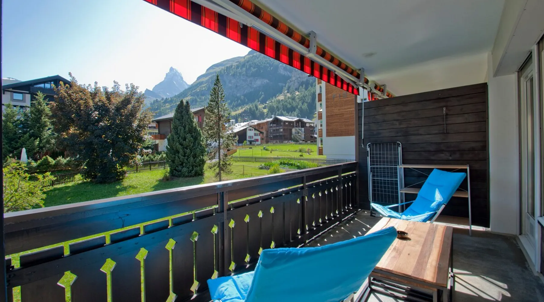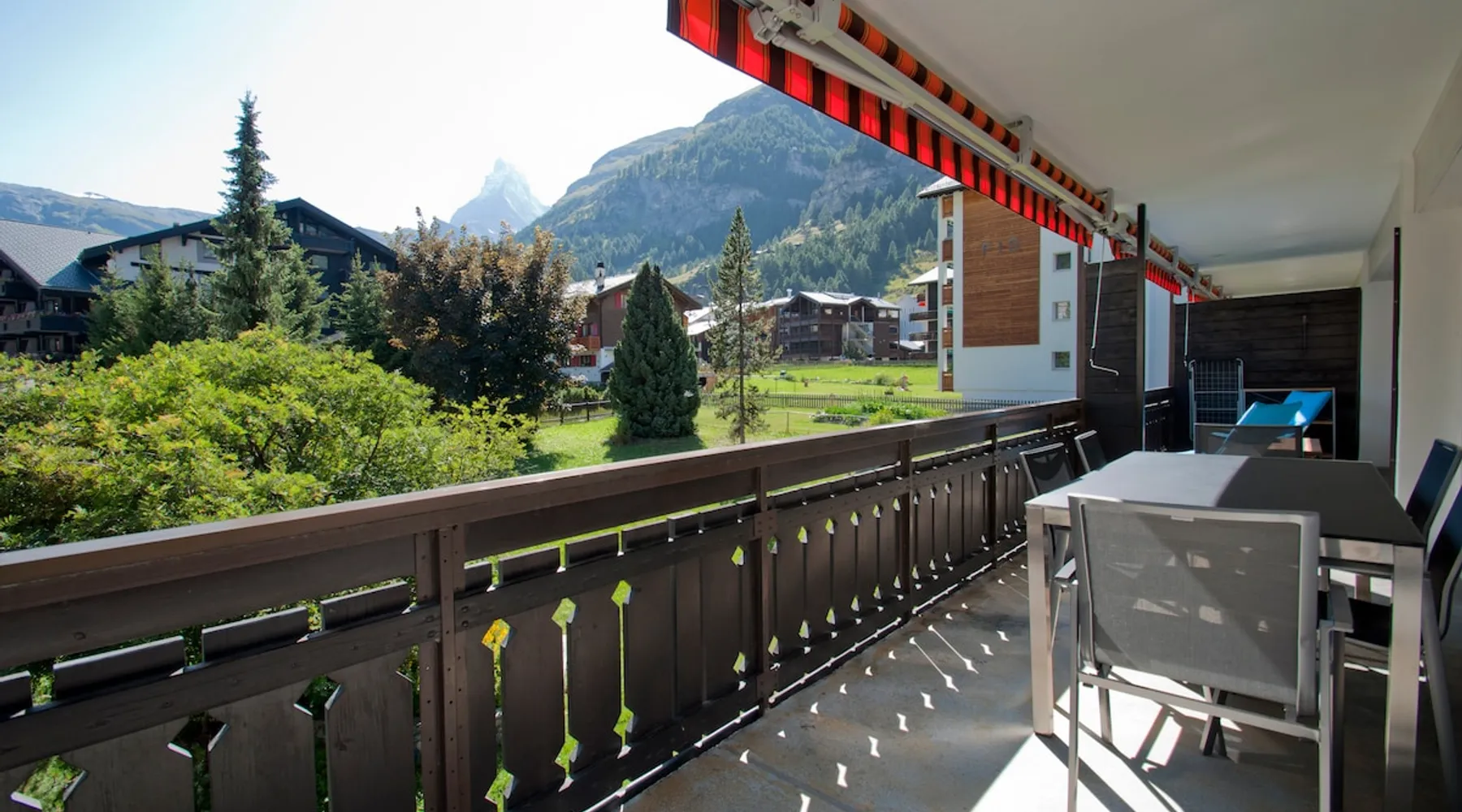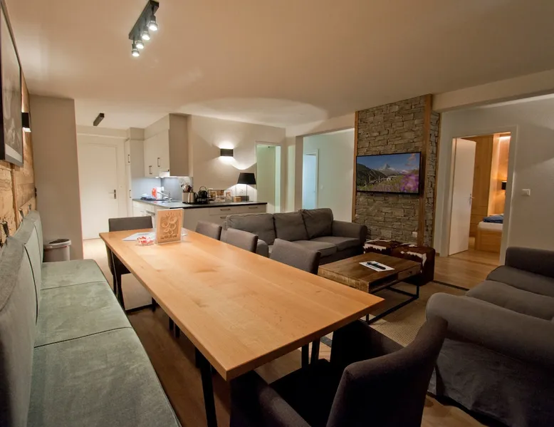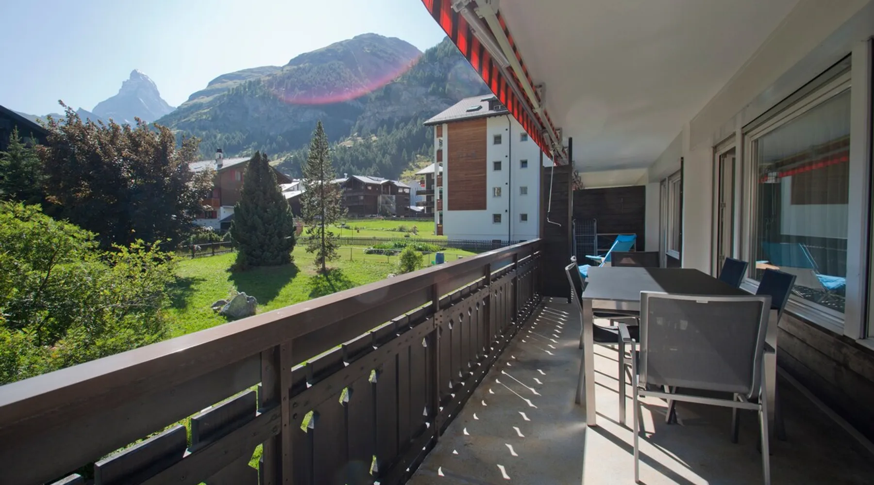 Haus Matten is located only minutes of walking away from the Sunnegga valley station, the centre of Zermatt and the shops. Apartment Breithorn is located on the first floor and has amazing views of the Matterhorn and surrounding mountains. A fantastic location for both summer and winter experiences in the mountains. The apartment is very suitable for families, and the Obere Matten playgrounds are only 5 minutes of walking away. The space This cosy yet modern furnished apartment has an open living room- and dining area, a fully equipped kitchen (dishwasher, Nespresso machine, cheese fondue-set, water kettle), and a spacious southfacing balcony with Matterhorn views. Apartment Breithorn comprises one double bedroom (180 x 200 CM), one bedroom with two bunkbeds (90 x 200 CM) and another double bedroom (180 x 200 CM). The apartment has three seperate bathrooms, with two bathrooms comprising a WC / shower each and one bathroom comprising a WC / shower/bath combination. Free WIFI, TV and a furnished balcony with Matterhorn and other mountain views. Additional amenities include: kitchen utilities provided, flat-screen TV, cot on request, elevator and shared ski room in the building. The nearest valley stations (Sunnegga and Gornergrat Railway) and the centre of Zermatt are a short 3-minute walk away from Haus Matten. There is a bus stop on your door step, which conveniently brings you to the Matterhorn Glacier Paradise valley station within 7 minutes. Guest access The guests have full private use of the apartment. Contactless check-in / check-out is available. Other things to note • Check-in from 16:00 (4:00 PM), luggage drop off is possible on request. • The rates on this website include the final cleaning, bed linen, towels, free Wi-Fi, taxi on arrival and departure, and the local tourist taxes. • Please inform us prior to your arrival if you require a baby bed and / or high chair (available for a surcharge). A baby bed is available for children up to 3 years old, and a highchair for children up to 2 years old. • Pets are not allowed. • The maximum allowed occupants is not to be exceeded unless agreed in writing prior to your arrival in Zermatt.