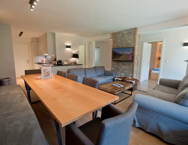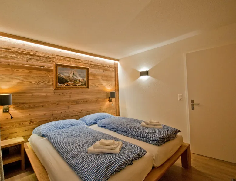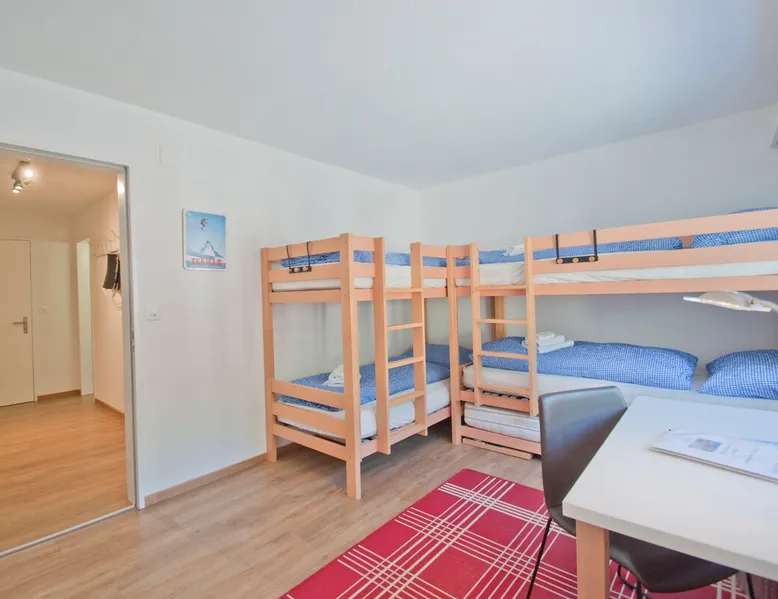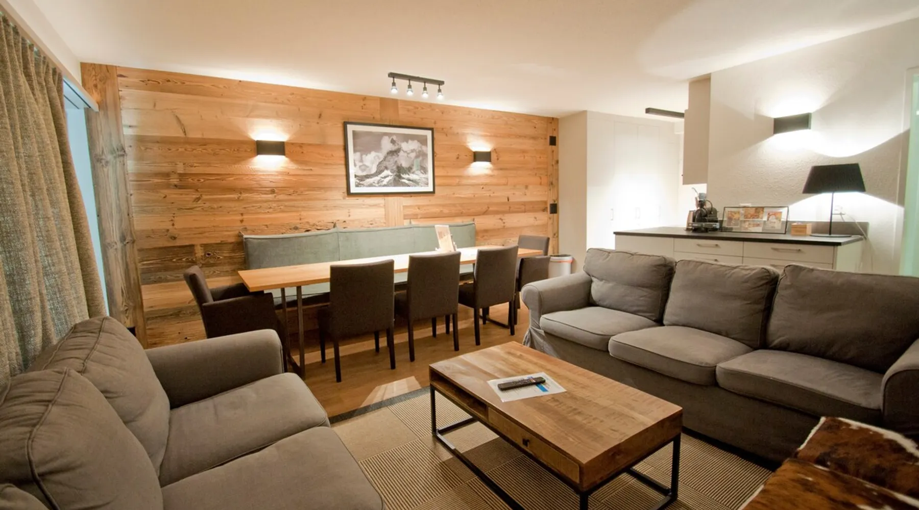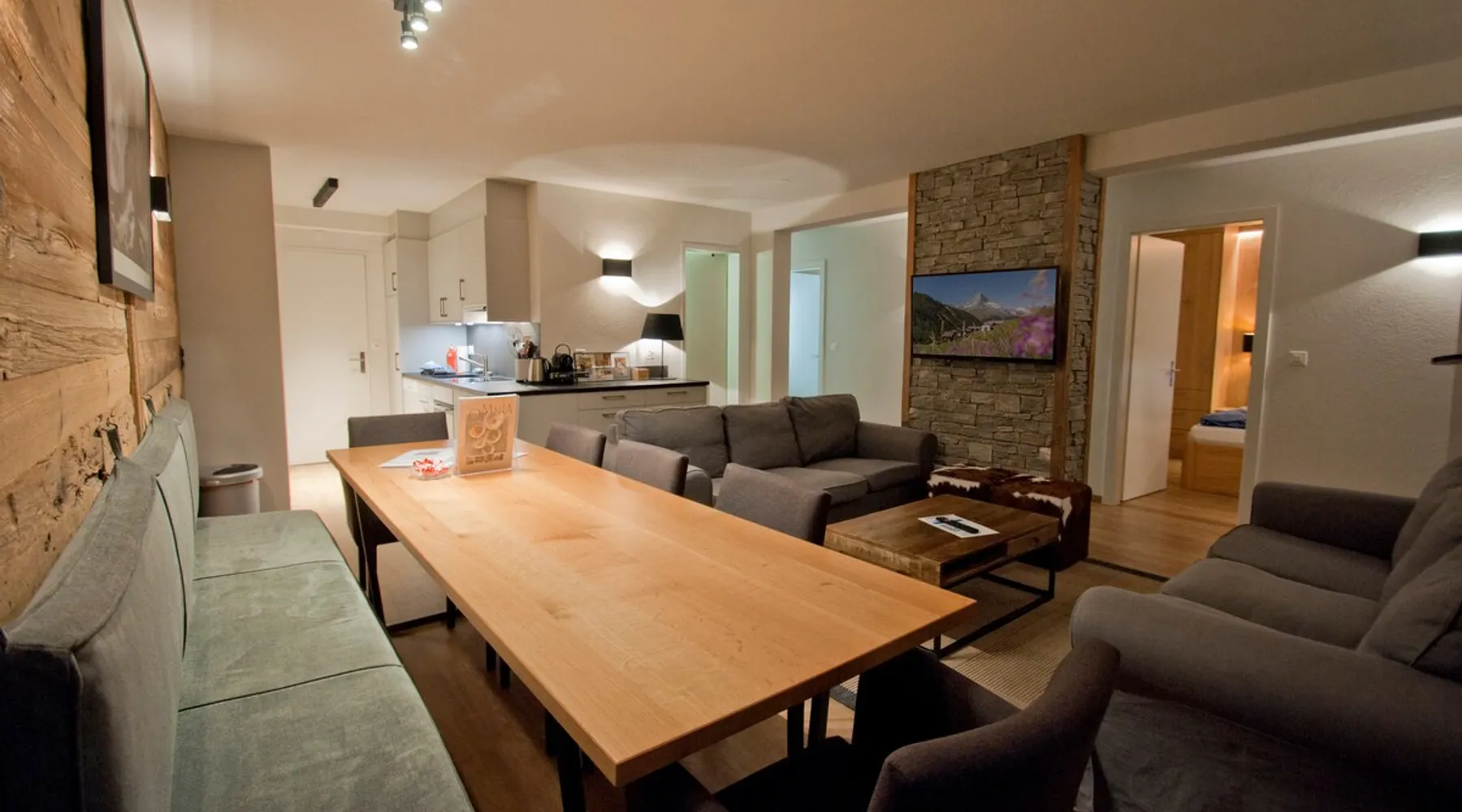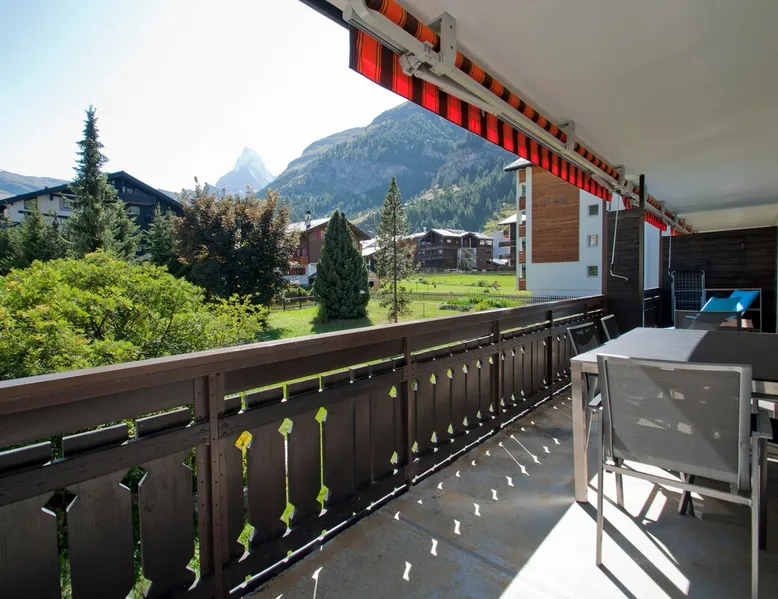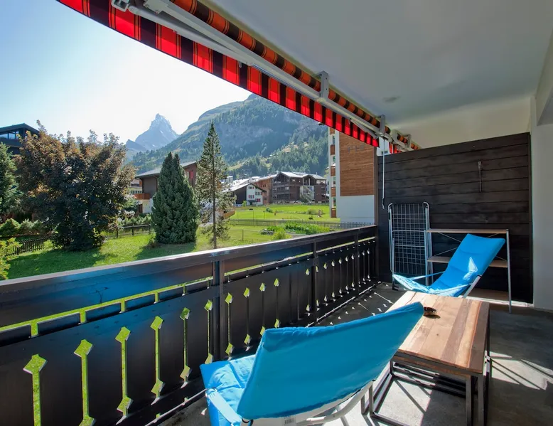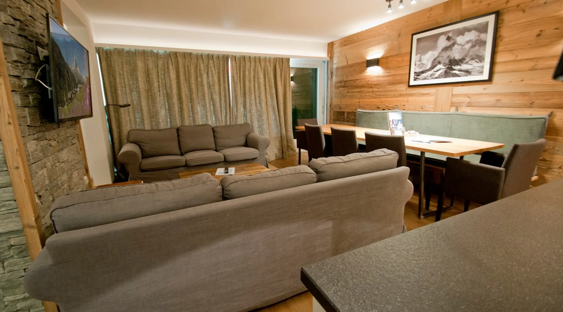 Haus Matten is located only minutes of walking away from the Sunnegga valley station, the centre of Zermatt and the shops. Apartment Breithorn is located on the first floor and has amazing views of the Matterhorn and surrounding mountains. A fantastic location for both summer and winter experiences in the mountains. The apartment is very suitable for families, and the Obere Matten playgrounds are only 5 minutes of walking away. The space This cosy yet modern furnished apartment has an open living room- and dining area, a fully equipped kitchen (dishwasher, Nespresso machine, cheese fondue-set, water kettle), and a spacious southfacing balcony with Matterhorn views. Apartment Breithorn comprises one double bedroom (180 x 200 CM), one bedroom with two bunkbeds (90 x 200 CM) and another double bedroom (180 x 200 CM). The apartment has three seperate bathrooms, with two bathrooms comprising a WC / shower each and one bathroom comprising a WC / shower/bath combination. Free WIFI, TV and a furnished balcony with Matterhorn and other mountain views. Additional amenities include: kitchen utilities provided, flat-screen TV, cot on request, elevator and shared ski room in the building. The nearest valley stations (Sunnegga and Gornergrat Railway) and the centre of Zermatt are a short 3-minute walk away from Haus Matten. There is a bus stop on your door step, which conveniently brings you to the Matterhorn Glacier Paradise valley station within 7 minutes. Guest access The guests have full private use of the apartment. Contactless check-in / check-out is available. Other things to note • Check-in from 16:00 (4:00 PM), luggage drop off is possible on request. • The rates on this website include the final cleaning, bed linen, towels, free Wi-Fi, taxi on arrival and departure, and the local tourist taxes. • Please inform us prior to your arrival if you require a baby bed and / or high chair (available for a surcharge). A baby bed is available for children up to 3 years old, and a highchair for children up to 2 years old. • Pets are not allowed. • The maximum allowed occupants is not to be exceeded unless agreed in writing prior to your arrival in Zermatt.