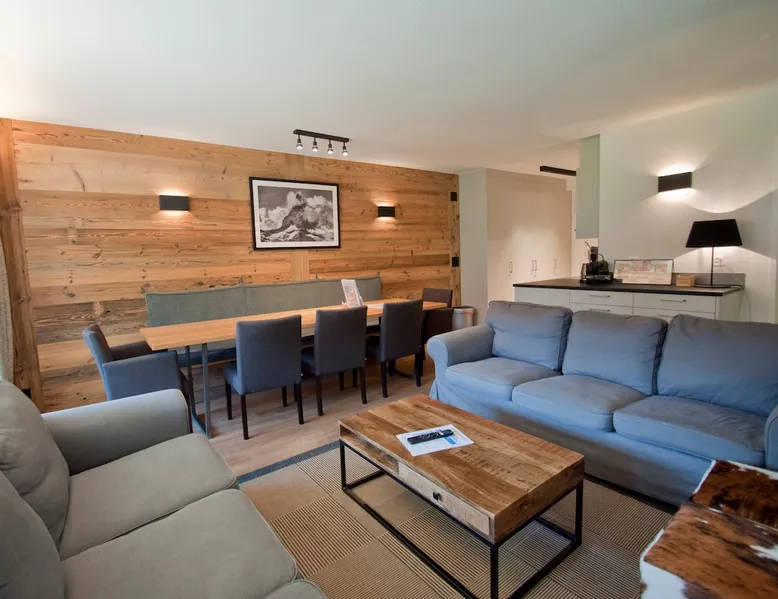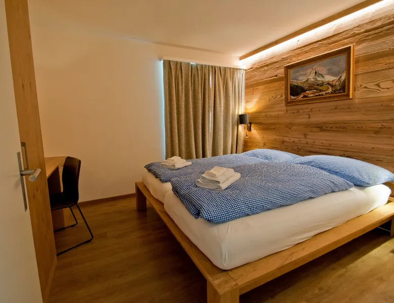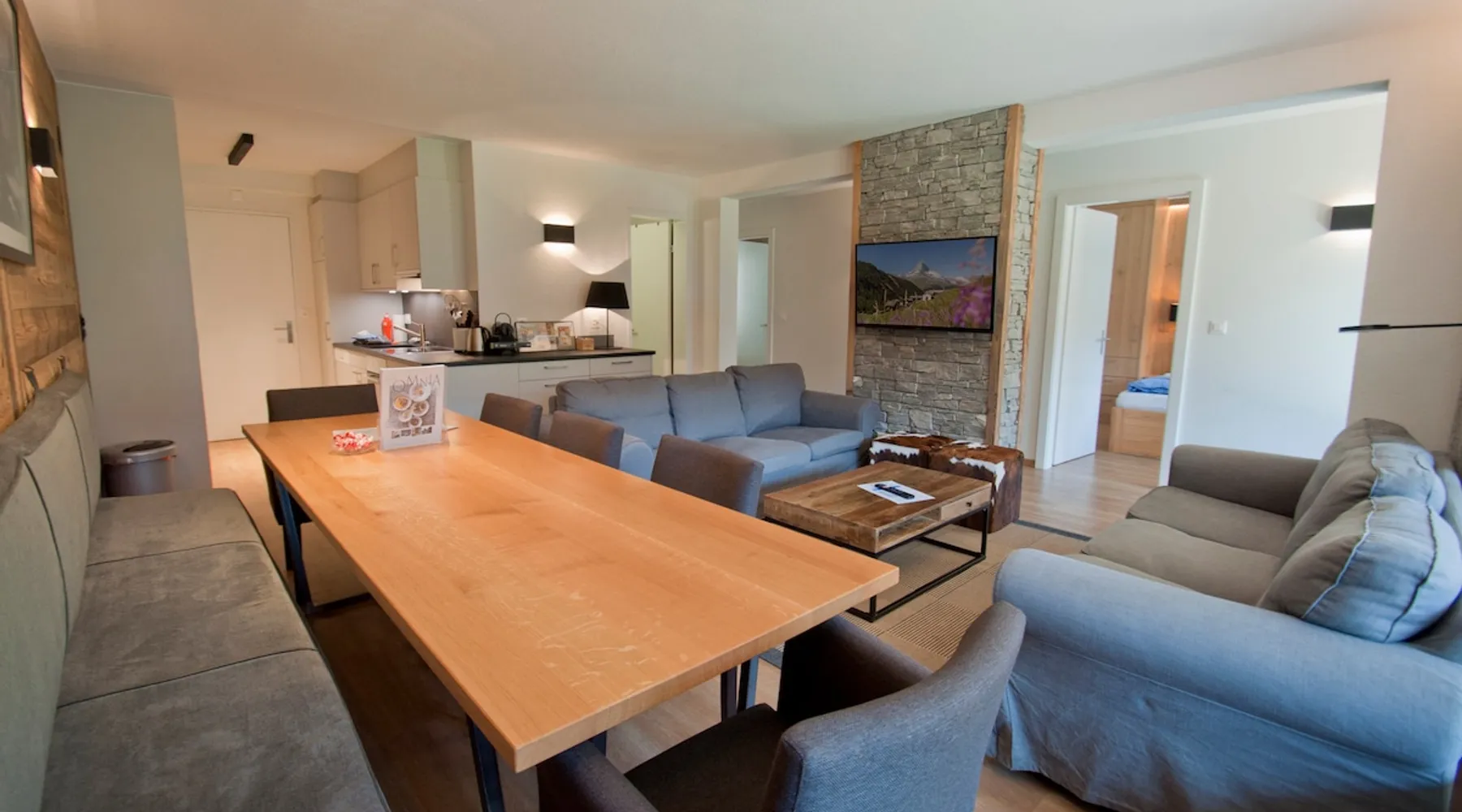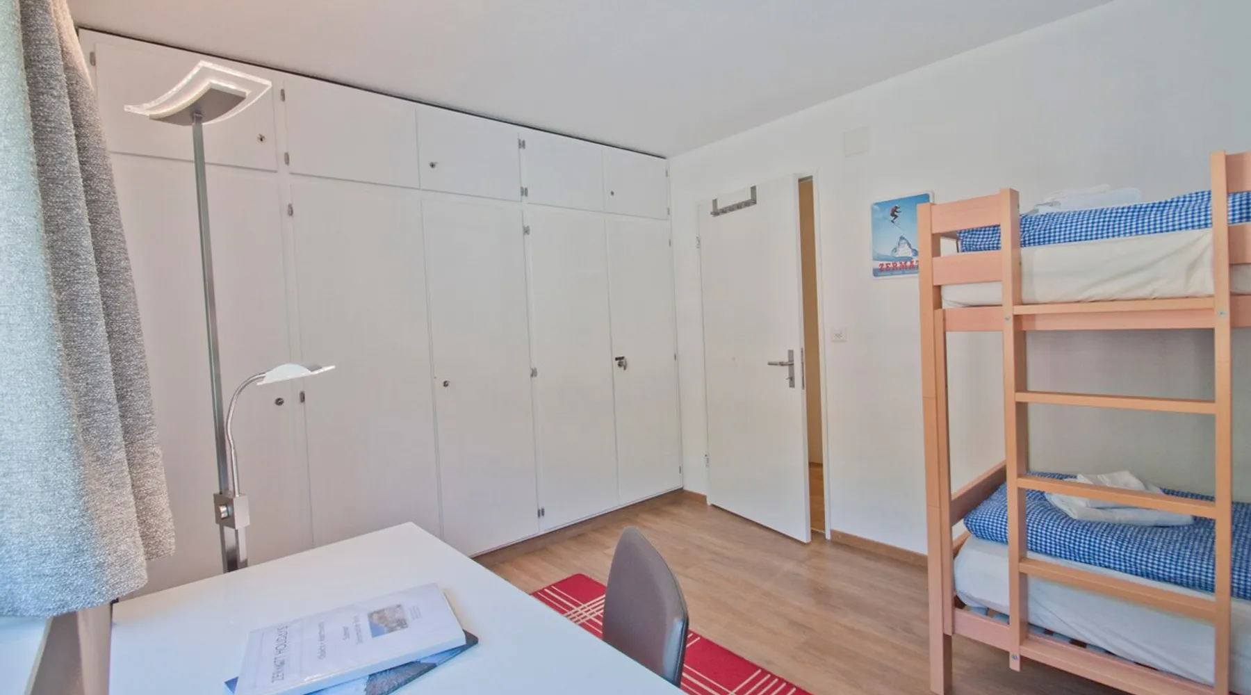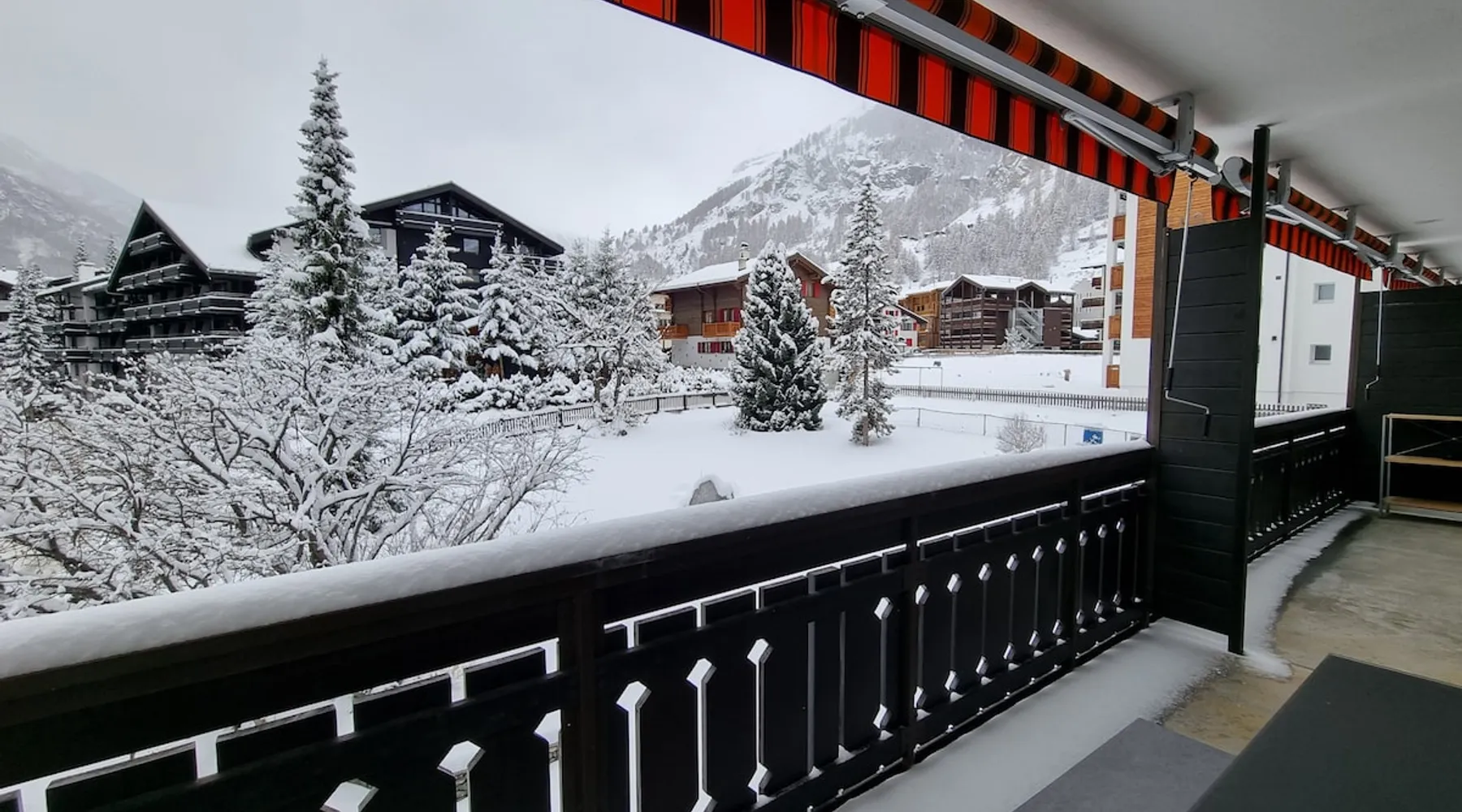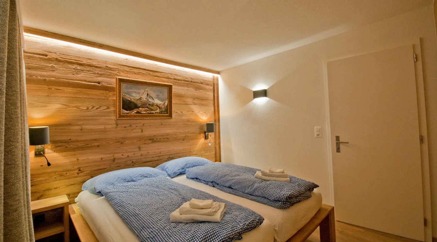 Haus Matten is located only minutes of walking away from the Sunnegga valley station, the centre of Zermatt and the shops. Apartment Breithorn is located on the first floor and has amazing views of the Matterhorn and surrounding mountains. A fantastic location for both summer and winter experiences in the mountains. The apartment is very suitable for families, and the Obere Matten playgrounds are only 5 minutes of walking away. The space This cosy yet modern furnished apartment has an open living room- and dining area, a fully equipped kitchen (dishwasher, Nespresso machine, cheese fondue-set, water kettle), and a spacious southfacing balcony with Matterhorn views. Apartment Breithorn comprises one double bedroom (180 x 200 CM), one bedroom with two bunkbeds (90 x 200 CM) and another double bedroom (180 x 200 CM). The apartment has three seperate bathrooms, with two bathrooms comprising a WC / shower each and one bathroom comprising a WC / shower/bath combination. Free WIFI, TV and a furnished balcony with Matterhorn and other mountain views. Additional amenities include: kitchen utilities provided, flat-screen TV, cot on request, elevator and shared ski room in the building. The nearest valley stations (Sunnegga and Gornergrat Railway) and the centre of Zermatt are a short 3-minute walk away from Haus Matten. There is a bus stop on your door step, which conveniently brings you to the Matterhorn Glacier Paradise valley station within 7 minutes. Guest access The guests have full private use of the apartment. Contactless check-in / check-out is available. Other things to note • Check-in from 16:00 (4:00 PM), luggage drop off is possible on request. • The rates on this website include the final cleaning, bed linen, towels, free Wi-Fi, taxi on arrival and departure, and the local tourist taxes. • Please inform us prior to your arrival if you require a baby bed and / or high chair (available for a surcharge). A baby bed is available for children up to 3 years old, and a highchair for children up to 2 years old. • Pets are not allowed. • The maximum allowed occupants is not to be exceeded unless agreed in writing prior to your arrival in Zermatt.