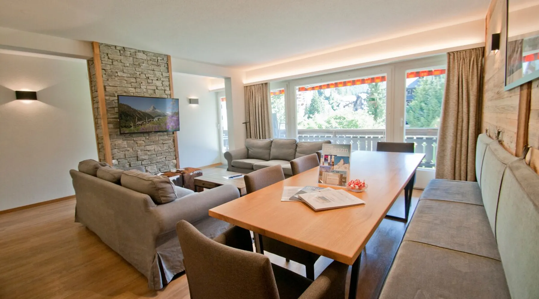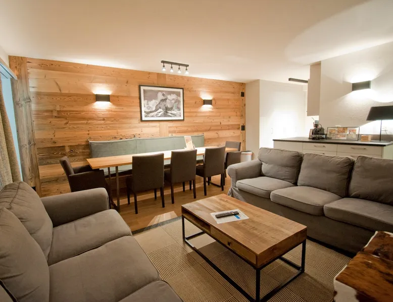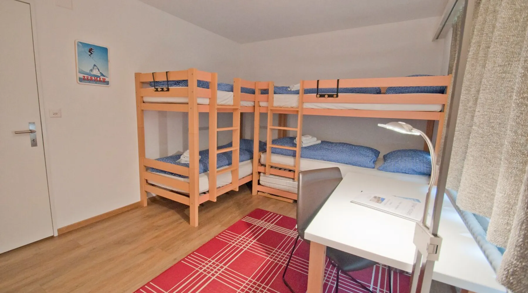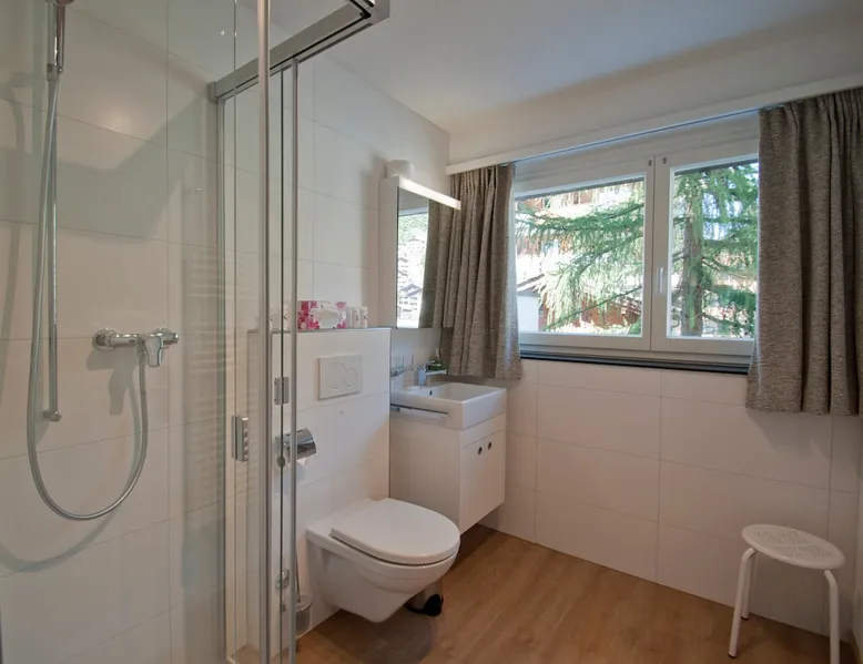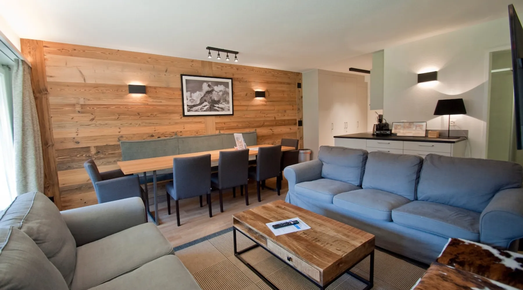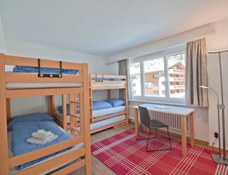 Haus Matten is located only minutes of walking away from the Sunnegga valley station, the centre of Zermatt and the shops. Apartment Breithorn is located on the first floor and has amazing views of the Matterhorn and surrounding mountains. A fantastic location for both summer and winter experiences in the mountains. The apartment is very suitable for families, and the Obere Matten playgrounds are only 5 minutes of walking away. The space This cosy yet modern furnished apartment has an open living room- and dining area, a fully equipped kitchen (dishwasher, Nespresso machine, cheese fondue-set, water kettle), and a spacious southfacing balcony with Matterhorn views. Apartment Breithorn comprises one double bedroom (180 x 200 CM), one bedroom with two bunkbeds (90 x 200 CM) and another double bedroom (180 x 200 CM). The apartment has three seperate bathrooms, with two bathrooms comprising a WC / shower each and one bathroom comprising a WC / shower/bath combination. Free WIFI, TV and a furnished balcony with Matterhorn and other mountain views. Additional amenities include: kitchen utilities provided, flat-screen TV, cot on request, elevator and shared ski room in the building. The nearest valley stations (Sunnegga and Gornergrat Railway) and the centre of Zermatt are a short 3-minute walk away from Haus Matten. There is a bus stop on your door step, which conveniently brings you to the Matterhorn Glacier Paradise valley station within 7 minutes. Guest access The guests have full private use of the apartment. Contactless check-in / check-out is available. Other things to note • Check-in from 16:00 (4:00 PM), luggage drop off is possible on request. • The rates on this website include the final cleaning, bed linen, towels, free Wi-Fi, taxi on arrival and departure, and the local tourist taxes. • Please inform us prior to your arrival if you require a baby bed and / or high chair (available for a surcharge). A baby bed is available for children up to 3 years old, and a highchair for children up to 2 years old. • Pets are not allowed. • The maximum allowed occupants is not to be exceeded unless agreed in writing prior to your arrival in Zermatt.