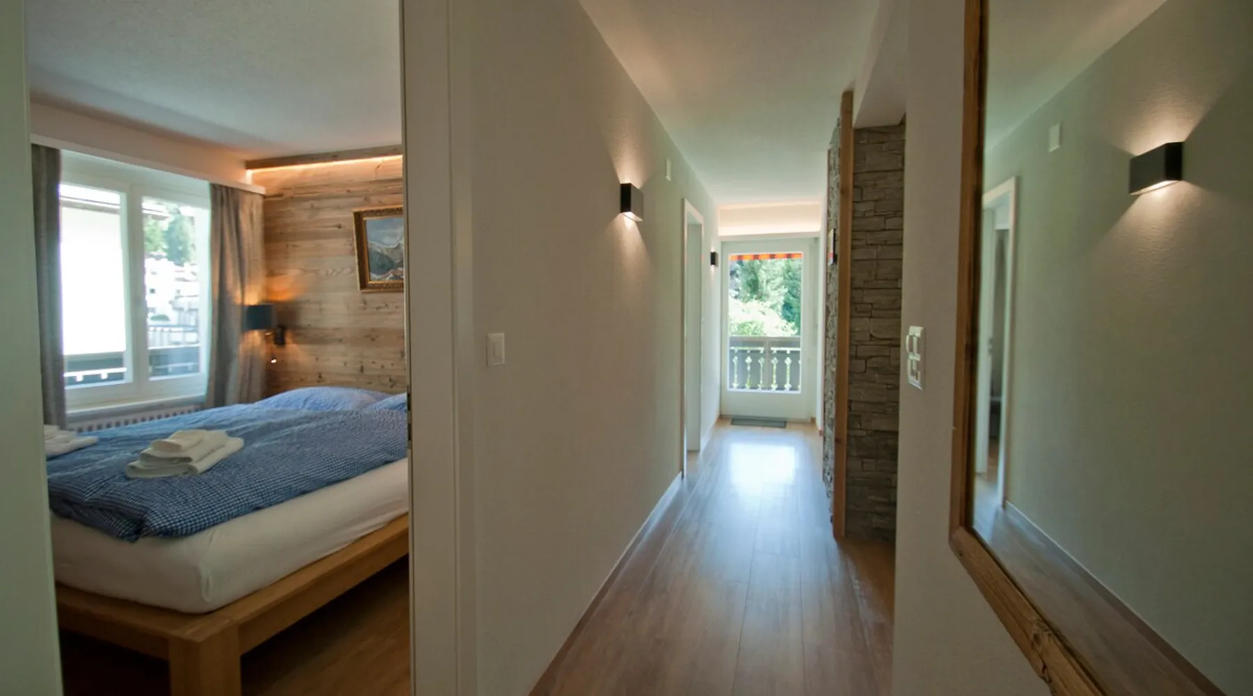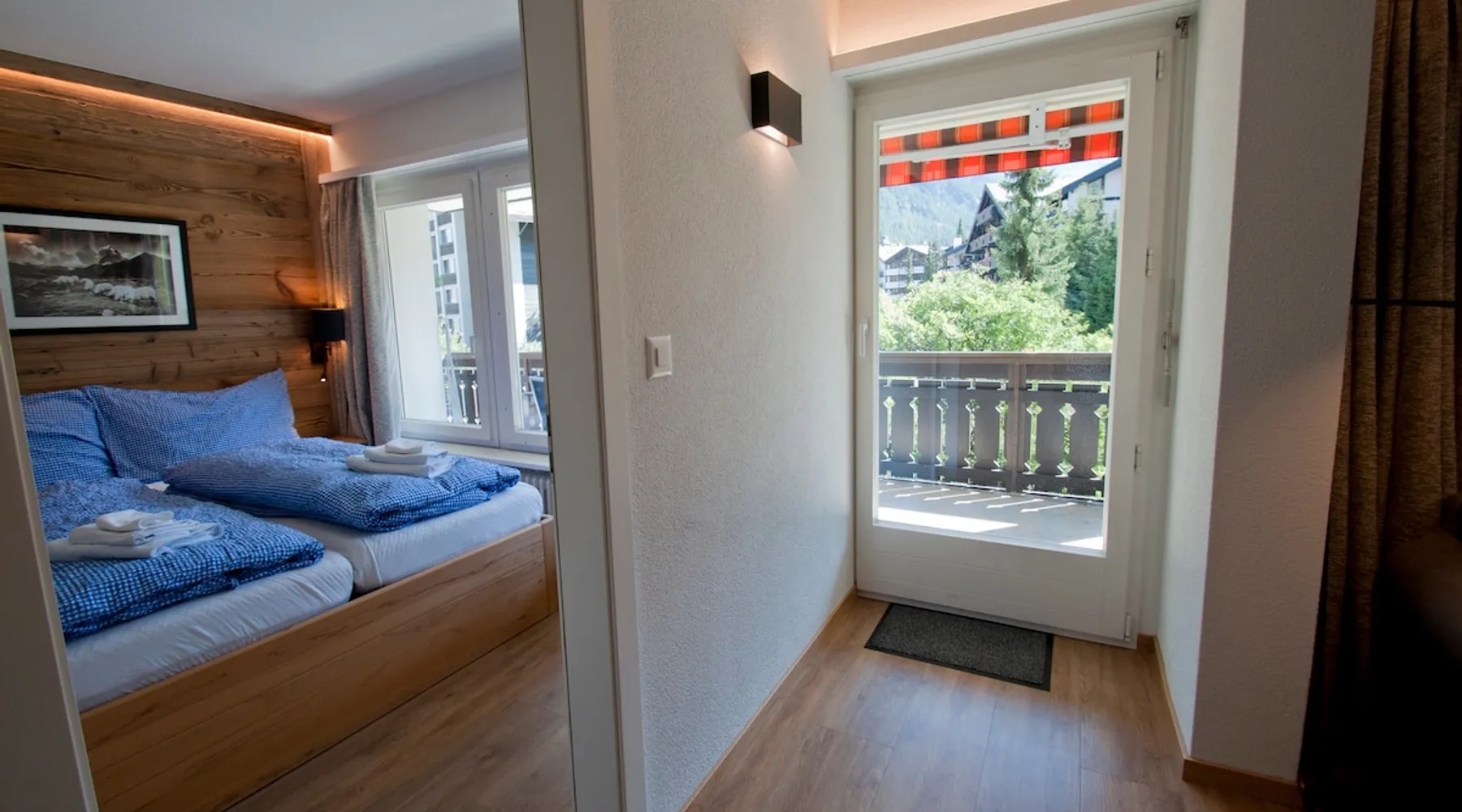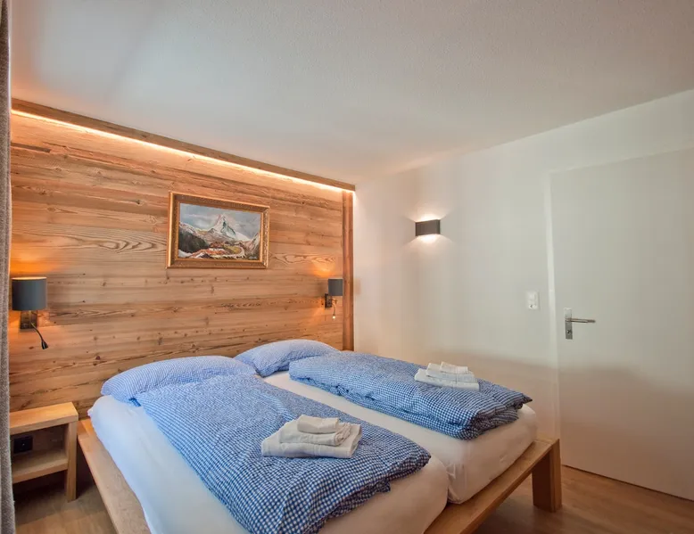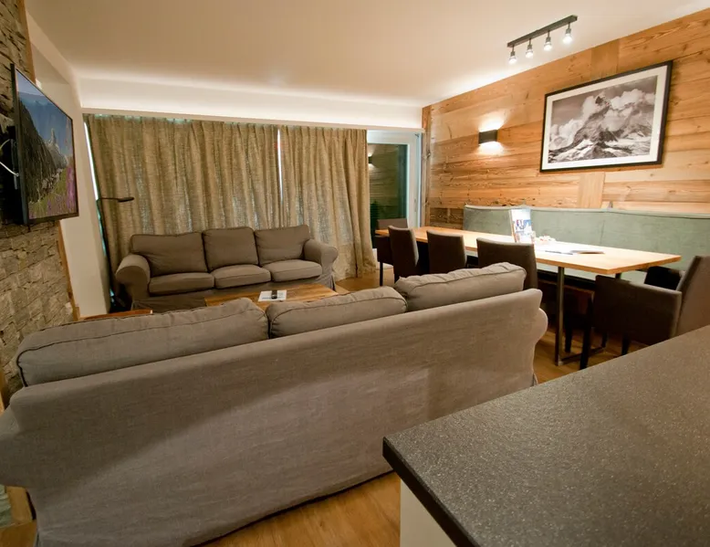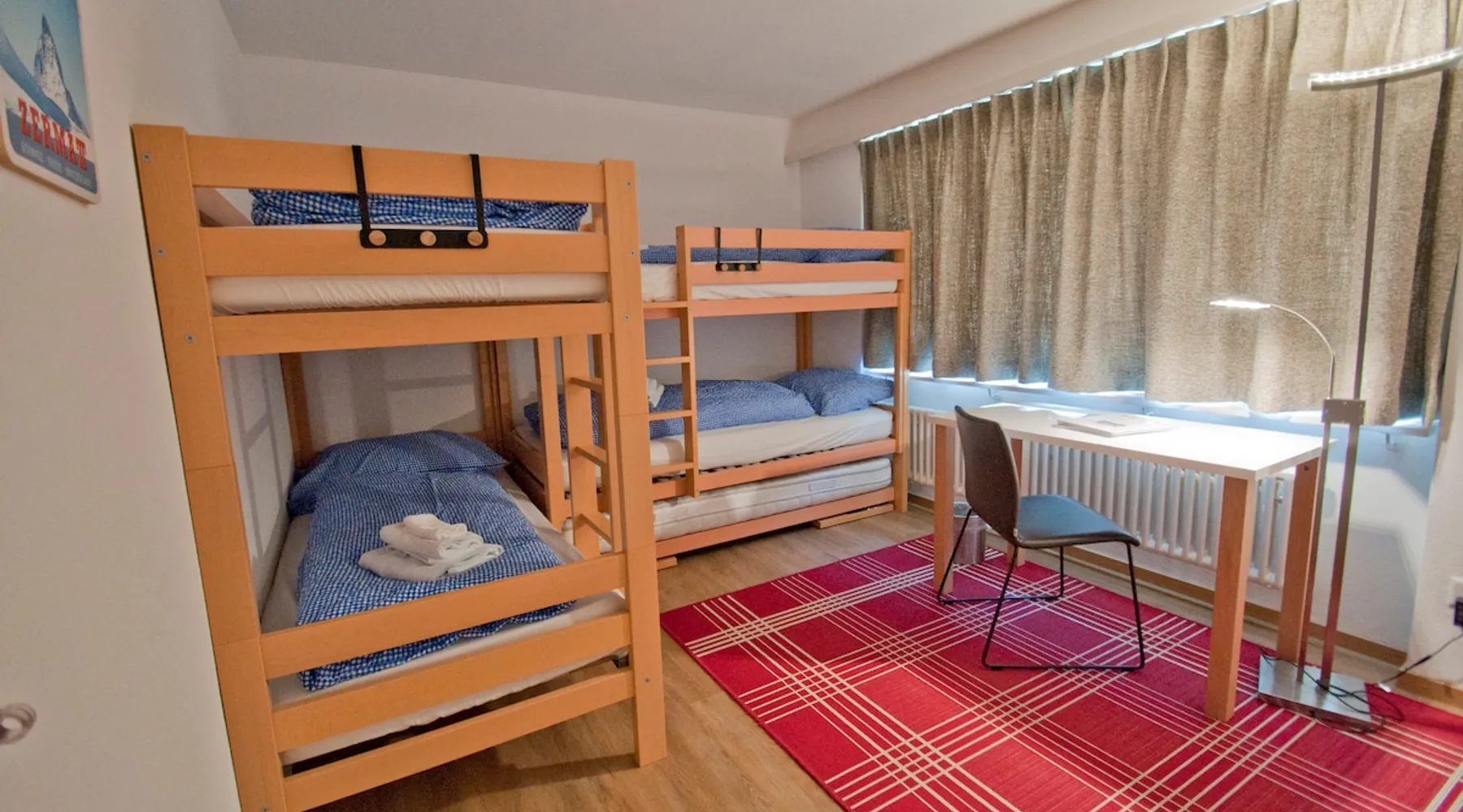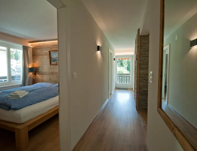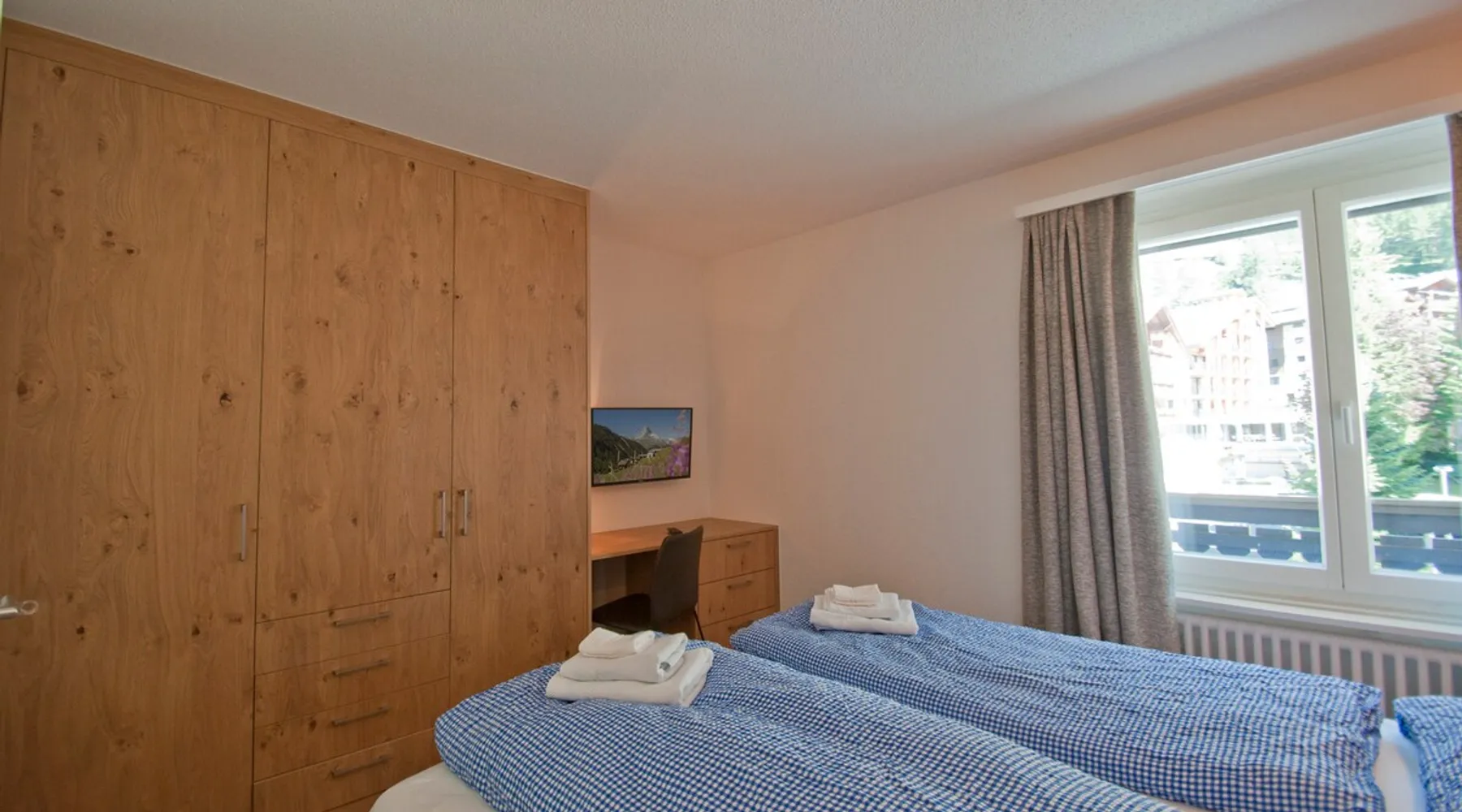 Haus Matten is located only minutes of walking away from the Sunnegga valley station, the centre of Zermatt and the shops. Apartment Breithorn is located on the first floor and has amazing views of the Matterhorn and surrounding mountains. A fantastic location for both summer and winter experiences in the mountains. The apartment is very suitable for families, and the Obere Matten playgrounds are only 5 minutes of walking away. The space This cosy yet modern furnished apartment has an open living room- and dining area, a fully equipped kitchen (dishwasher, Nespresso machine, cheese fondue-set, water kettle), and a spacious southfacing balcony with Matterhorn views. Apartment Breithorn comprises one double bedroom (180 x 200 CM), one bedroom with two bunkbeds (90 x 200 CM) and another double bedroom (180 x 200 CM). The apartment has three seperate bathrooms, with two bathrooms comprising a WC / shower each and one bathroom comprising a WC / shower/bath combination. Free WIFI, TV and a furnished balcony with Matterhorn and other mountain views. Additional amenities include: kitchen utilities provided, flat-screen TV, cot on request, elevator and shared ski room in the building. The nearest valley stations (Sunnegga and Gornergrat Railway) and the centre of Zermatt are a short 3-minute walk away from Haus Matten. There is a bus stop on your door step, which conveniently brings you to the Matterhorn Glacier Paradise valley station within 7 minutes. Guest access The guests have full private use of the apartment. Contactless check-in / check-out is available. Other things to note • Check-in from 16:00 (4:00 PM), luggage drop off is possible on request. • The rates on this website include the final cleaning, bed linen, towels, free Wi-Fi, taxi on arrival and departure, and the local tourist taxes. • Please inform us prior to your arrival if you require a baby bed and / or high chair (available for a surcharge). A baby bed is available for children up to 3 years old, and a highchair for children up to 2 years old. • Pets are not allowed. • The maximum allowed occupants is not to be exceeded unless agreed in writing prior to your arrival in Zermatt.