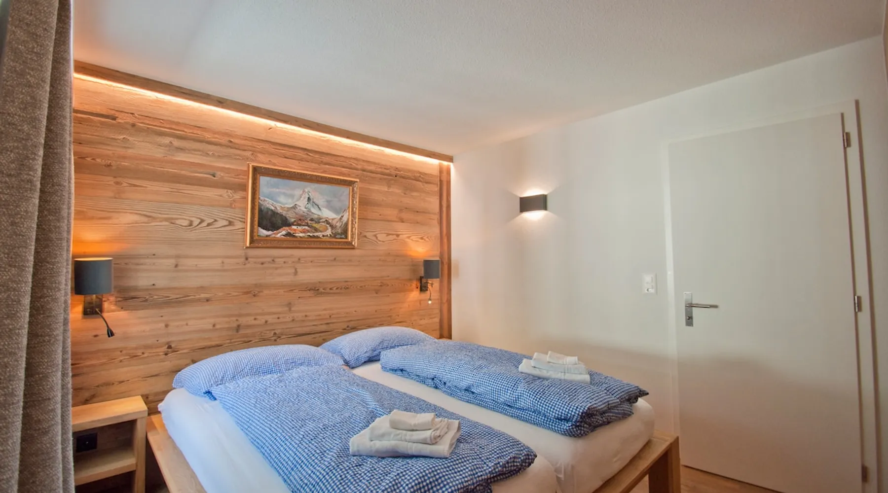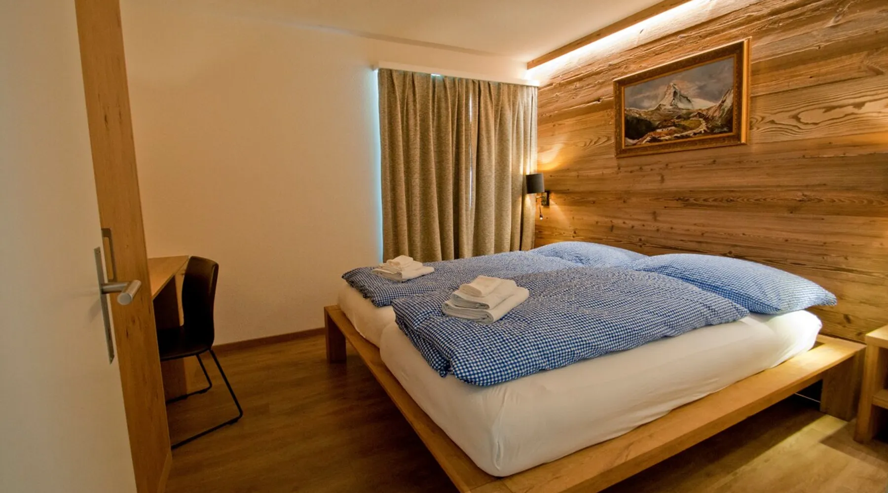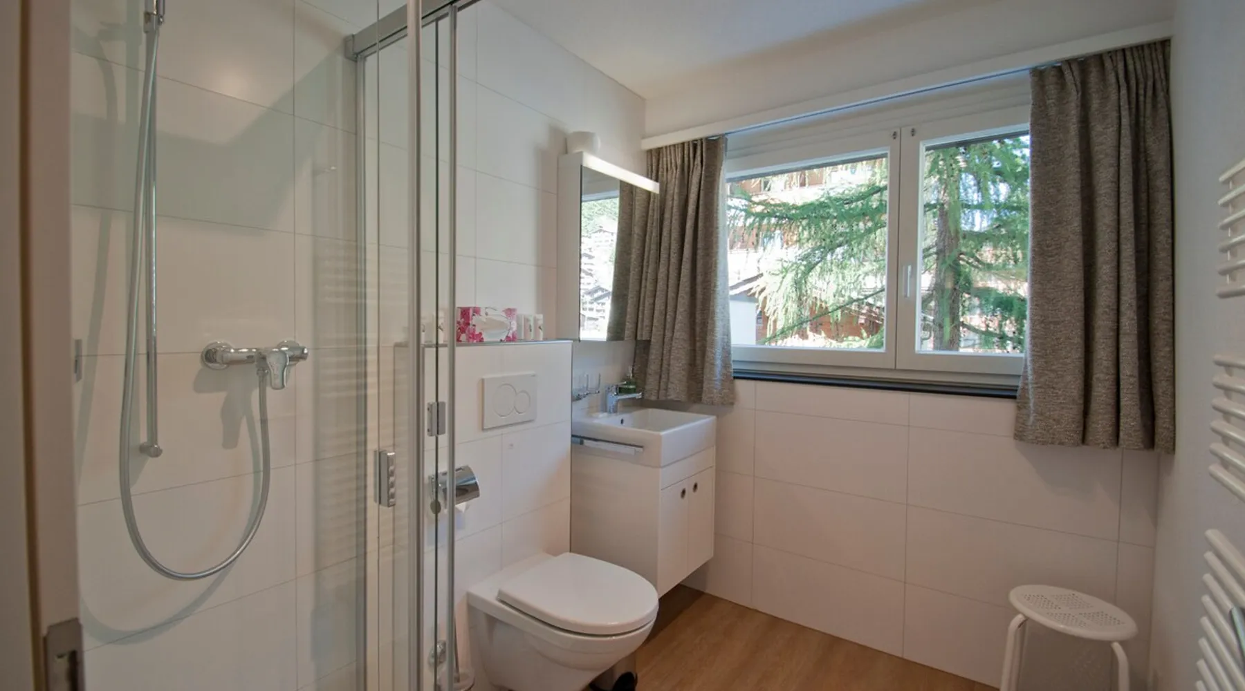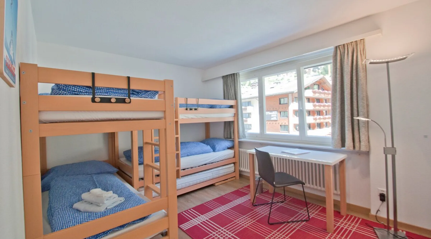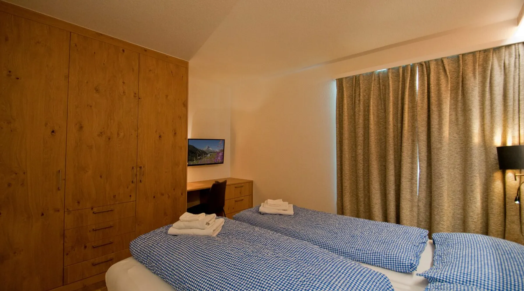 Haus Matten is located only minutes of walking away from the Sunnegga valley station, the centre of Zermatt and the shops. Apartment Breithorn is located on the first floor and has amazing views of the Matterhorn and surrounding mountains. A fantastic location for both summer and winter experiences in the mountains. The apartment is very suitable for families, and the Obere Matten playgrounds are only 5 minutes of walking away. The space This cosy yet modern furnished apartment has an open living room- and dining area, a fully equipped kitchen (dishwasher, Nespresso machine, cheese fondue-set, water kettle), and a spacious southfacing balcony with Matterhorn views. Apartment Breithorn comprises one double bedroom (180 x 200 CM), one bedroom with two bunkbeds (90 x 200 CM) and another double bedroom (180 x 200 CM). The apartment has three seperate bathrooms, with two bathrooms comprising a WC / shower each and one bathroom comprising a WC / shower/bath combination. Free WIFI, TV and a furnished balcony with Matterhorn and other mountain views. Additional amenities include: kitchen utilities provided, flat-screen TV, cot on request, elevator and shared ski room in the building. The nearest valley stations (Sunnegga and Gornergrat Railway) and the centre of Zermatt are a short 3-minute walk away from Haus Matten. There is a bus stop on your door step, which conveniently brings you to the Matterhorn Glacier Paradise valley station within 7 minutes. Guest access The guests have full private use of the apartment. Contactless check-in / check-out is available. Other things to note • Check-in from 16:00 (4:00 PM), luggage drop off is possible on request. • The rates on this website include the final cleaning, bed linen, towels, free Wi-Fi, taxi on arrival and departure, and the local tourist taxes. • Please inform us prior to your arrival if you require a baby bed and / or high chair (available for a surcharge). A baby bed is available for children up to 3 years old, and a highchair for children up to 2 years old. • Pets are not allowed. • The maximum allowed occupants is not to be exceeded unless agreed in writing prior to your arrival in Zermatt.