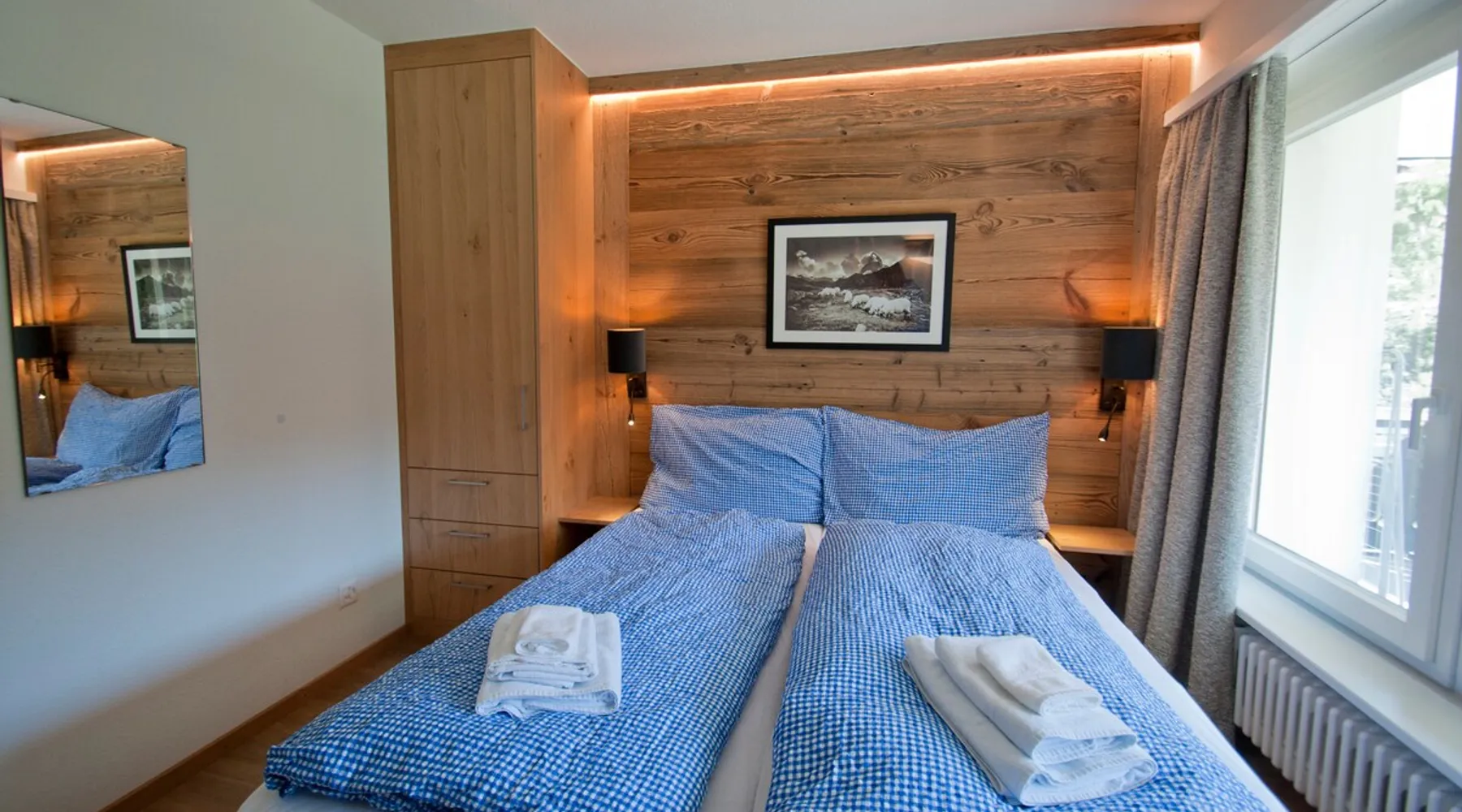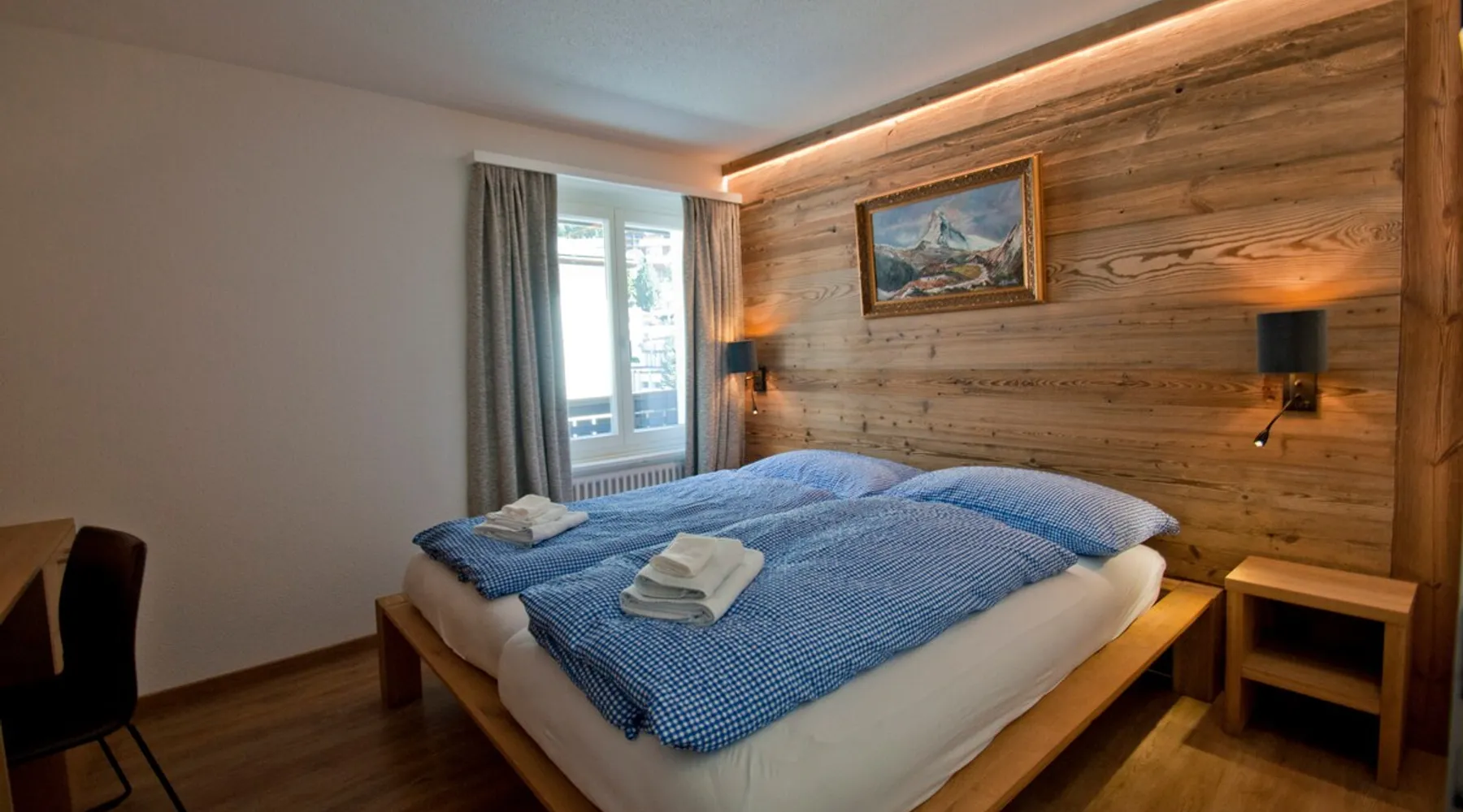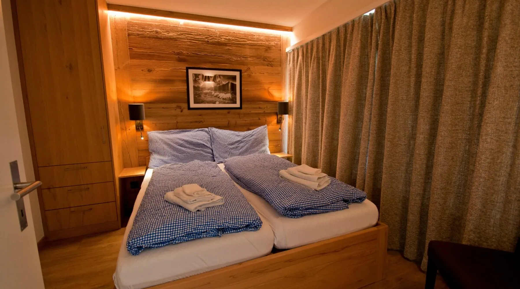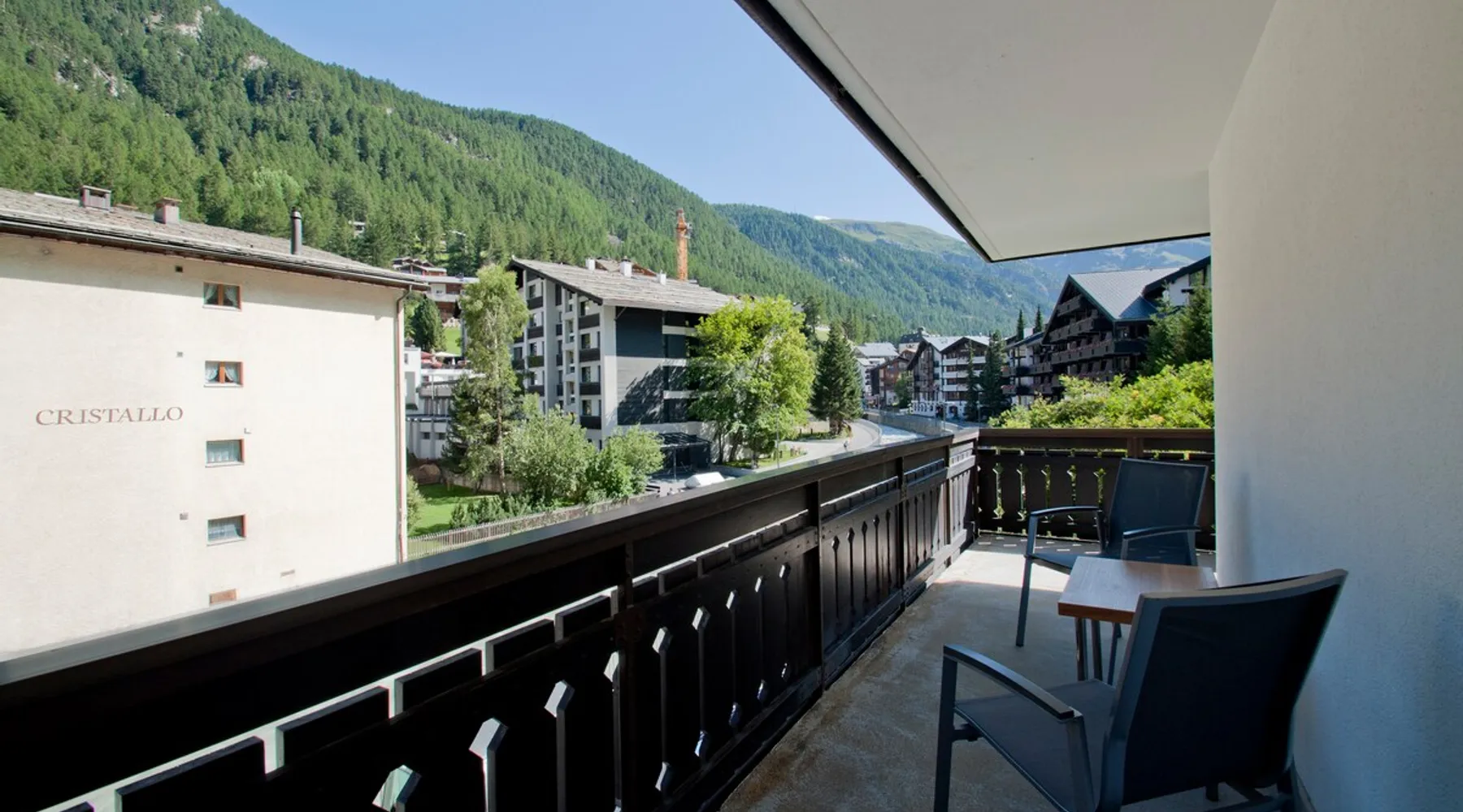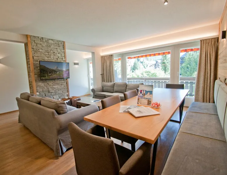 Haus Matten is located only minutes of walking away from the Sunnegga valley station, the centre of Zermatt and the shops. Apartment Breithorn is located on the first floor and has amazing views of the Matterhorn and surrounding mountains. A fantastic location for both summer and winter experiences in the mountains. The apartment is very suitable for families, and the Obere Matten playgrounds are only 5 minutes of walking away. The space This cosy yet modern furnished apartment has an open living room- and dining area, a fully equipped kitchen (dishwasher, Nespresso machine, cheese fondue-set, water kettle), and a spacious southfacing balcony with Matterhorn views. Apartment Breithorn comprises one double bedroom (180 x 200 CM), one bedroom with two bunkbeds (90 x 200 CM) and another double bedroom (180 x 200 CM). The apartment has three seperate bathrooms, with two bathrooms comprising a WC / shower each and one bathroom comprising a WC / shower/bath combination. Free WIFI, TV and a furnished balcony with Matterhorn and other mountain views. Additional amenities include: kitchen utilities provided, flat-screen TV, cot on request, elevator and shared ski room in the building. The nearest valley stations (Sunnegga and Gornergrat Railway) and the centre of Zermatt are a short 3-minute walk away from Haus Matten. There is a bus stop on your door step, which conveniently brings you to the Matterhorn Glacier Paradise valley station within 7 minutes. Guest access The guests have full private use of the apartment. Contactless check-in / check-out is available. Other things to note • Check-in from 16:00 (4:00 PM), luggage drop off is possible on request. • The rates on this website include the final cleaning, bed linen, towels, free Wi-Fi, taxi on arrival and departure, and the local tourist taxes. • Please inform us prior to your arrival if you require a baby bed and / or high chair (available for a surcharge). A baby bed is available for children up to 3 years old, and a highchair for children up to 2 years old. • Pets are not allowed. • The maximum allowed occupants is not to be exceeded unless agreed in writing prior to your arrival in Zermatt.