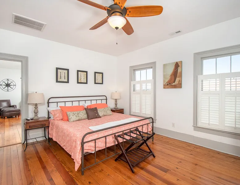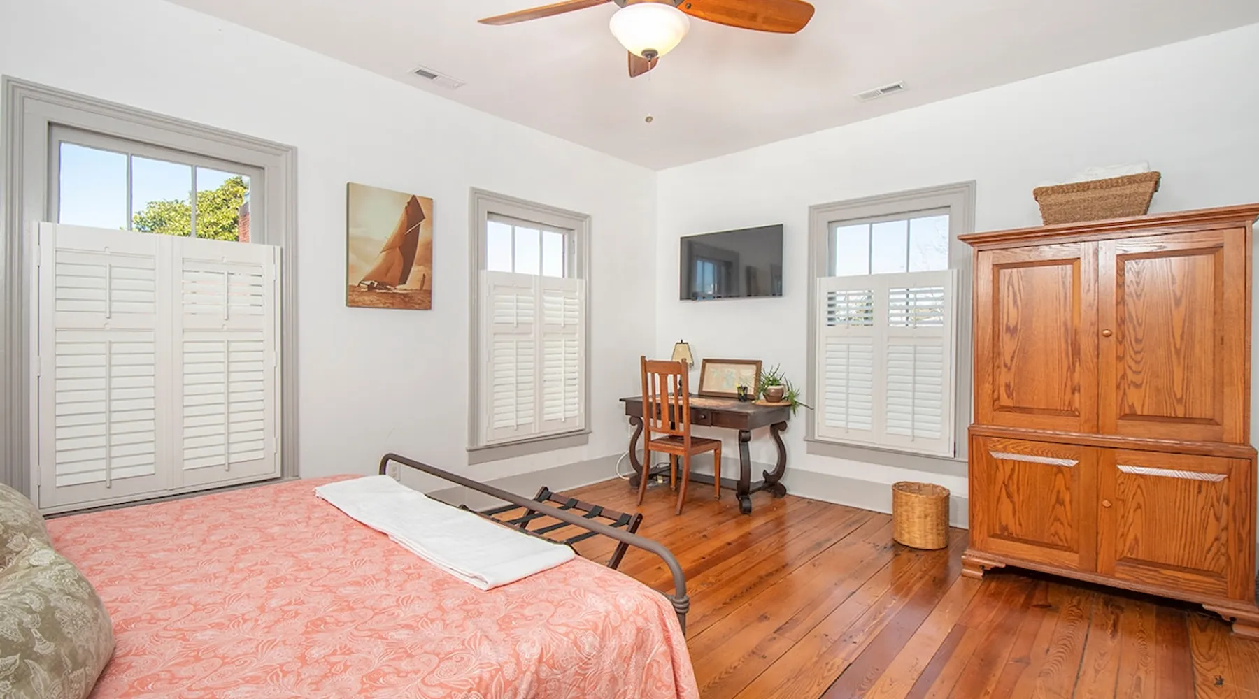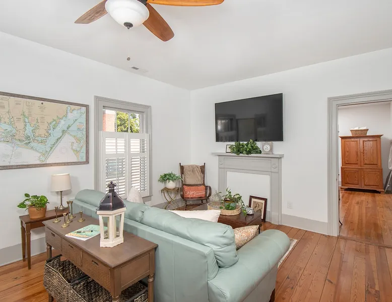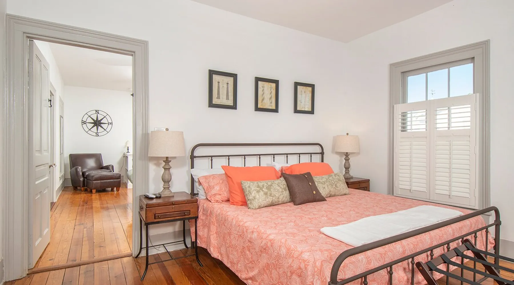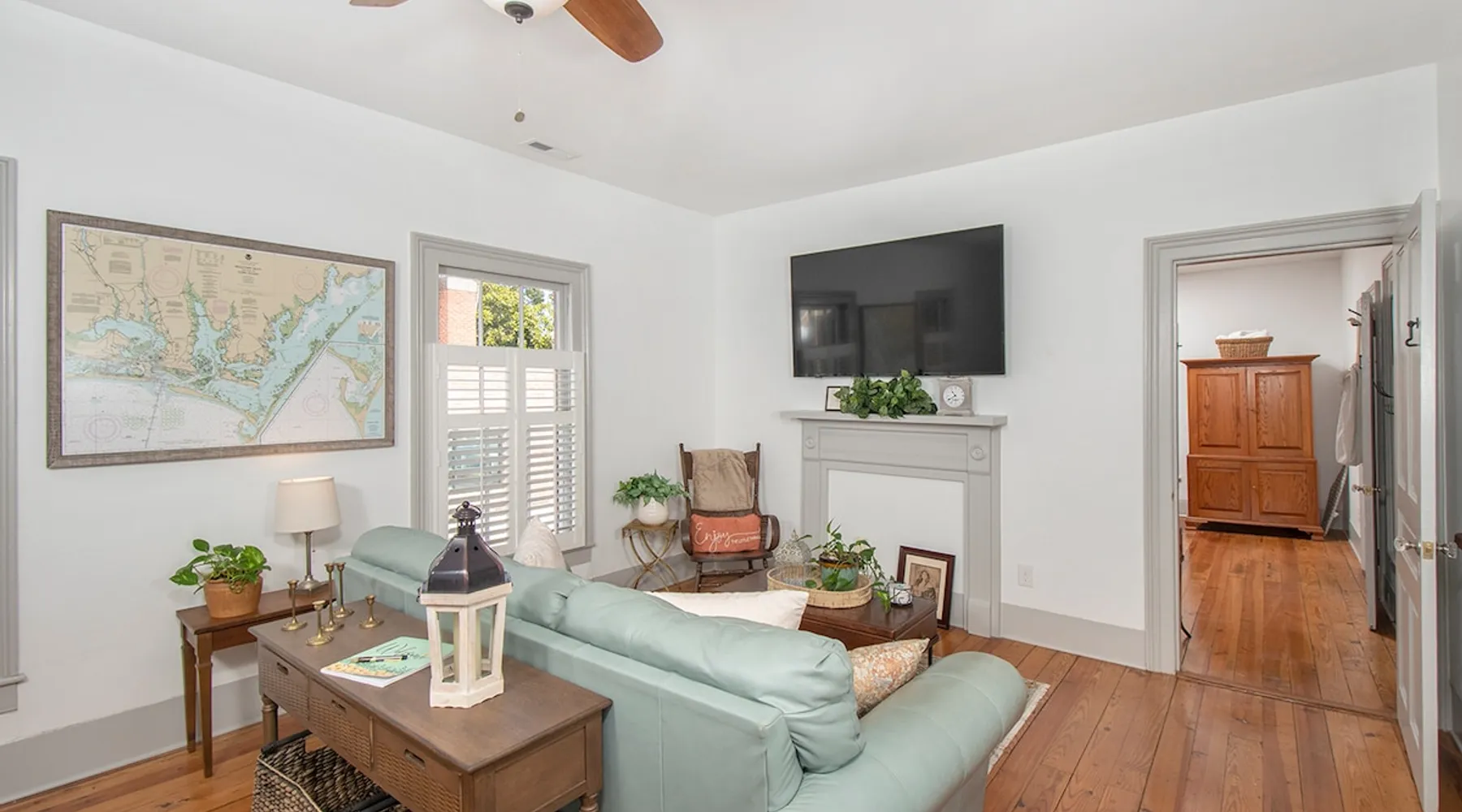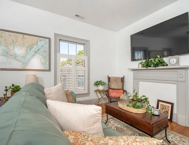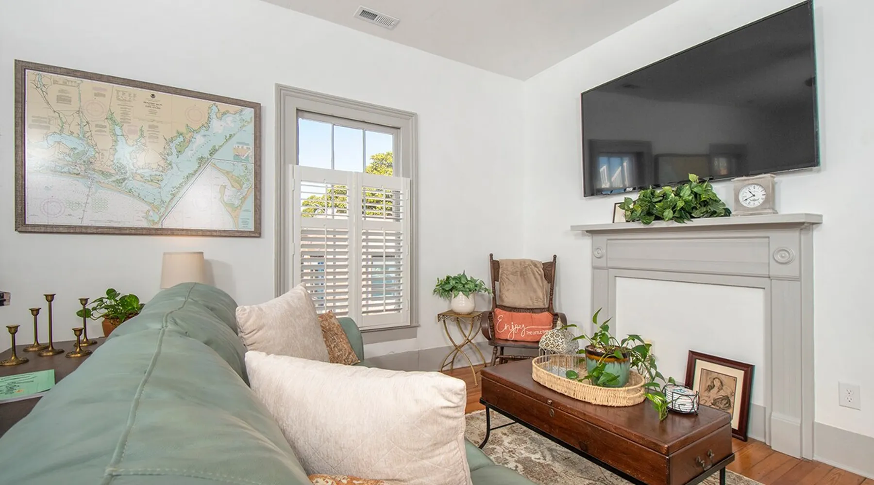Welcome to Nymphe de Mer (Sea Nymph). One of 2 spacious suites in the recently restored Angels Share Inn: A boutique hotel located in the National Register Beaufort Historic District on Front Street, across the street from Beaufort Docks and waterfront, where yachts from all over the world come and go. Steps to Restaurants, Bars, and shops. Book a ferry at Beaufort Docks to local island beaches and Cape Lookout Lighthouse. Enjoy coffee in a rocker on the front porch and watch the world go by. The space Each suite is completely separate; with private entrance, kitchen, living room, dining space, king bedroom, and bathroom with large walk-in shower. 760+ square foot suite NO CLEANING FEES A large fully equipped kitchen with dishwasher, induction range cooktop, microwave and toaster oven. A Coffee Maker, Compatible with K-Cup Pods or Combo, Single Serve & Full Pot. Spacious private living room area with book cases and games. Separate bedroom with King size bed, desk and armoire. Private en-suite bath with large walk-in rain shower Free off street parking for one vehicle. Each suite is completely separate; with private entrance, kitchen, living room, dining space, king bedroom, and bathroom with large walk-in shower. Spacious 600+ square foot suite Private fully equipped kitchenette and living room both with Front Street Water View Separate bedroom with King size bed. En-suite bath with large walk-in rain shower Free off street parking for one vehicle. Beaufort Spirit Doubloons are included. The Doubloons can be used at any of the businesses on site which include the Angel's Share Cafe, Beaufort Spirits Company inside and out back at Tapping the Admiral Bar. Enjoy a coffee or drink on our deck, the front porch or in your room.