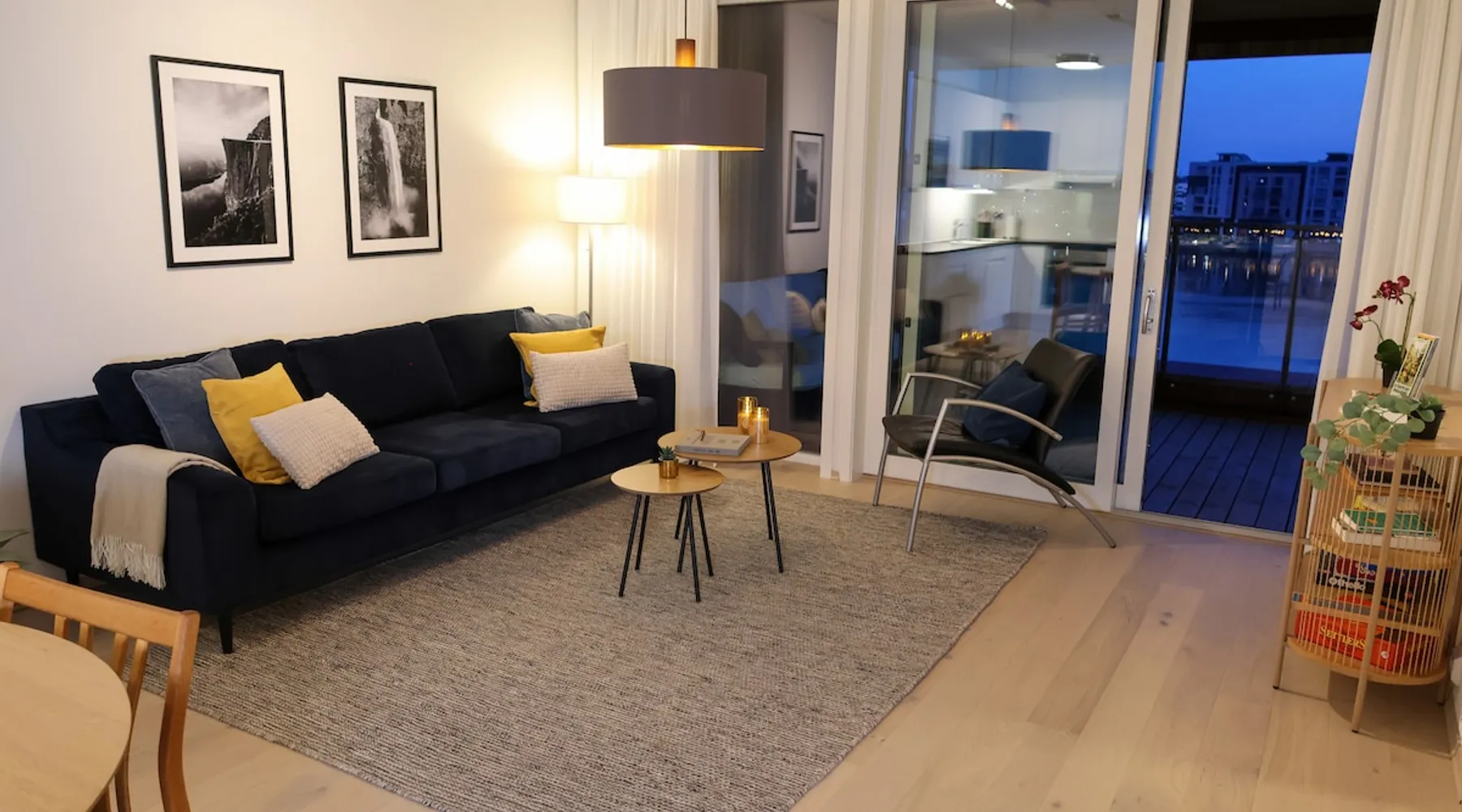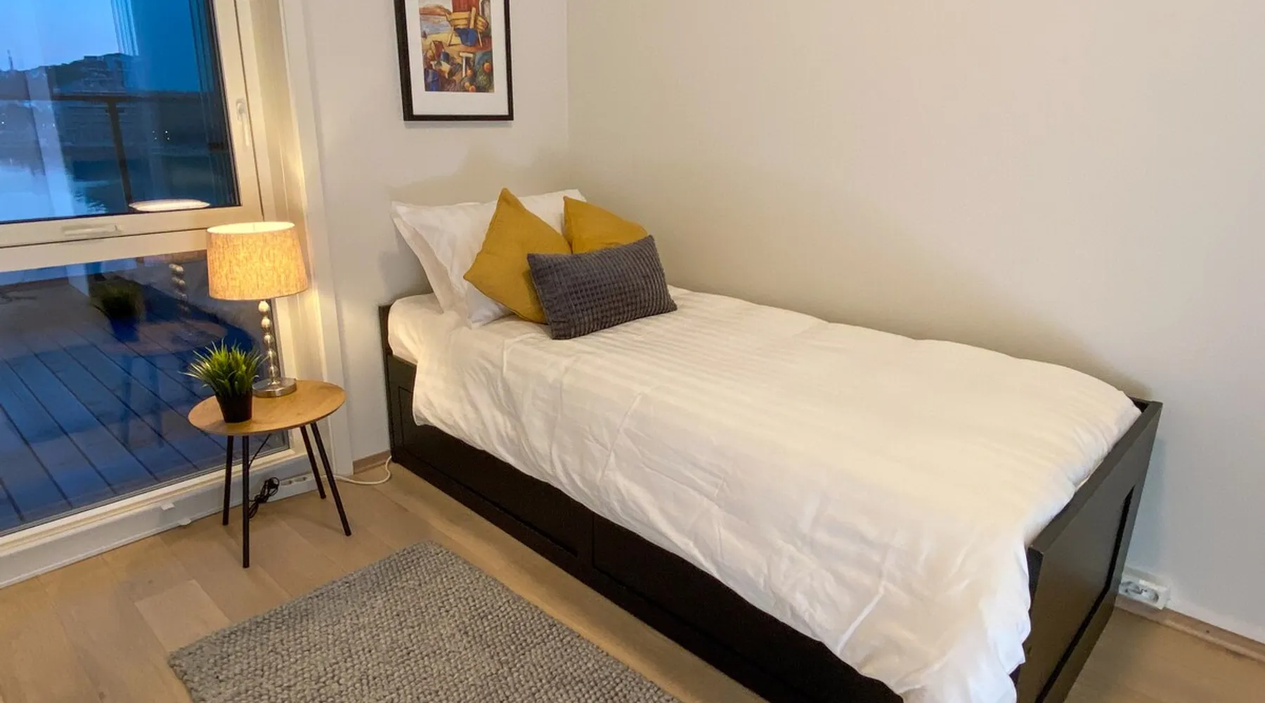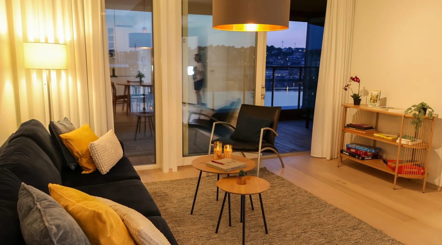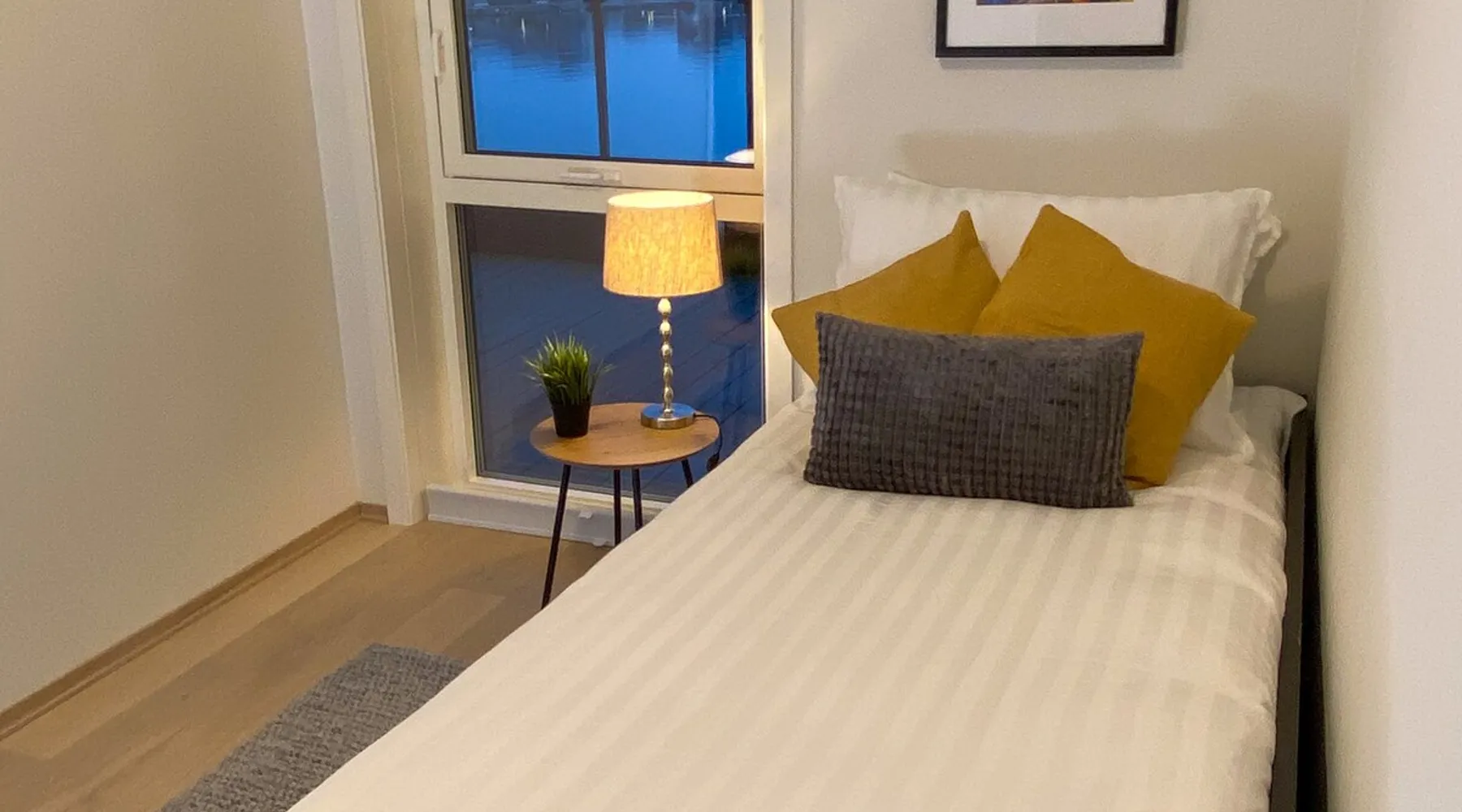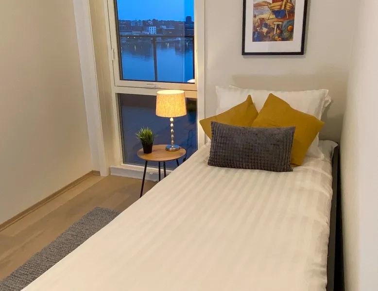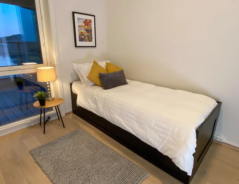 Hang out with your hat and enjoy the evening sun! Brand new charming 86m2 apartment with 2 bedrooms just off Sandnes Sentrum. A unique location with amazing sun conditions until late at night. From the generous private balcony on the 5th floor, you can enjoy the lovely views of the city centre and the Gandsfjord. It is a 10 minute stroll along the promenade into the center of Sandnes with its associated shops, center and good selection in restaurants and cultural life. Alternatively 10m to nearest bus stop. The space The apartment was new in June 2023, and has 2 bedrooms, a bathroom, a storage room and a living room with an open kitchen solution. And the very best thing is the generous glazed balcony. The glass may be opened and closed at your own desire. We have free parking for you and by elevator you will get up to the 5th floor. Especially good Handicap parking space. The one bedroom is 14m2 and the other is 8m2. The bathroom has toilet and shower and a combined washer/dried drum. The kitchen has all necessary amenities. Refrigerator with built-in freezer. Integrated dishwasher, stove and stove and microwave. Both living room and balcony are comfortably furnished with sofa and table and chairs. You should feel comfortable and comfortable staying at our place. Guest access You will have the entire apartment by your own during your entire stay. Other things to note We have a small 15-foot boat with 40 horsepower lying on the jetty right by the apartment. From here you can easily reach great fishing areas. You can even drive the boat all the way into Lysefjorden if desired, where you can see the pulpit from below. If you have a boat license, we can rent this out to you separately. Ask for information if this is applicable.