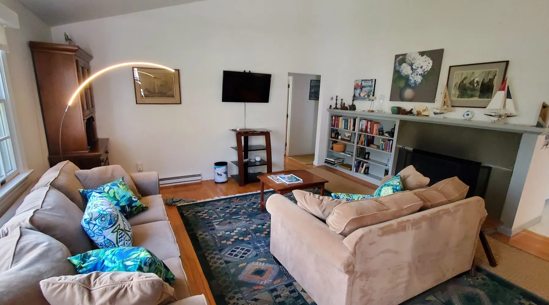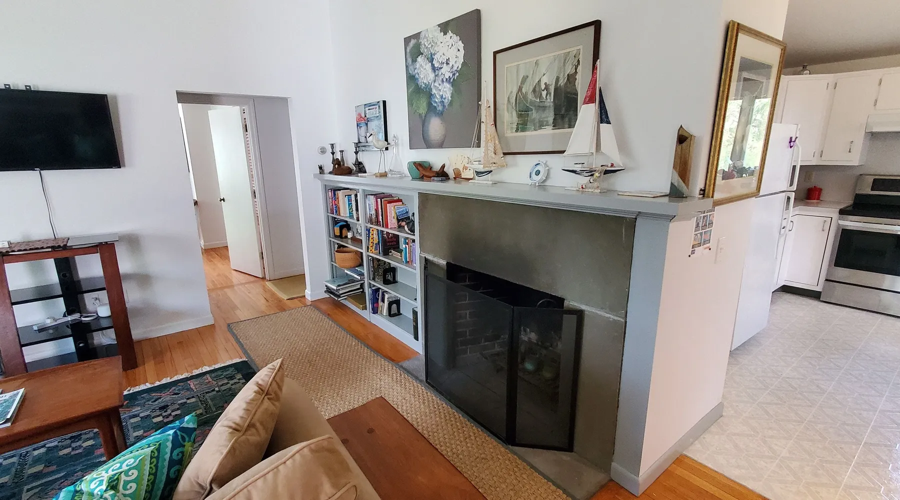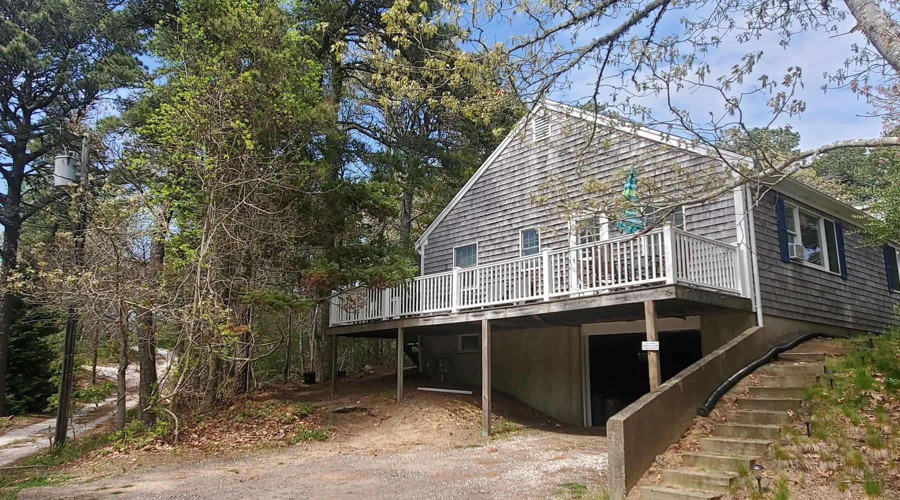 This well-appointed home set a little back in the woods is just a short distance (.1 mile) down a lovely path to the sweet bay beach, Power's Landing. Wellfleet Center is just 1.4 miles 's a home that has been lovingly and thoughtfully equipped with everything a home-away-from-home should have. The main level welcomes with an open area. Here there is a cathedral ceiling, decorative fireplace with built in bookcases full of books of local interest. A large picture window brings in beautiful, natural lighting. Dining table seats 6, and opens to the spacious, fully equipped chef's kitchen. The hallway leads from the living room to the bedrooms. En suite primary bedroom has one queen bed and full bath with shower. There is a door leading out to the lovely raised deck, which is outfitted with an outdoor patio table, chairs, gas grill. Steps down to enclosed outdoor shower. 2nd bedroom has the other queen bed and a trundle. Off the hall is a 2nd full bathroom with separate tub and shower. Amenities: Game closet, Washer and dryer is located in the basement, 2 window A/C units, TV, Lobster pot, dishwasher, microwave, coffee maker, blender, toaster, iron & ironing board, decorative fireplace, built in bookcases with books of local interest and fictional reading, outdoor furniture, patio table, chairs, patio umbrella, chaise lounges, gas grill, enclosed outdoor shower, wifi. There are 3 A/C units - 1 in the living room and 1 in each bedroom Non-refundable $250.00 fee (includes administrative fee and damage waiver assurance) plus applicable state and local taxes. Bring your own linens and towels.