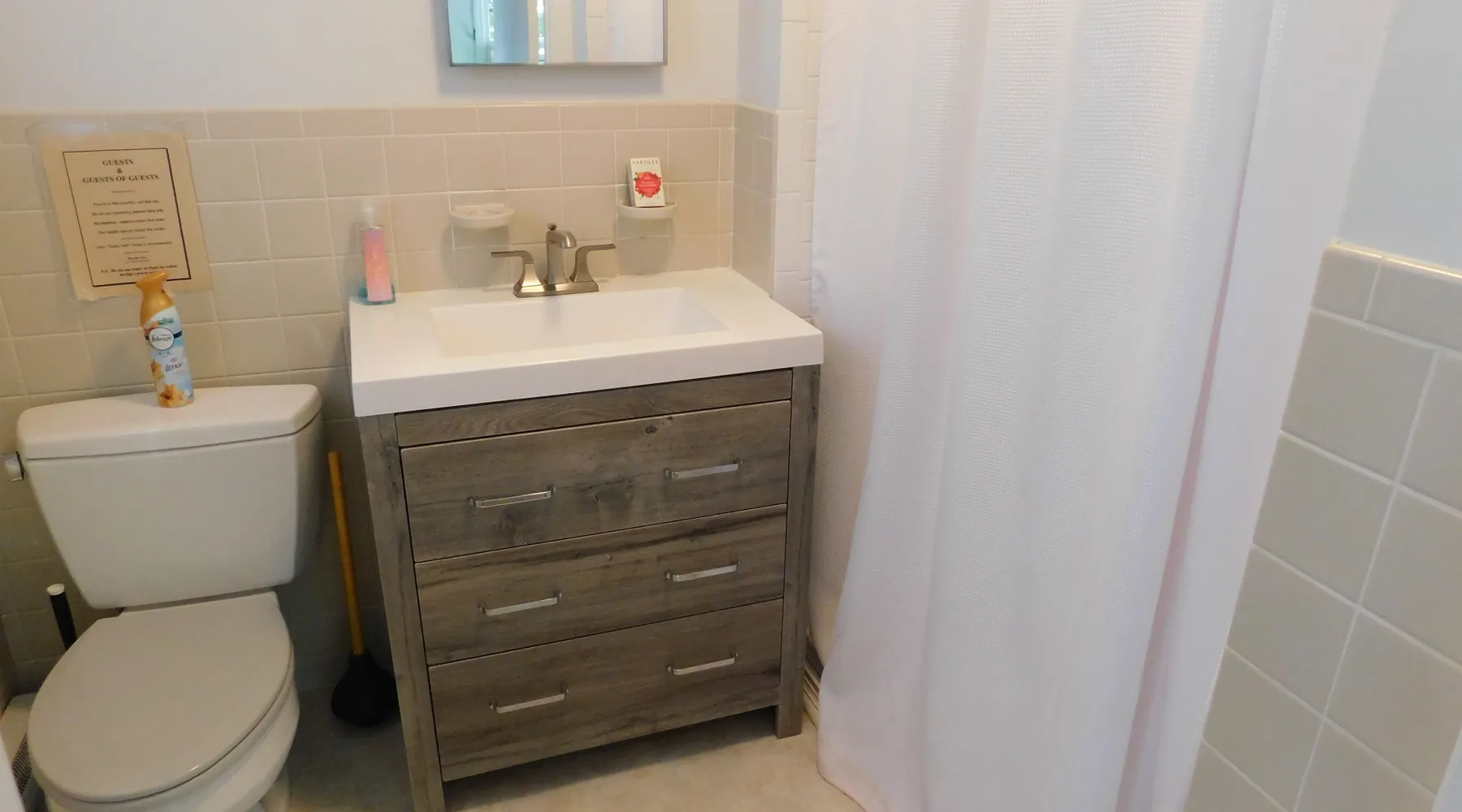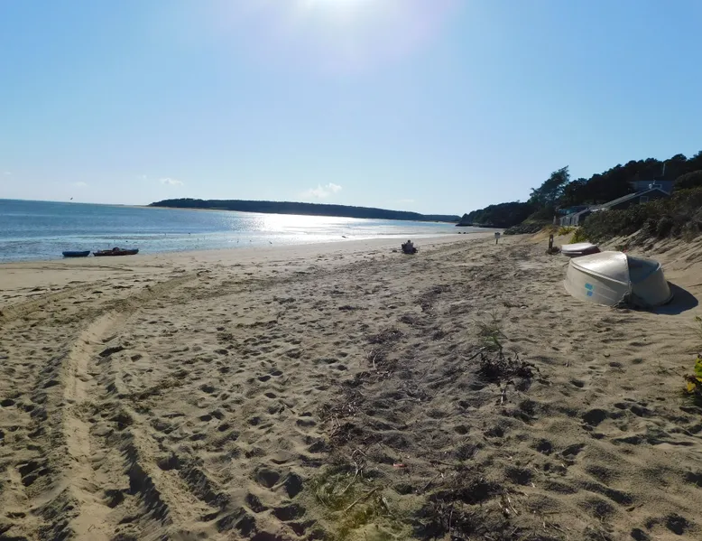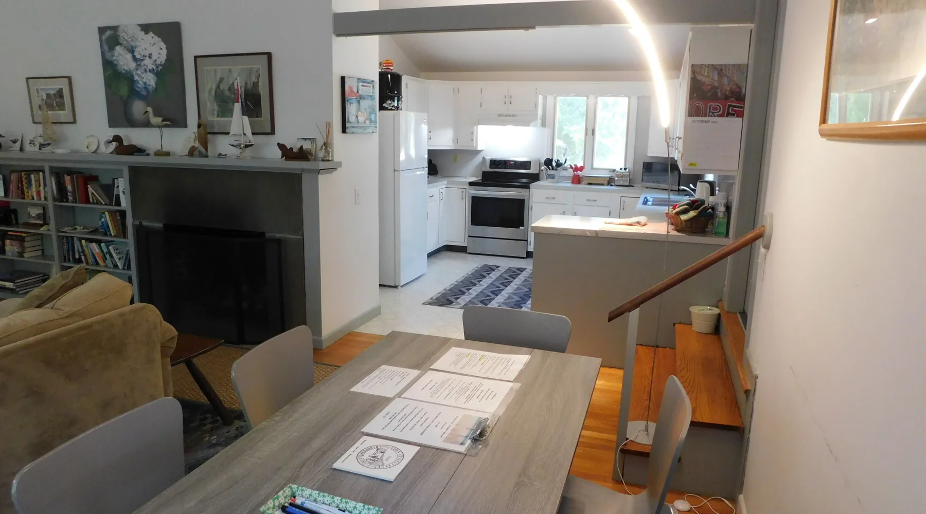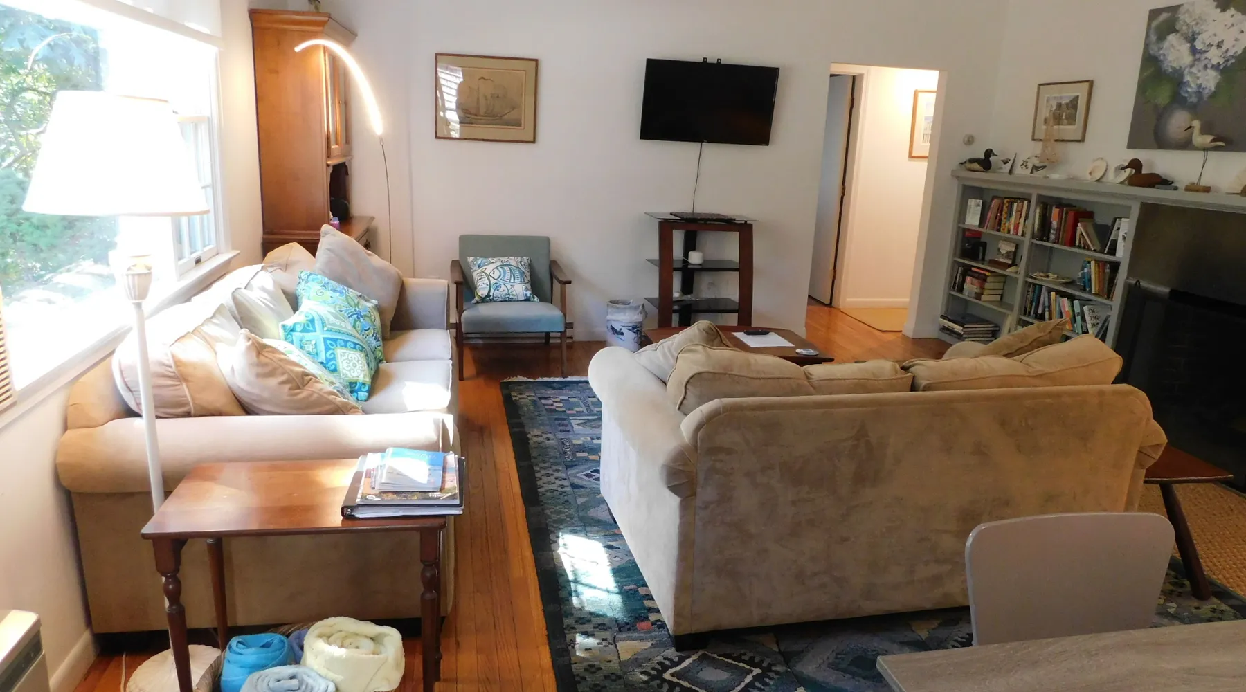 This well-appointed home set a little back in the woods is just a short distance (.1 mile) down a lovely path to the sweet bay beach, Power's Landing. Wellfleet Center is just 1.4 miles 's a home that has been lovingly and thoughtfully equipped with everything a home-away-from-home should have. The main level welcomes with an open area. Here there is a cathedral ceiling, decorative fireplace with built in bookcases full of books of local interest. A large picture window brings in beautiful, natural lighting. Dining table seats 6, and opens to the spacious, fully equipped chef's kitchen. The hallway leads from the living room to the bedrooms. En suite primary bedroom has one queen bed and full bath with shower. There is a door leading out to the lovely raised deck, which is outfitted with an outdoor patio table, chairs, gas grill. Steps down to enclosed outdoor shower. 2nd bedroom has the other queen bed and a trundle. Off the hall is a 2nd full bathroom with separate tub and shower. Amenities: Game closet, Washer and dryer is located in the basement, 2 window A/C units, TV, Lobster pot, dishwasher, microwave, coffee maker, blender, toaster, iron & ironing board, decorative fireplace, built in bookcases with books of local interest and fictional reading, outdoor furniture, patio table, chairs, patio umbrella, chaise lounges, gas grill, enclosed outdoor shower, wifi. There are 3 A/C units - 1 in the living room and 1 in each bedroom Non-refundable $250.00 fee (includes administrative fee and damage waiver assurance) plus applicable state and local taxes. Bring your own linens and towels.