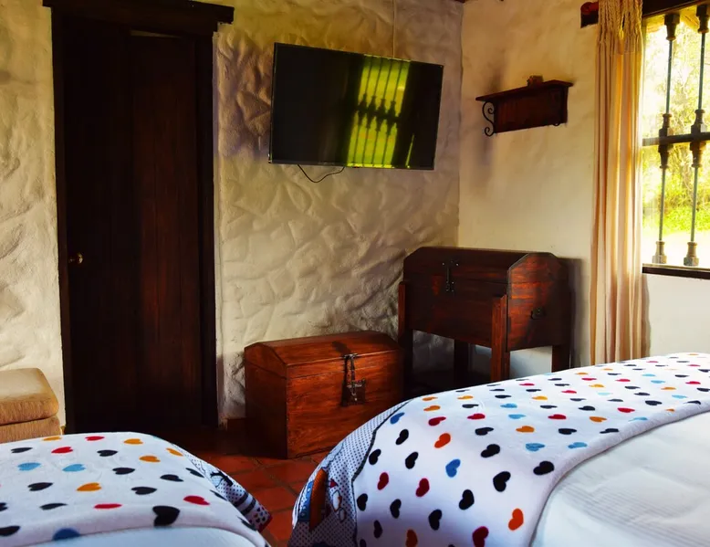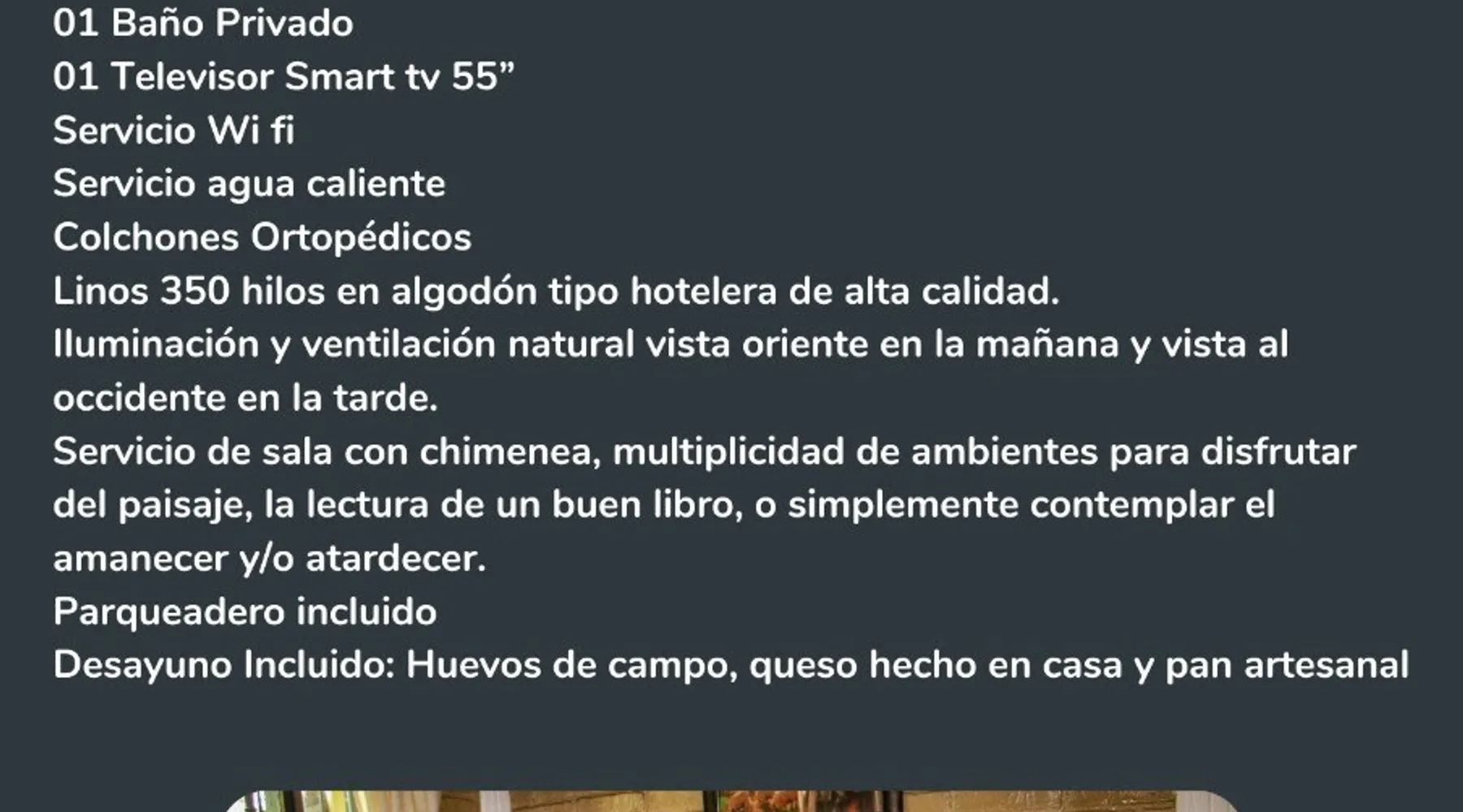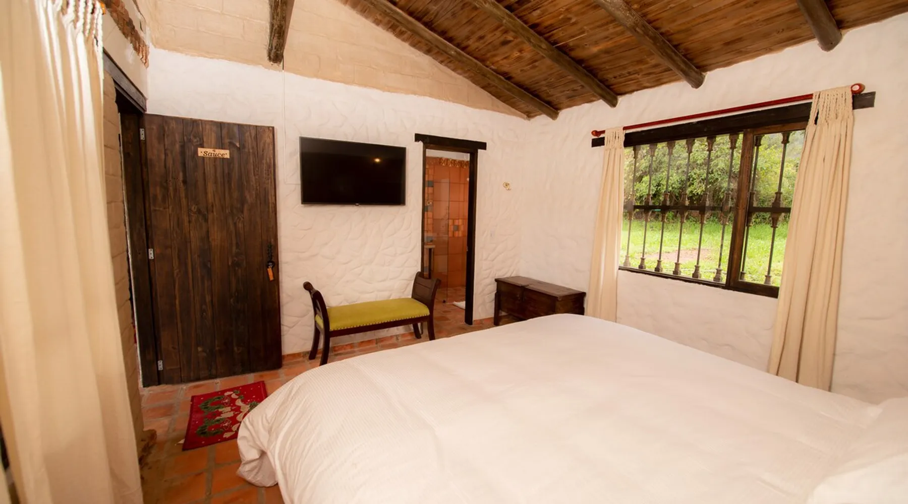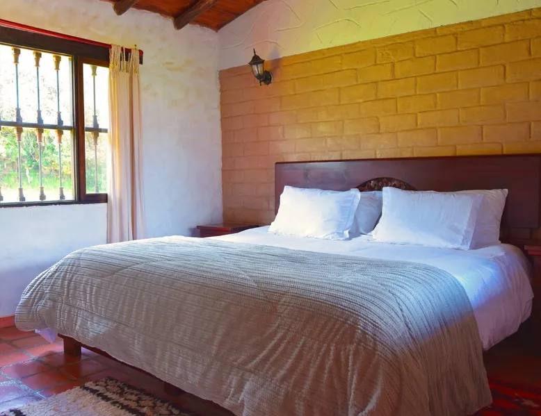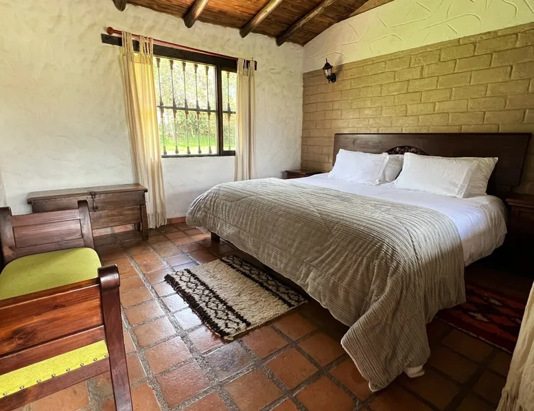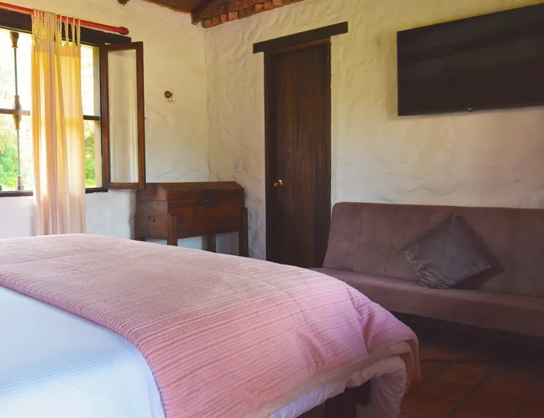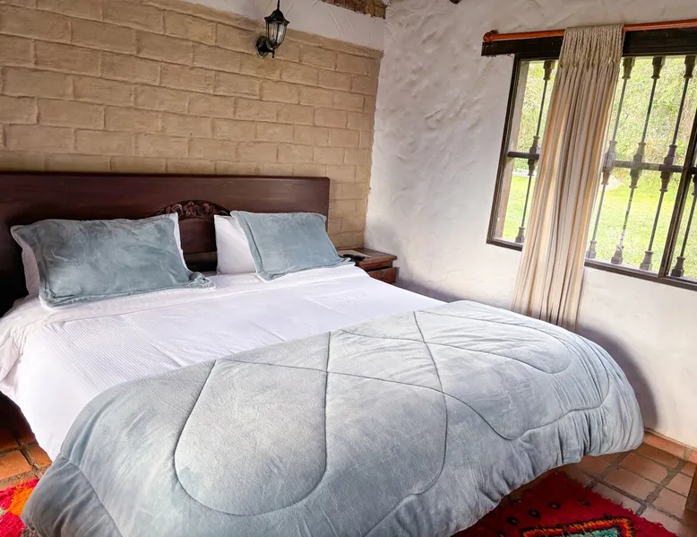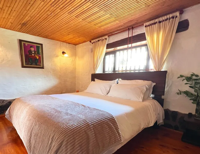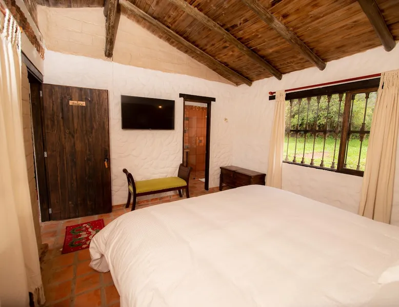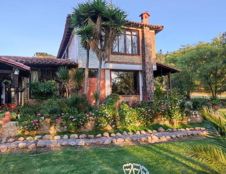 Experience with your loved ones in this wonderful and peaceful place, surrounded by the most beautiful natural landscapes and comfort where you will find everything you need to disconnect and connect to new experiences, where the sound of nature is part of a perfect symphony between birdsong, the whistling of the wind that hits the branches of the trees and the sound of water on the Joshua trail, while observing a beautiful sunset.... The space This is a Estate that has 2 rustic colonial cabins, surrounded by beautiful meadows and gardens, natural water fountains, leafy trees, fruit trees and organic orchard, you will also find ducks, chickens, cows, sheep and a wide variety of free birds, we have available and independent rooms with a private bathroom, hot water and an exquisite decoration and comfort, rustic wooden beds of Punta Larga, our beds are dressed in the highest quality linens of Brissa (Hotel line) of 350 threads, the rooms have views to the east (where the sun rises) and the west (where the sun sets), so you can appreciate the most beautiful landscapes in the morning and in the afternoon, the rooms are very ventilated, the sector is known according to the Muisca culture as "The Valley of the Gods", for its unparalleled natural beauty and a favorable area for stellar visualization, each room has 34-inch TV, WIFI, the property offers sauna service, jacuzzi and relaxing massages, they also find an area for family and social gatherings around a fireplace, our guests can also enjoy a BBQ area, to cook their favorite dishes on the grill and/or wood oven. Guest access The property is available to our smells, except for the house VICTORIA, (first cabin), where the hosts live. Other things to note The sector is very conducive for people who enjoy hiking, walking and cycling, since the valley is very safe and the roads are in very good conditions. We are also in the center of the most emblematic places of Boyacá, such as (Punta Larga vineyard - Guatica Zoo - Templo de Sol - Pantano de vargas - Pueblito Boyacense - Termales de paipa e Iza - Laguna de Tota - Municipios de Nobsa - Monguí - Tibasosa- Corrales, Iza - Sogamoso - Duitama among others). Registration Details 127386