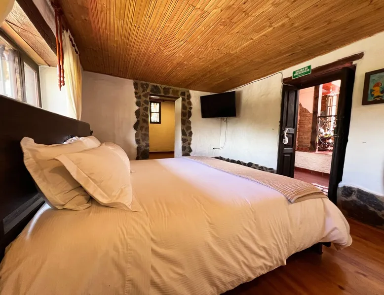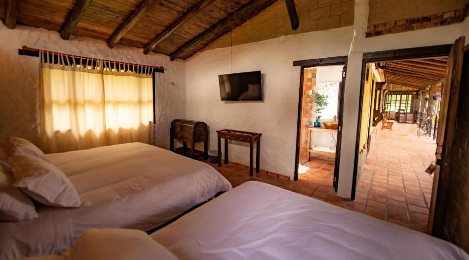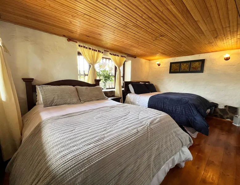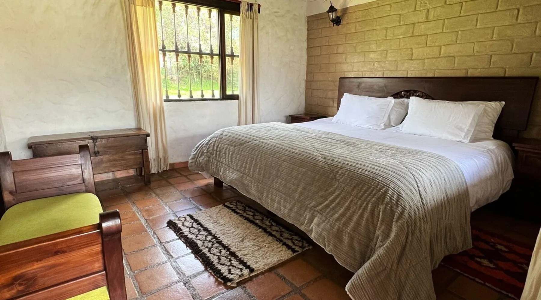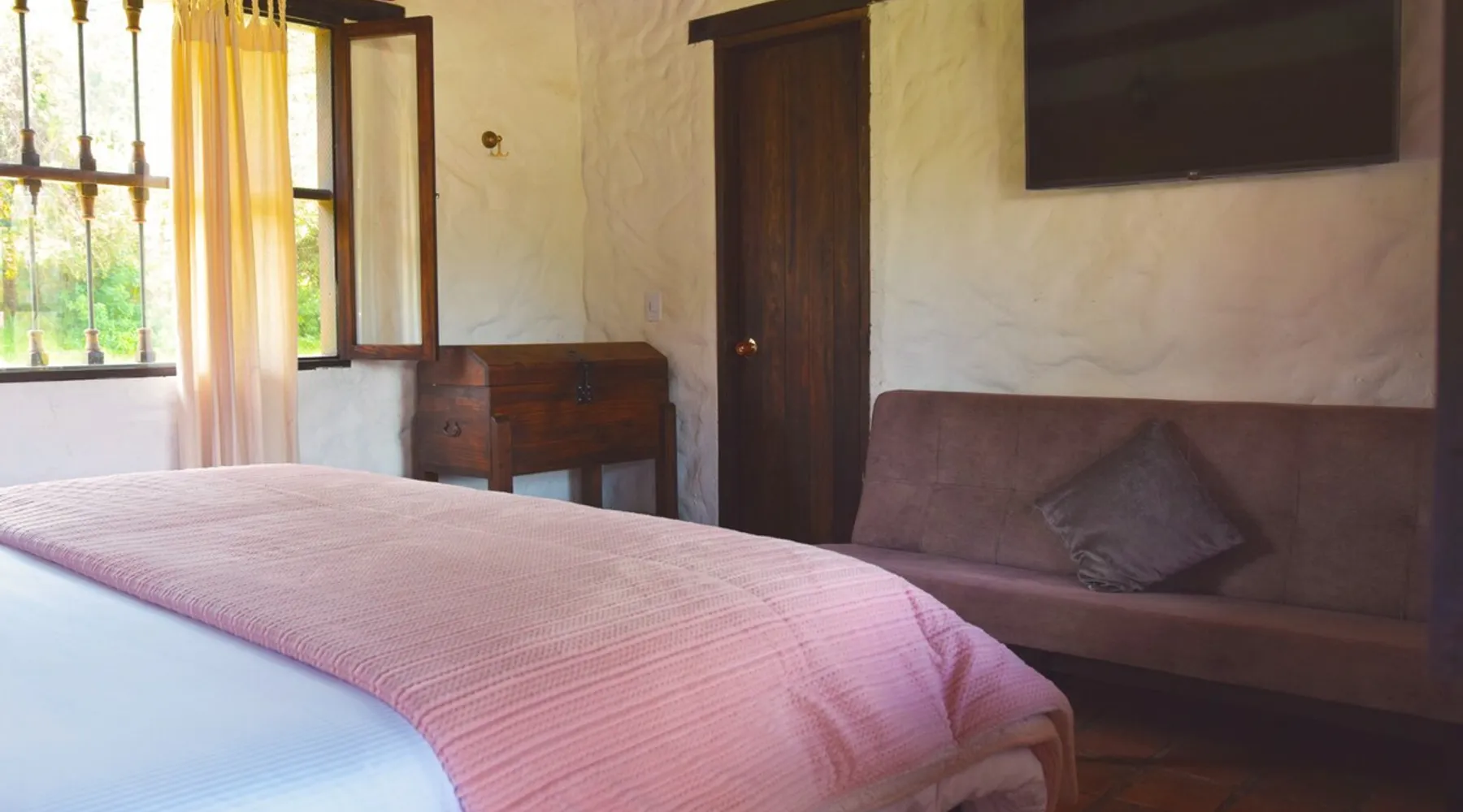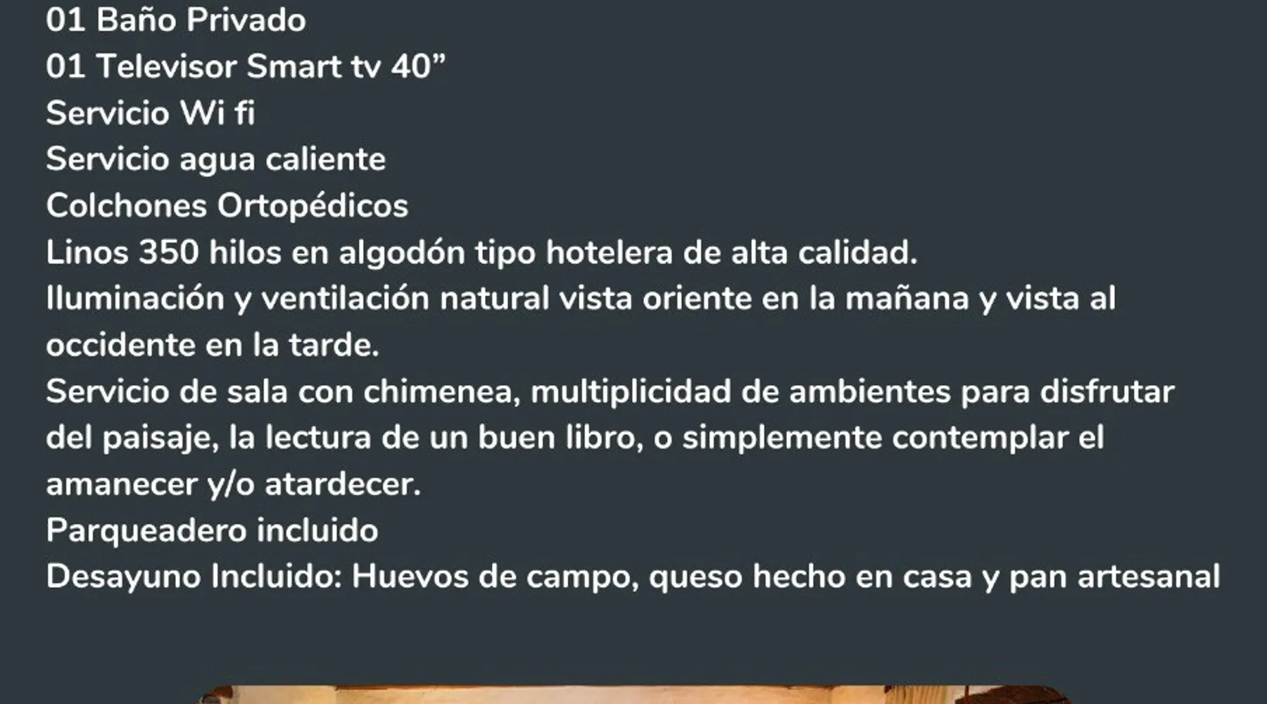 Experience with your loved ones in this wonderful and peaceful place, surrounded by the most beautiful natural landscapes and comfort where you will find everything you need to disconnect and connect to new experiences, where the sound of nature is part of a perfect symphony between birdsong, the whistling of the wind that hits the branches of the trees and the sound of water on the Joshua trail, while observing a beautiful sunset.... The space This is a Estate that has 2 rustic colonial cabins, surrounded by beautiful meadows and gardens, natural water fountains, leafy trees, fruit trees and organic orchard, you will also find ducks, chickens, cows, sheep and a wide variety of free birds, we have available and independent rooms with a private bathroom, hot water and an exquisite decoration and comfort, rustic wooden beds of Punta Larga, our beds are dressed in the highest quality linens of Brissa (Hotel line) of 350 threads, the rooms have views to the east (where the sun rises) and the west (where the sun sets), so you can appreciate the most beautiful landscapes in the morning and in the afternoon, the rooms are very ventilated, the sector is known according to the Muisca culture as "The Valley of the Gods", for its unparalleled natural beauty and a favorable area for stellar visualization, each room has 34-inch TV, WIFI, the property offers sauna service, jacuzzi and relaxing massages, they also find an area for family and social gatherings around a fireplace, our guests can also enjoy a BBQ area, to cook their favorite dishes on the grill and/or wood oven. Guest access The property is available to our smells, except for the house VICTORIA, (first cabin), where the hosts live. Other things to note The sector is very conducive for people who enjoy hiking, walking and cycling, since the valley is very safe and the roads are in very good conditions. We are also in the center of the most emblematic places of Boyacá, such as (Punta Larga vineyard - Guatica Zoo - Templo de Sol - Pantano de vargas - Pueblito Boyacense - Termales de paipa e Iza - Laguna de Tota - Municipios de Nobsa - Monguí - Tibasosa- Corrales, Iza - Sogamoso - Duitama among others). Registration Details 127386