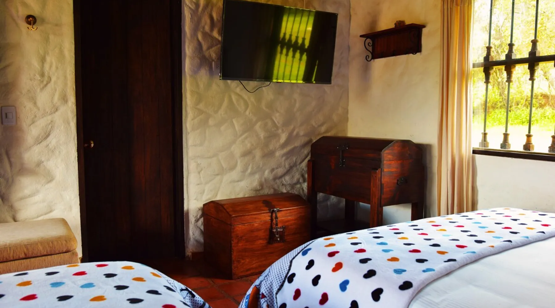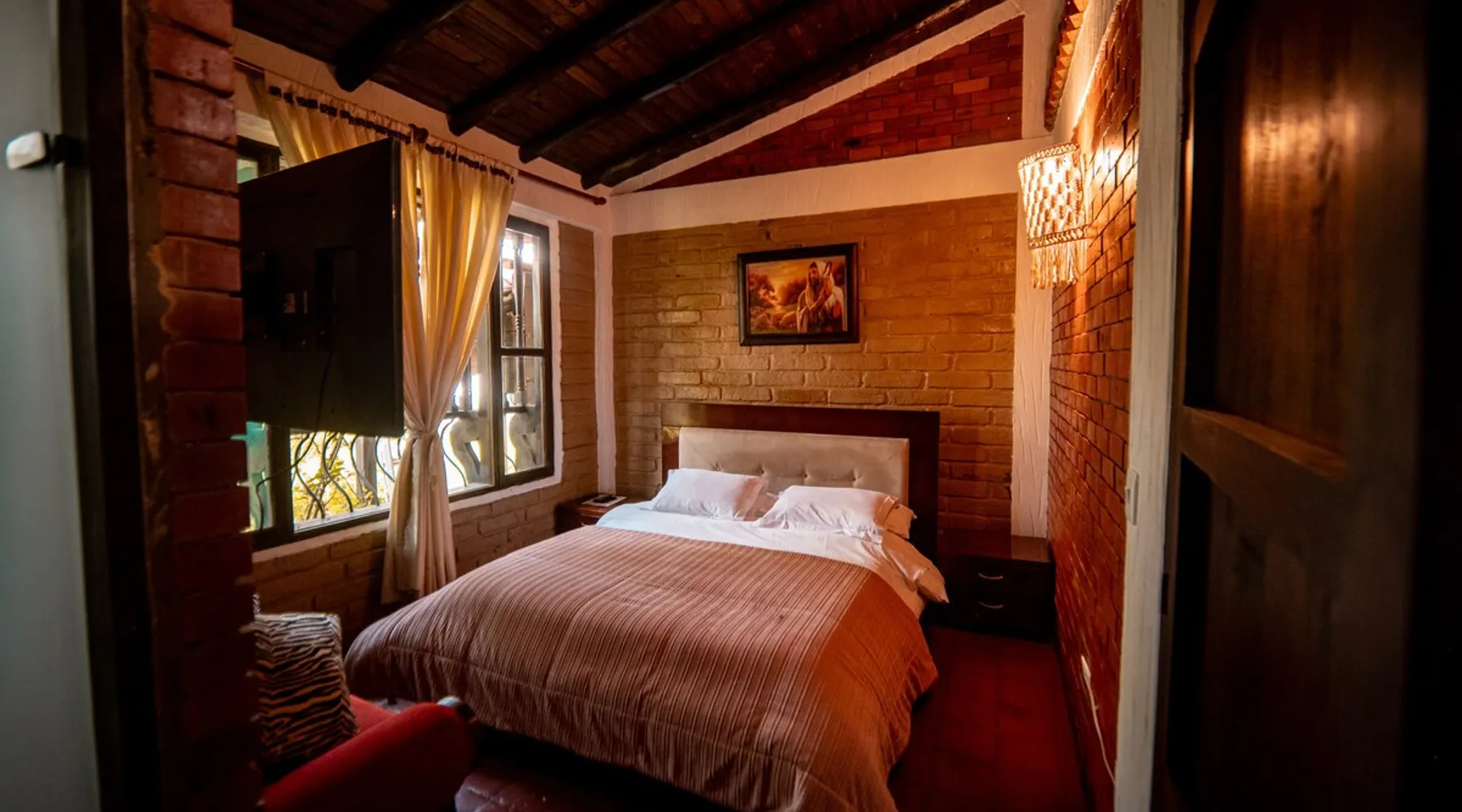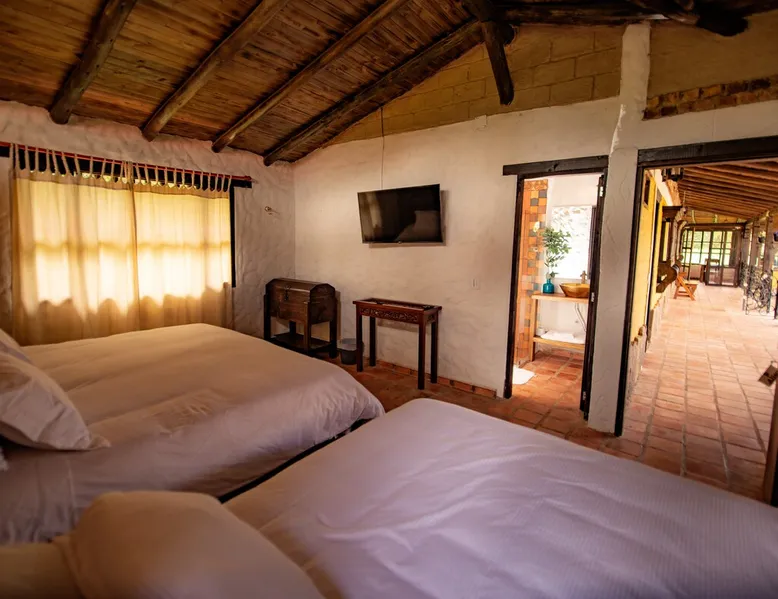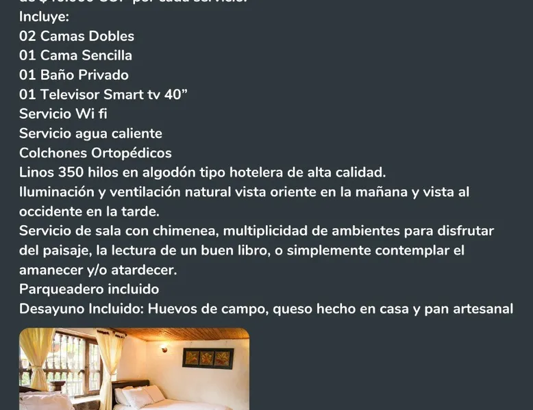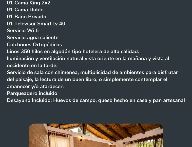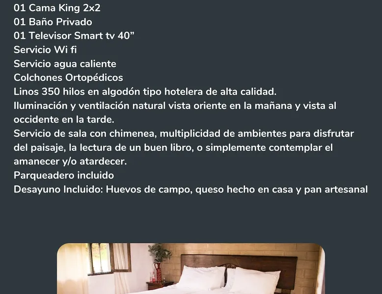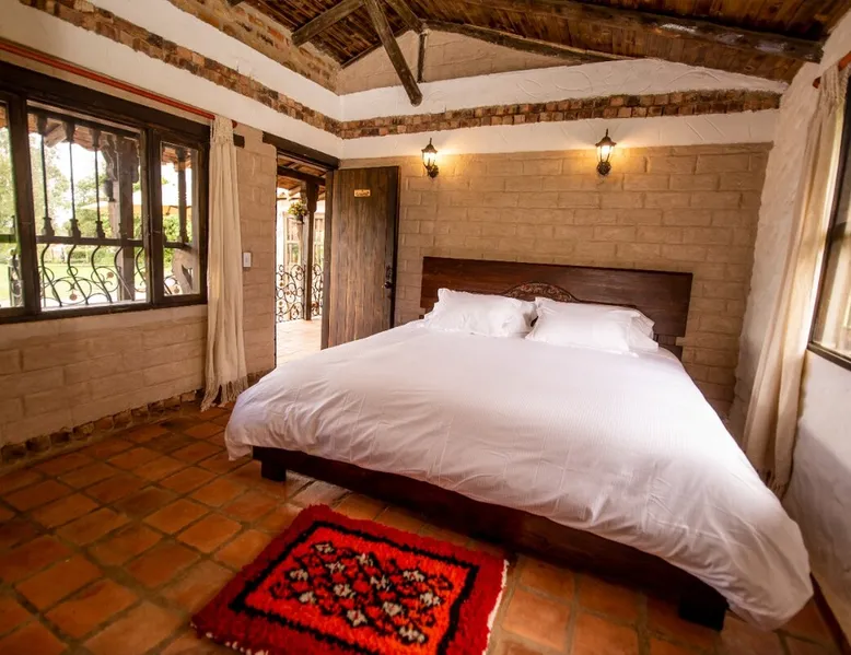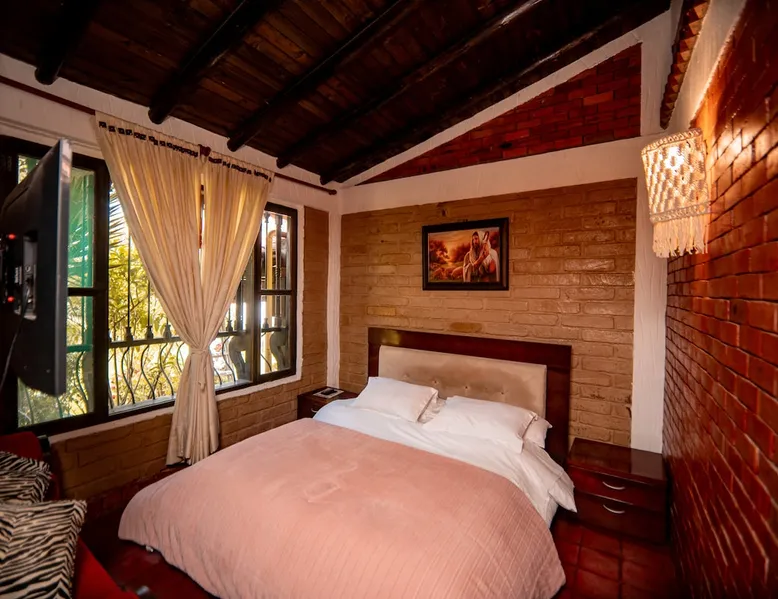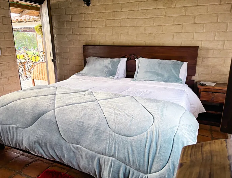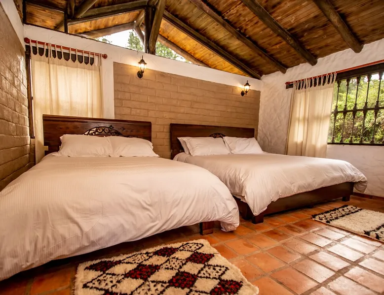 Experience with your loved ones in this wonderful and peaceful place, surrounded by the most beautiful natural landscapes and comfort where you will find everything you need to disconnect and connect to new experiences, where the sound of nature is part of a perfect symphony between birdsong, the whistling of the wind that hits the branches of the trees and the sound of water on the Joshua trail, while observing a beautiful sunset.... The space This is a Estate that has 2 rustic colonial cabins, surrounded by beautiful meadows and gardens, natural water fountains, leafy trees, fruit trees and organic orchard, you will also find ducks, chickens, cows, sheep and a wide variety of free birds, we have available and independent rooms with a private bathroom, hot water and an exquisite decoration and comfort, rustic wooden beds of Punta Larga, our beds are dressed in the highest quality linens of Brissa (Hotel line) of 350 threads, the rooms have views to the east (where the sun rises) and the west (where the sun sets), so you can appreciate the most beautiful landscapes in the morning and in the afternoon, the rooms are very ventilated, the sector is known according to the Muisca culture as "The Valley of the Gods", for its unparalleled natural beauty and a favorable area for stellar visualization, each room has 34-inch TV, WIFI, the property offers sauna service, jacuzzi and relaxing massages, they also find an area for family and social gatherings around a fireplace, our guests can also enjoy a BBQ area, to cook their favorite dishes on the grill and/or wood oven. Guest access The property is available to our smells, except for the house VICTORIA, (first cabin), where the hosts live. Other things to note The sector is very conducive for people who enjoy hiking, walking and cycling, since the valley is very safe and the roads are in very good conditions. We are also in the center of the most emblematic places of Boyacá, such as (Punta Larga vineyard - Guatica Zoo - Templo de Sol - Pantano de vargas - Pueblito Boyacense - Termales de paipa e Iza - Laguna de Tota - Municipios de Nobsa - Monguí - Tibasosa- Corrales, Iza - Sogamoso - Duitama among others). Registration Details 127386