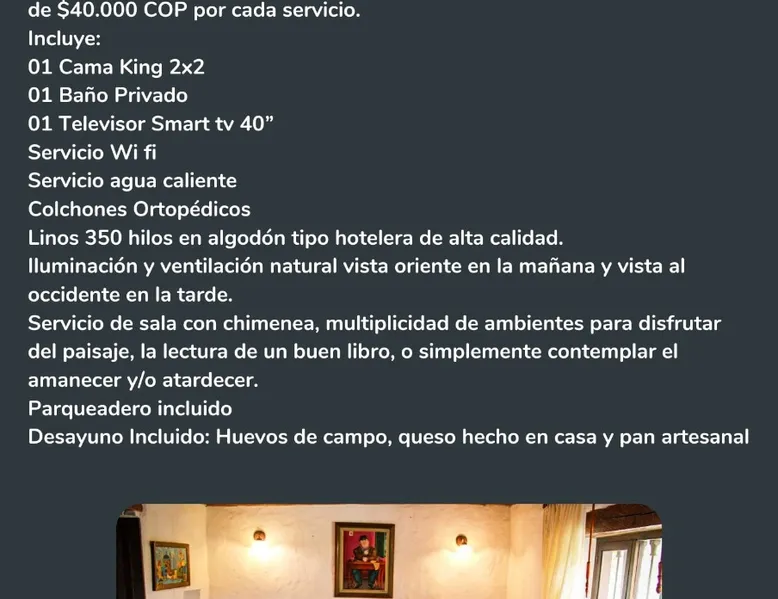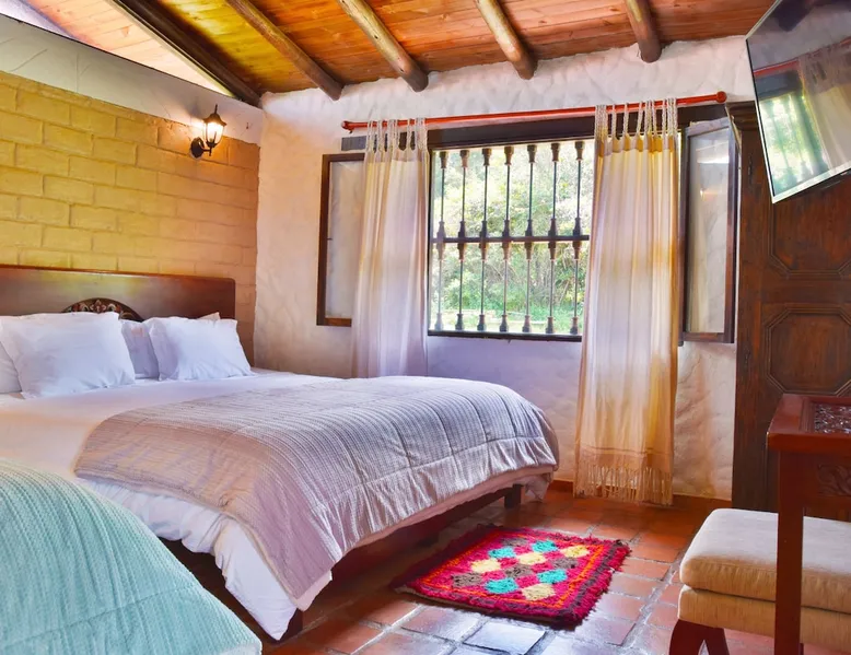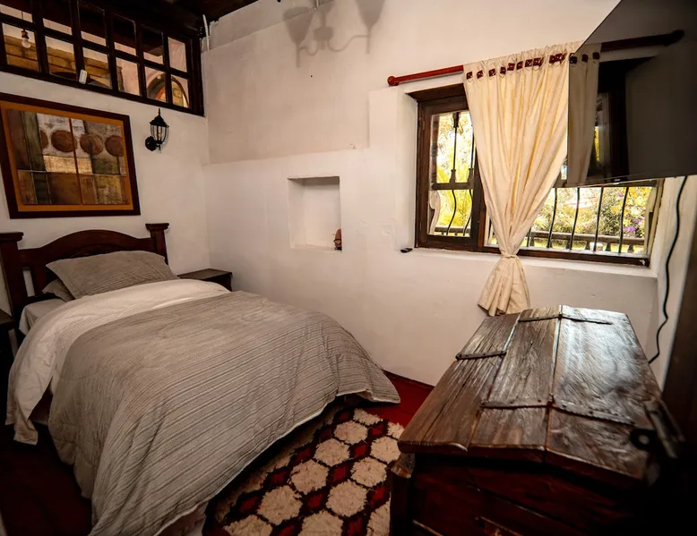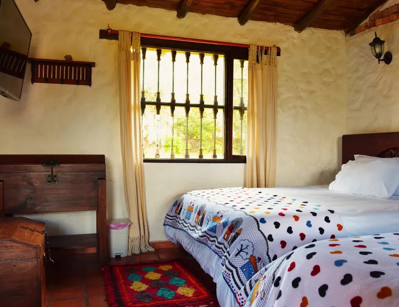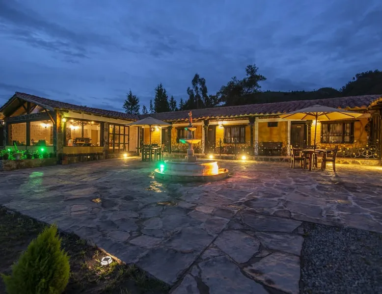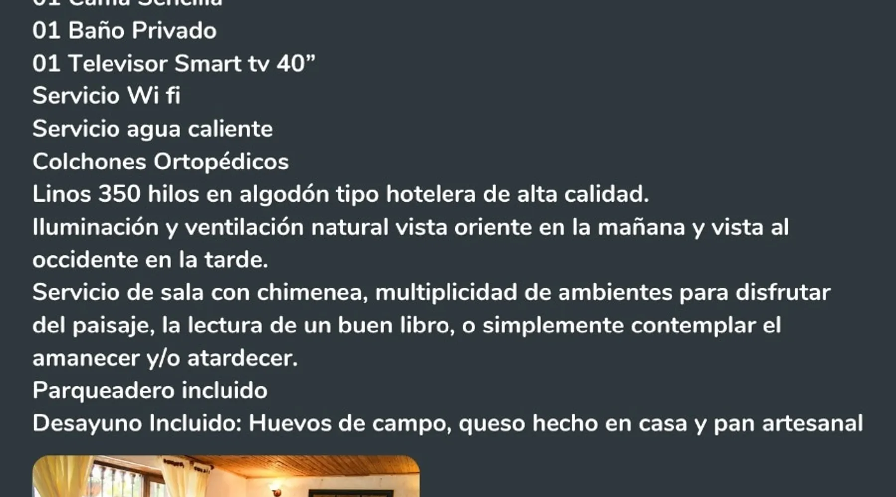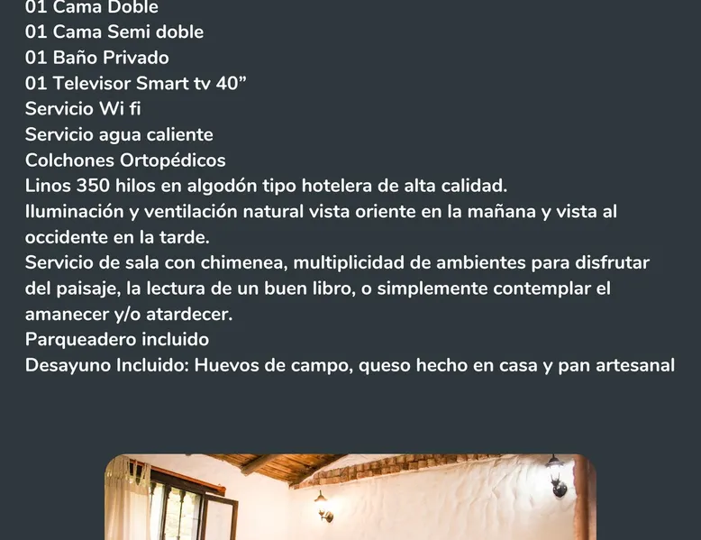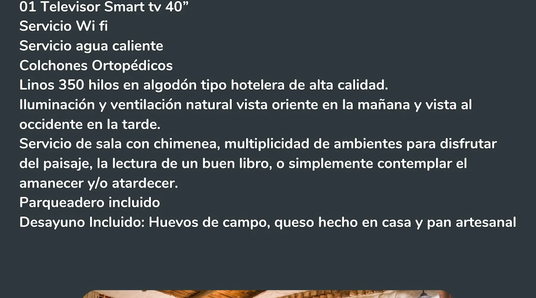 Experience with your loved ones in this wonderful and peaceful place, surrounded by the most beautiful natural landscapes and comfort where you will find everything you need to disconnect and connect to new experiences, where the sound of nature is part of a perfect symphony between birdsong, the whistling of the wind that hits the branches of the trees and the sound of water on the Joshua trail, while observing a beautiful sunset.... The space This is a Estate that has 2 rustic colonial cabins, surrounded by beautiful meadows and gardens, natural water fountains, leafy trees, fruit trees and organic orchard, you will also find ducks, chickens, cows, sheep and a wide variety of free birds, we have available and independent rooms with a private bathroom, hot water and an exquisite decoration and comfort, rustic wooden beds of Punta Larga, our beds are dressed in the highest quality linens of Brissa (Hotel line) of 350 threads, the rooms have views to the east (where the sun rises) and the west (where the sun sets), so you can appreciate the most beautiful landscapes in the morning and in the afternoon, the rooms are very ventilated, the sector is known according to the Muisca culture as "The Valley of the Gods", for its unparalleled natural beauty and a favorable area for stellar visualization, each room has 34-inch TV, WIFI, the property offers sauna service, jacuzzi and relaxing massages, they also find an area for family and social gatherings around a fireplace, our guests can also enjoy a BBQ area, to cook their favorite dishes on the grill and/or wood oven. Guest access The property is available to our smells, except for the house VICTORIA, (first cabin), where the hosts live. Other things to note The sector is very conducive for people who enjoy hiking, walking and cycling, since the valley is very safe and the roads are in very good conditions. We are also in the center of the most emblematic places of Boyacá, such as (Punta Larga vineyard - Guatica Zoo - Templo de Sol - Pantano de vargas - Pueblito Boyacense - Termales de paipa e Iza - Laguna de Tota - Municipios de Nobsa - Monguí - Tibasosa- Corrales, Iza - Sogamoso - Duitama among others). Registration Details 127386
