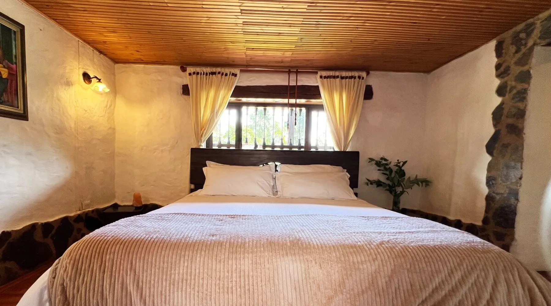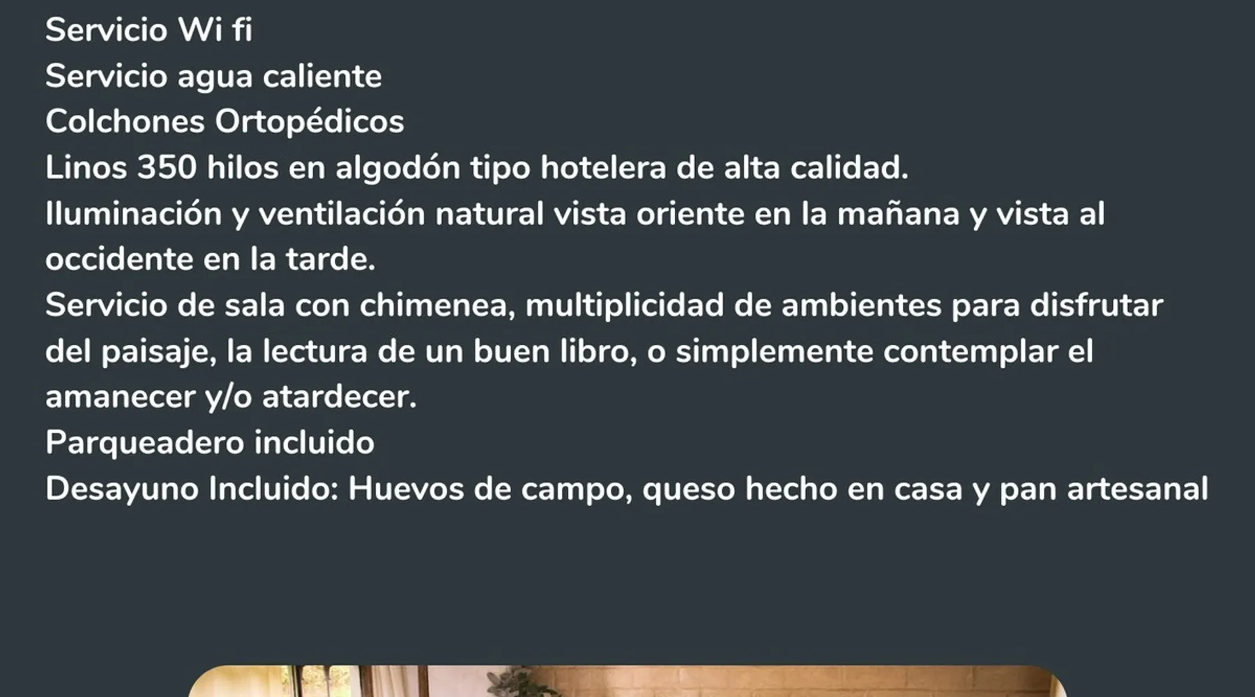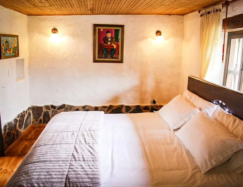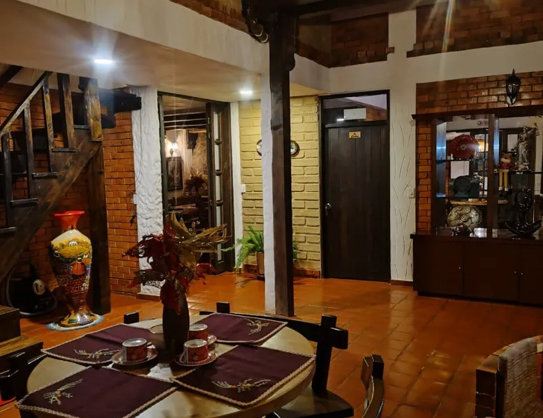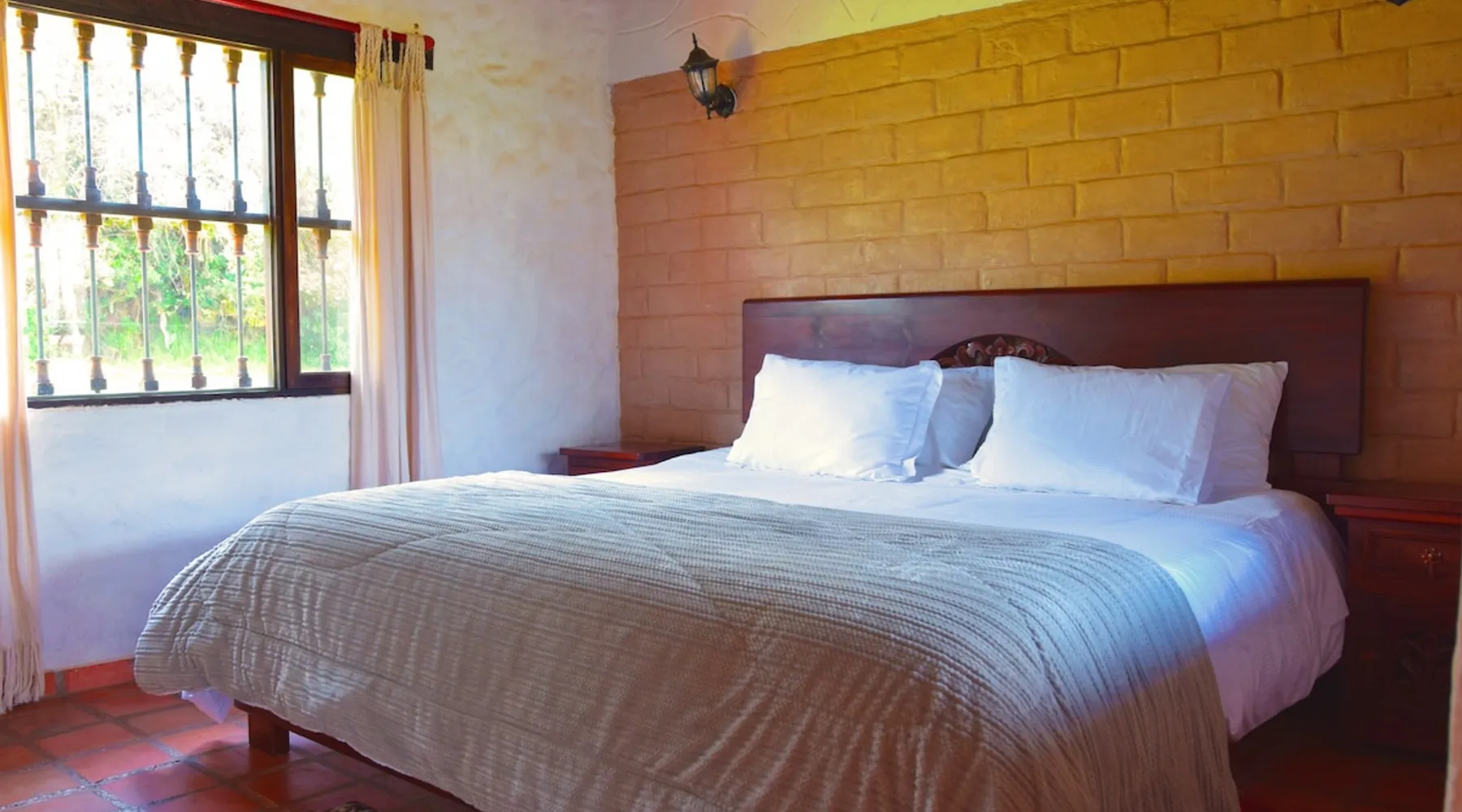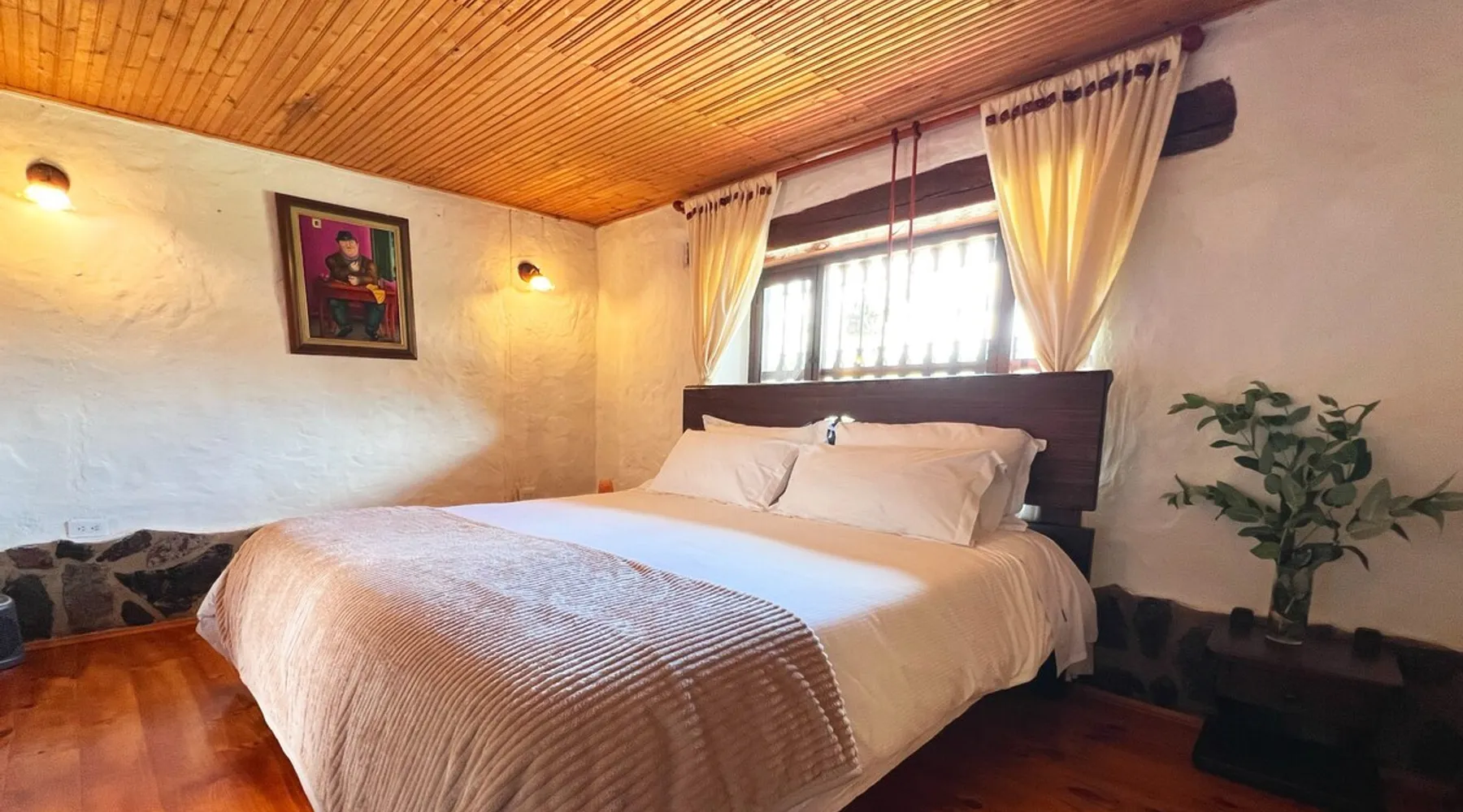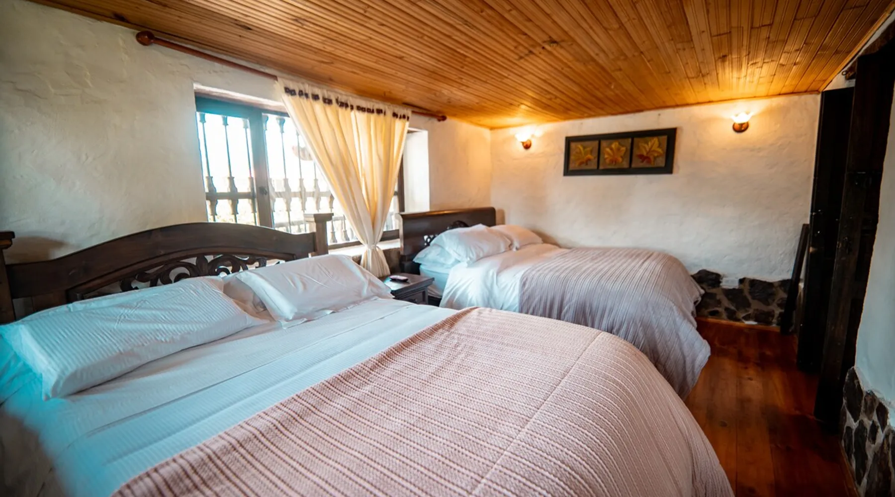 Experience with your loved ones in this wonderful and peaceful place, surrounded by the most beautiful natural landscapes and comfort where you will find everything you need to disconnect and connect to new experiences, where the sound of nature is part of a perfect symphony between birdsong, the whistling of the wind that hits the branches of the trees and the sound of water on the Joshua trail, while observing a beautiful sunset.... The space This is a Estate that has 2 rustic colonial cabins, surrounded by beautiful meadows and gardens, natural water fountains, leafy trees, fruit trees and organic orchard, you will also find ducks, chickens, cows, sheep and a wide variety of free birds, we have available and independent rooms with a private bathroom, hot water and an exquisite decoration and comfort, rustic wooden beds of Punta Larga, our beds are dressed in the highest quality linens of Brissa (Hotel line) of 350 threads, the rooms have views to the east (where the sun rises) and the west (where the sun sets), so you can appreciate the most beautiful landscapes in the morning and in the afternoon, the rooms are very ventilated, the sector is known according to the Muisca culture as "The Valley of the Gods", for its unparalleled natural beauty and a favorable area for stellar visualization, each room has 34-inch TV, WIFI, the property offers sauna service, jacuzzi and relaxing massages, they also find an area for family and social gatherings around a fireplace, our guests can also enjoy a BBQ area, to cook their favorite dishes on the grill and/or wood oven. Guest access The property is available to our smells, except for the house VICTORIA, (first cabin), where the hosts live. Other things to note The sector is very conducive for people who enjoy hiking, walking and cycling, since the valley is very safe and the roads are in very good conditions. We are also in the center of the most emblematic places of Boyacá, such as (Punta Larga vineyard - Guatica Zoo - Templo de Sol - Pantano de vargas - Pueblito Boyacense - Termales de paipa e Iza - Laguna de Tota - Municipios de Nobsa - Monguí - Tibasosa- Corrales, Iza - Sogamoso - Duitama among others). Registration Details 127386