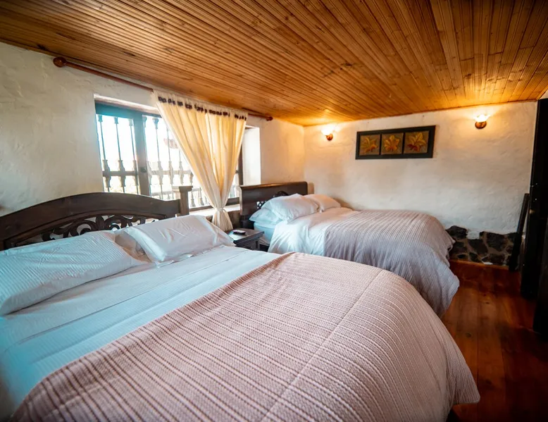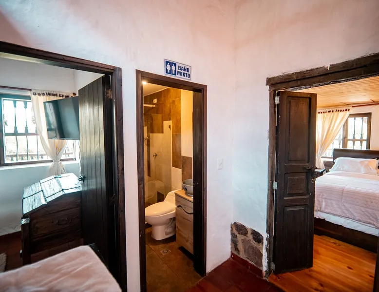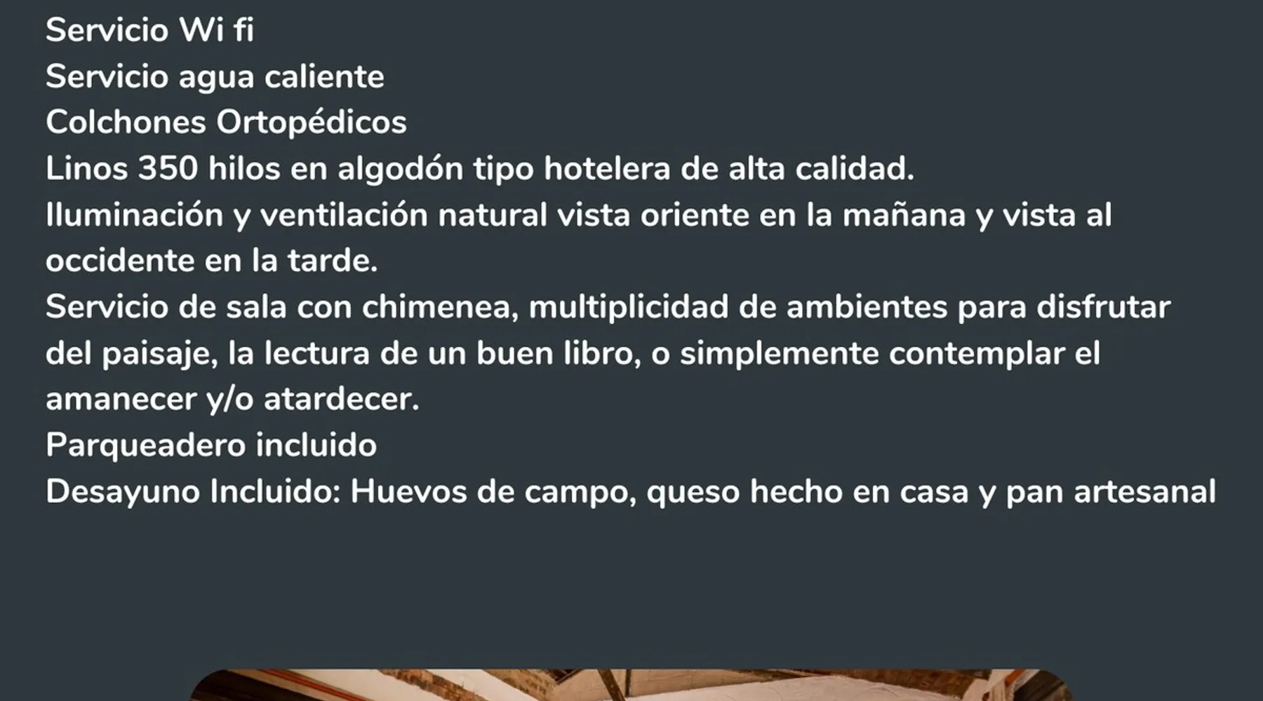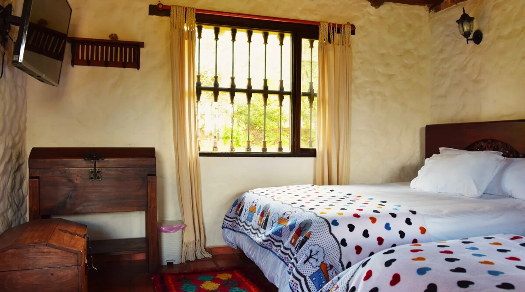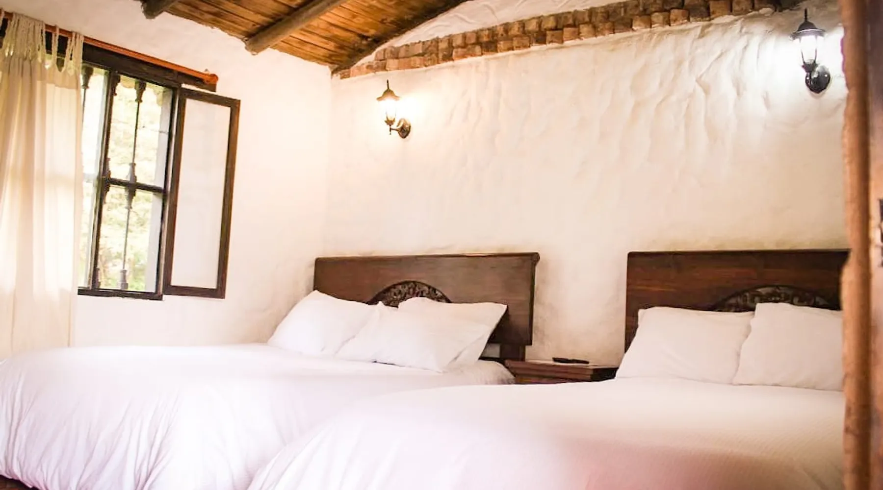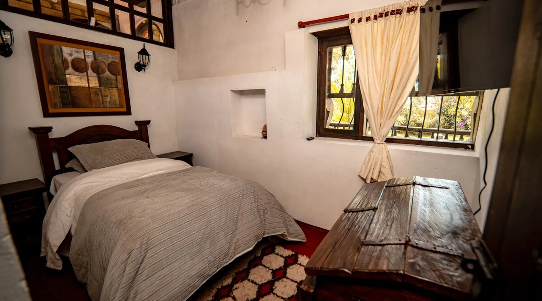 Experience with your loved ones in this wonderful and peaceful place, surrounded by the most beautiful natural landscapes and comfort where you will find everything you need to disconnect and connect to new experiences, where the sound of nature is part of a perfect symphony between birdsong, the whistling of the wind that hits the branches of the trees and the sound of water on the Joshua trail, while observing a beautiful sunset.... The space This is a Estate that has 2 rustic colonial cabins, surrounded by beautiful meadows and gardens, natural water fountains, leafy trees, fruit trees and organic orchard, you will also find ducks, chickens, cows, sheep and a wide variety of free birds, we have available and independent rooms with a private bathroom, hot water and an exquisite decoration and comfort, rustic wooden beds of Punta Larga, our beds are dressed in the highest quality linens of Brissa (Hotel line) of 350 threads, the rooms have views to the east (where the sun rises) and the west (where the sun sets), so you can appreciate the most beautiful landscapes in the morning and in the afternoon, the rooms are very ventilated, the sector is known according to the Muisca culture as "The Valley of the Gods", for its unparalleled natural beauty and a favorable area for stellar visualization, each room has 34-inch TV, WIFI, the property offers sauna service, jacuzzi and relaxing massages, they also find an area for family and social gatherings around a fireplace, our guests can also enjoy a BBQ area, to cook their favorite dishes on the grill and/or wood oven. Guest access The property is available to our smells, except for the house VICTORIA, (first cabin), where the hosts live. Other things to note The sector is very conducive for people who enjoy hiking, walking and cycling, since the valley is very safe and the roads are in very good conditions. We are also in the center of the most emblematic places of Boyacá, such as (Punta Larga vineyard - Guatica Zoo - Templo de Sol - Pantano de vargas - Pueblito Boyacense - Termales de paipa e Iza - Laguna de Tota - Municipios de Nobsa - Monguí - Tibasosa- Corrales, Iza - Sogamoso - Duitama among others). Registration Details 127386