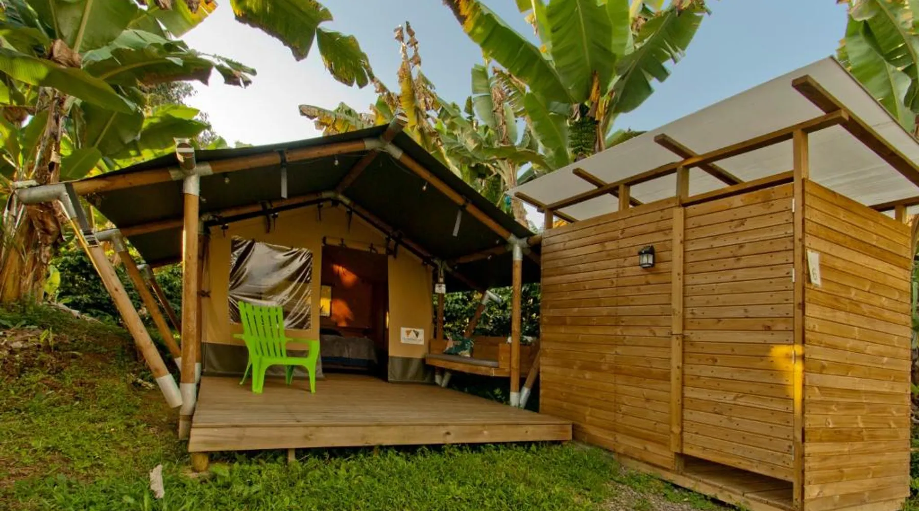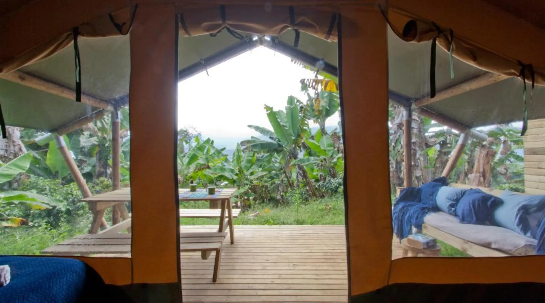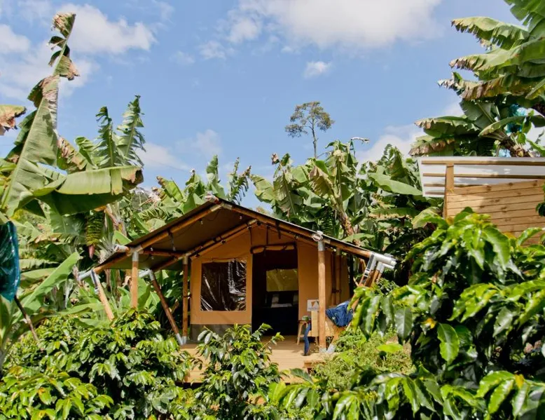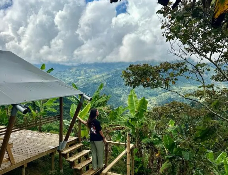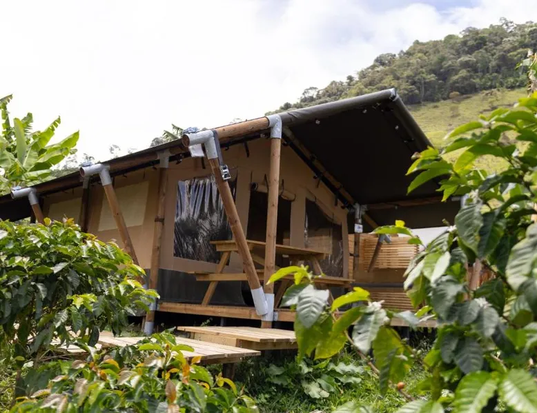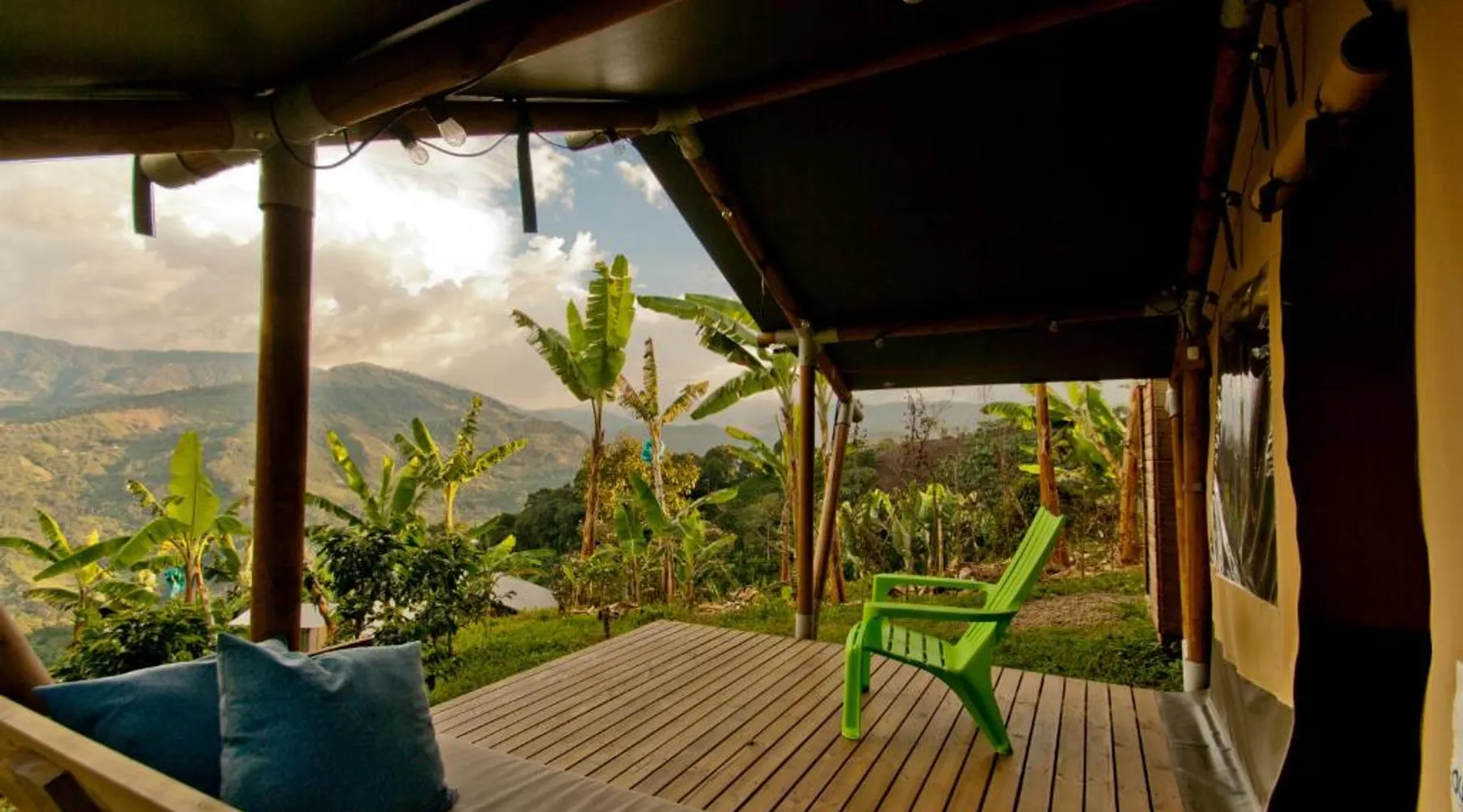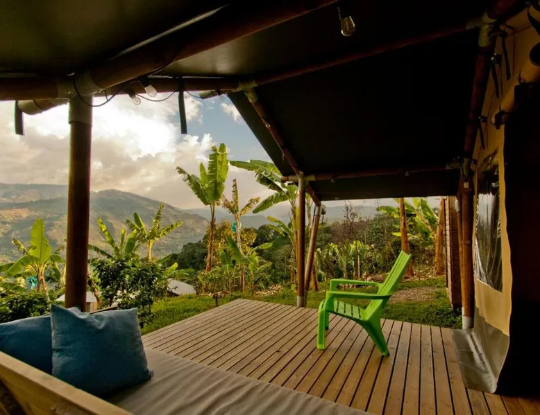 Elegant Accommodations: Glamping Jardín in Jardin offers a recently renovated luxury tent with a garden, terrace, and free WiFi. Guests enjoy mountain and garden views, ensuring a relaxing stay. Comfortable Amenities: The property features private check-in and check-out services, a lounge, shared kitchen, minimarket, coffee shop, outdoor seating area, picnic area, family rooms, bicycle parking, bike hire, tour desk, and luggage storage. Free on-site private parking is available. Delicious Breakfast: A continental, vegetarian, vegan, and gluten-free breakfast is served, including cheese and fruits. Guests appreciate the quality and variety of the breakfast offerings. Activities and Location: Activities such as hiking and cycling are popular. Olaya Herrera Airport is 78 mi away. Highly rated for its friendly host, suitability for nature trips, and breakfast provided by the property. The shared bathroom is equipped with a walk-in shower. Among the room amenities are a private entrance, a seating area, a sofa as well as a terrace and garden views.